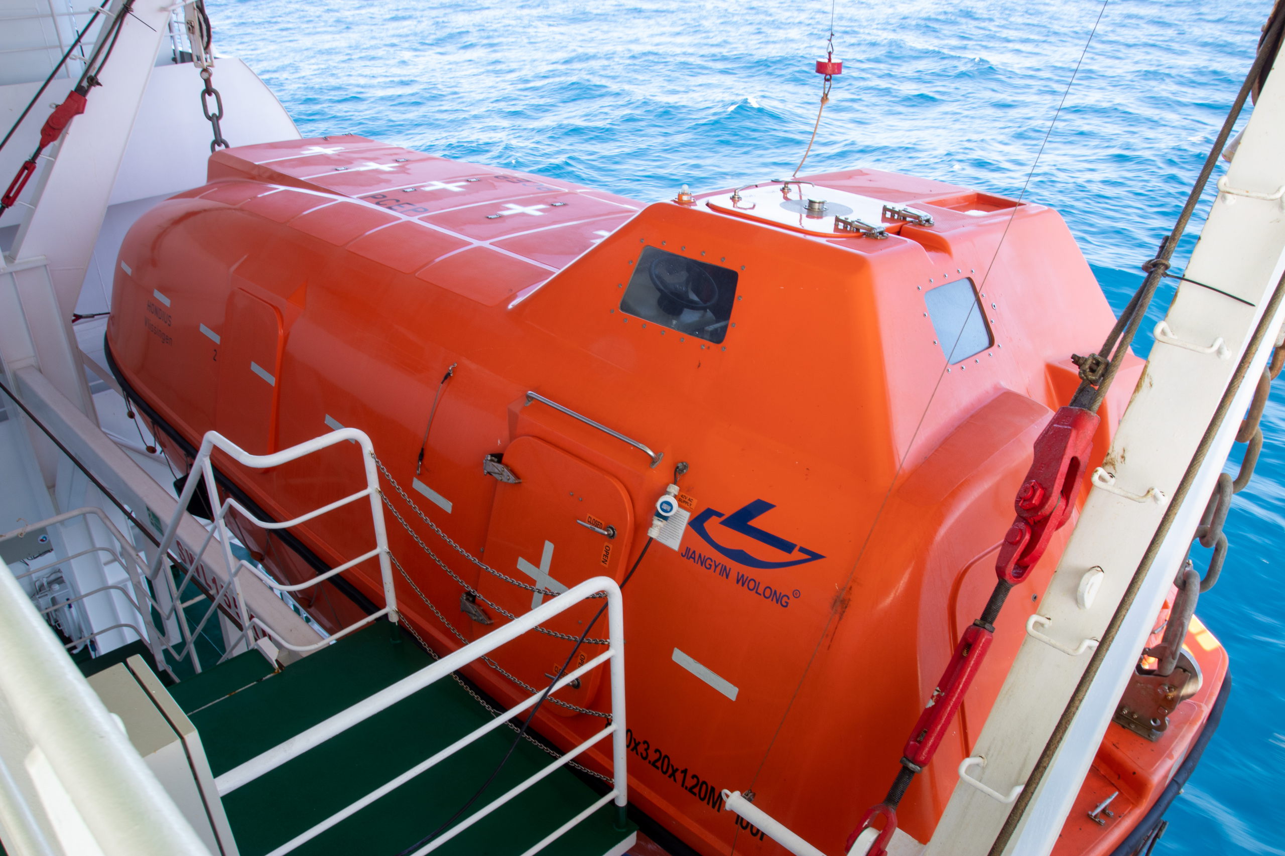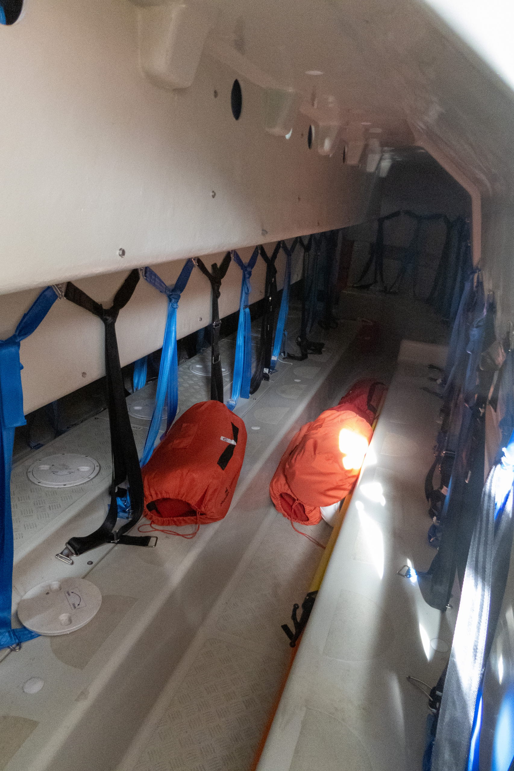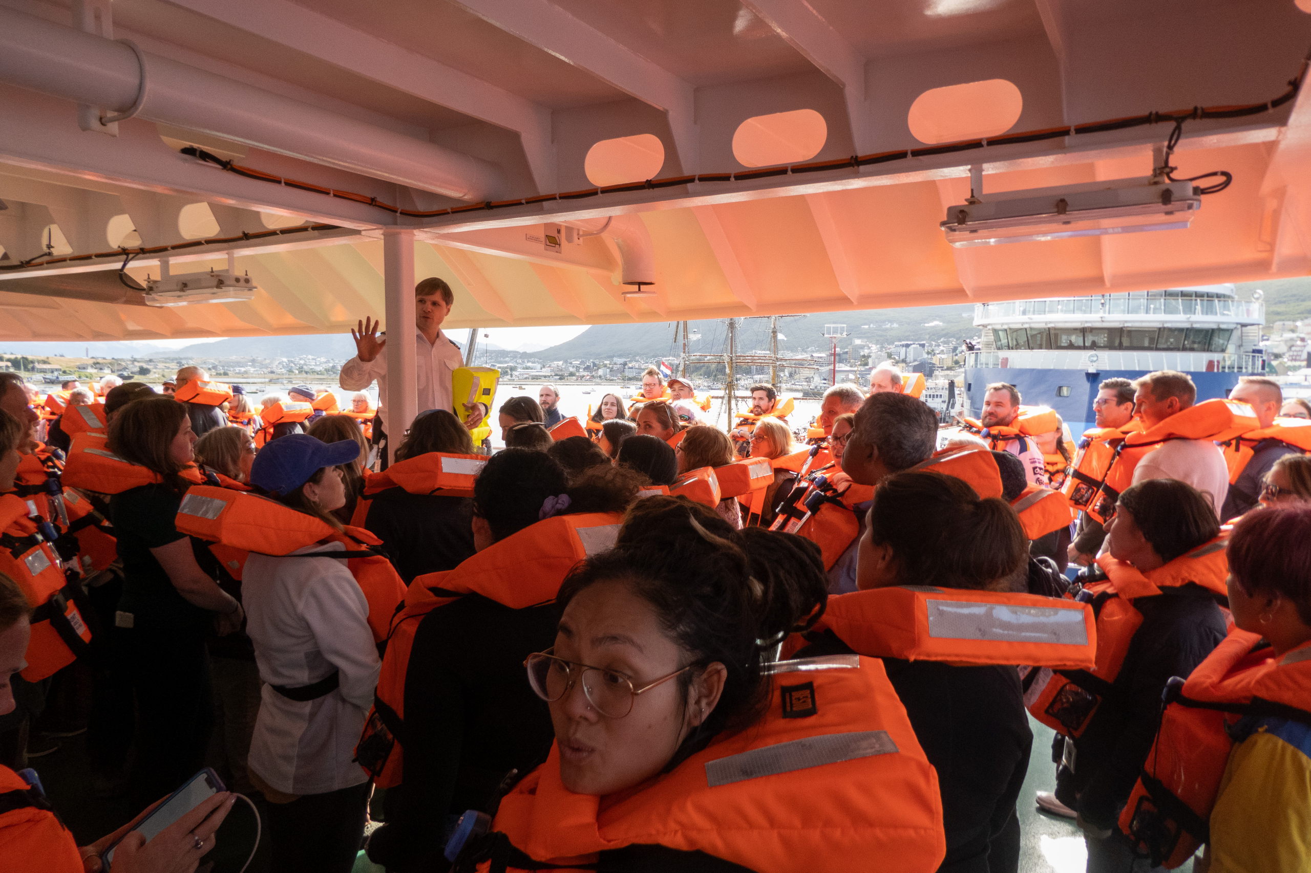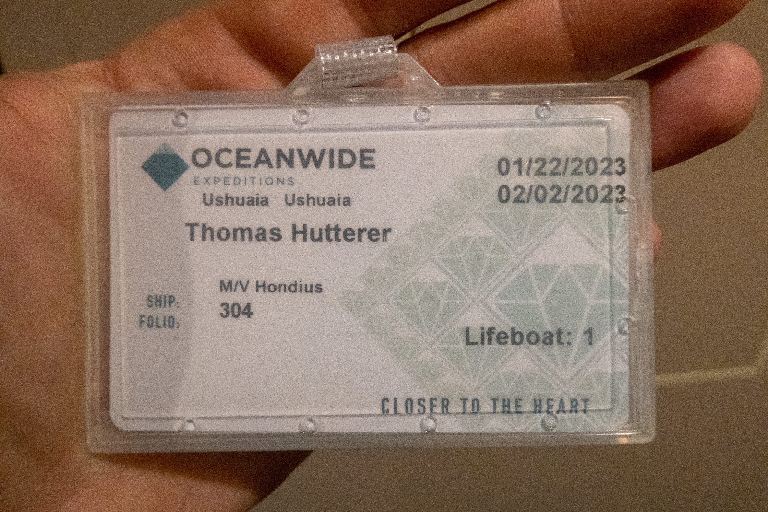 Eben noch saß ich im Hard Rock Cafe bei einem Bier und nun stehe ich schon in der Schlange vor der Hondius, dem Expeditionsschiff, das uns in die Antarktis bringen wird. Ich trage eine Maske, da ich noch immer Husten habe und niemanden anstecken möchte. Zur Sicherheit frage ich jemanden vom Personal, wie das so ist, wenn man sich nicht zu 100% fit fühlt. Kein Problem. Perfekt. An der Rezeption fasse ich meine Chipkarte aus und spaziere in den Keller zu meiner Kabine. OK, Deck 3. 😃 Super, das Gepäck liegt schon bereit und meine Zimmerkollegen trudeln auch schon ein. Matthew aus Großbritannien und Chris aus den USA. Zwei absolute Wuchtbrummen, aber voll nett. Nach einem kurzen Schwatz werden wir schon zur allgemeinen Sicherheitsunterweisung mit lustigem Video, Sicherheitsübung mit fetter Rettungsweste und einem Blick in eines der engen Rettungsboote gerufen. Kaum zu glauben, dass 120 Leute im Inneren Platz haben.