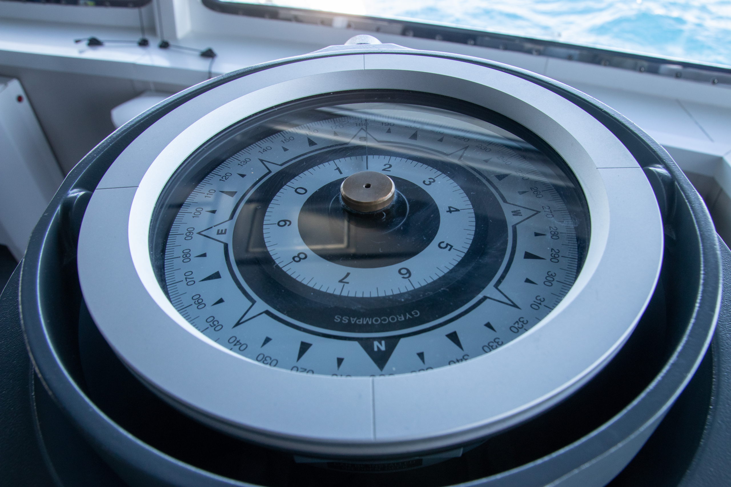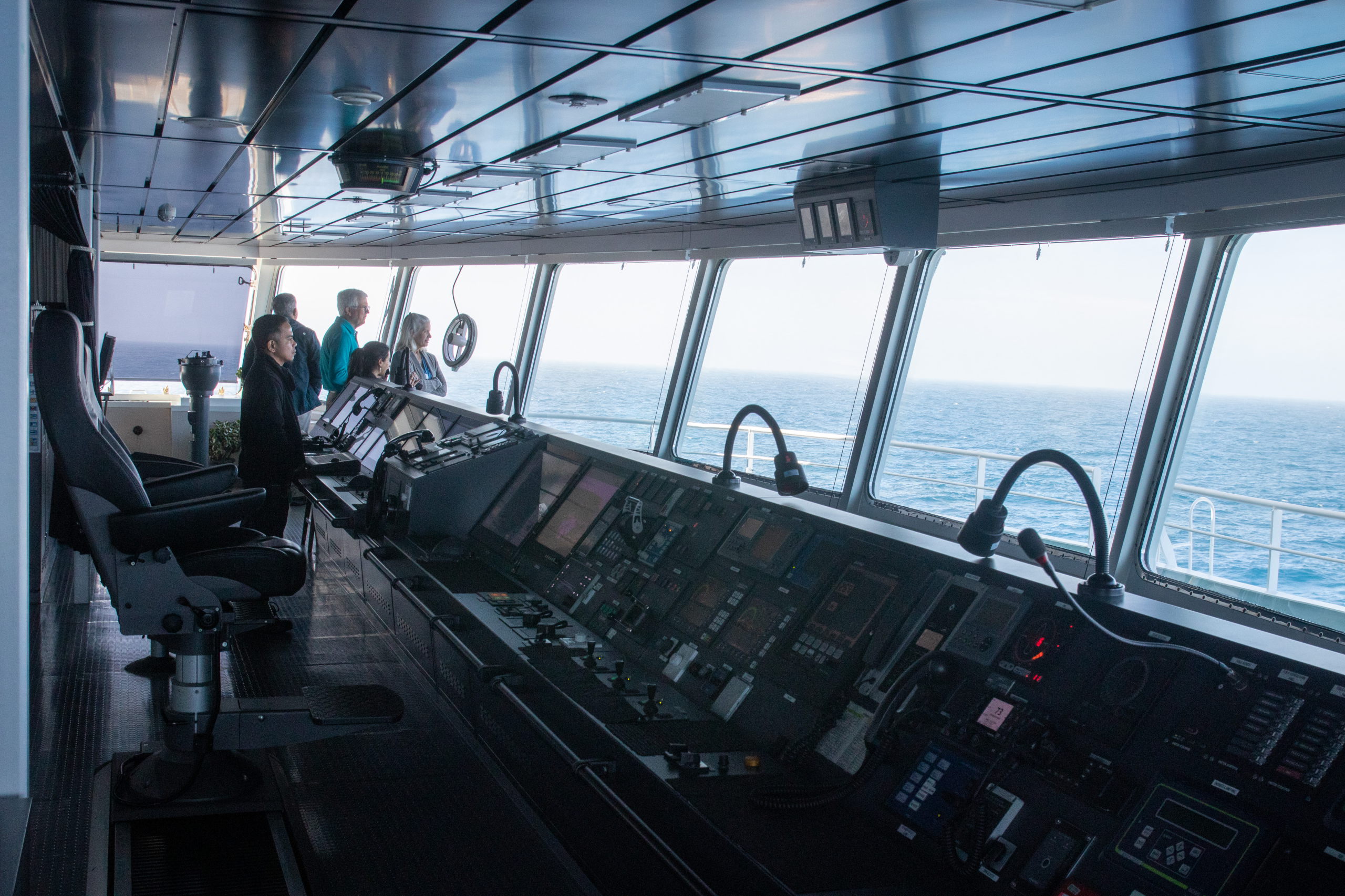 Auch heute werden wir vom melodischen Morning Call geweckt. Da ich aber noch ziemlich müde bin und keinen Hunger habe, skippe ich das Frühstück und schlafe noch eine Runde. Es gibt ohnehin auch Snacks für zwischendurch. Zur Anmeldung zu den unterschiedlichen Aktivitäten stehe ich natürlich schon rechtzeitig parat. Eigentlich wäre es besser, sich für frühere Termine einzutragen, da man dann vielleicht noch eine zweite Chance hat, sollte das Wetter schlecht sein. Ich muss mich aber noch ein wenig erholen und so wähle ich spätere Termine. Im Anschluss drehe ich eine Runde am Schiff und besuche die Brücke. Wir pflügen mit 10 – 12 Knoten durch das Wasser. Angeblich haben die Wellen eine Höhe von 3 – 4 Metern. Von hier oben sieht das aber nicht so hoch aus.