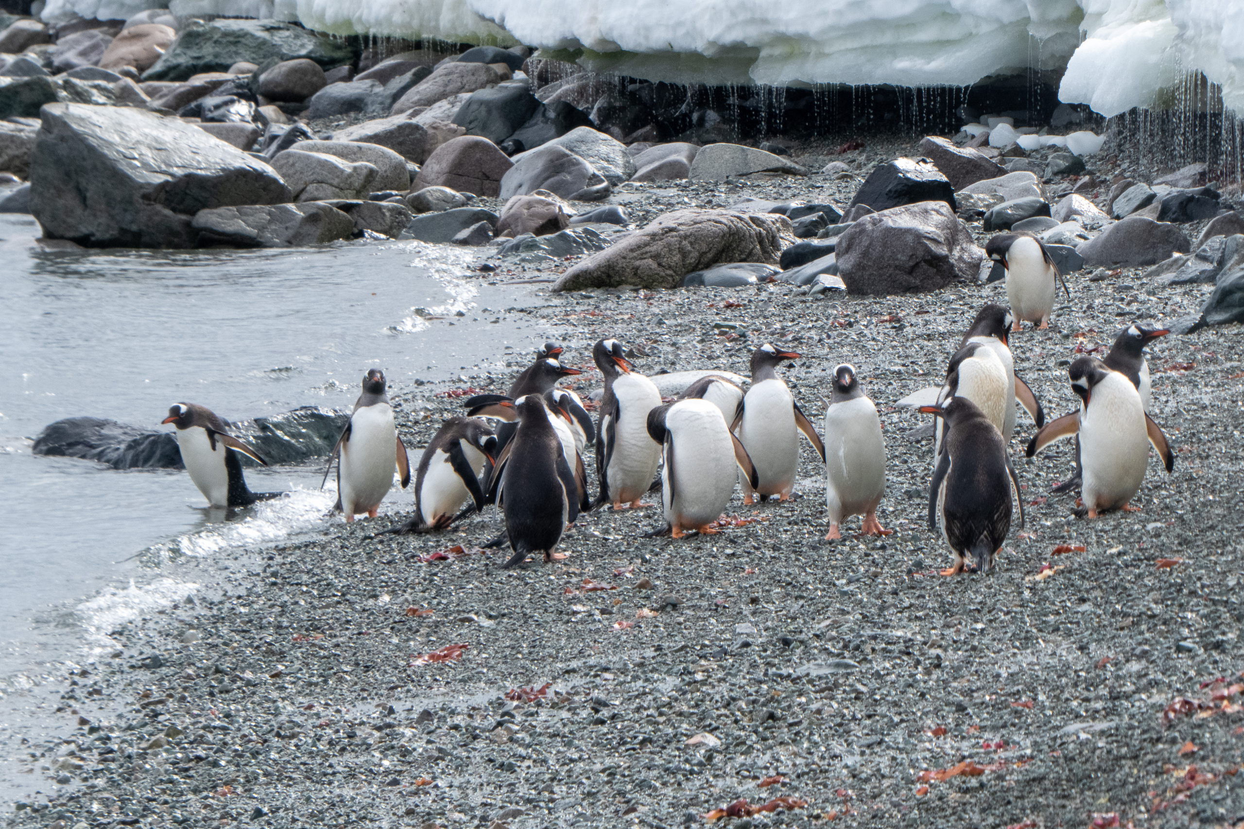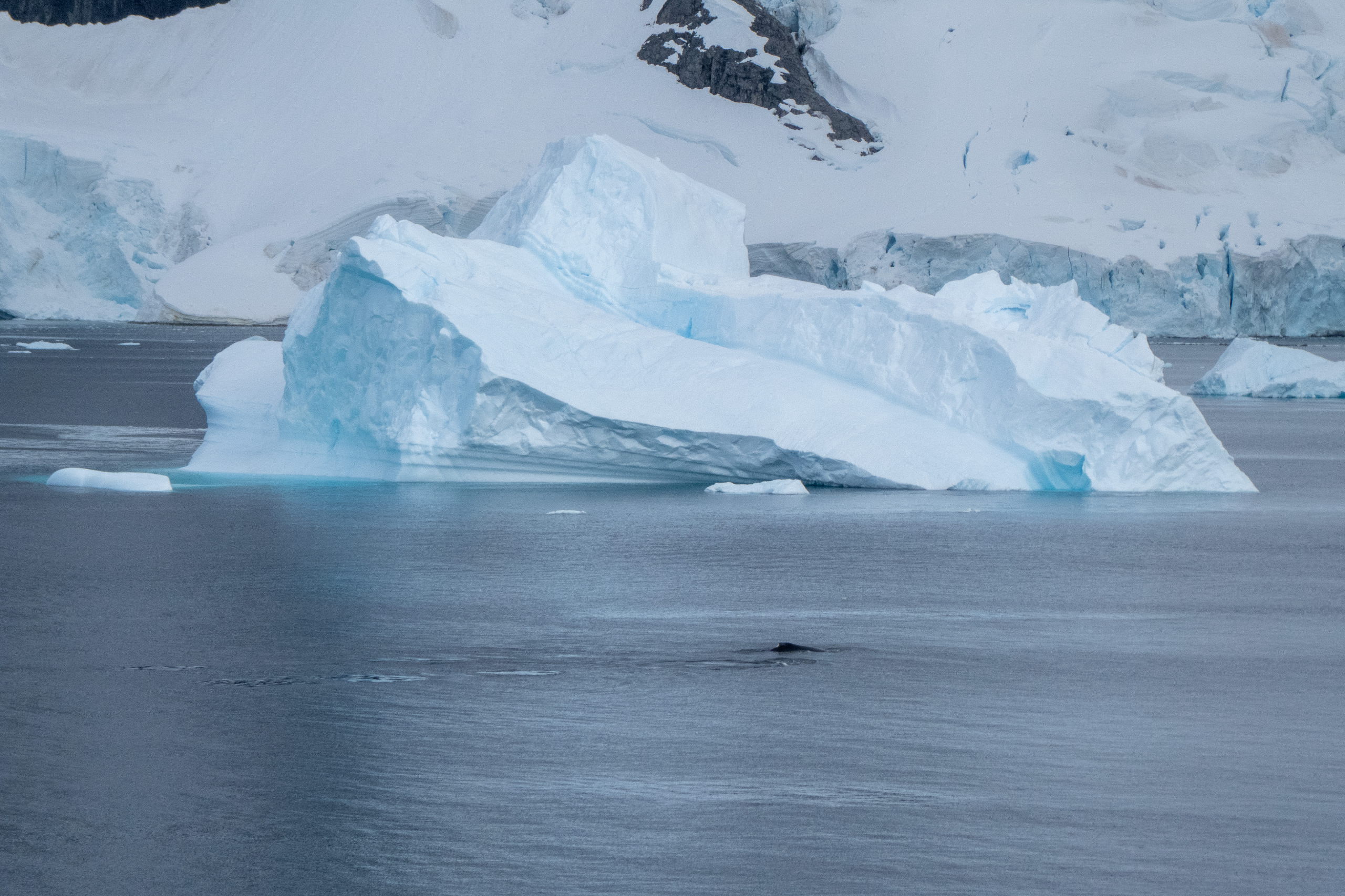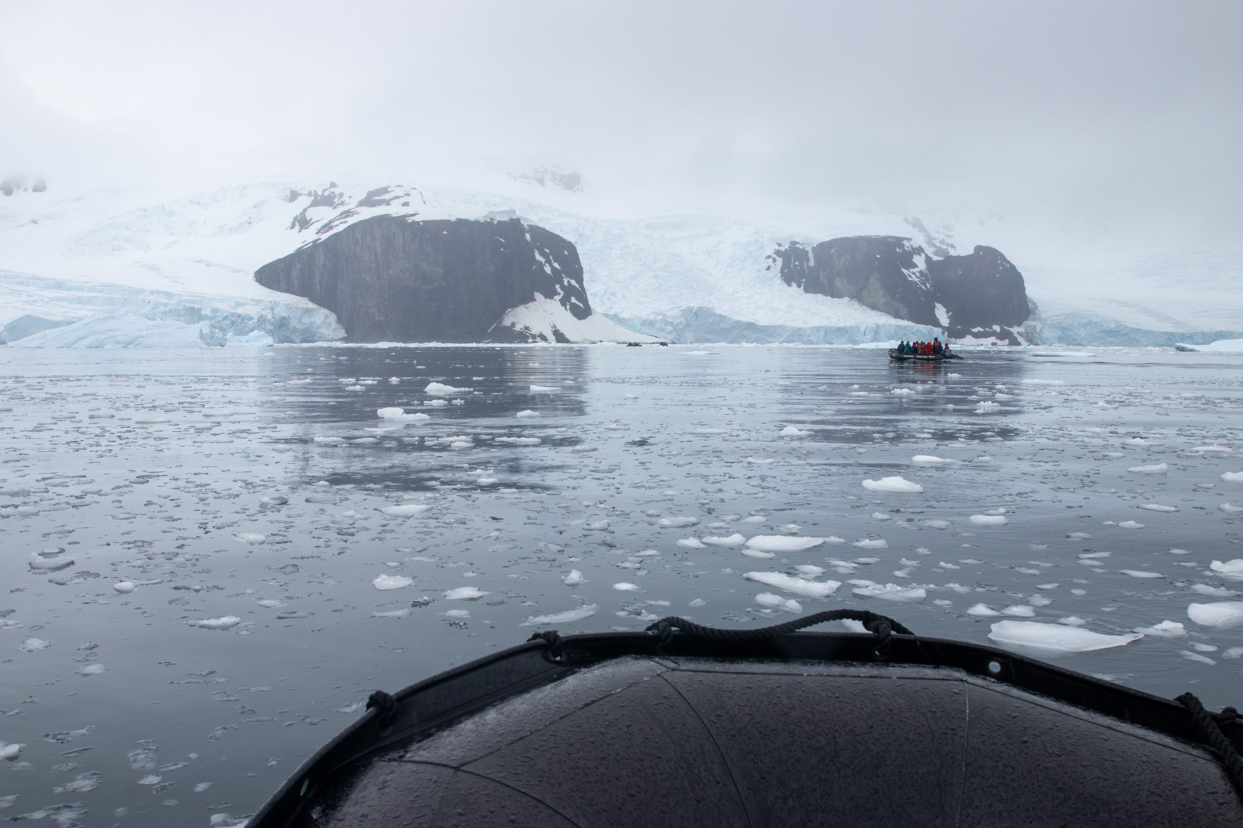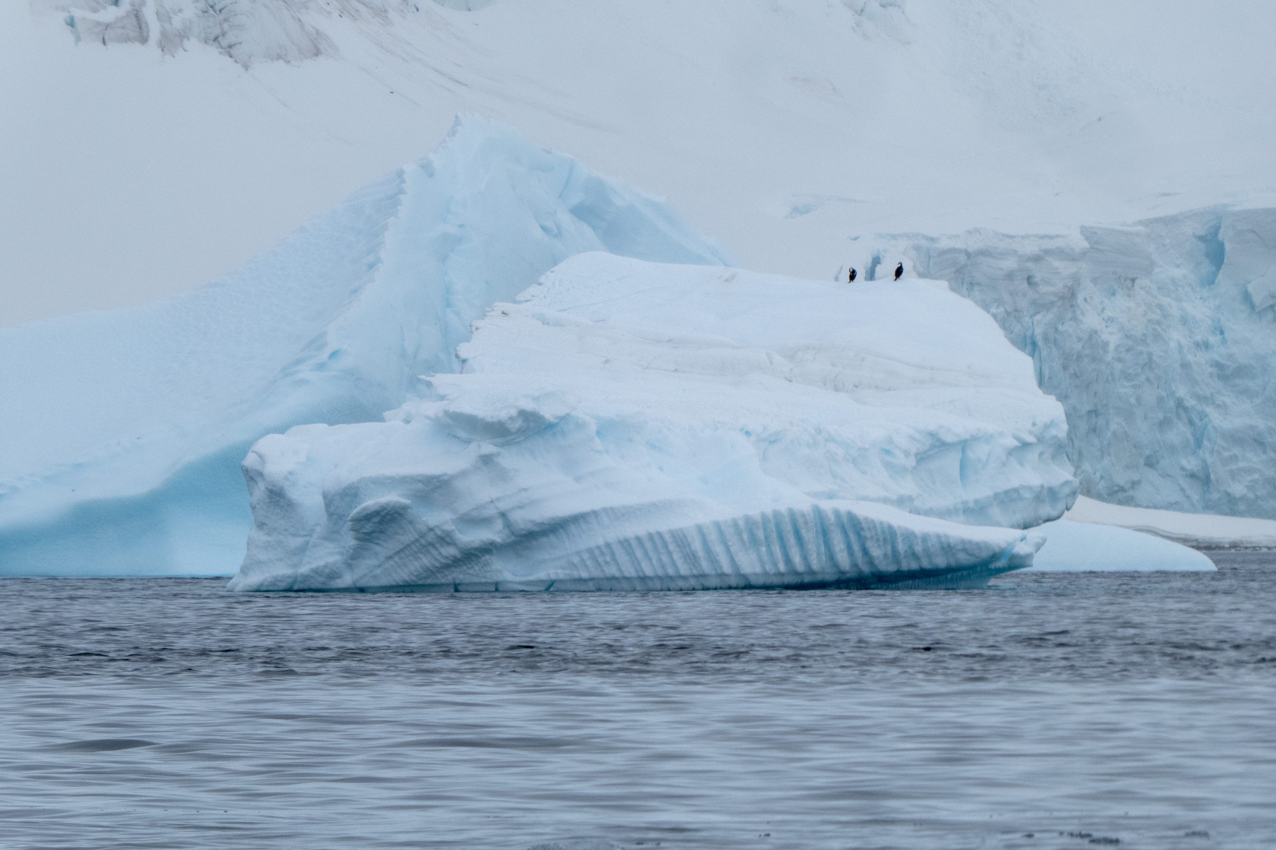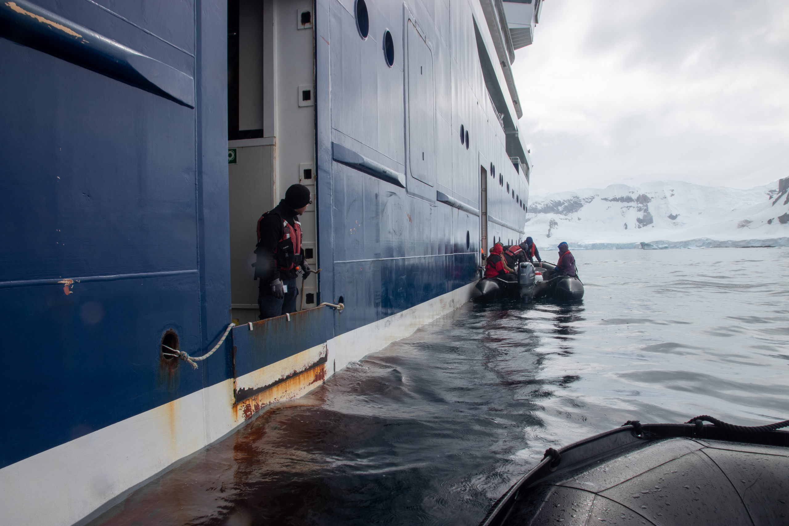Am späten Nachmittag geht es zum Zodiac Cruise am Skontorp Cove. Dabei kommen wir an der Brown Station, einer argentinischen Forschungsstation, vorbei. Über Funk hören wir, dass ihnen bald das Trinkwasser ausgehen wird. Kurz darauf sehen wir ein Boot vom Land aus starten. Ein zweites, mit Fässern beladenes, startet von der Hondius um diese auf das andere Boot umzuladen. Die übliche Versorgung mit Trinkwasser, denn Eis oder Schnee zu schmelzen, würde viel zu viel Energie und Treibstoff verbrauchen.