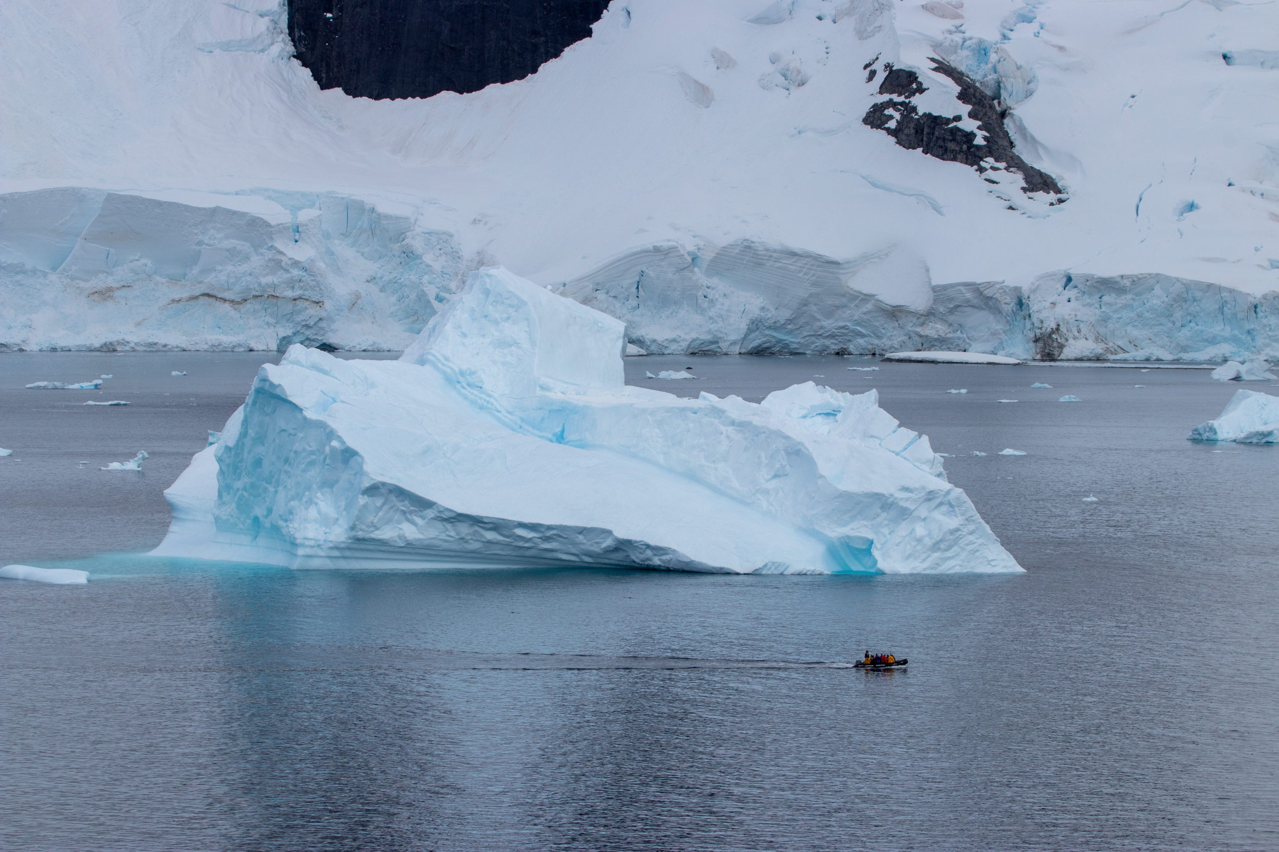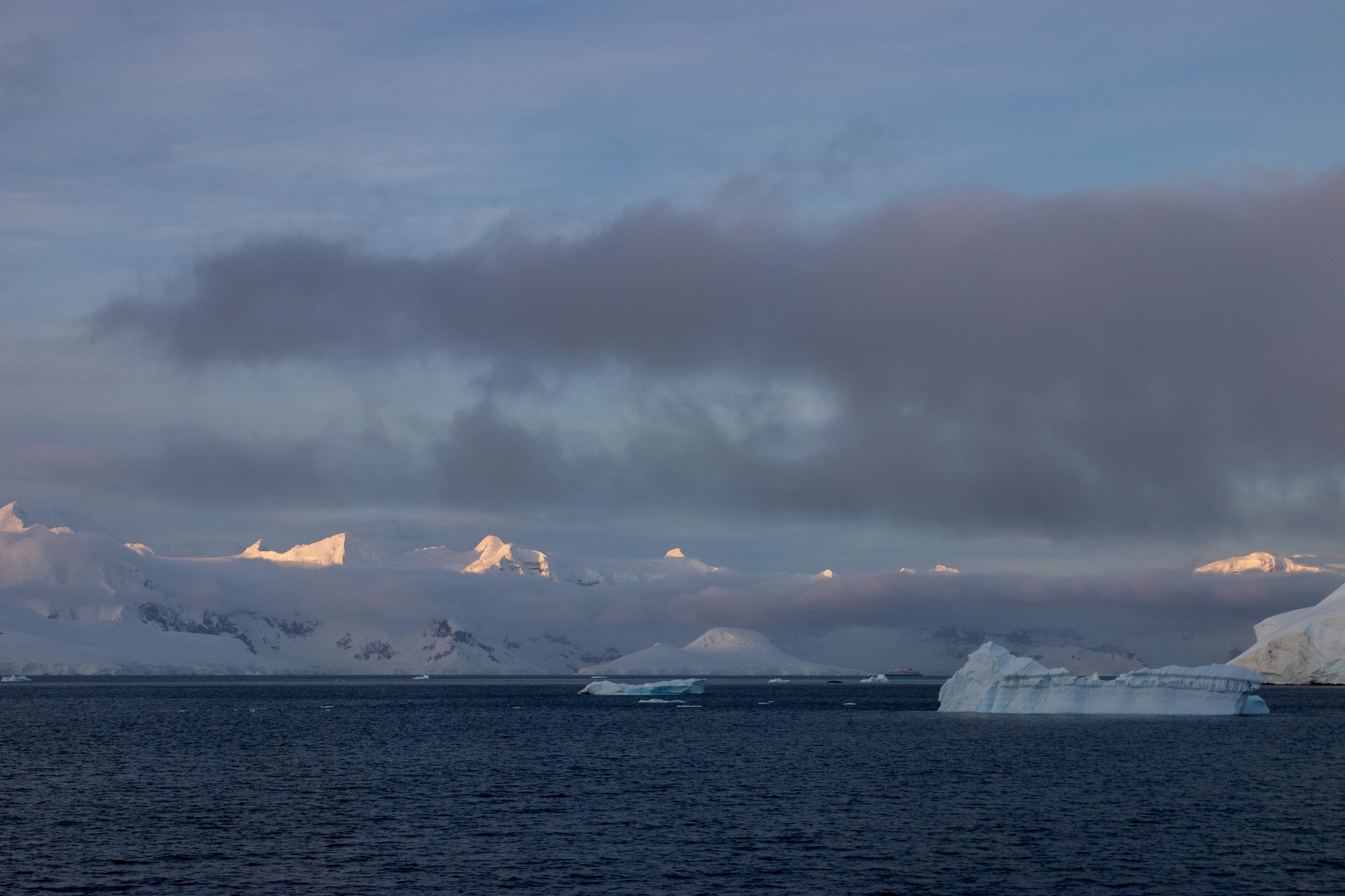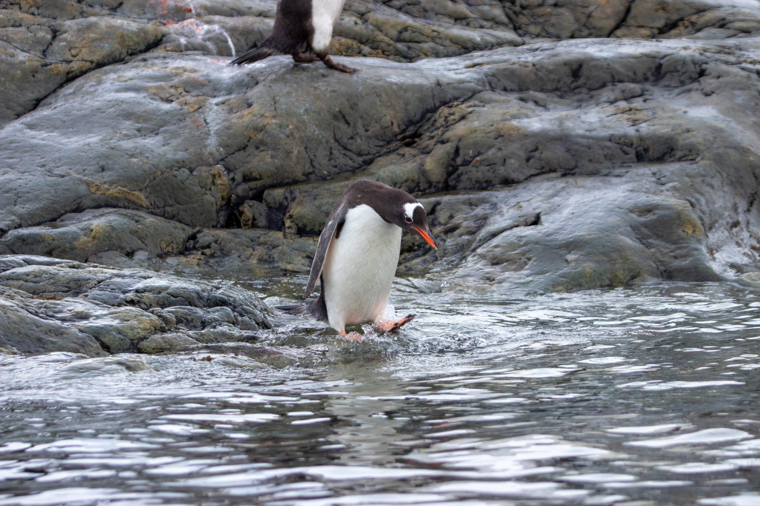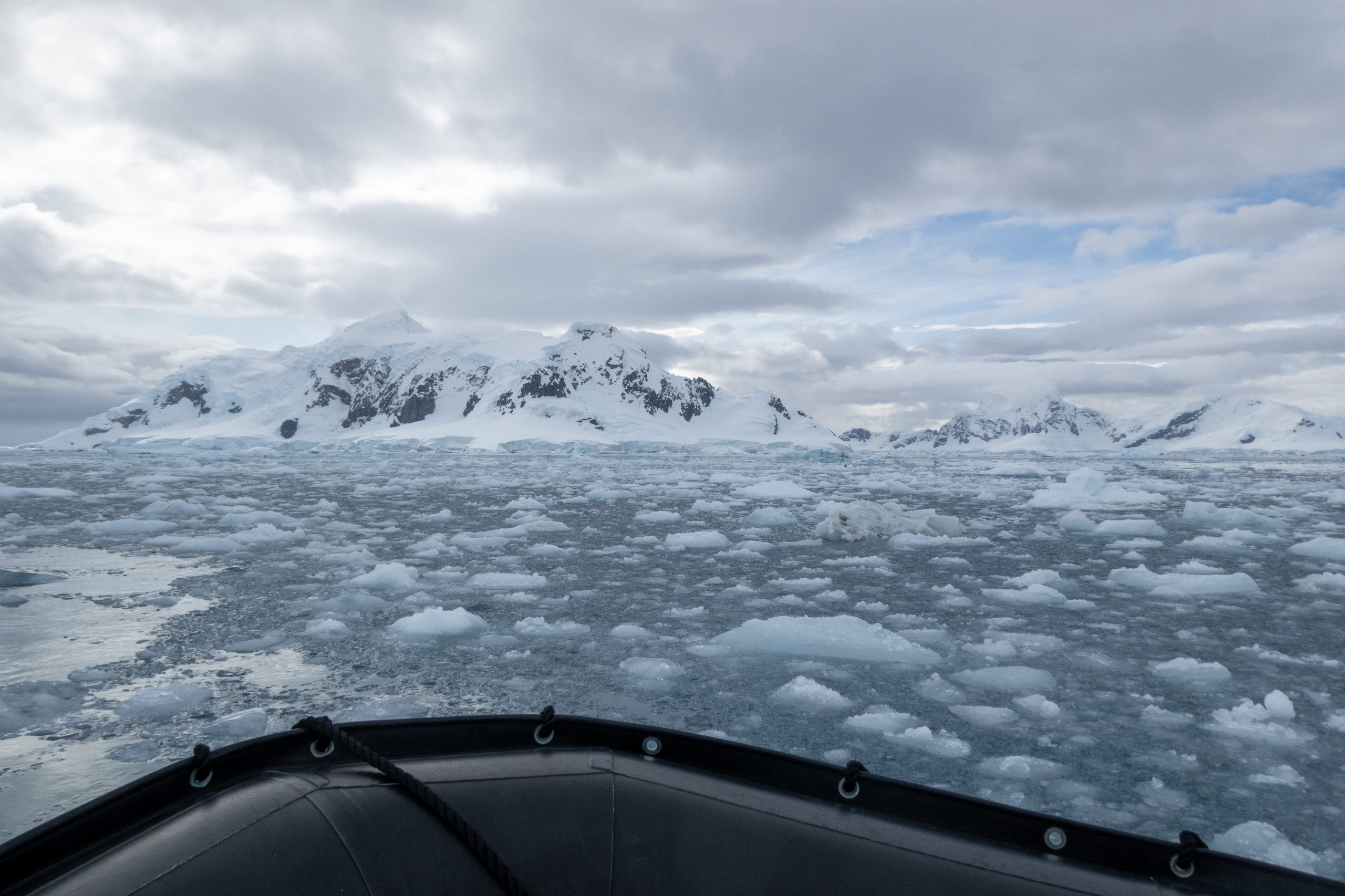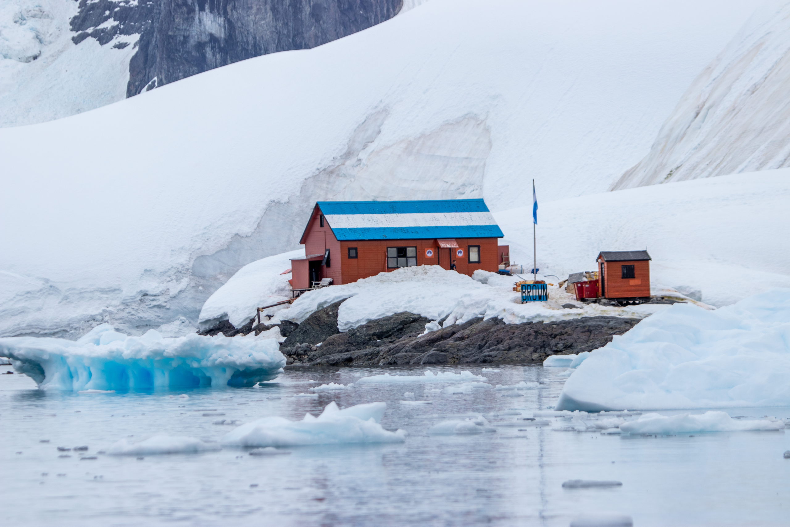 Am späten Nachmittag geht es zum Zodiac Cruise am Skontorp Cove. Dabei kommen wir an der Brown Station, einer argentinischen Forschungsstation, vorbei. Über Funk hören wir, dass ihnen bald das Trinkwasser ausgehen wird. Kurz darauf sehen wir ein Boot vom Land aus starten. Ein zweites, mit Fässern beladenes, startet von der Hondius um diese auf das andere Boot umzuladen. Die übliche Versorgung mit Trinkwasser, denn Eis oder Schnee zu schmelzen, würde viel zu viel Energie und Treibstoff verbrauchen.
