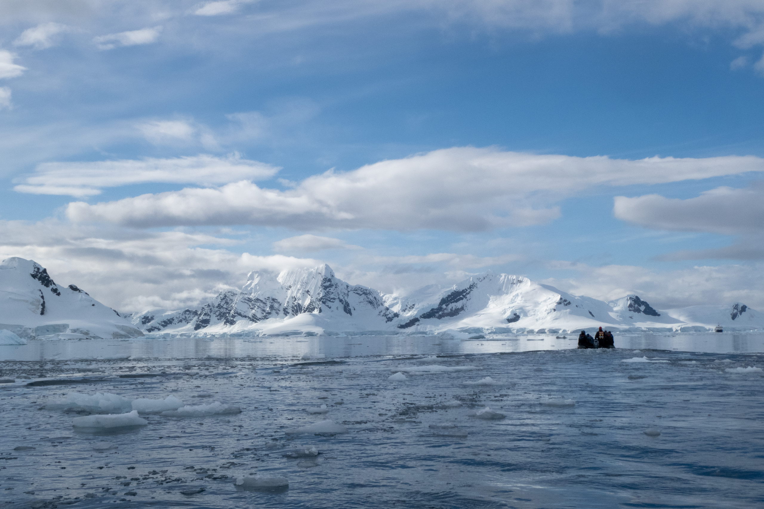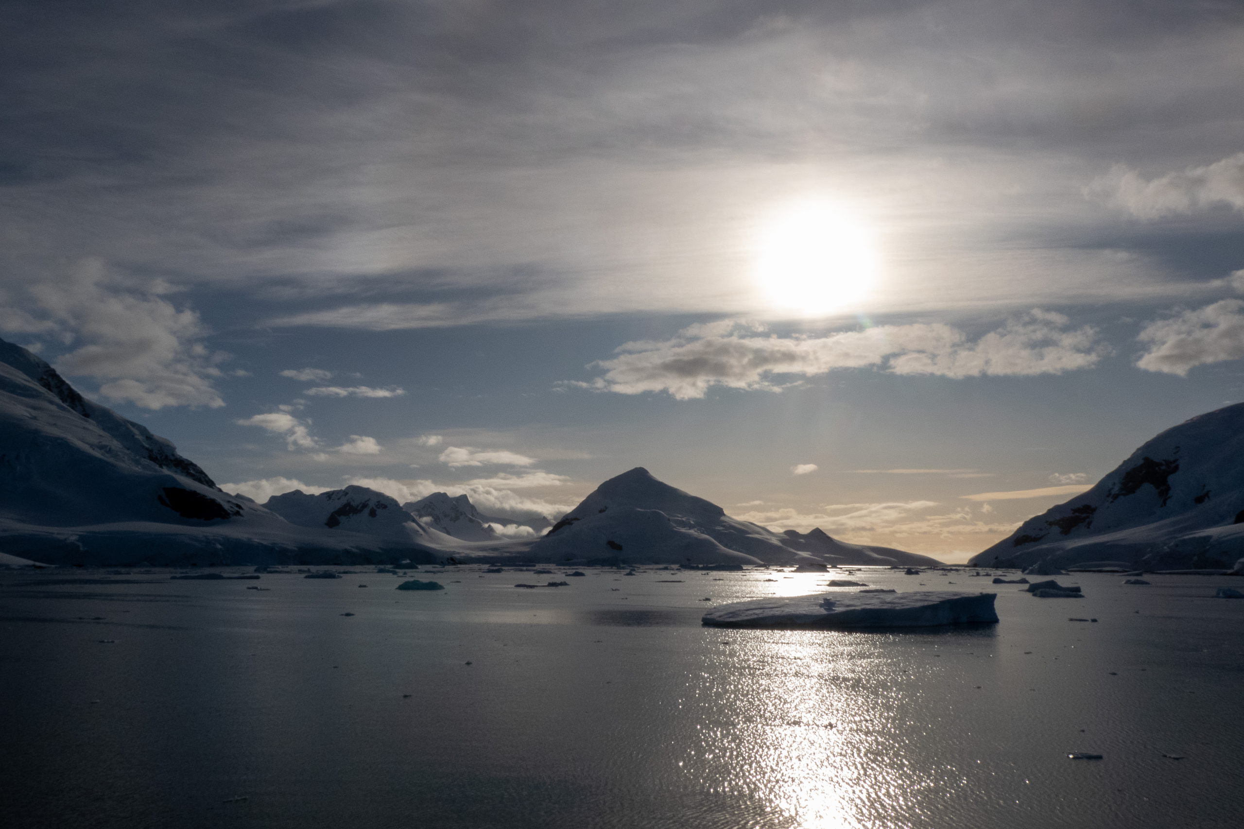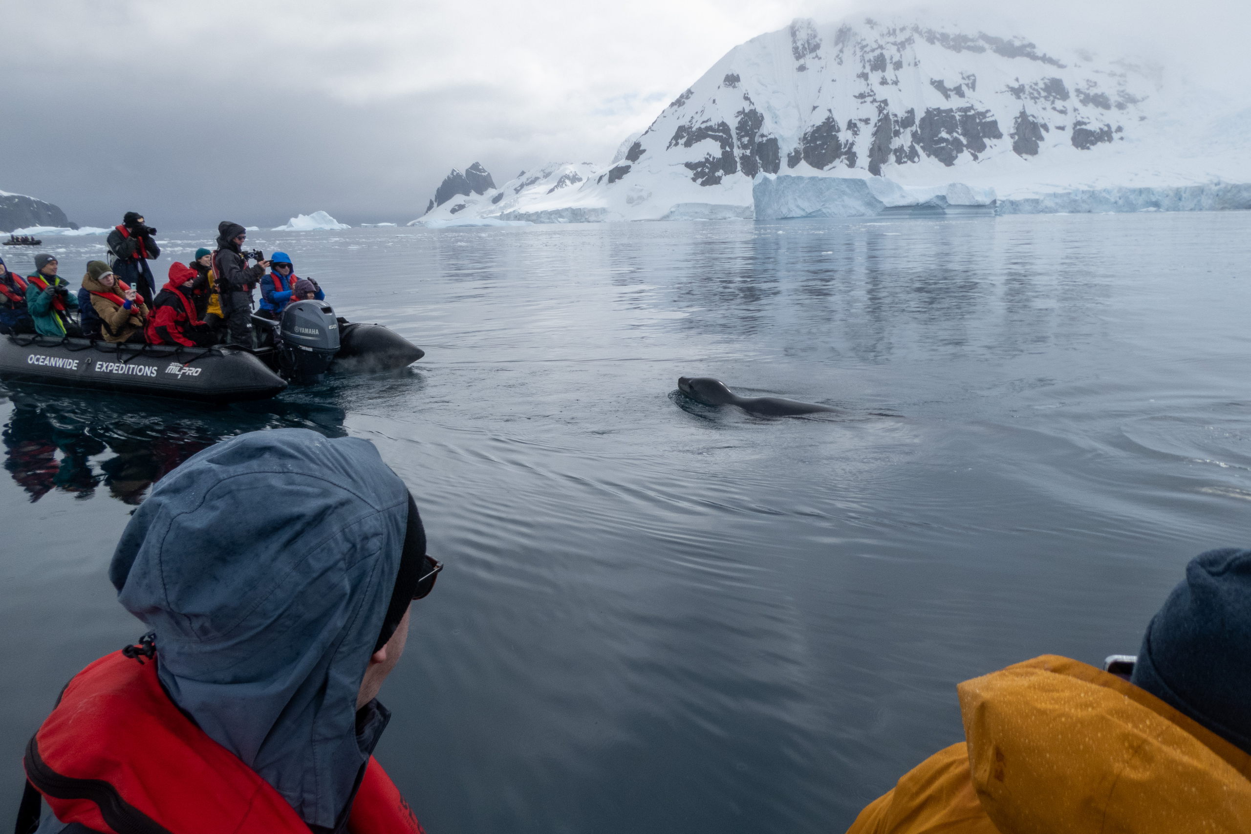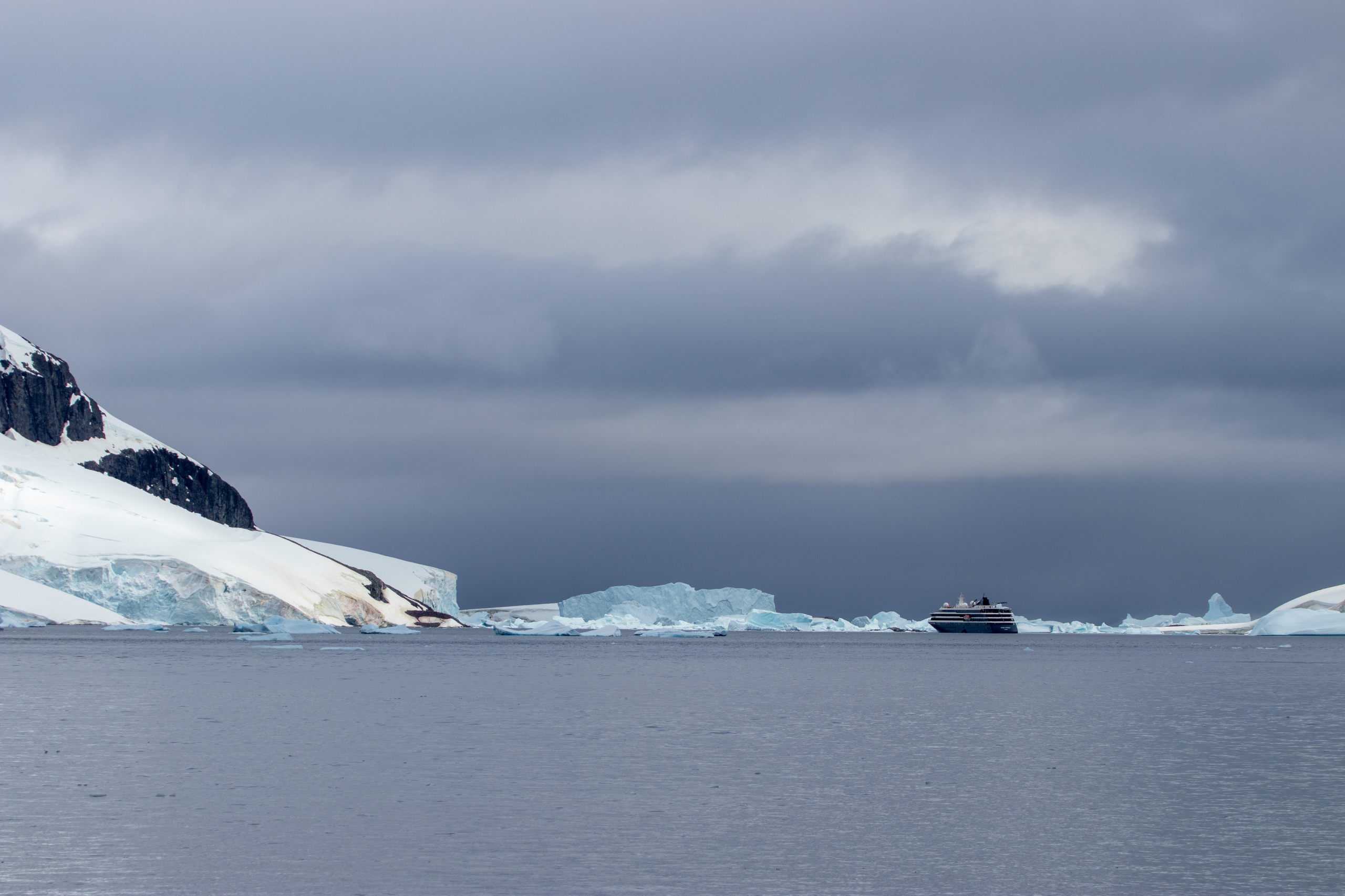 Am späten Nachmittag geht es zum Zodiac Cruise am Skontorp Cove. Dabei kommen wir an der Brown Station, einer argentinischen Forschungsstation, vorbei. Über Funk hören wir, dass ihnen bald das Trinkwasser ausgehen wird. Kurz darauf sehen wir ein Boot vom Land aus starten. Ein zweites, mit Fässern beladenes, startet von der Hondius um diese auf das andere Boot umzuladen. Die übliche Versorgung mit Trinkwasser, denn Eis oder Schnee zu schmelzen, würde viel zu viel Energie und Treibstoff verbrauchen.