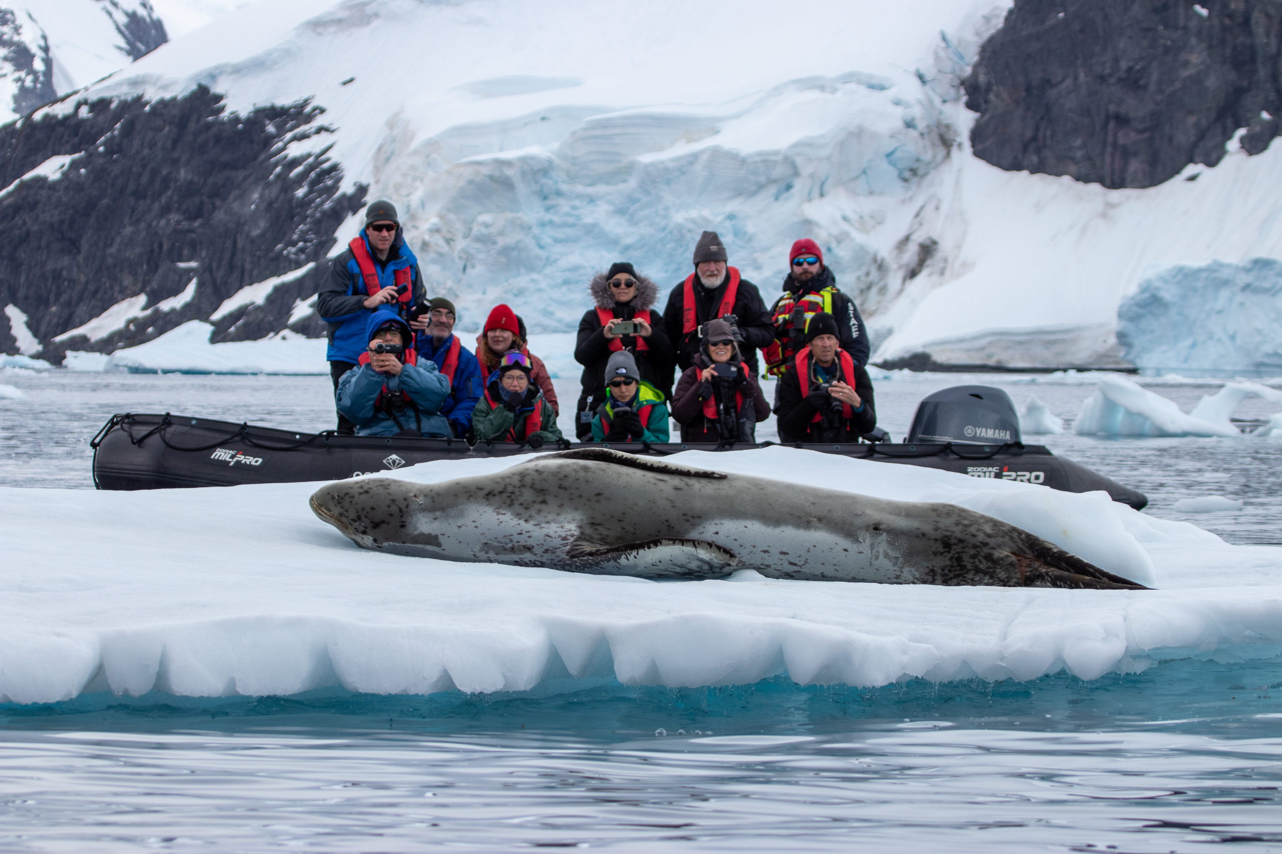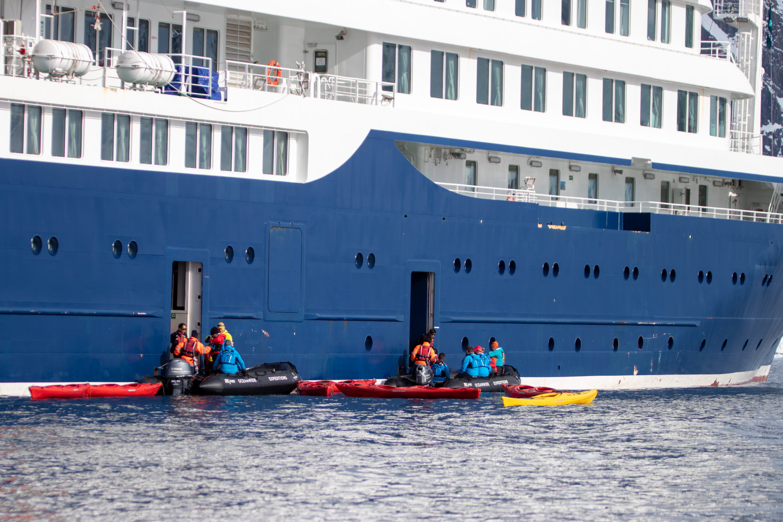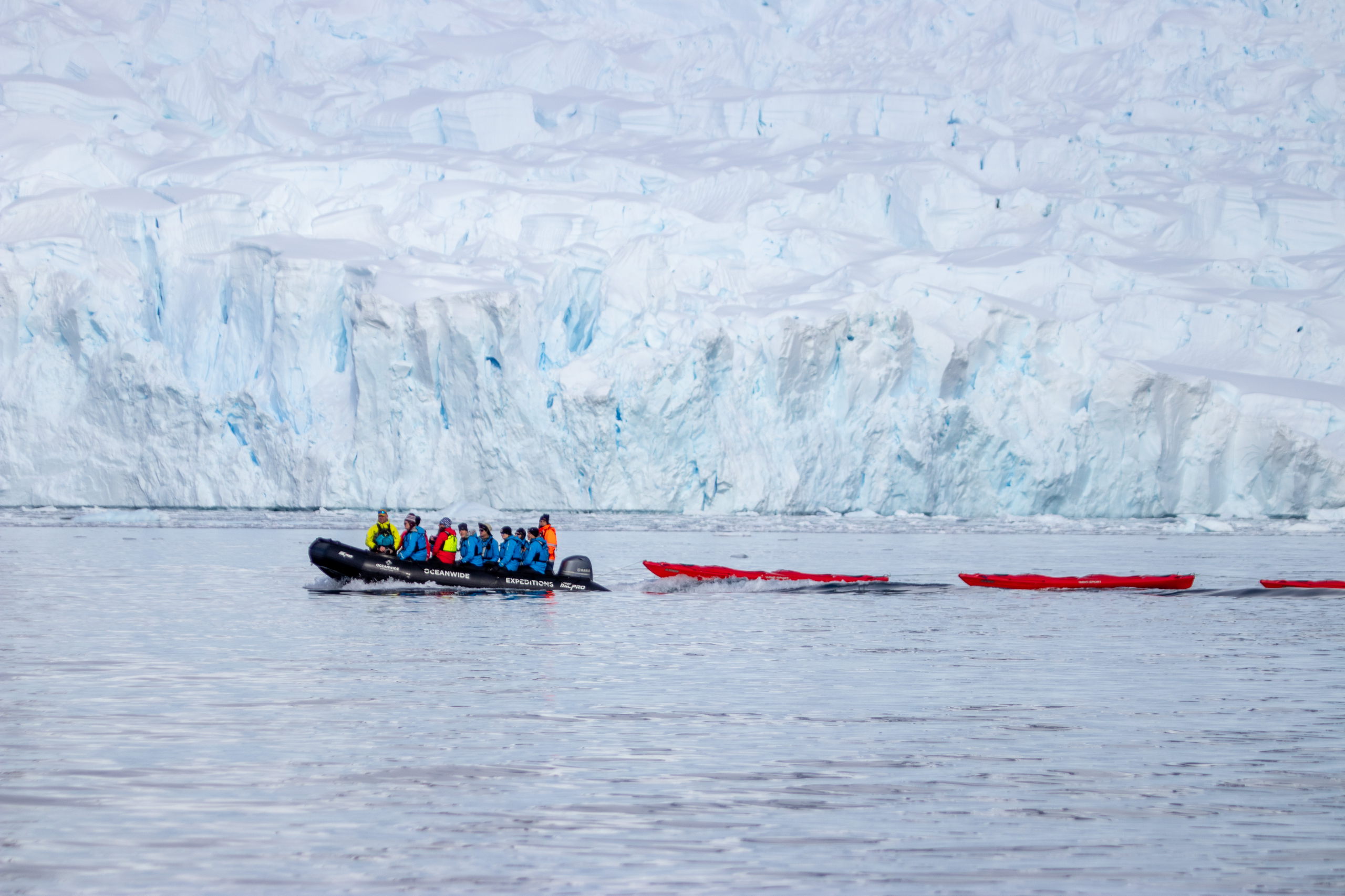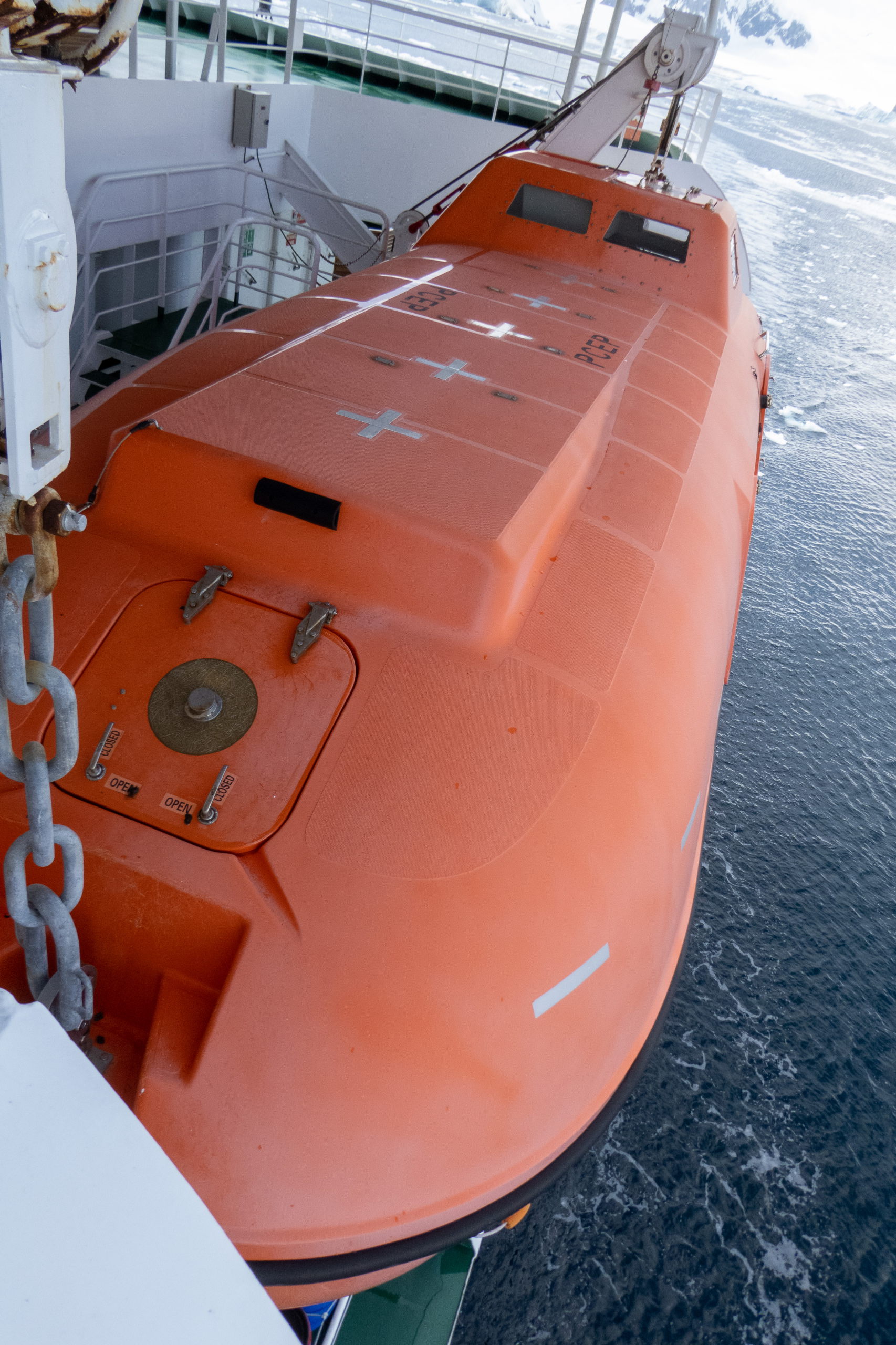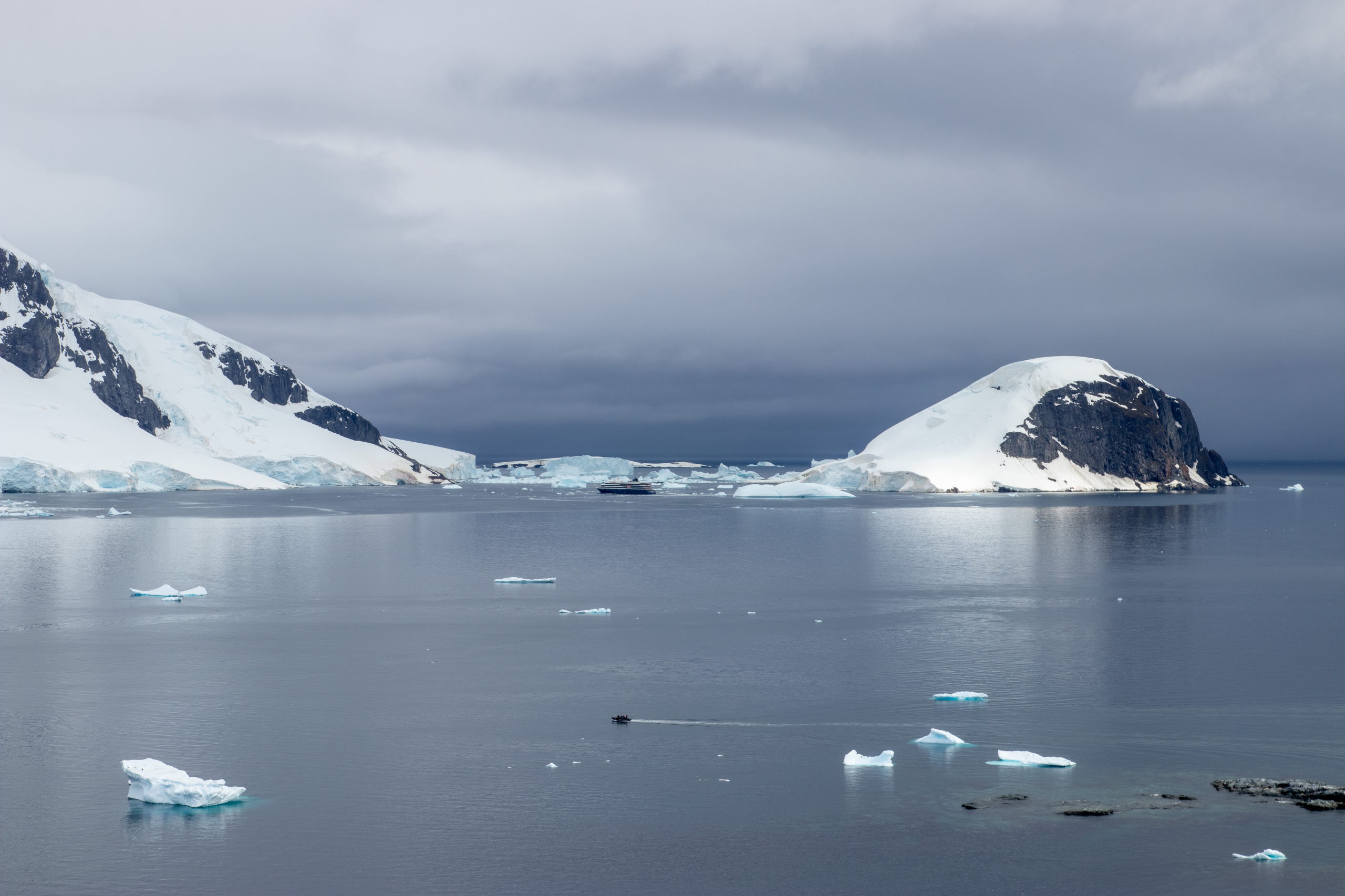 Am späten Nachmittag geht es zum Zodiac Cruise am Skontorp Cove. Dabei kommen wir an der Brown Station, einer argentinischen Forschungsstation, vorbei. Über Funk hören wir, dass ihnen bald das Trinkwasser ausgehen wird. Kurz darauf sehen wir ein Boot vom Land aus starten. Ein zweites, mit Fässern beladenes, startet von der Hondius um diese auf das andere Boot umzuladen. Die übliche Versorgung mit Trinkwasser, denn Eis oder Schnee zu schmelzen, würde viel zu viel Energie und Treibstoff verbrauchen.