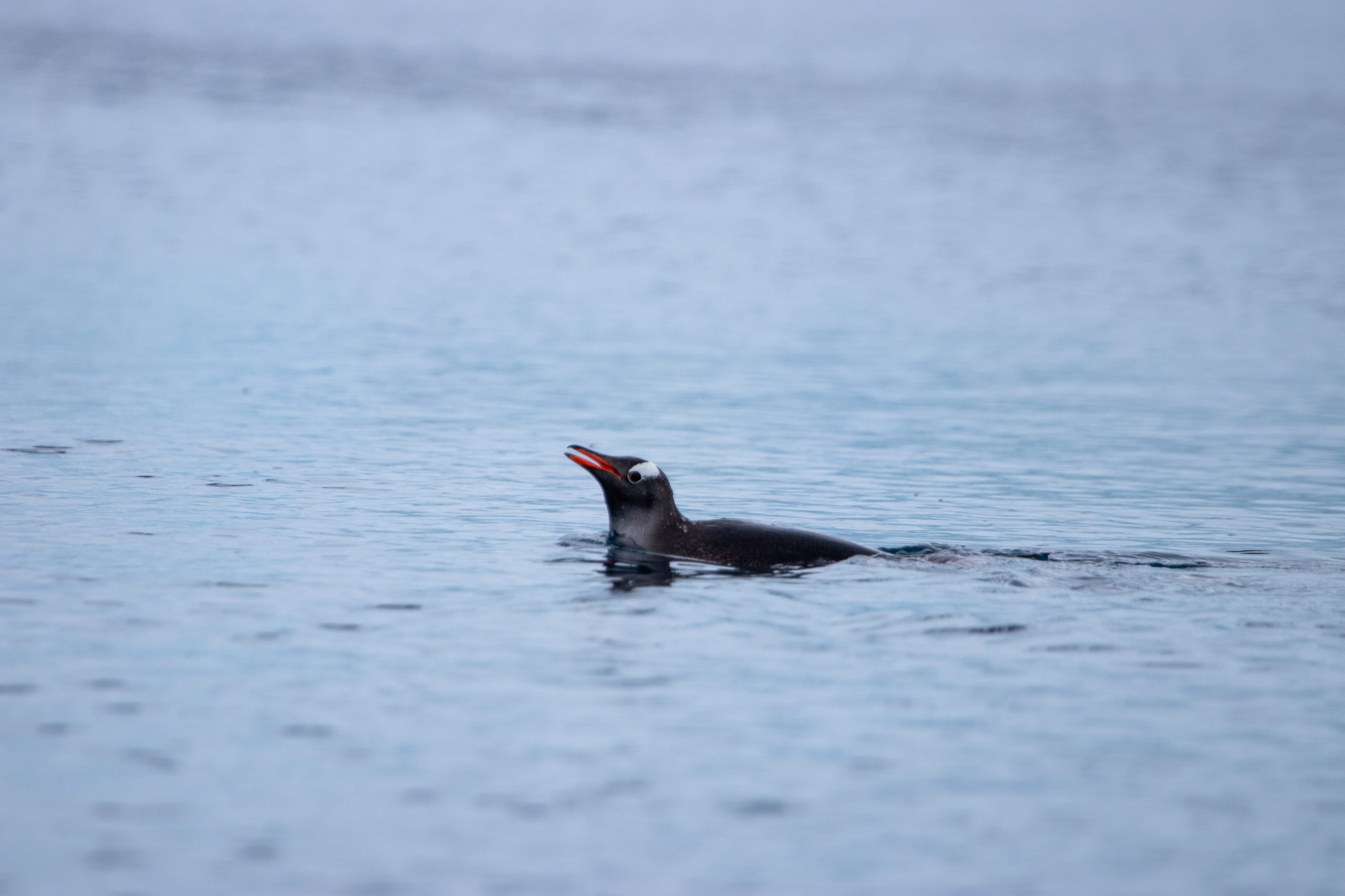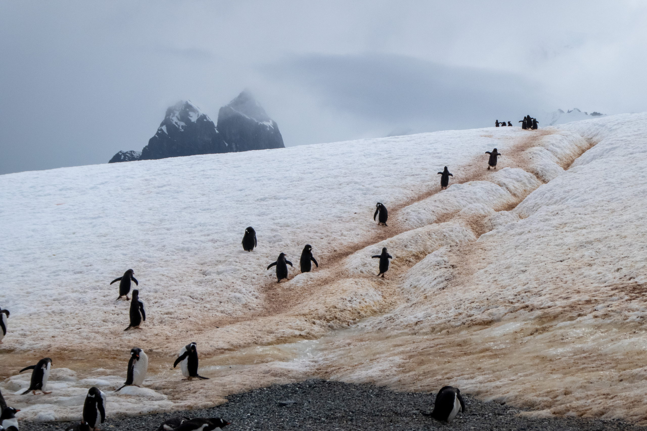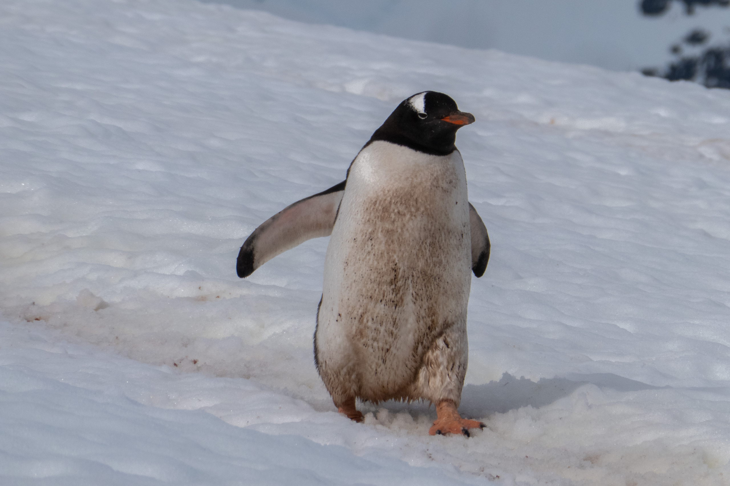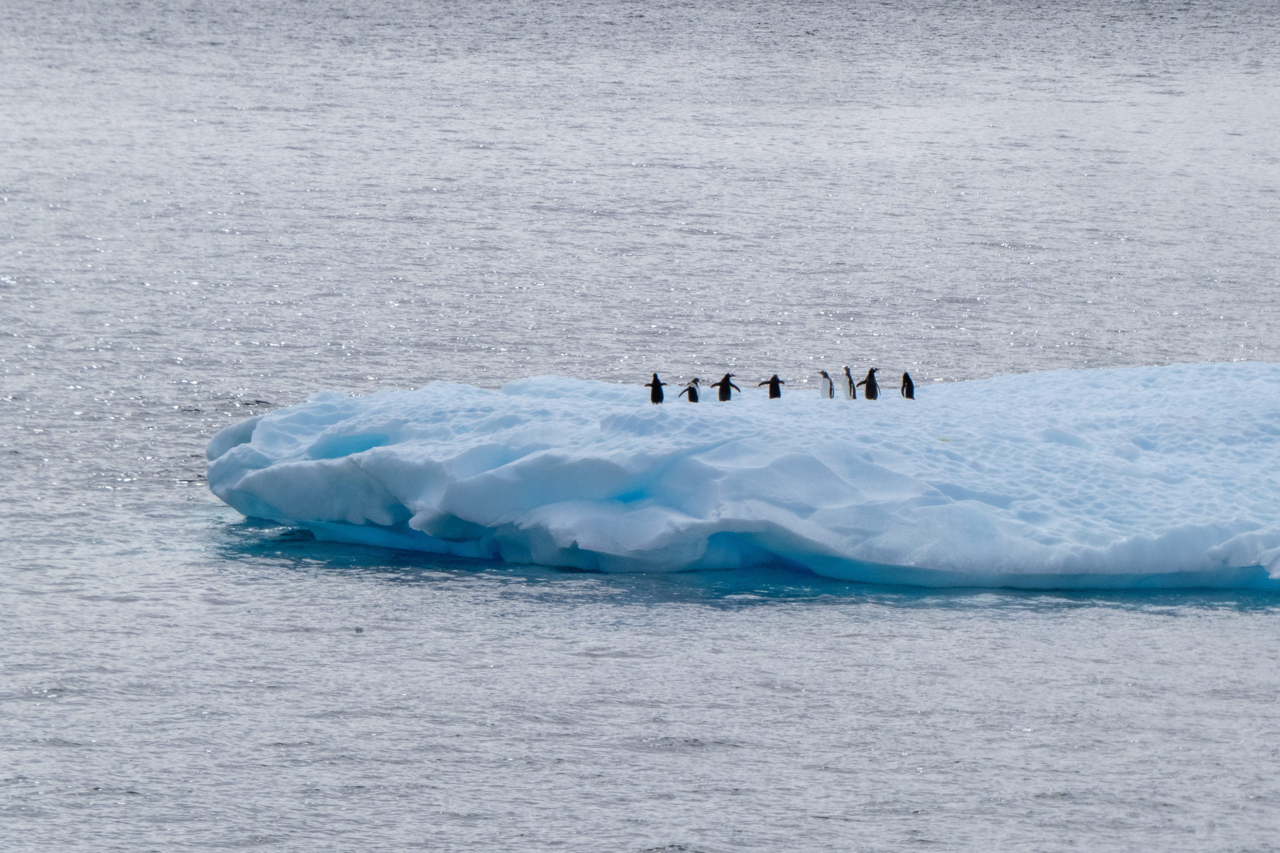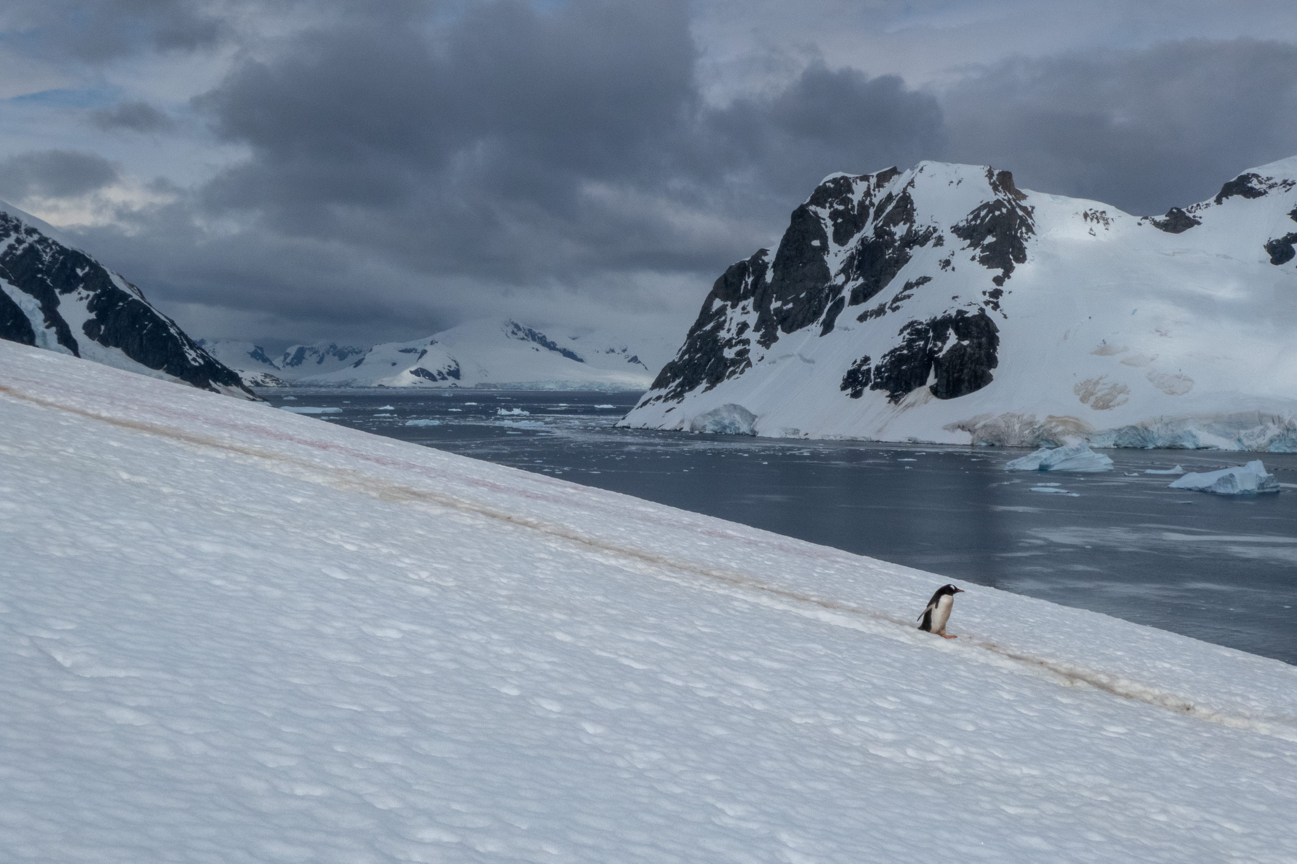 Wir ankern vor Danco Island. Das Wetter ist trüb. Hmmm, kein schöner Empfang. Doch dann treibt blau schimmerndes Eis vorbei. Also doch ein sehr schöner Empfang. Nach dem Frühstück geht es mit den Zodiacs um halb neun Uhr an Land zu einer Kolonie von Eselspinguinen auf Danco Island. Ich schnappe mir ein Paar Schneeschuhe und starte den Hang hinauf. Immer wieder muss ich anhalten. Nicht nur um zu fotografieren, sondern auch um die Pinguine vorbeizulassen. Die kleinen Racker haben nämlich Vorrang.