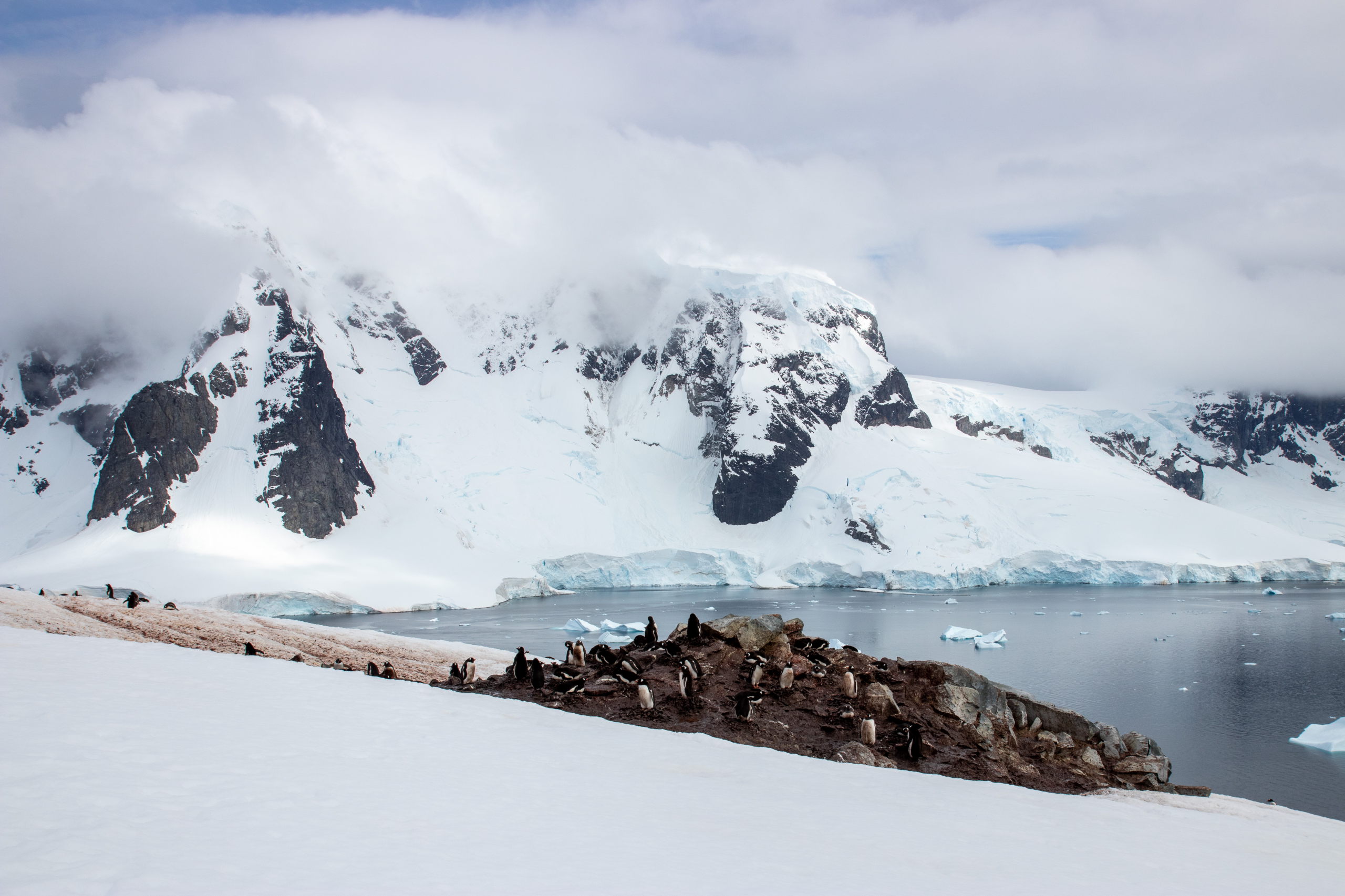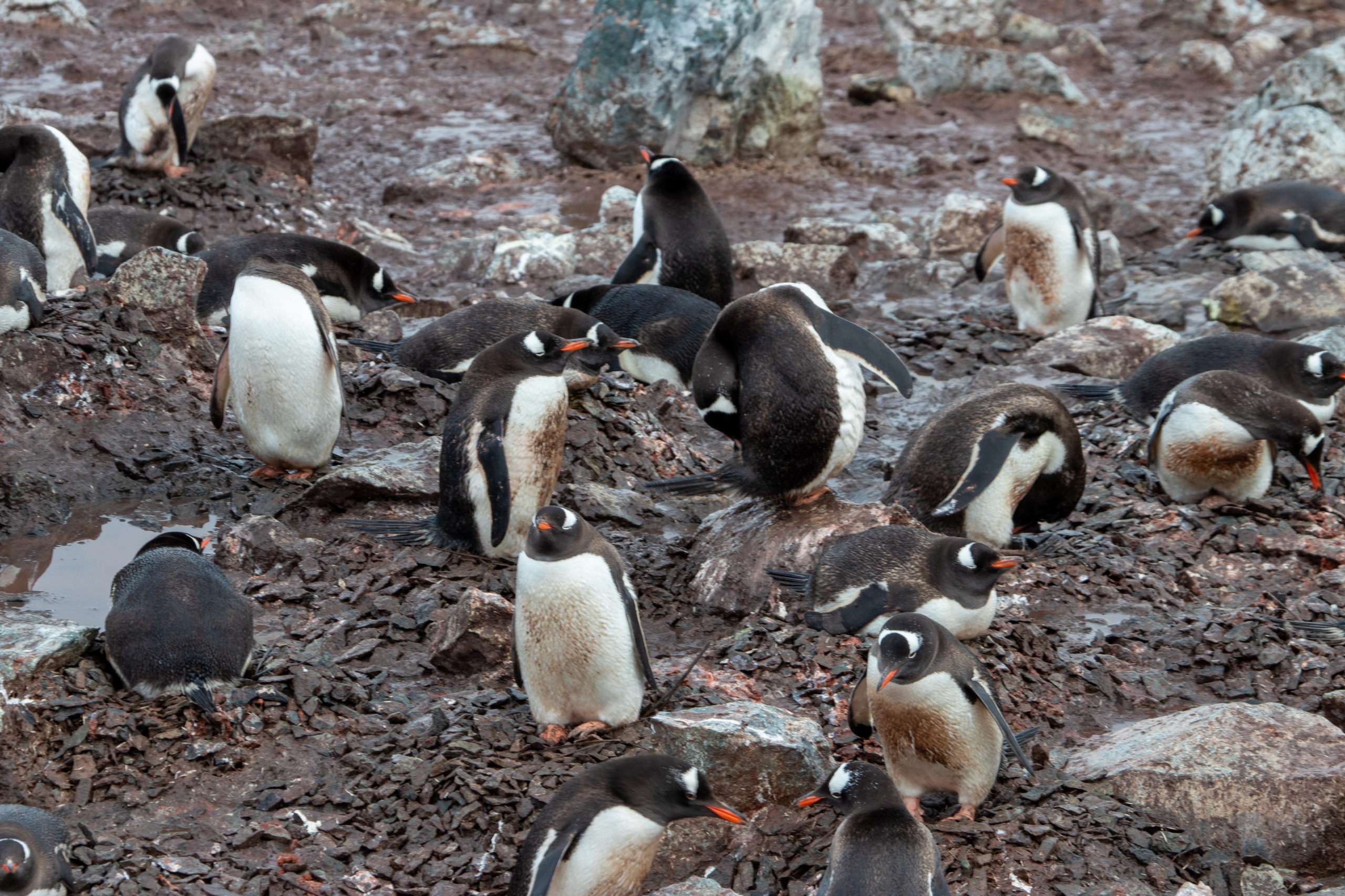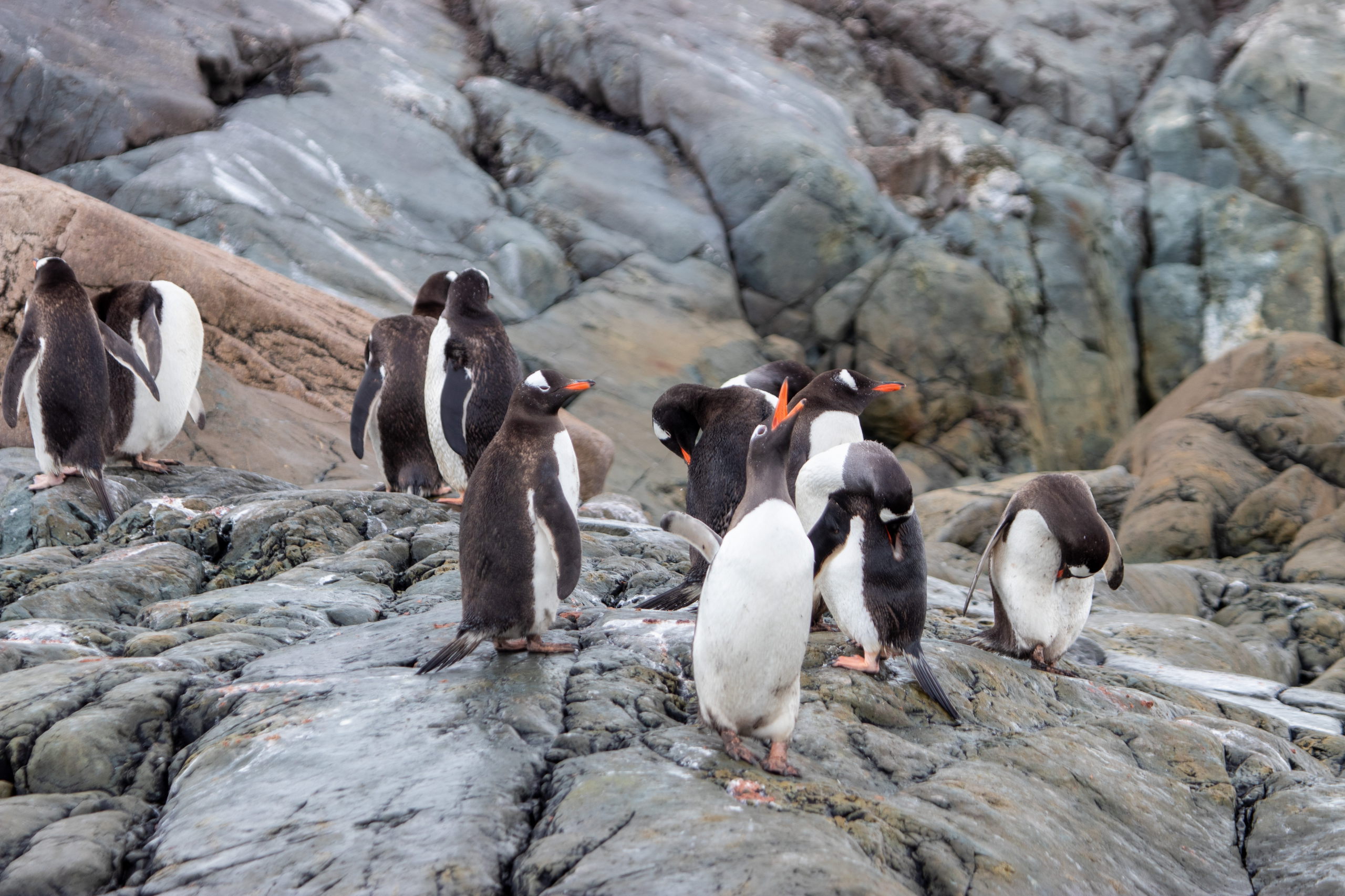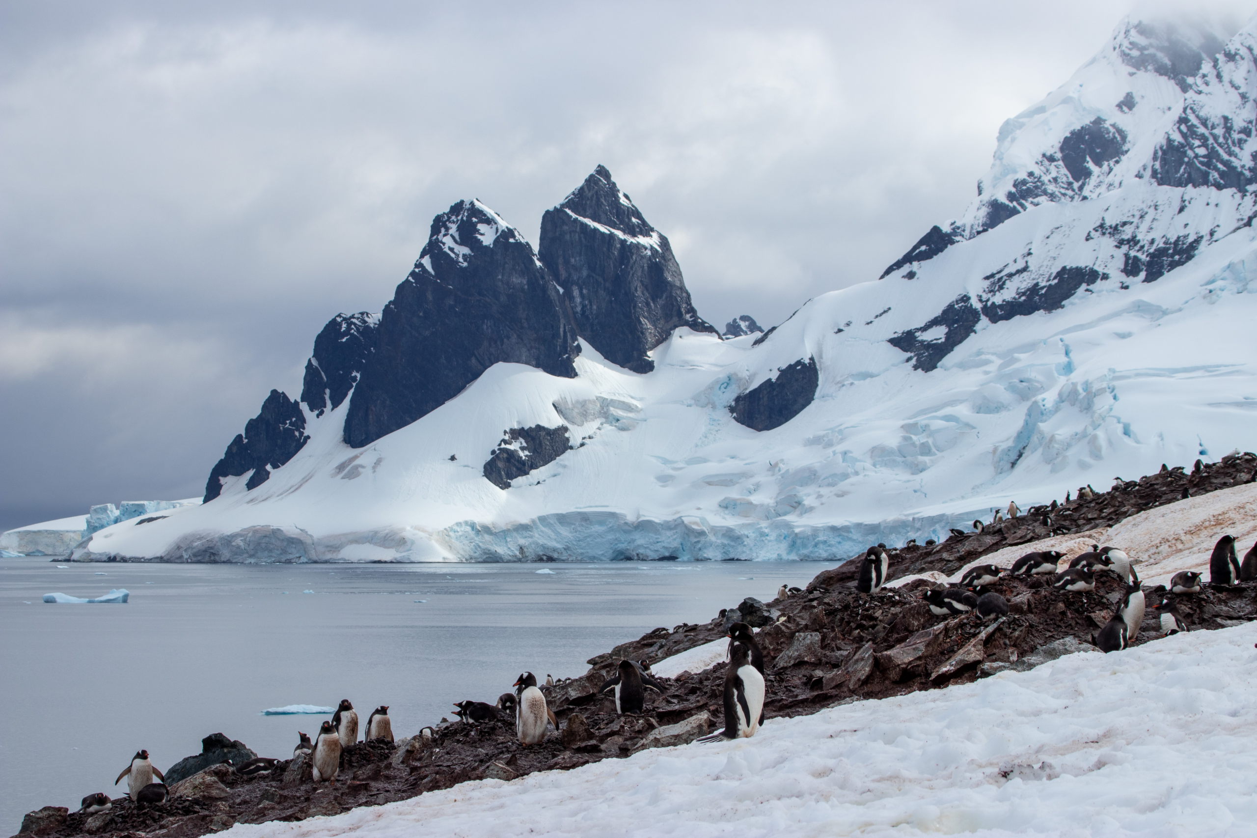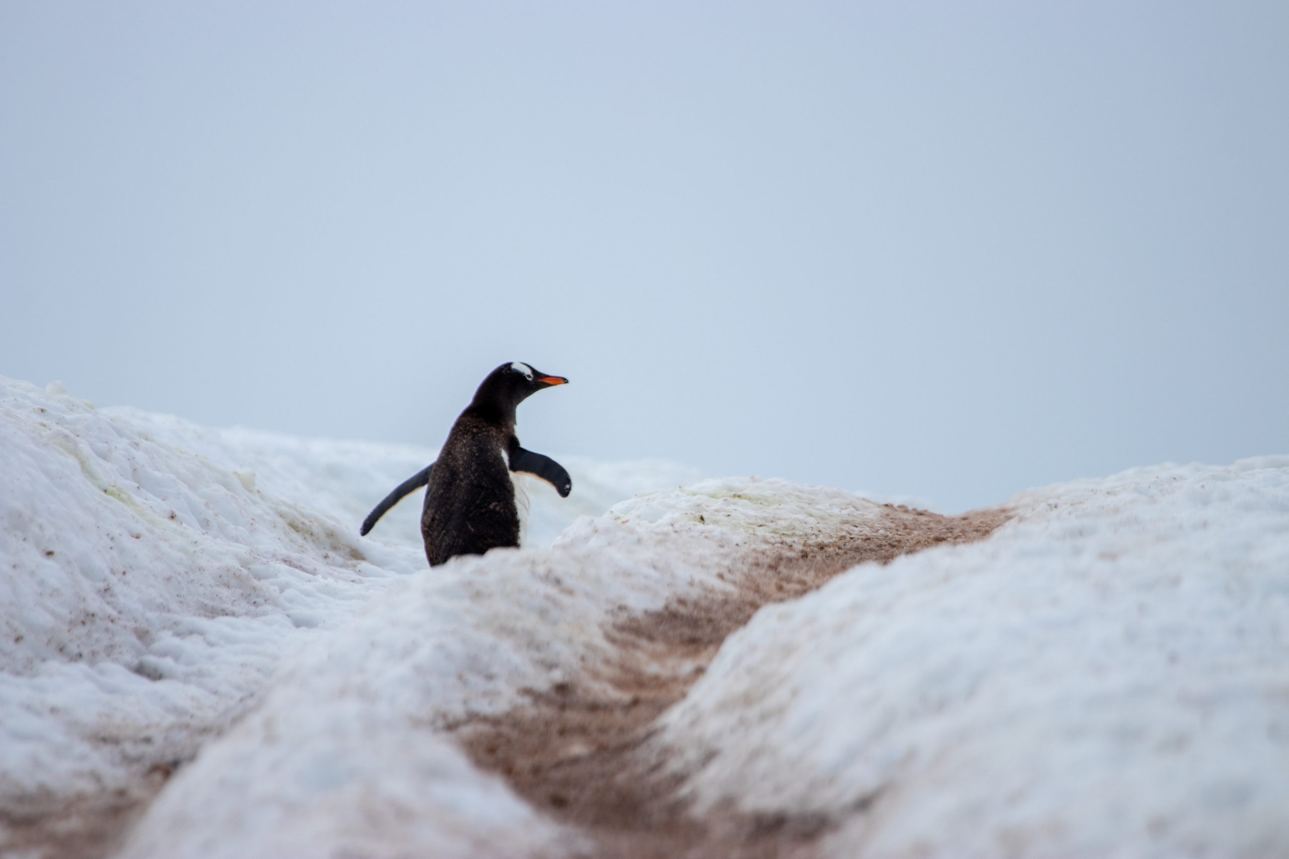 Wir ankern vor Danco Island. Das Wetter ist trüb. Hmmm, kein schöner Empfang. Doch dann treibt blau schimmerndes Eis vorbei. Also doch ein sehr schöner Empfang. Nach dem Frühstück geht es mit den Zodiacs um halb neun Uhr an Land zu einer Kolonie von Eselspinguinen auf Danco Island. Ich schnappe mir ein Paar Schneeschuhe und starte den Hang hinauf. Immer wieder muss ich anhalten. Nicht nur um zu fotografieren, sondern auch um die Pinguine vorbeizulassen. Die kleinen Racker haben nämlich Vorrang.