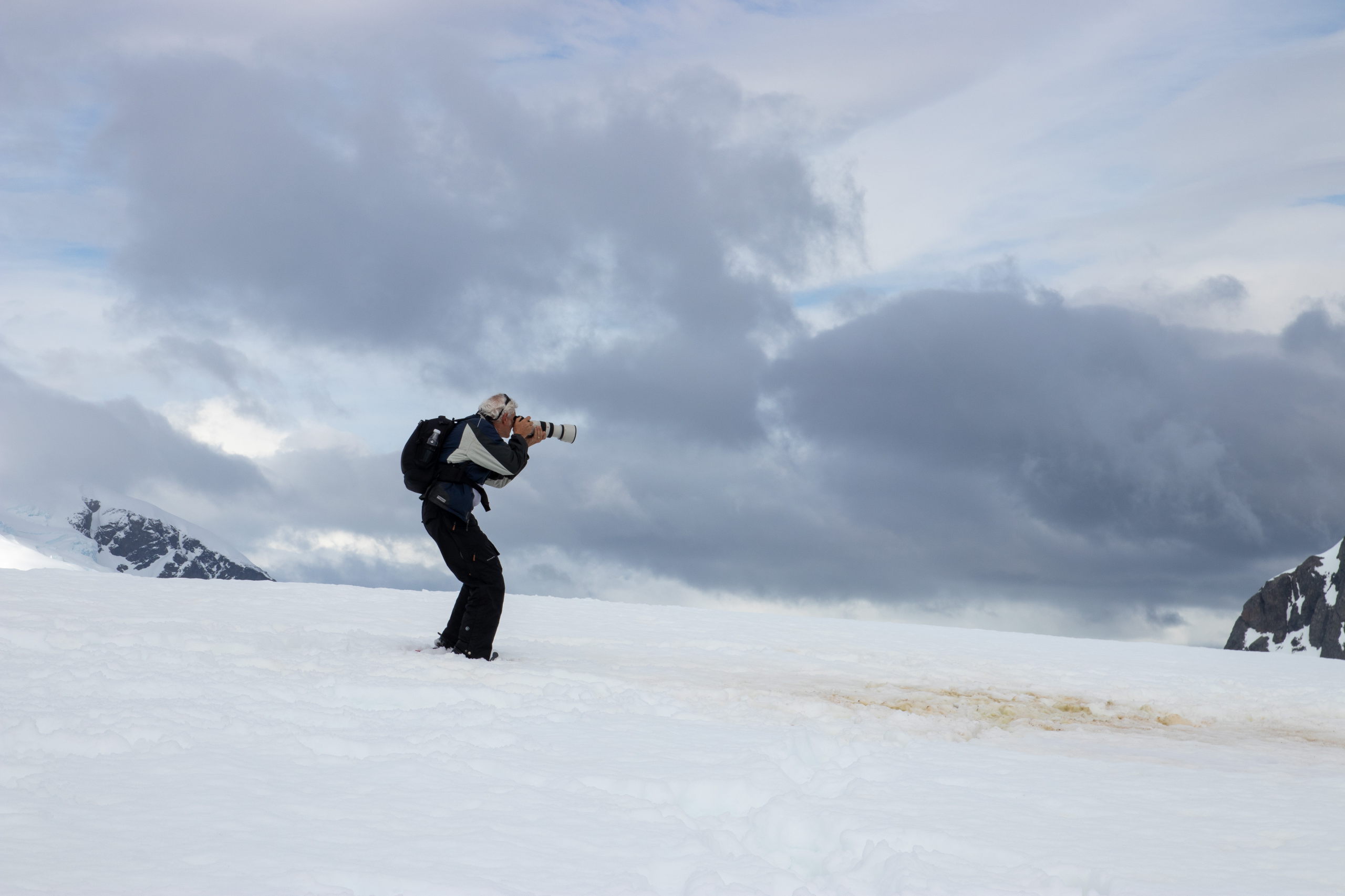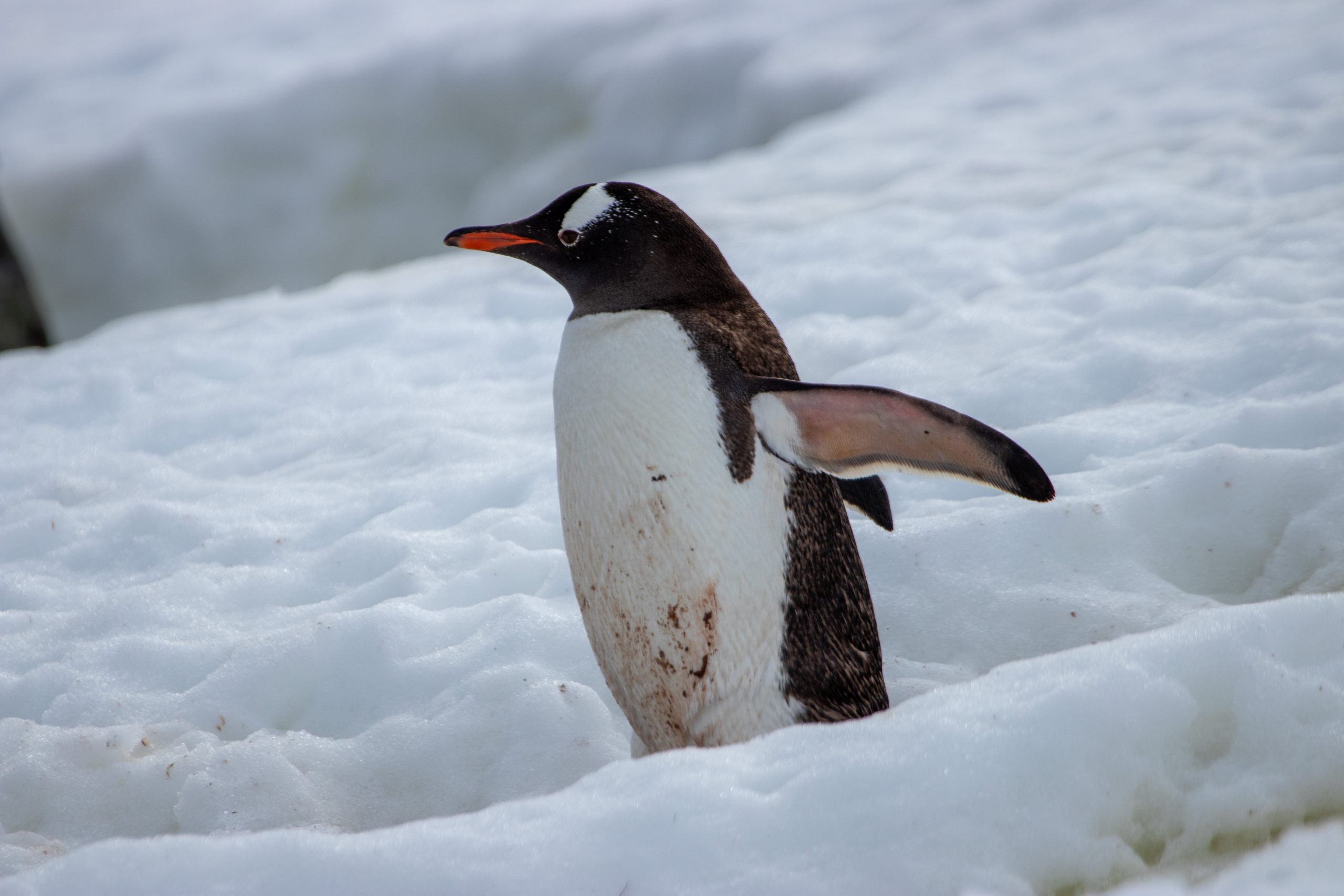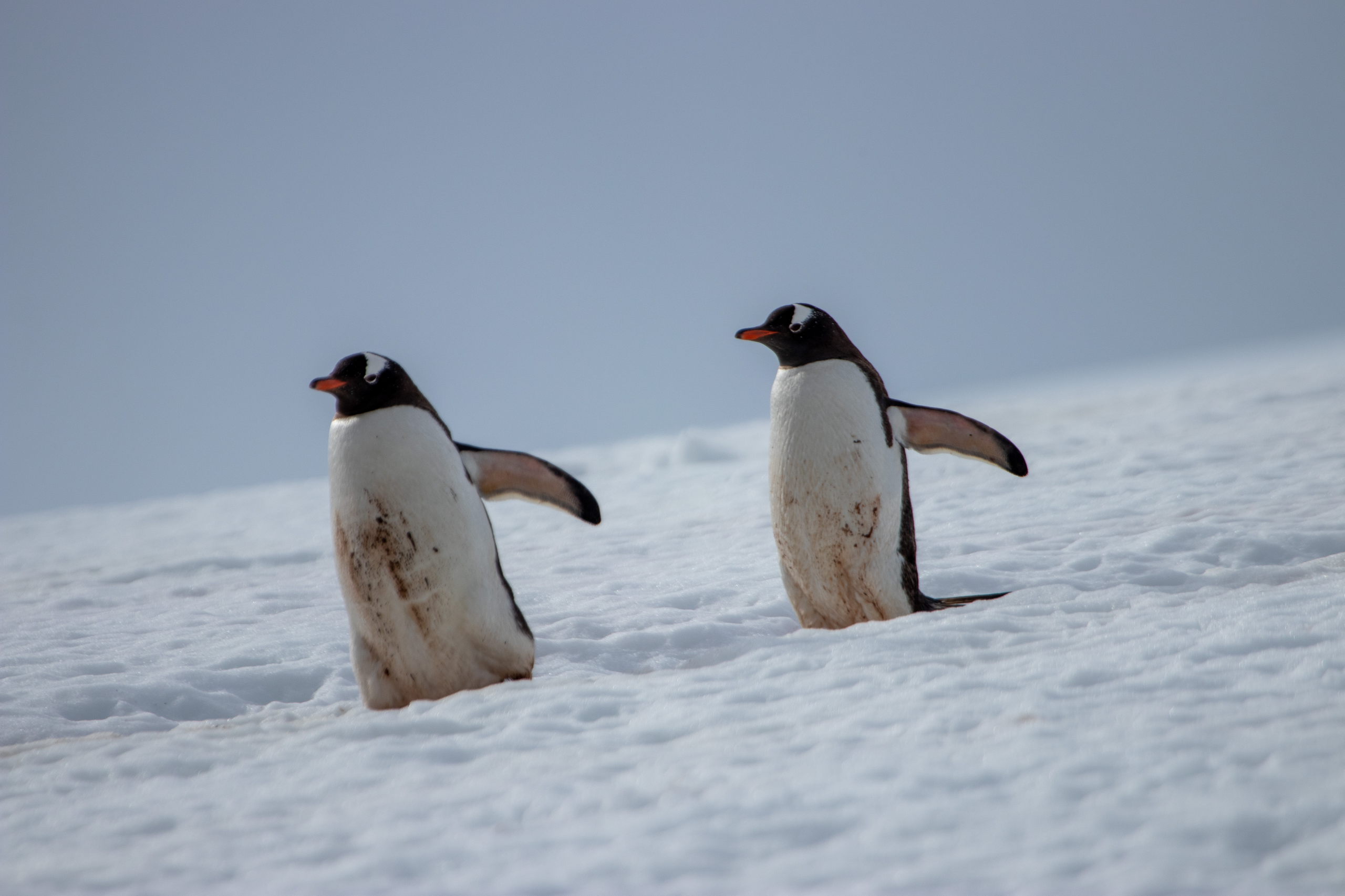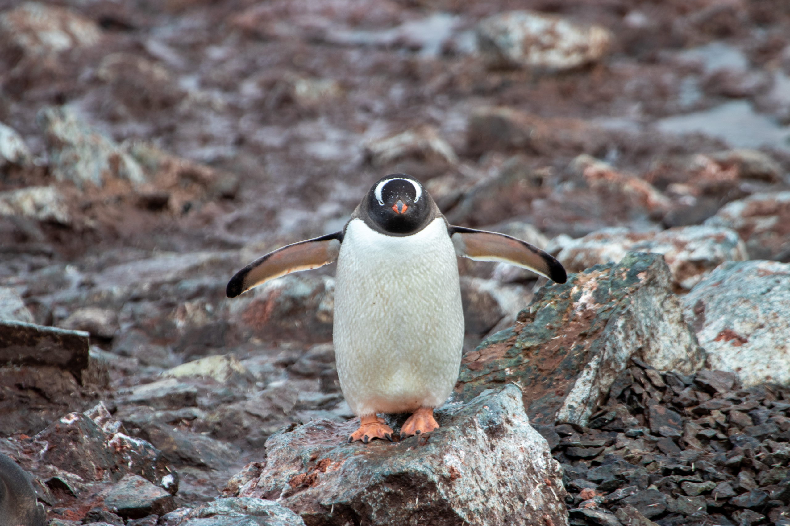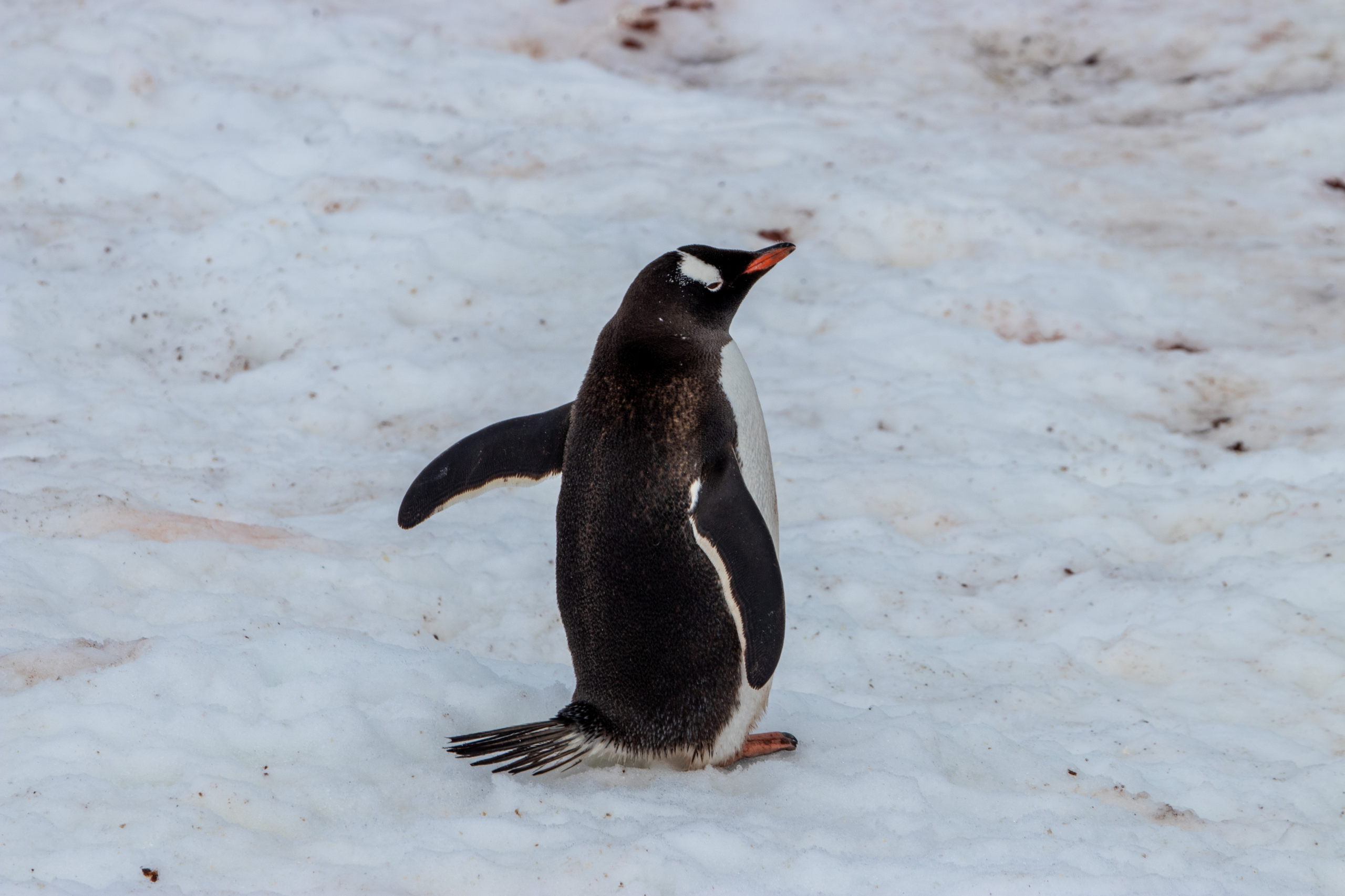 Wir ankern vor Danco Island. Das Wetter ist trüb. Hmmm, kein schöner Empfang. Doch dann treibt blau schimmerndes Eis vorbei. Also doch ein sehr schöner Empfang. Nach dem Frühstück geht es mit den Zodiacs um halb neun Uhr an Land zu einer Kolonie von Eselspinguinen auf Danco Island. Ich schnappe mir ein Paar Schneeschuhe und starte den Hang hinauf. Immer wieder muss ich anhalten. Nicht nur um zu fotografieren, sondern auch um die Pinguine vorbeizulassen. Die kleinen Racker haben nämlich Vorrang.