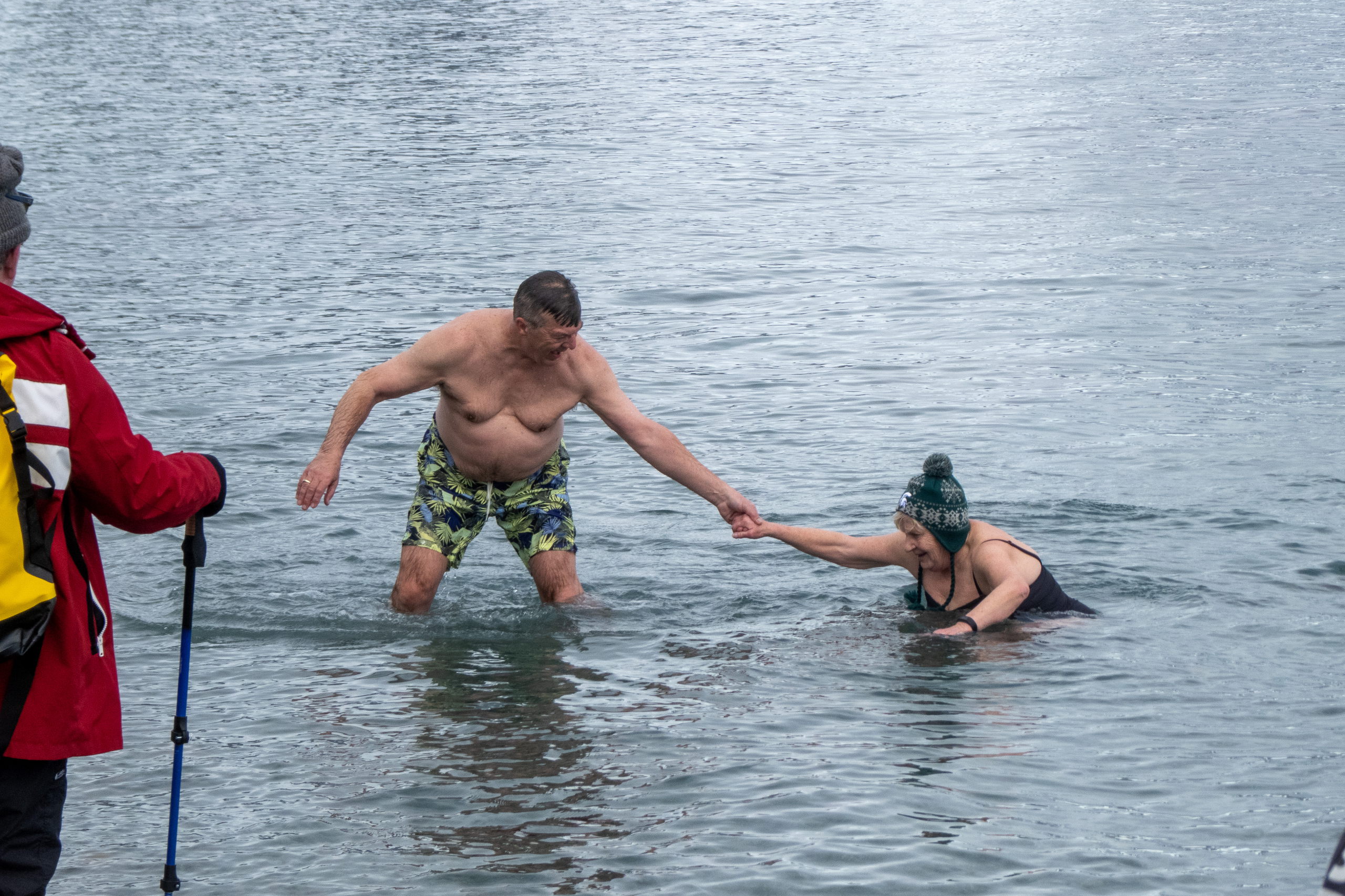 Zwischendurch regnet es immer wieder, zum Glück aber nicht viel. Wir laden ein paar Leute am Schiff ab und fahren wieder an Land, wo sich bereits eine große Gruppe Wagemutiger ins eiskalte Wasser zum sogenannten Polar Plunge stürzt. Für mich Warmduscher ist das nix und schon gar nicht mit meinem Husten. Alleine schon vom Zusehen wird mir kalt. Später erfahren wir, dass es noch nie so viele waren.