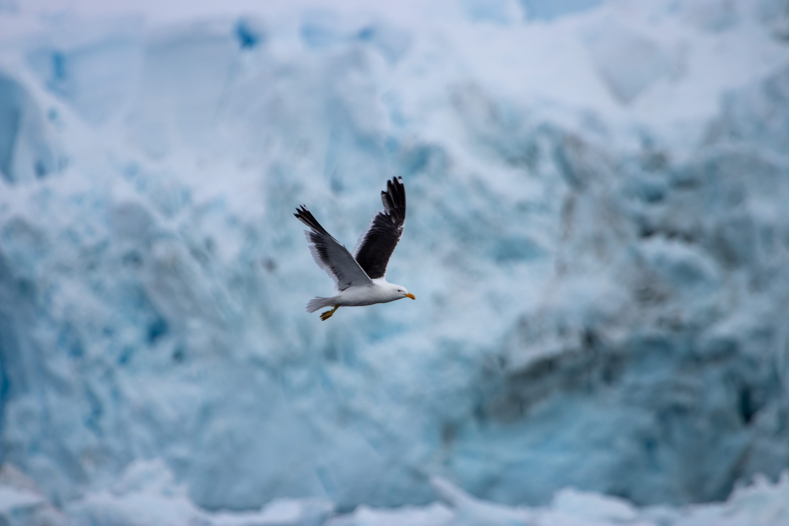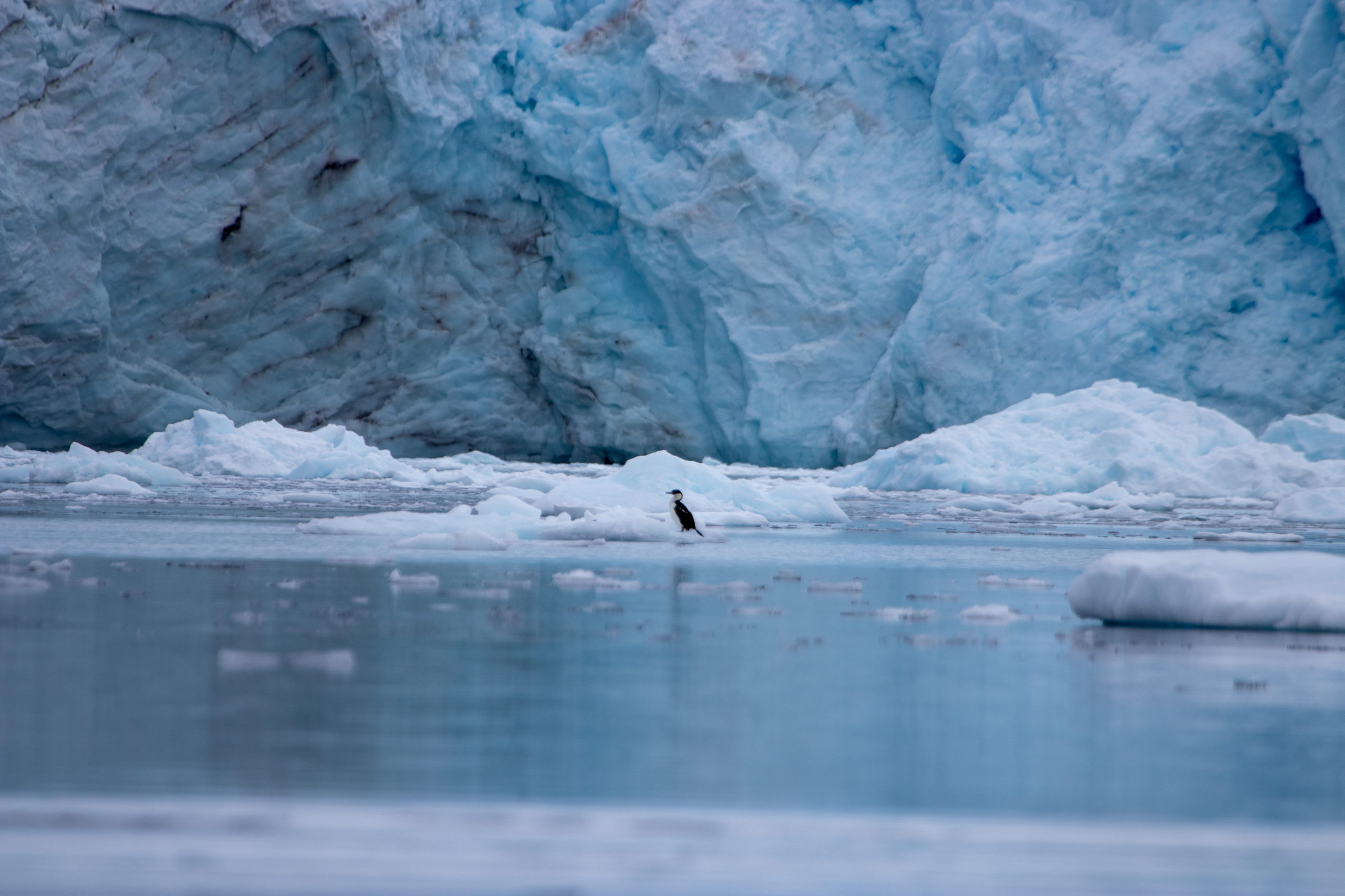 An manchen Stellen der Bucht ist das Wasser fast spiegelglatt und die Sonne scheint durch die Wolkendecke. Überall hört man das Eis knacken und krachen. Manchmal gehen Lawinen von den umliegenden Bergen ab. Was für eine beeindruckende Umgebung. Heute muss es der Wahnsinn sein, so nahe an den Tieren mit dem Kajak unterwegs zu sein.