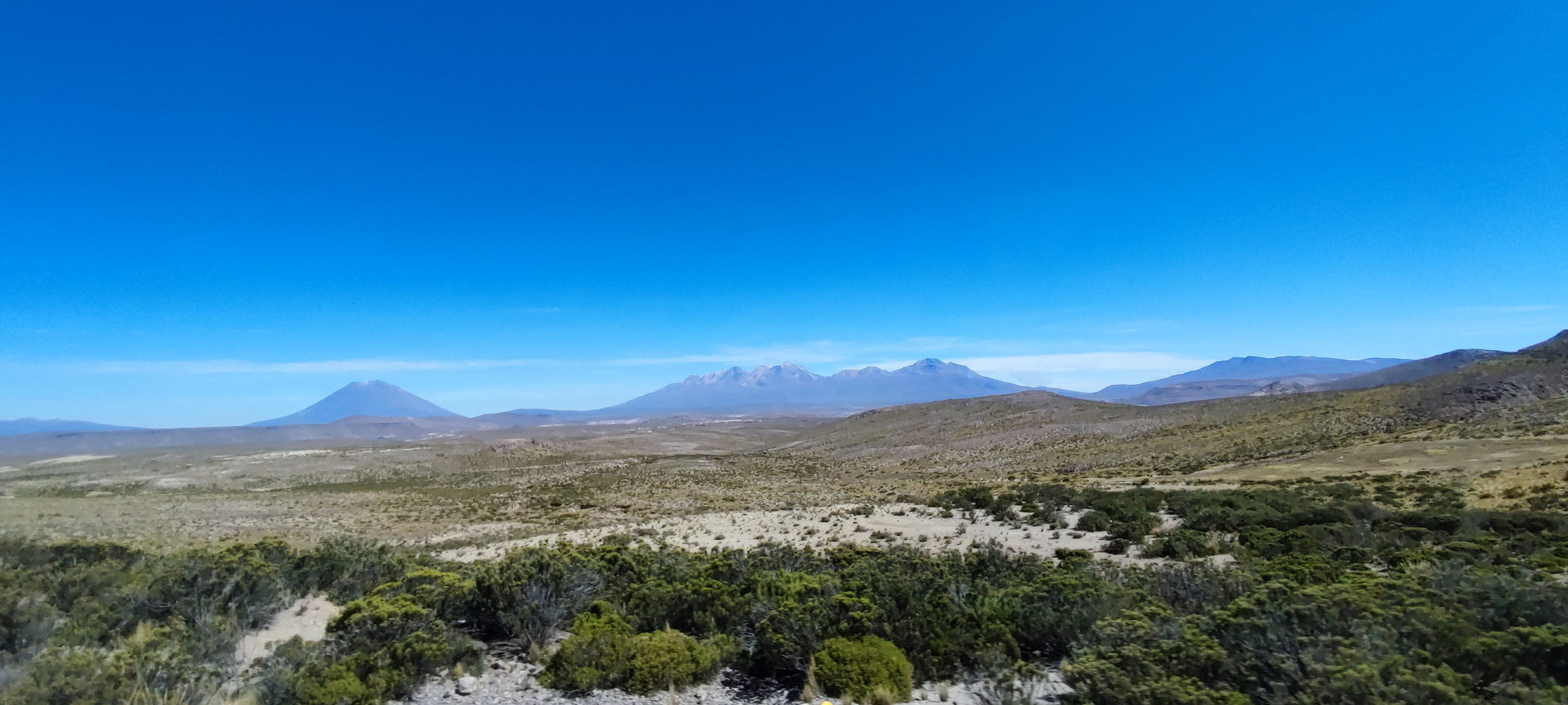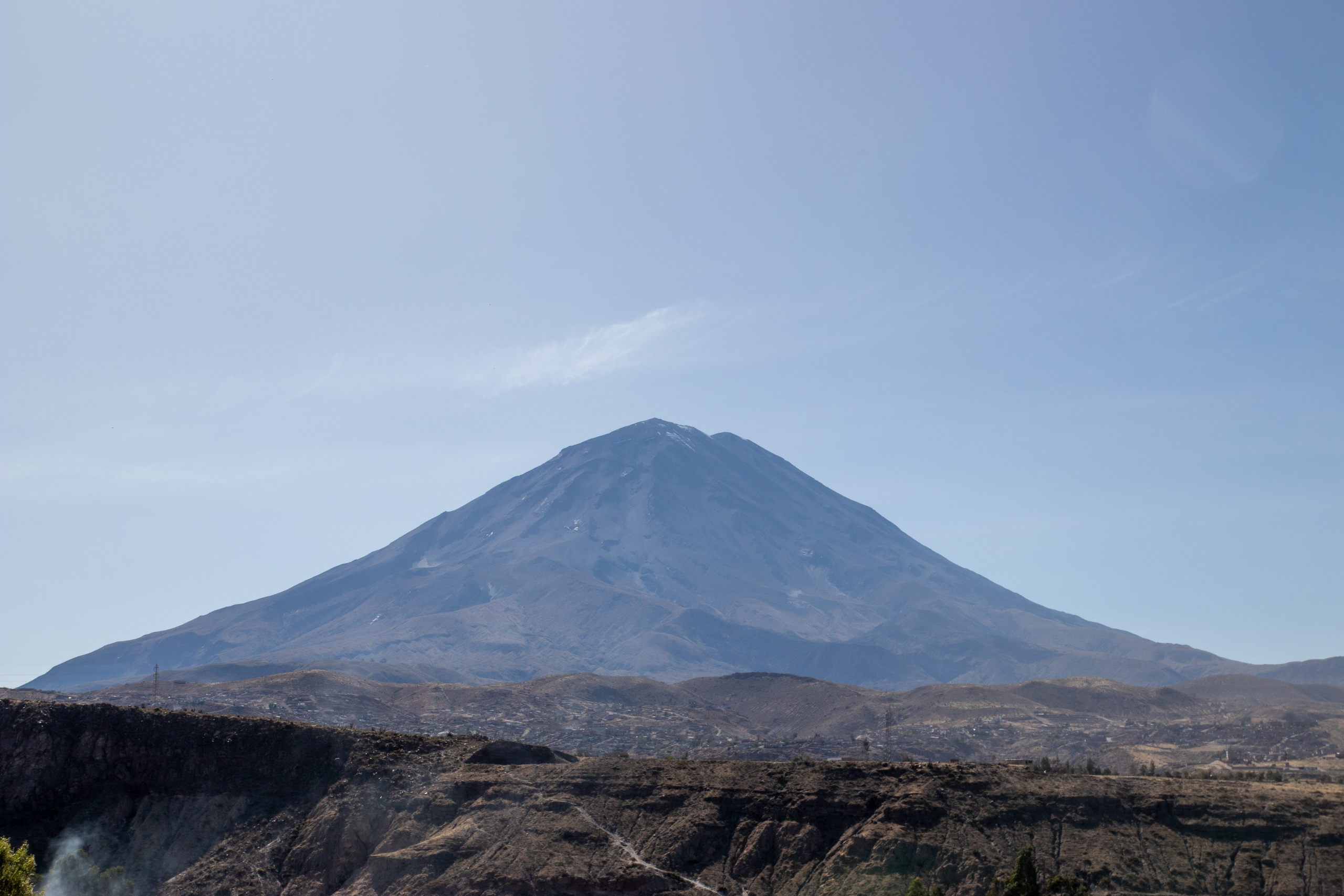 Es geht auf fast 4600 m hinauf und an vielen Lagunen vorbei. Flamingos, Vicuñas, Alpakas, Schafe und anderes Getier ist zu sehen. Der alte Mann neben mir und ich dösen um die Wette. Er gewinnt, da mir vom unbequemen Sitz der A. weh tut und ich immer wieder aufwache. Der Gipfel des Volcán Chachani und der perfekte Konus des Volcán Misti kommen ins Blickfeld. Es ist also nicht mehr weit.