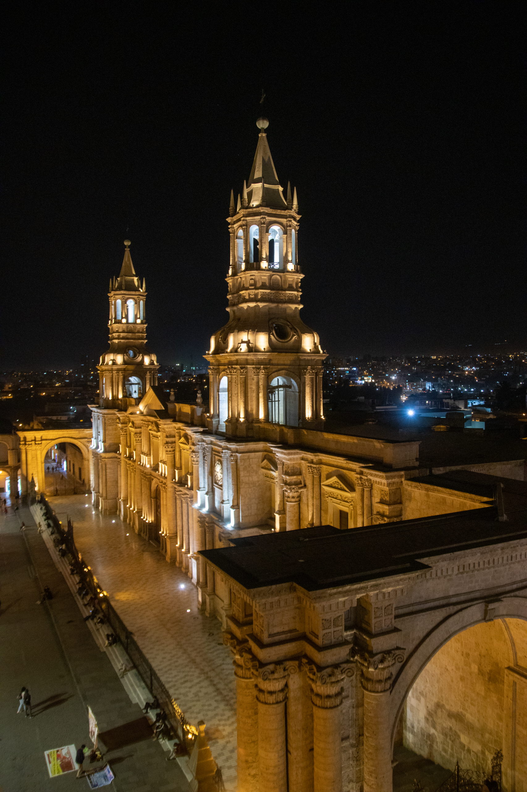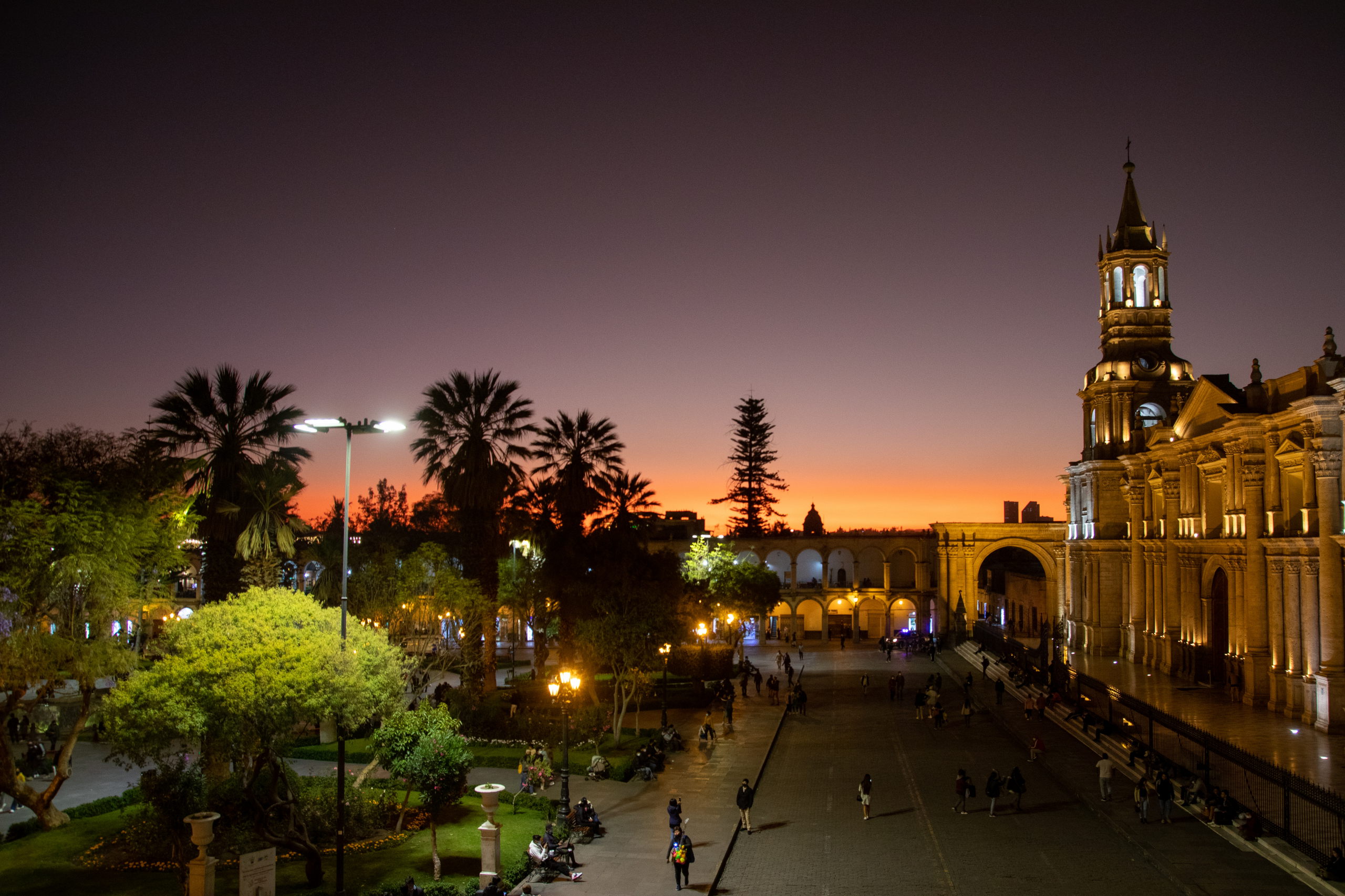 Die Besichtigung macht durstig und ich begebe mich in ein Restaurant am Plaza de Armas. Bei einem guten Bier checke ich die Möglichkeiten nach Cabanaconde und zum Colca Canyon zu kommen. Hmmm, es scheint nur in der Früh möglich zu sein. Also muss ich eine Nacht länger bleiben. Ich beobachte den Sonnenuntergang, der mit dem Plaza de Armas und der Kathedrale im Vordergrund ziemlich spektakulär aussieht.