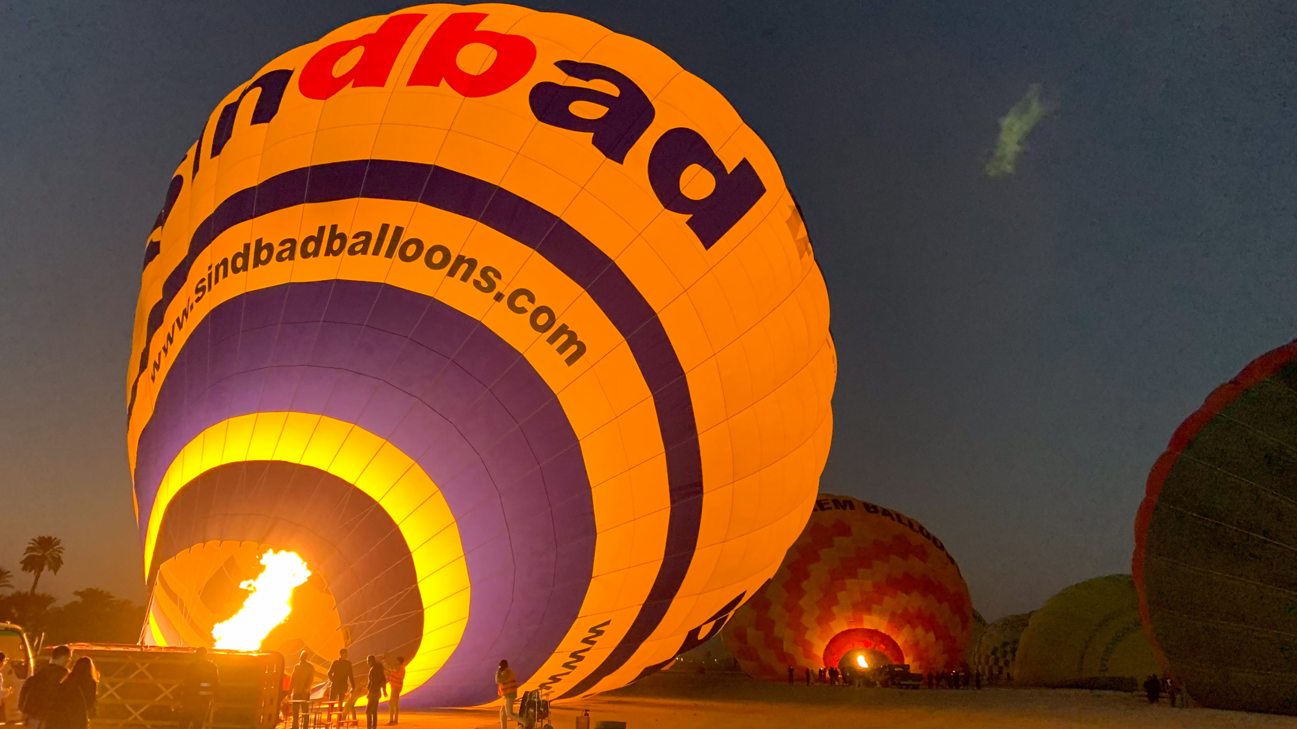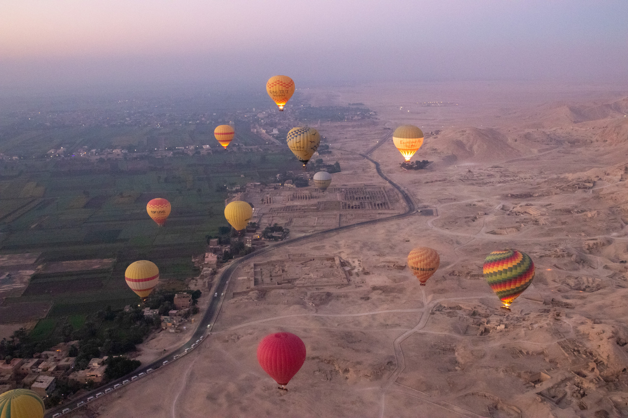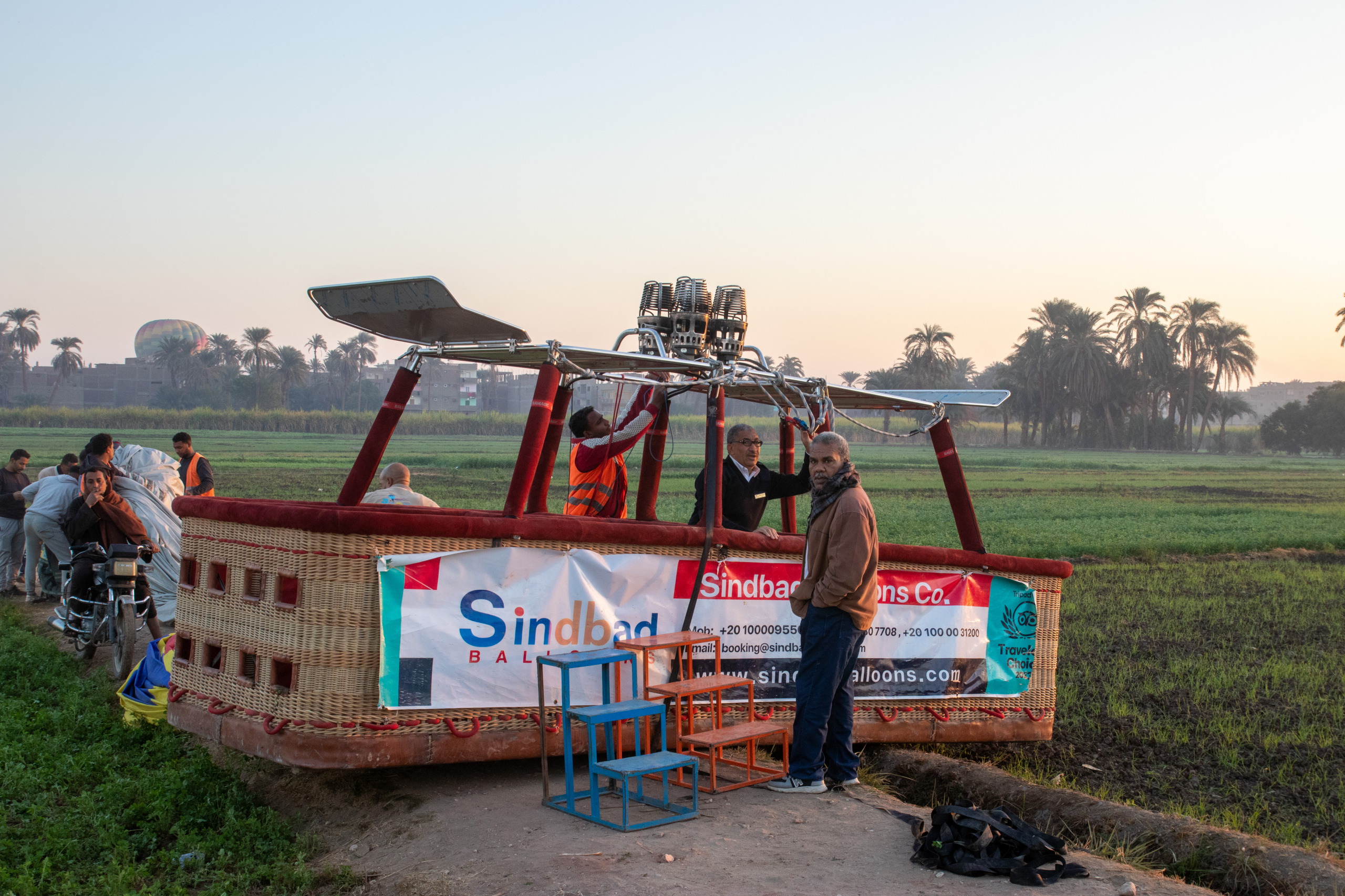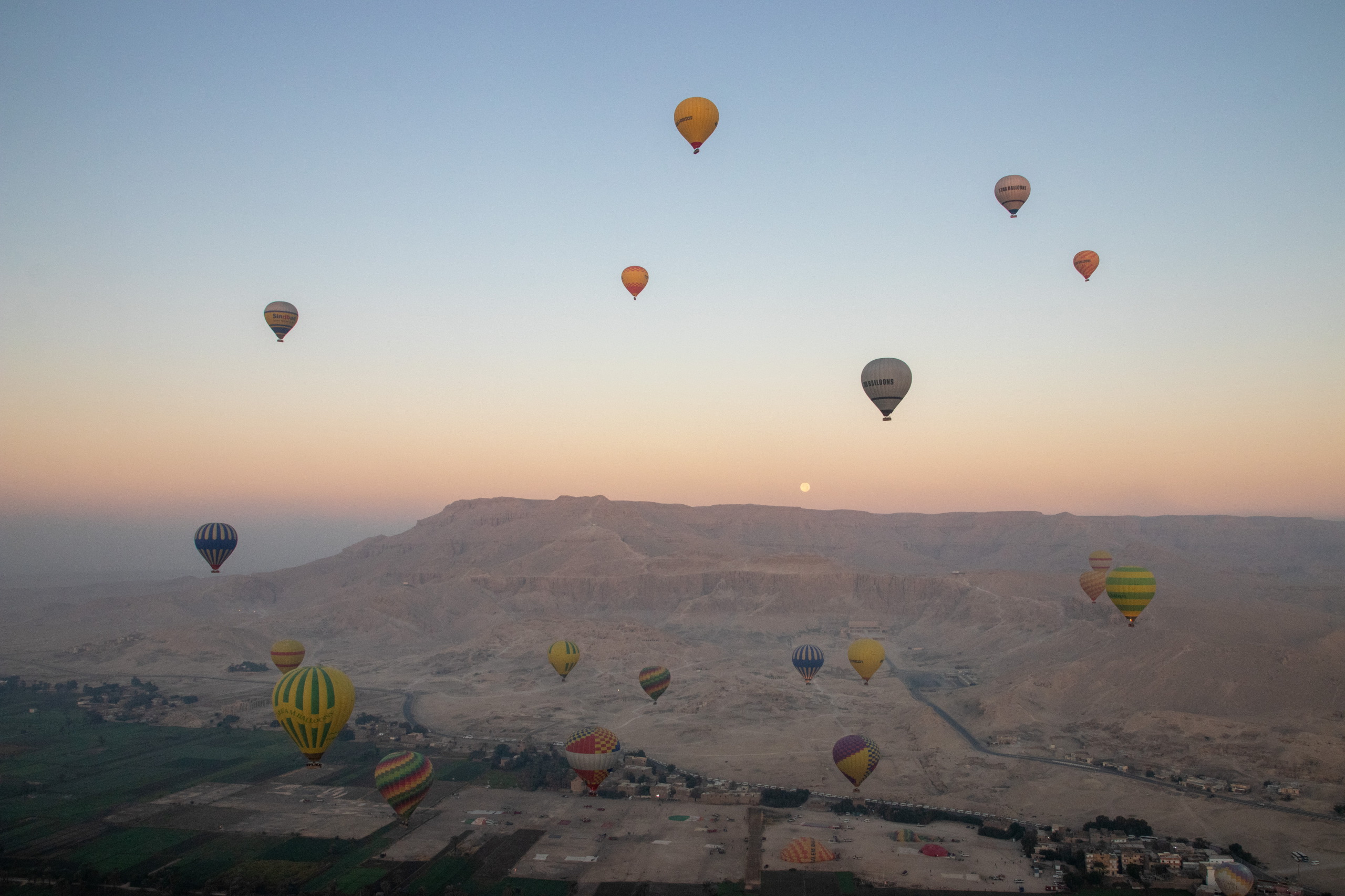 Nach einem kurzen Briefing mit allen notwendigen Informationen, werden die 28 Leute in 3er- und 4er- Gruppen eingeteilt. Um Punkt sechs Uhr gibt es das finale Go und die Gebläse werden angeworfen. Nachdem die Ballons fast voll sind, wird noch ordentlich mit riesigen Gasflammen eingeheizt. Kurz darauf werden wir zum riesigen Korb gebracht und jede Gruppe klettert in ihr eigenes Abteil mit Griffen für eine möglicherweise ruppige Landung. Es wackelt etwas, als sich der Ballon zu heben beginnt, da er noch von der Bodencrew unten gehalten wird. Sowie sie ihn freigeben, heben wir sanft ab, ohne es zu spüren. Ziemlich knapp an einem anderen Ballon vorbei, gewinnen wir schnell an Höhe mit fantastischer Sicht über die Thebanische Nekropole.