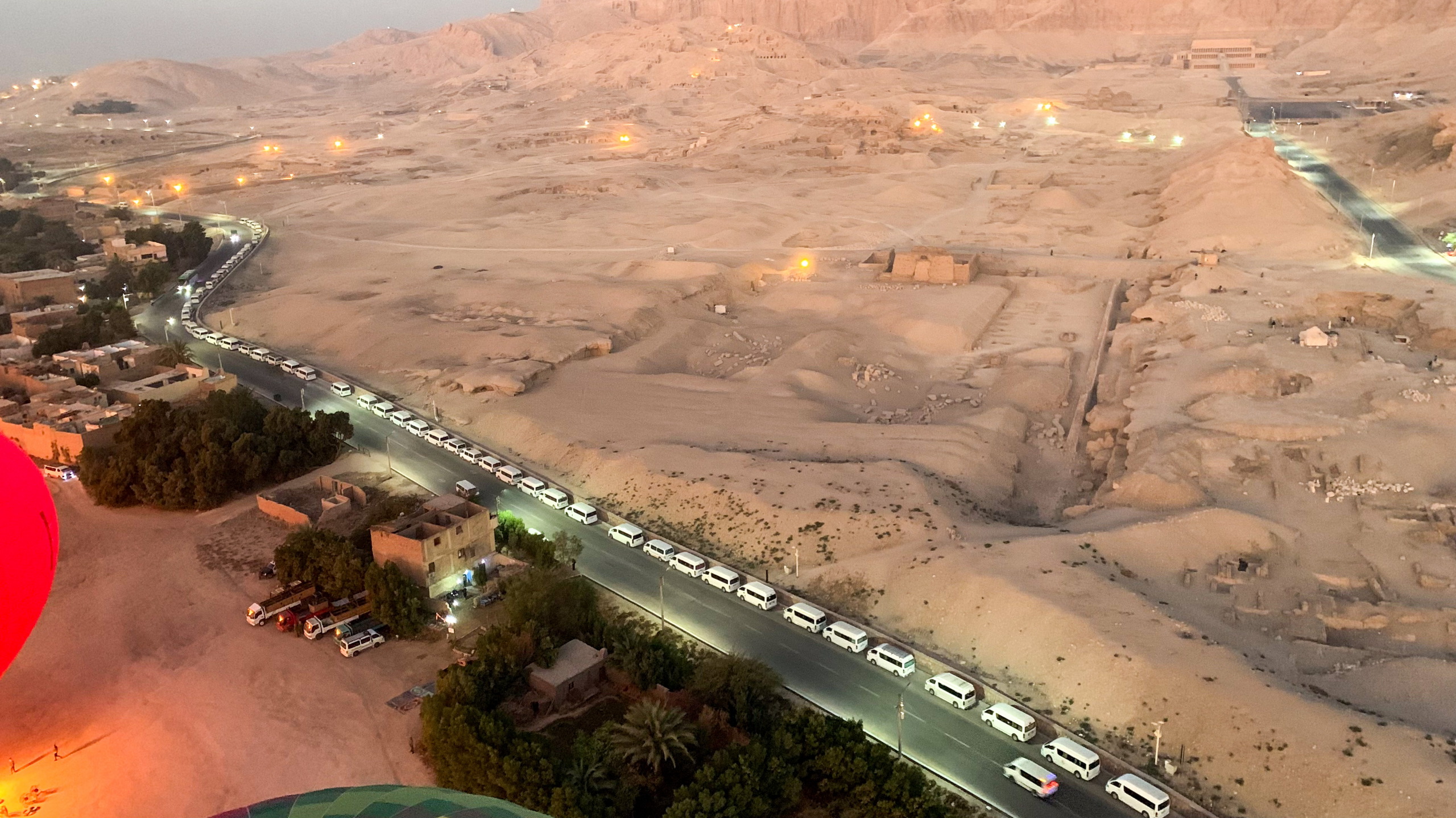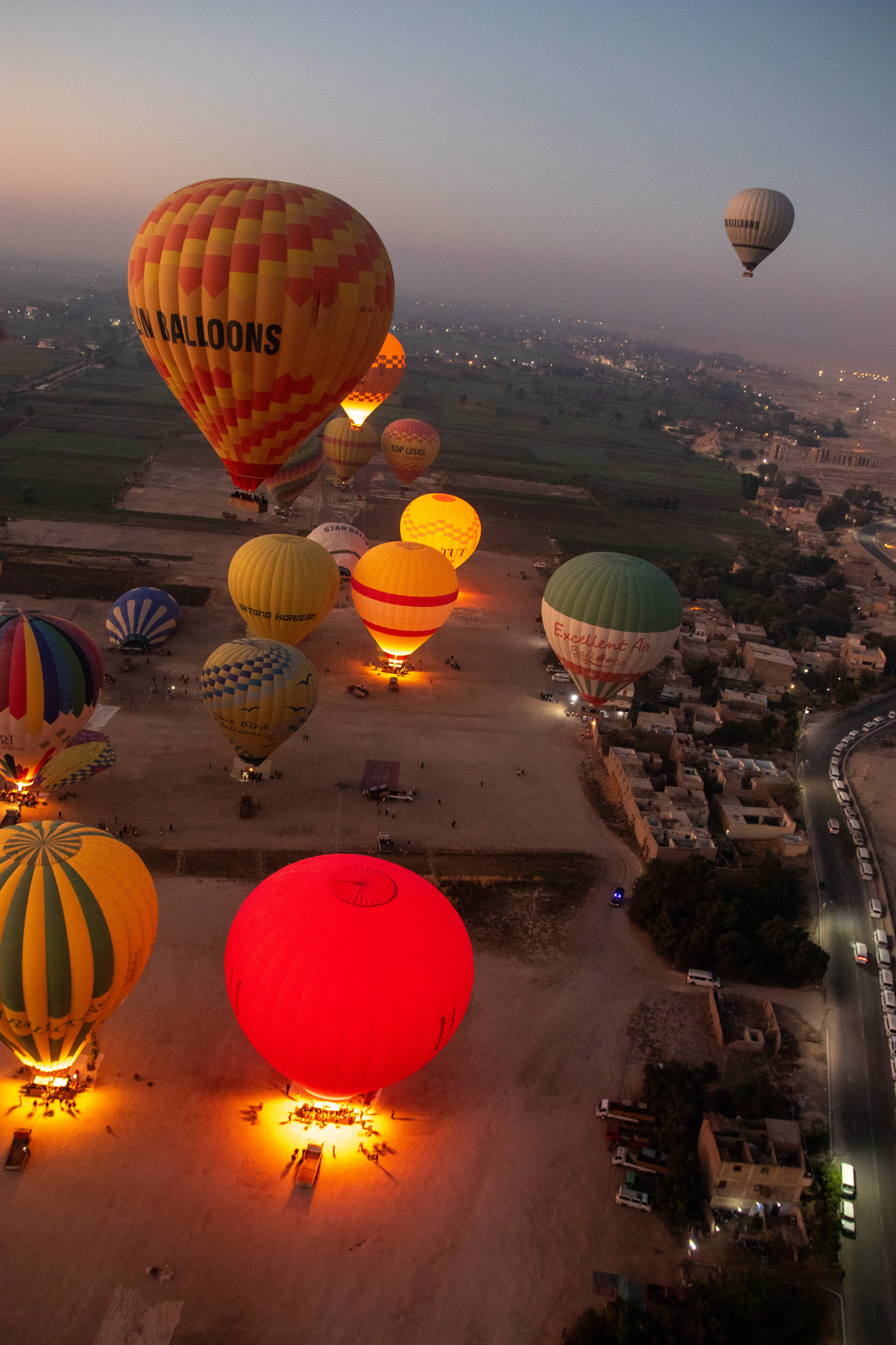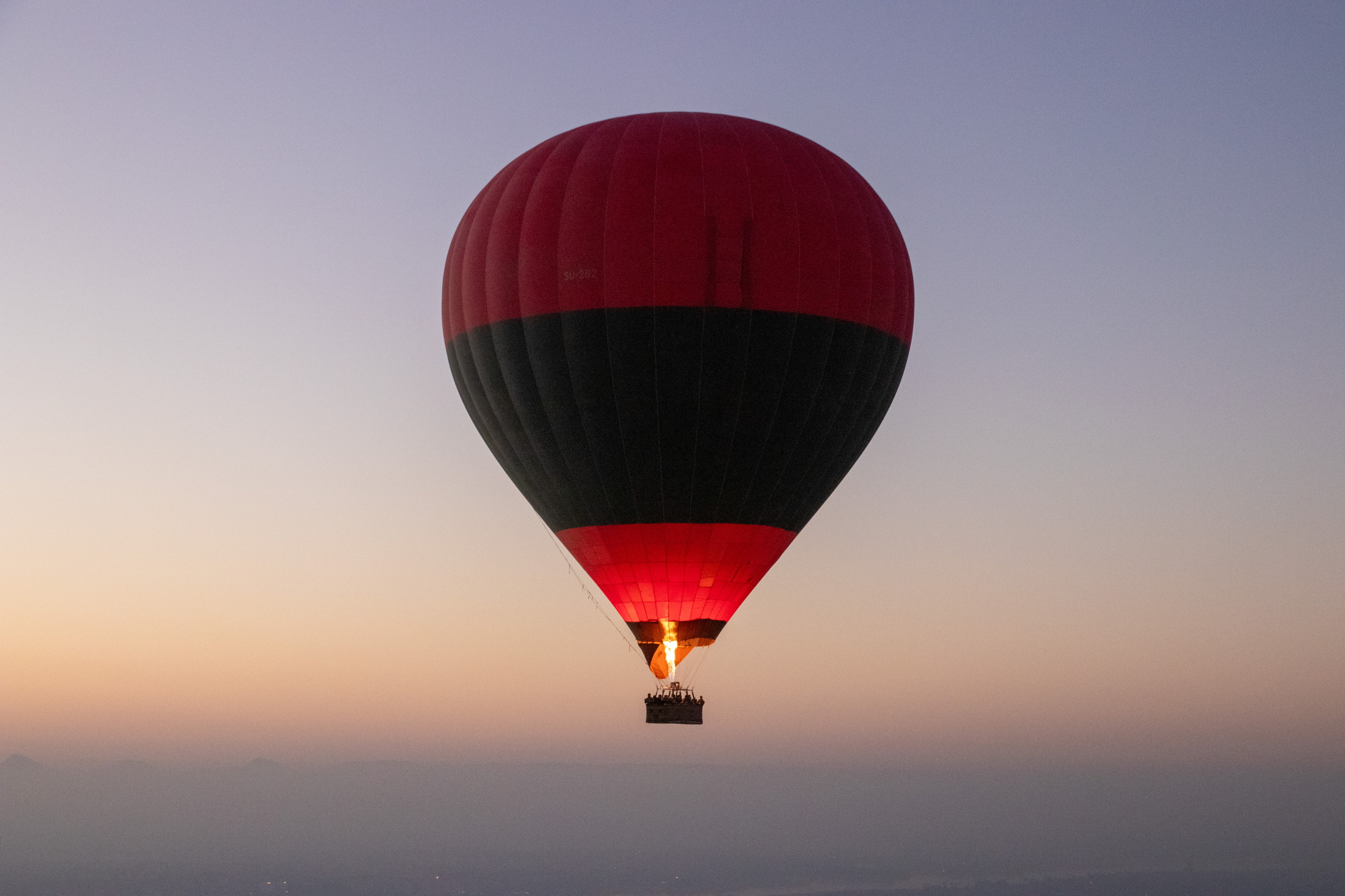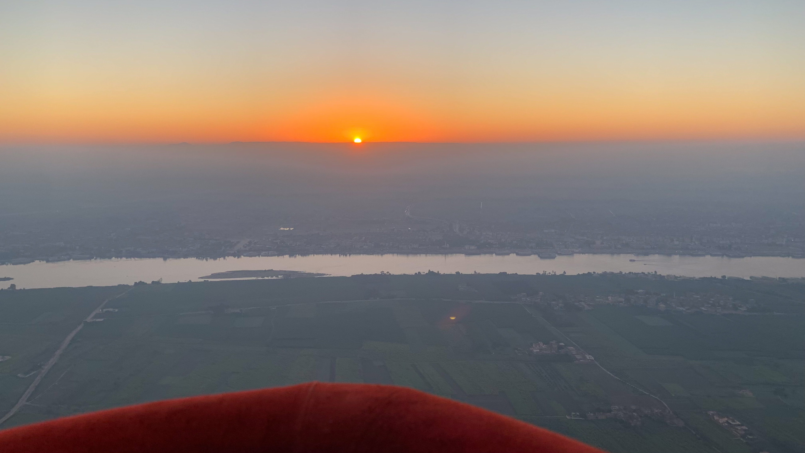 Nach einem kurzen Briefing mit allen notwendigen Informationen, werden die 28 Leute in 3er- und 4er- Gruppen eingeteilt. Um Punkt sechs Uhr gibt es das finale Go und die Gebläse werden angeworfen. Nachdem die Ballons fast voll sind, wird noch ordentlich mit riesigen Gasflammen eingeheizt. Kurz darauf werden wir zum riesigen Korb gebracht und jede Gruppe klettert in ihr eigenes Abteil mit Griffen für eine möglicherweise ruppige Landung. Es wackelt etwas, als sich der Ballon zu heben beginnt, da er noch von der Bodencrew unten gehalten wird. Sowie sie ihn freigeben, heben wir sanft ab, ohne es zu spüren. Ziemlich knapp an einem anderen Ballon vorbei, gewinnen wir schnell an Höhe mit fantastischer Sicht über die Thebanische Nekropole.