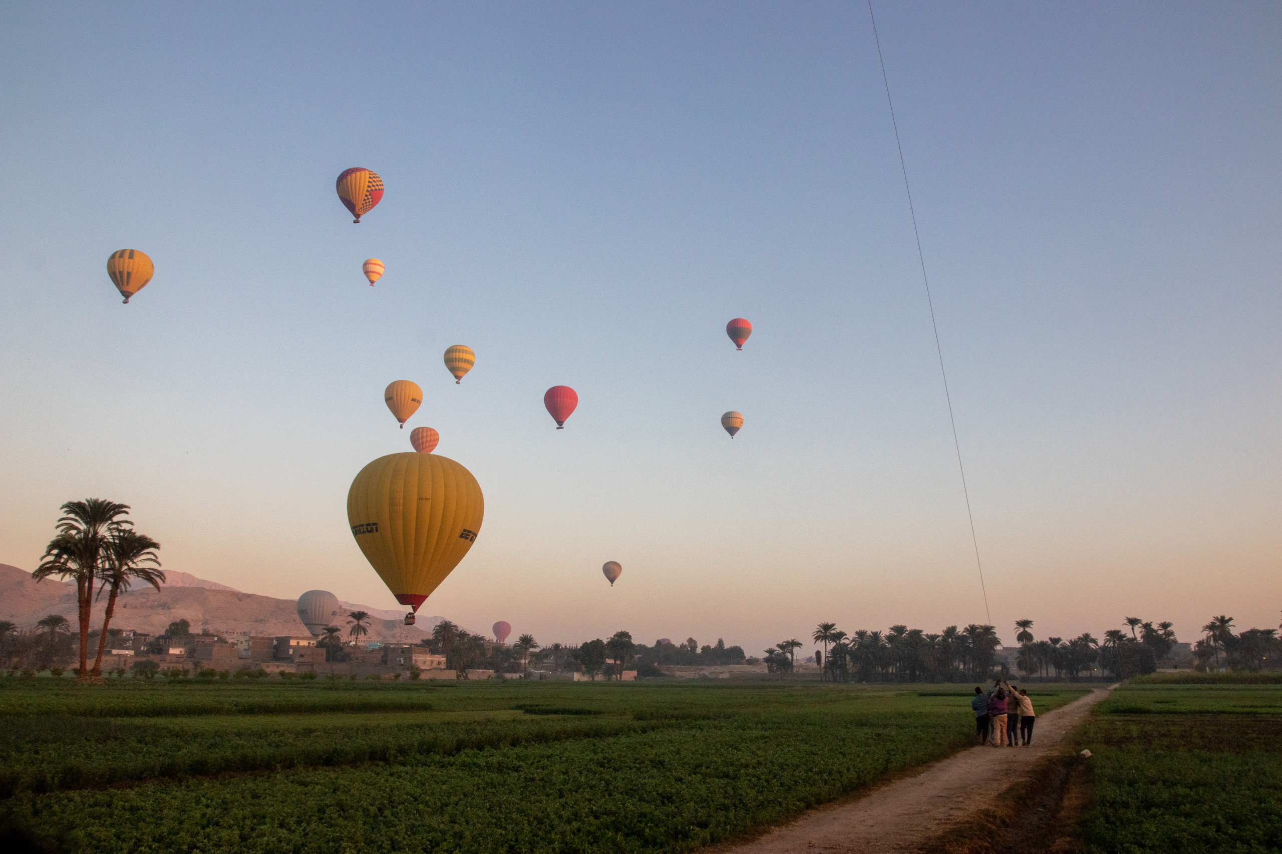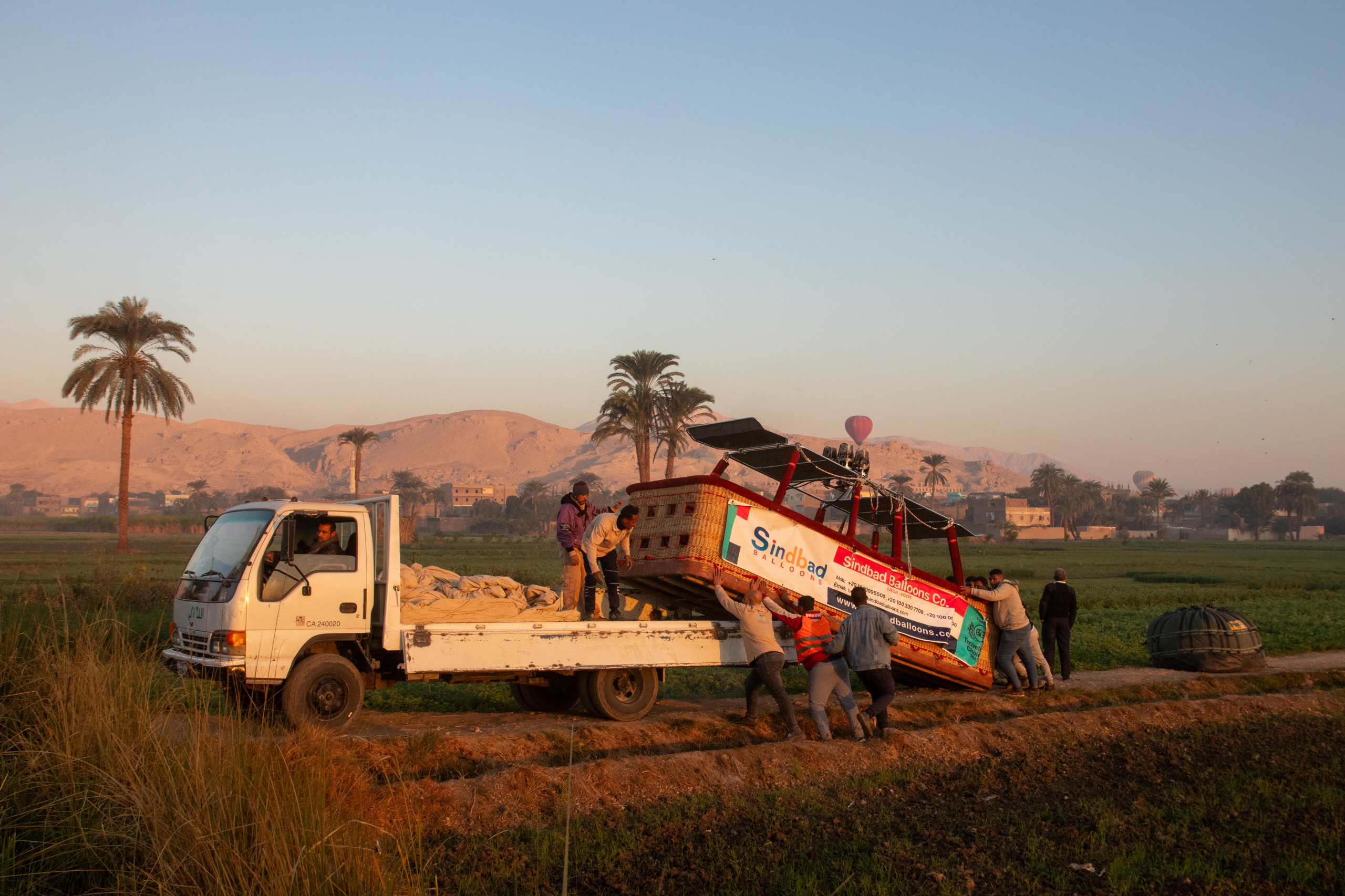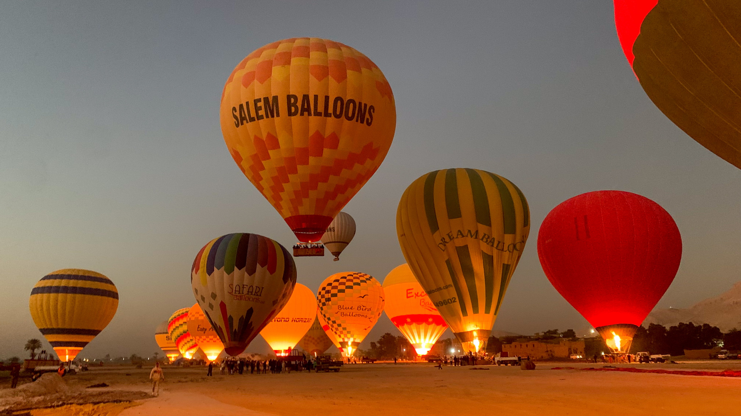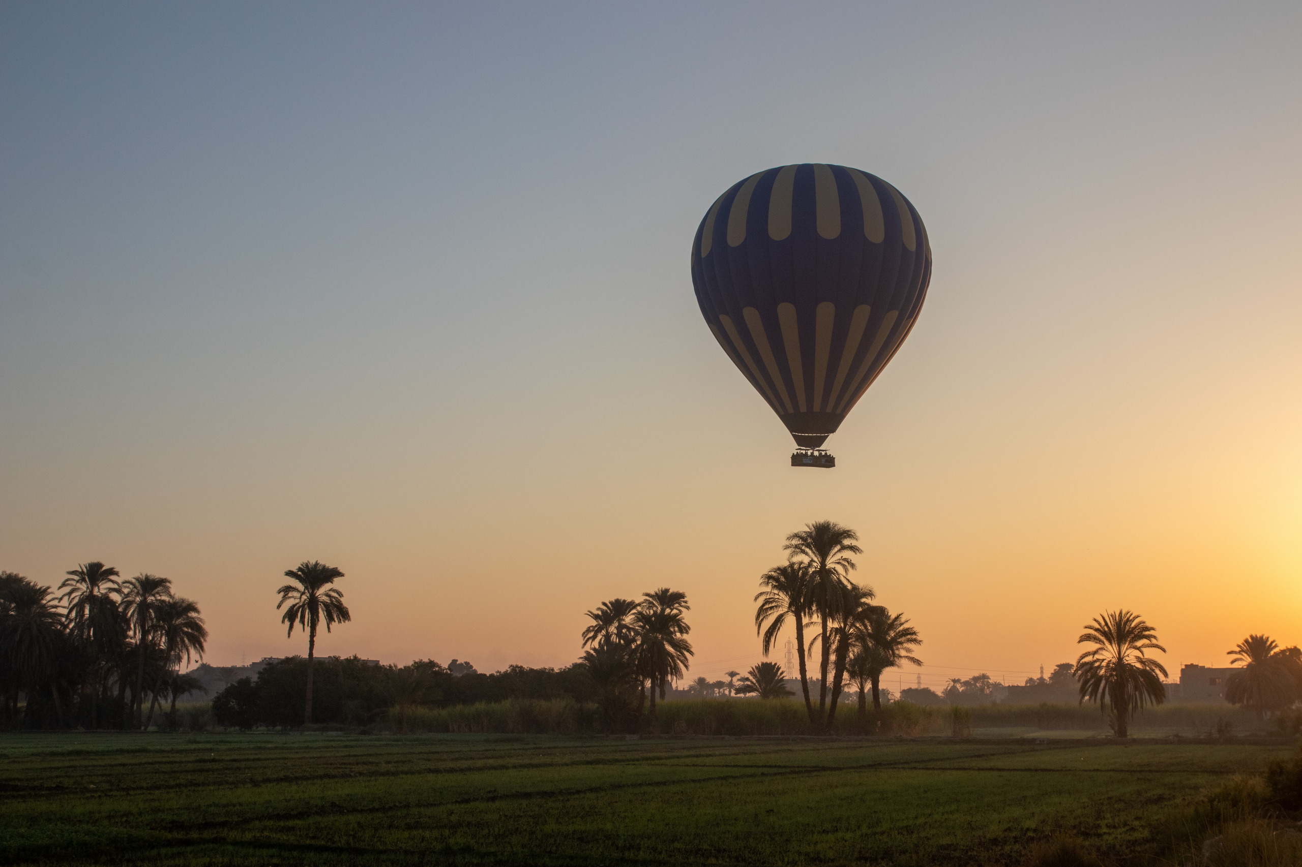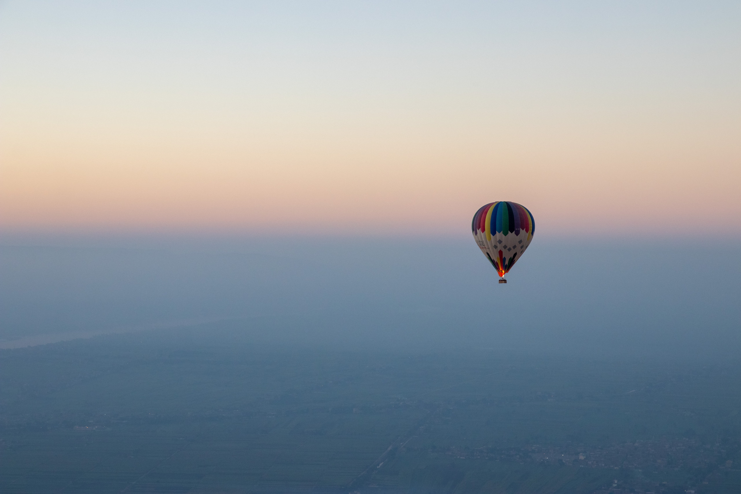 Nach einem kurzen Briefing mit allen notwendigen Informationen, werden die 28 Leute in 3er- und 4er- Gruppen eingeteilt. Um Punkt sechs Uhr gibt es das finale Go und die Gebläse werden angeworfen. Nachdem die Ballons fast voll sind, wird noch ordentlich mit riesigen Gasflammen eingeheizt. Kurz darauf werden wir zum riesigen Korb gebracht und jede Gruppe klettert in ihr eigenes Abteil mit Griffen für eine möglicherweise ruppige Landung. Es wackelt etwas, als sich der Ballon zu heben beginnt, da er noch von der Bodencrew unten gehalten wird. Sowie sie ihn freigeben, heben wir sanft ab, ohne es zu spüren. Ziemlich knapp an einem anderen Ballon vorbei, gewinnen wir schnell an Höhe mit fantastischer Sicht über die Thebanische Nekropole.
