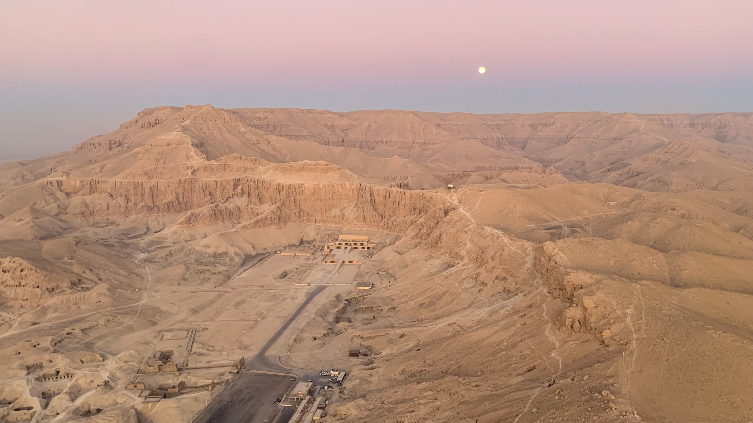 Der Vollmond steht noch über den Bergen, während sich auf der anderen Seite bereits die Sonne ankündigt. Langsam steigen wir höher, bis wir 600 Meter erreichen. Dabei dreht sich der Korb immer wieder, sodass jeder in jede Richtung blicken kann.
