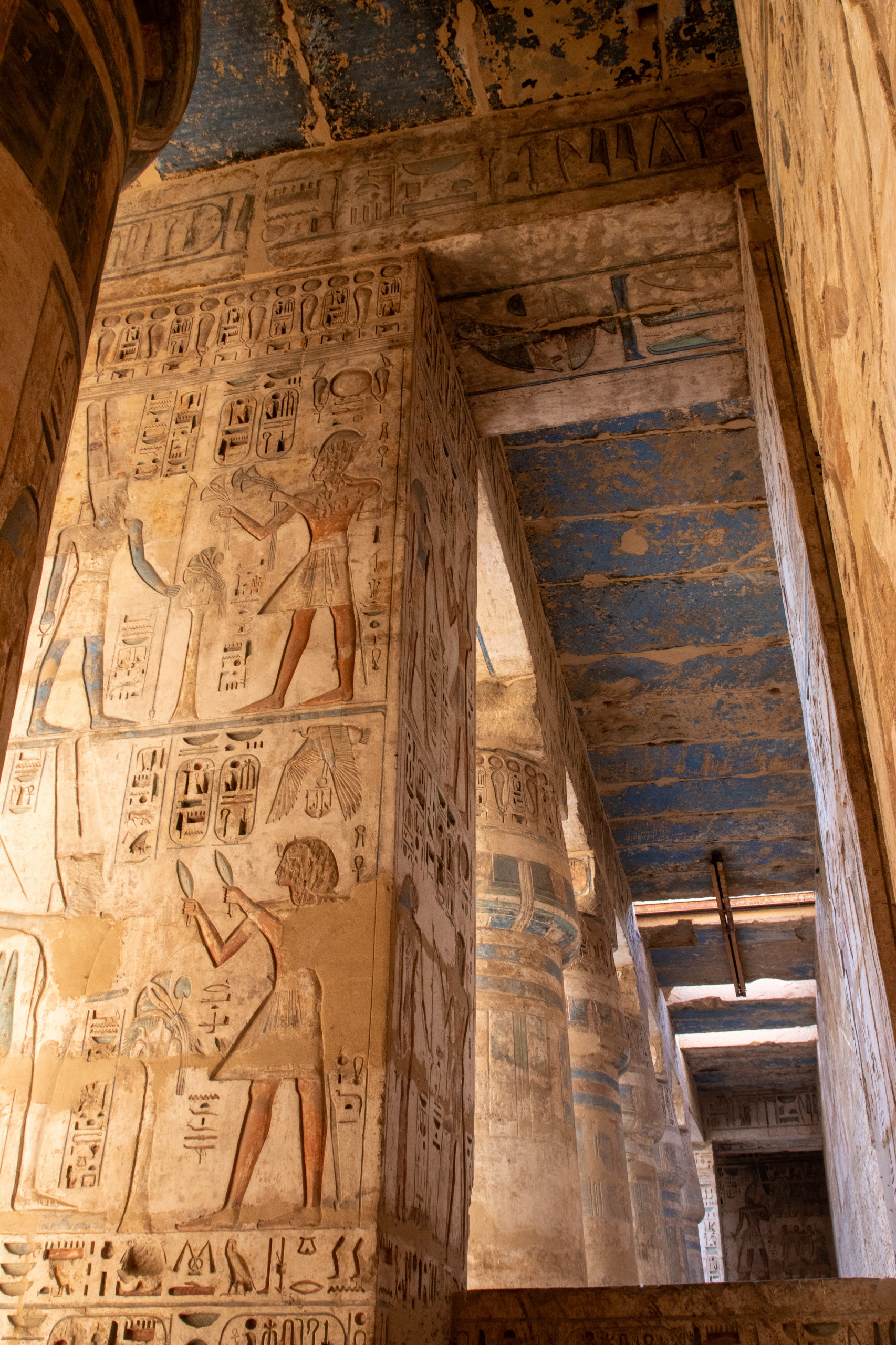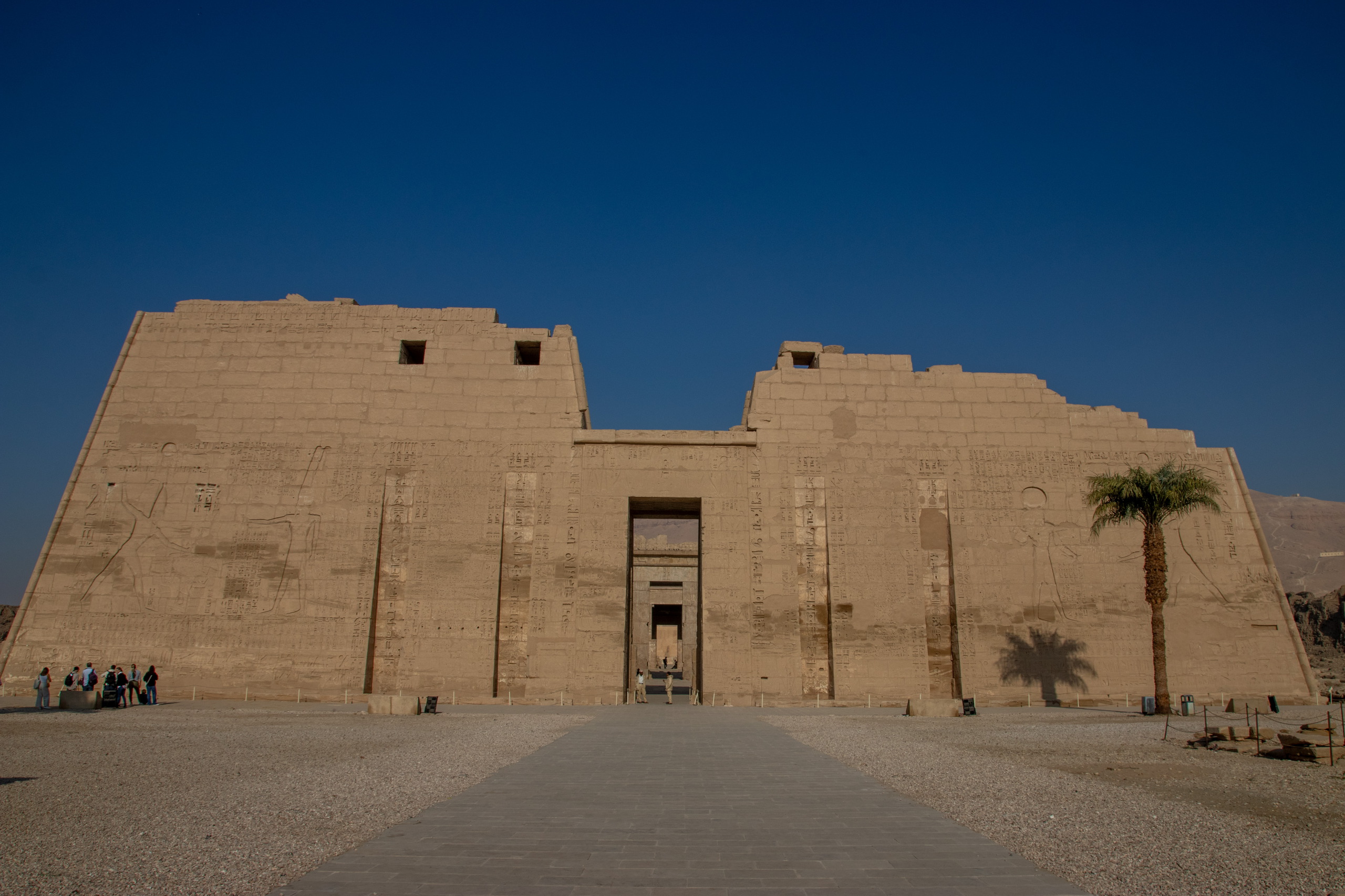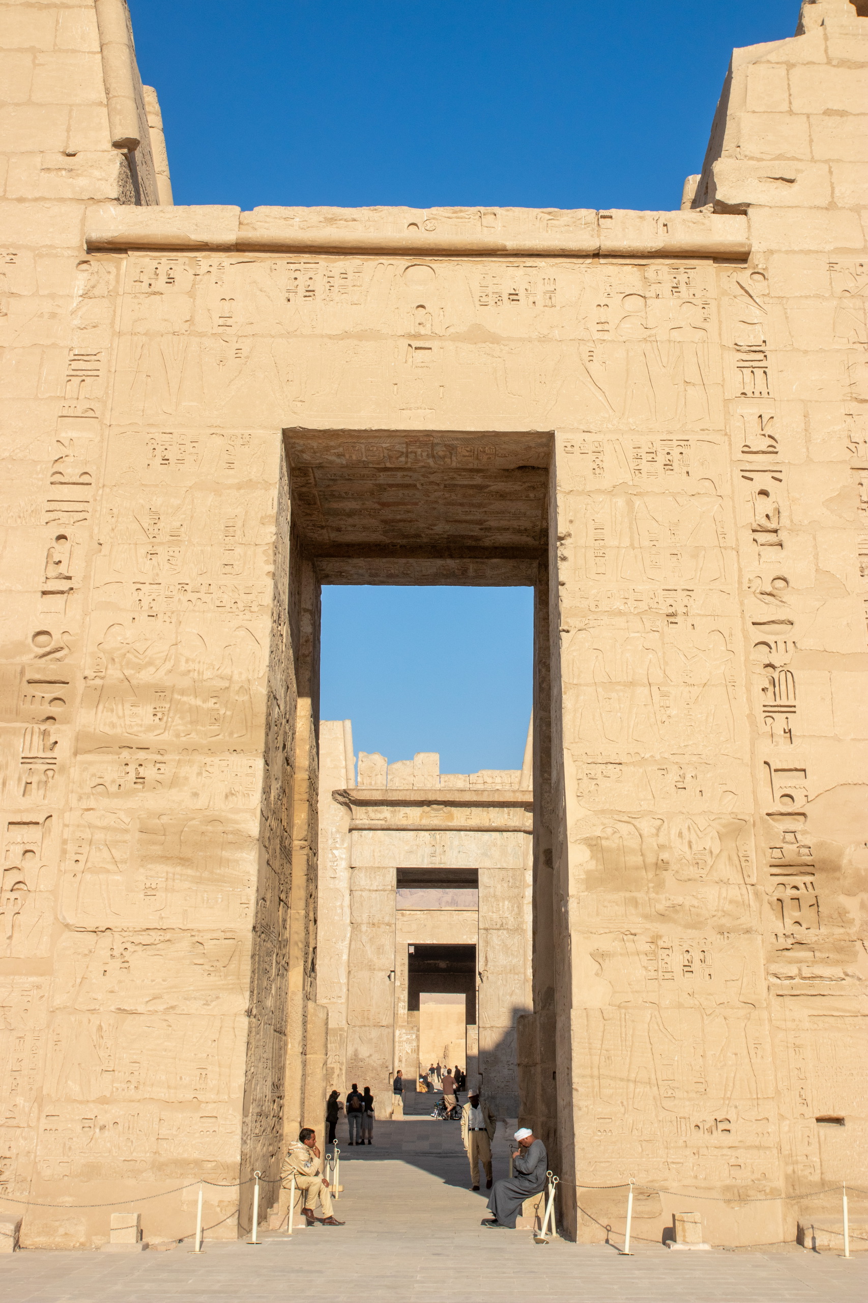 Frauen schnippeln auf einem Feld Tomaten und legen sie zum Trocknen aus. Das knallige Rot sieht sehr schön aus. Nach einem kurzen Halt bei den Kolossen von Memmon, checke ich beim Ticket Office ein Bündel Eintrittskarten für die Umgebung. Dann geht es über eine Schotterpiste zum Medinet Habu Tempel. Ziemlich cool, das Teil.