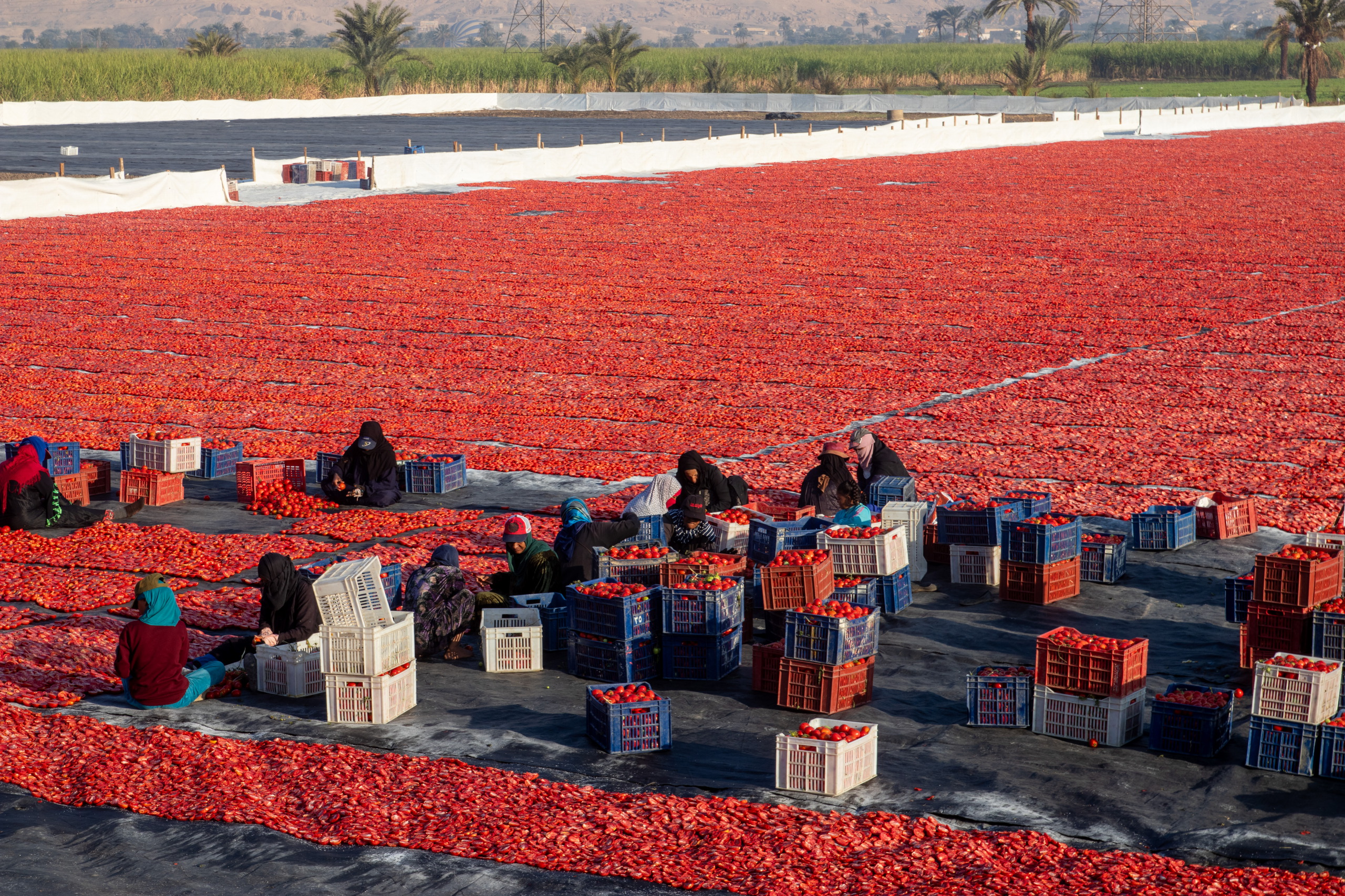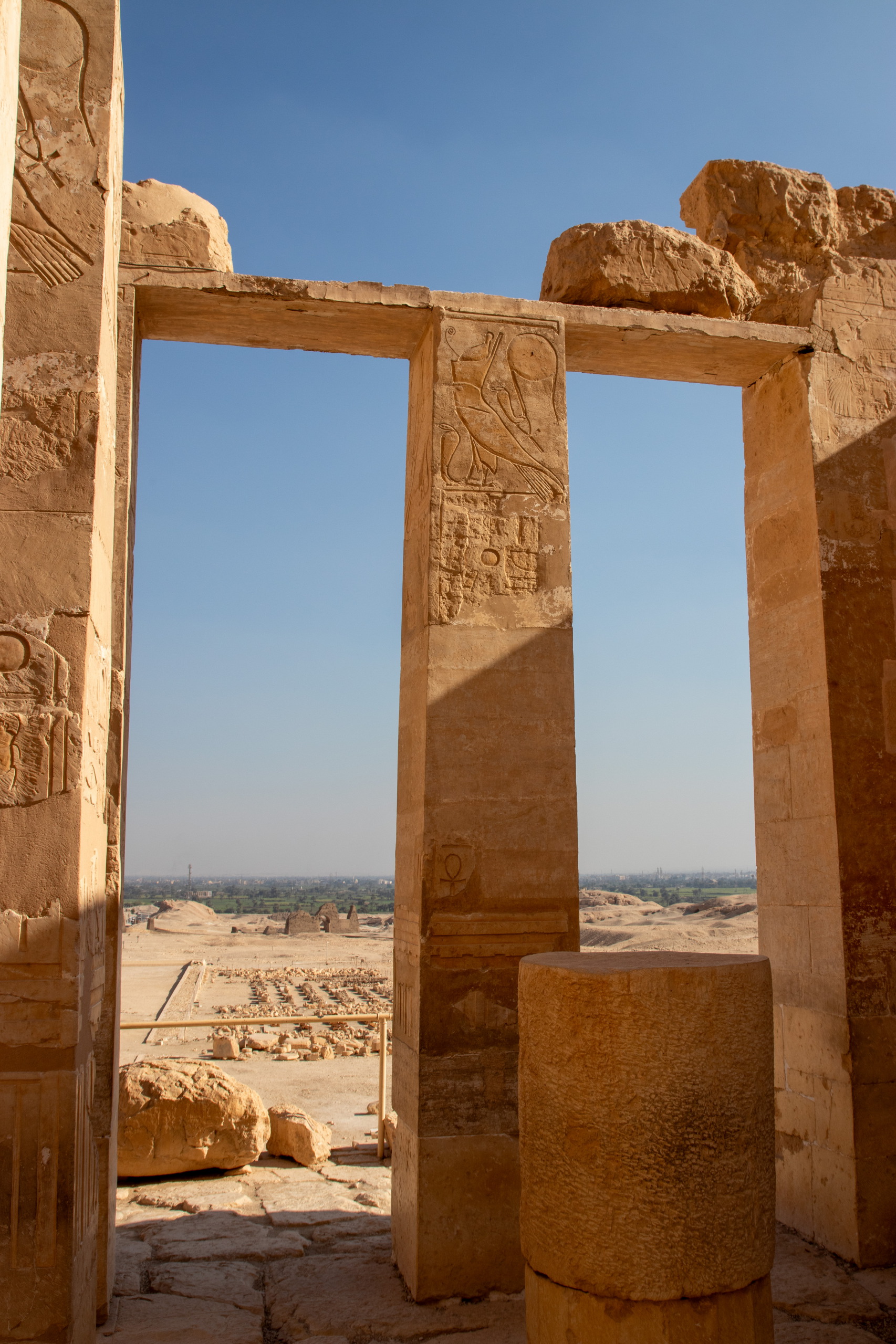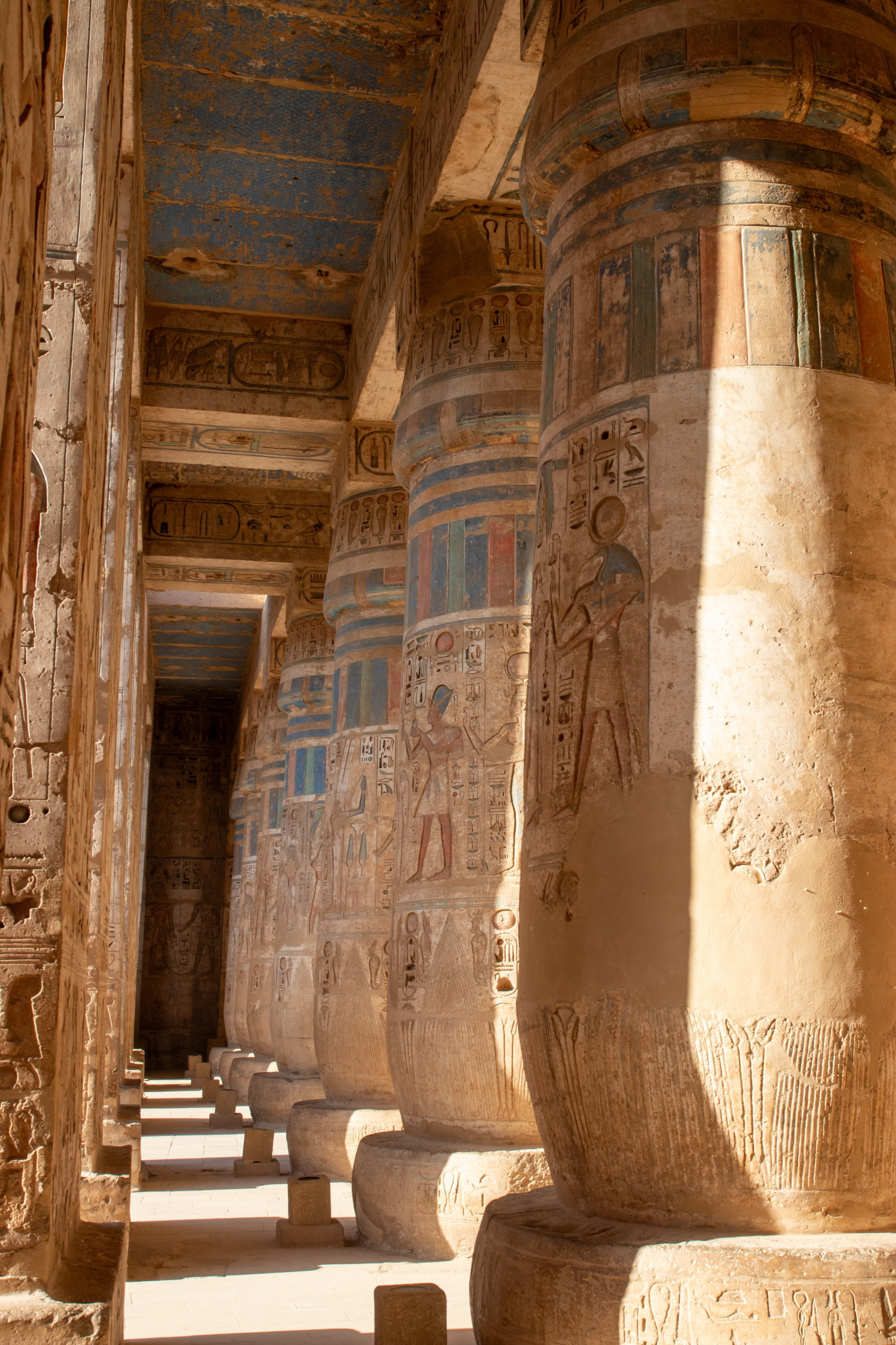 Frauen schnippeln auf einem Feld Tomaten und legen sie zum Trocknen aus. Das knallige Rot sieht sehr schön aus. Nach einem kurzen Halt bei den Kolossen von Memmon, checke ich beim Ticket Office ein Bündel Eintrittskarten für die Umgebung. Dann geht es über eine Schotterpiste zum Medinet Habu Tempel. Ziemlich cool, das Teil.