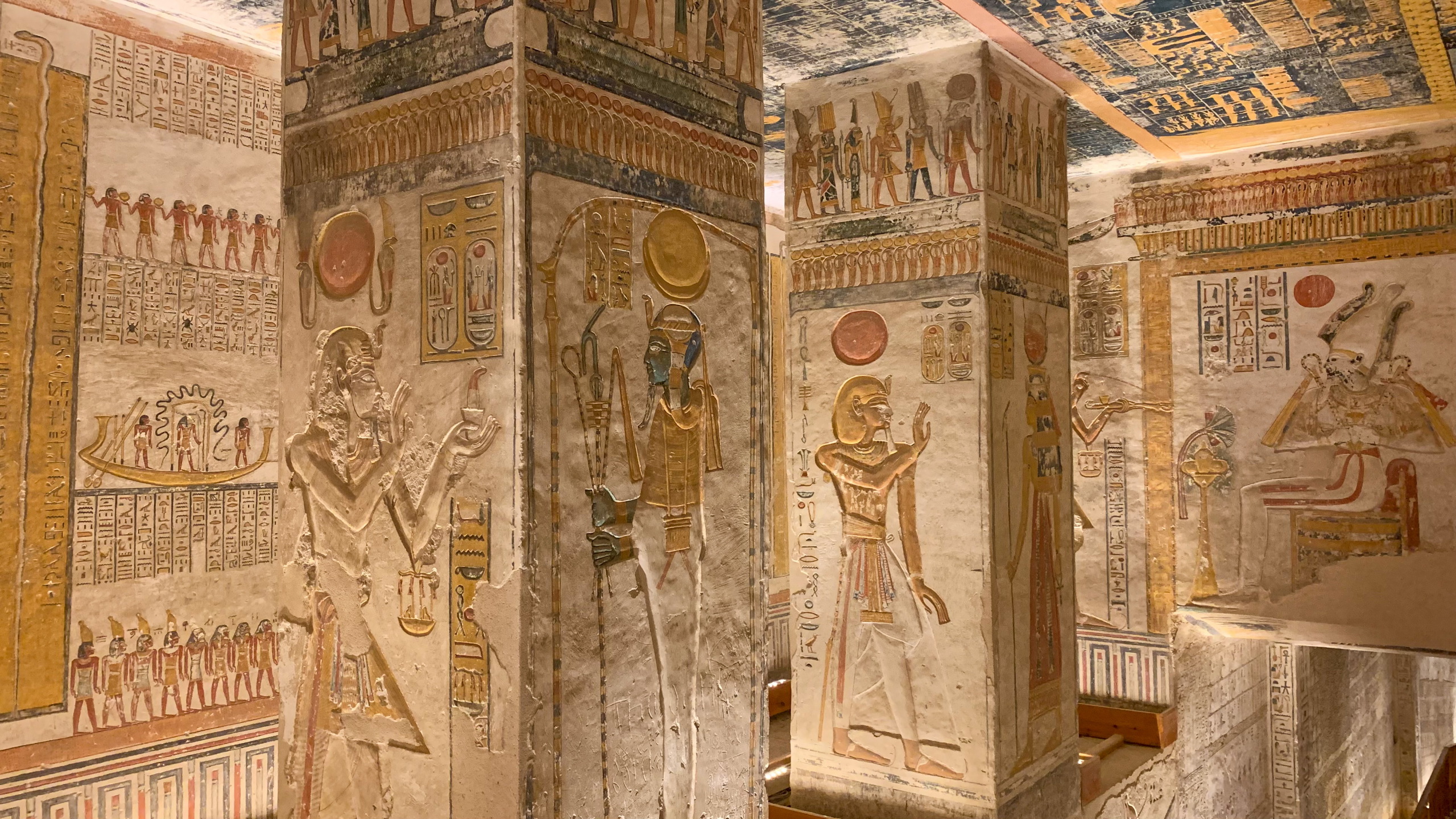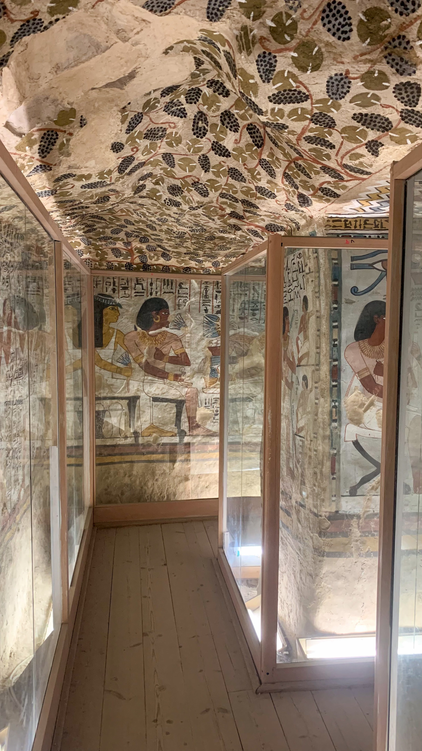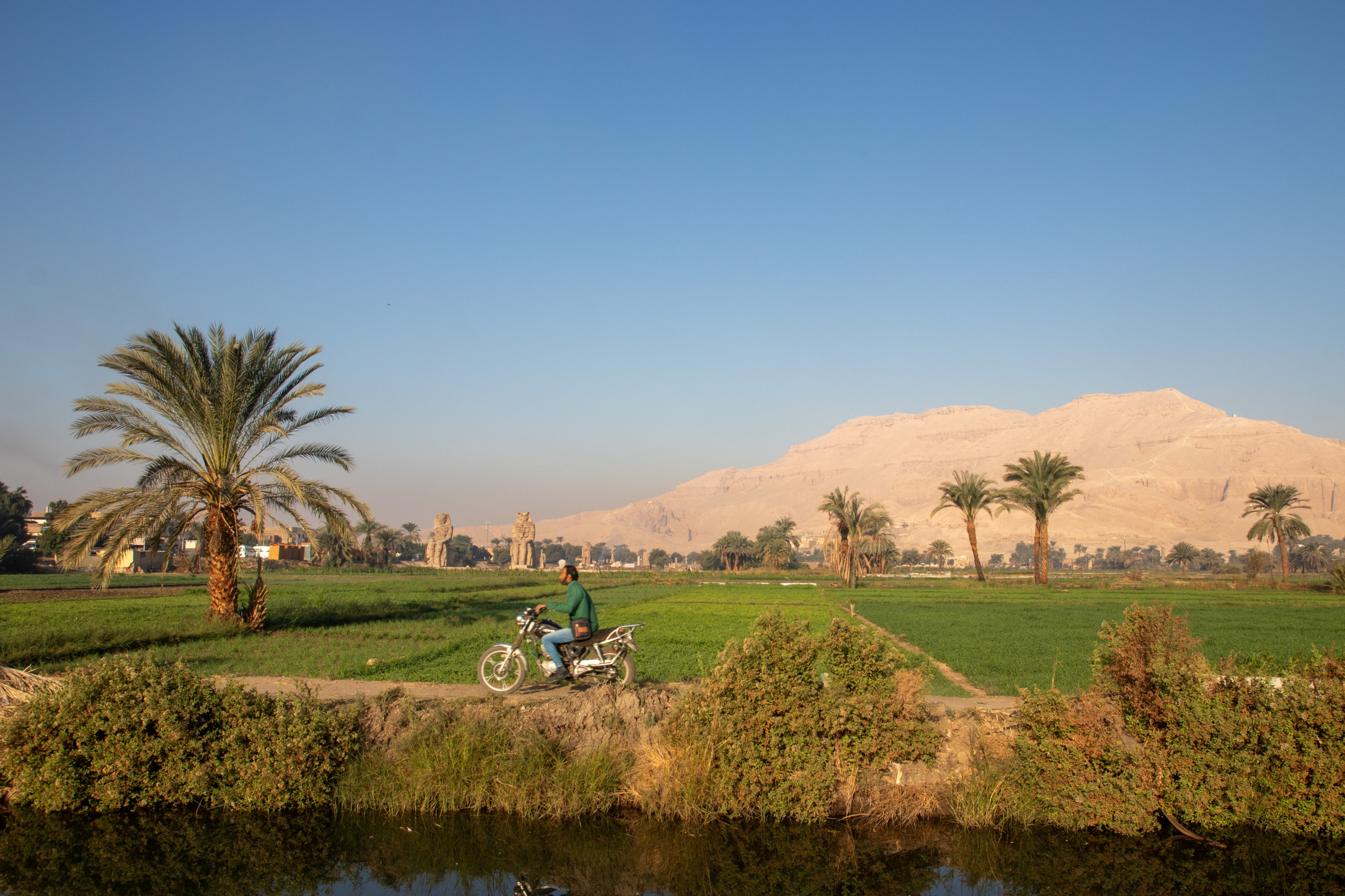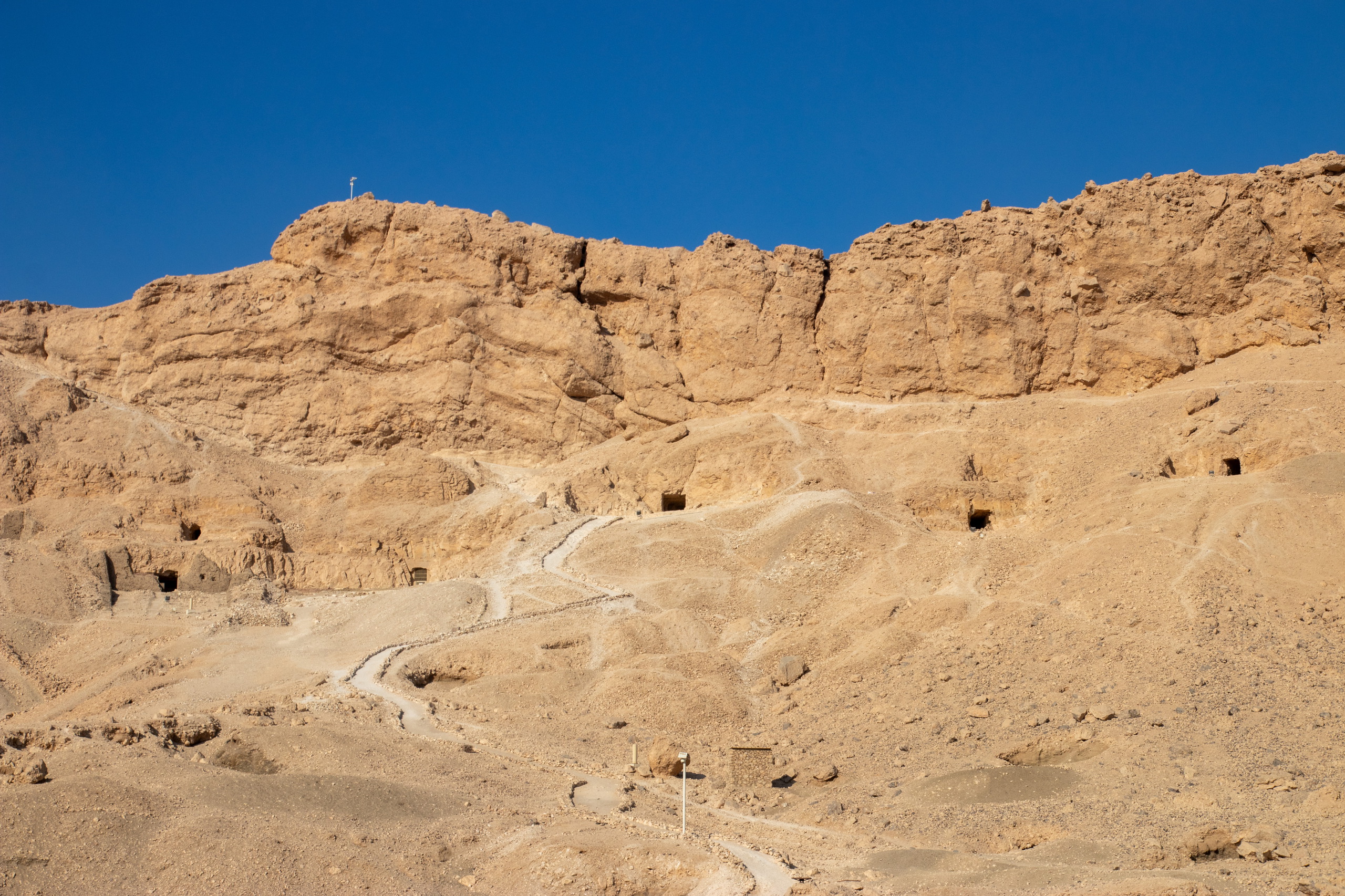Nach genau einer Stunde radle ich weiter zum Tal der Noblen, wo etwas verstreut die Grabkammern von Mitgliedern der oberen Klasse zu besichtigen sind. Zuerst geht es in die Grabkammer des Menna und im Anschluss in die wunderschön mit Weinranken verzierte Kammer des Sennofer. Besonders interessant sind die Wandmalereien mit wilden Tieren Afrikas in der Kammer des Rekhmire. Und zuletzt wird noch der Grabkammer des Nakht ein kurzer Besuch abgestattet.