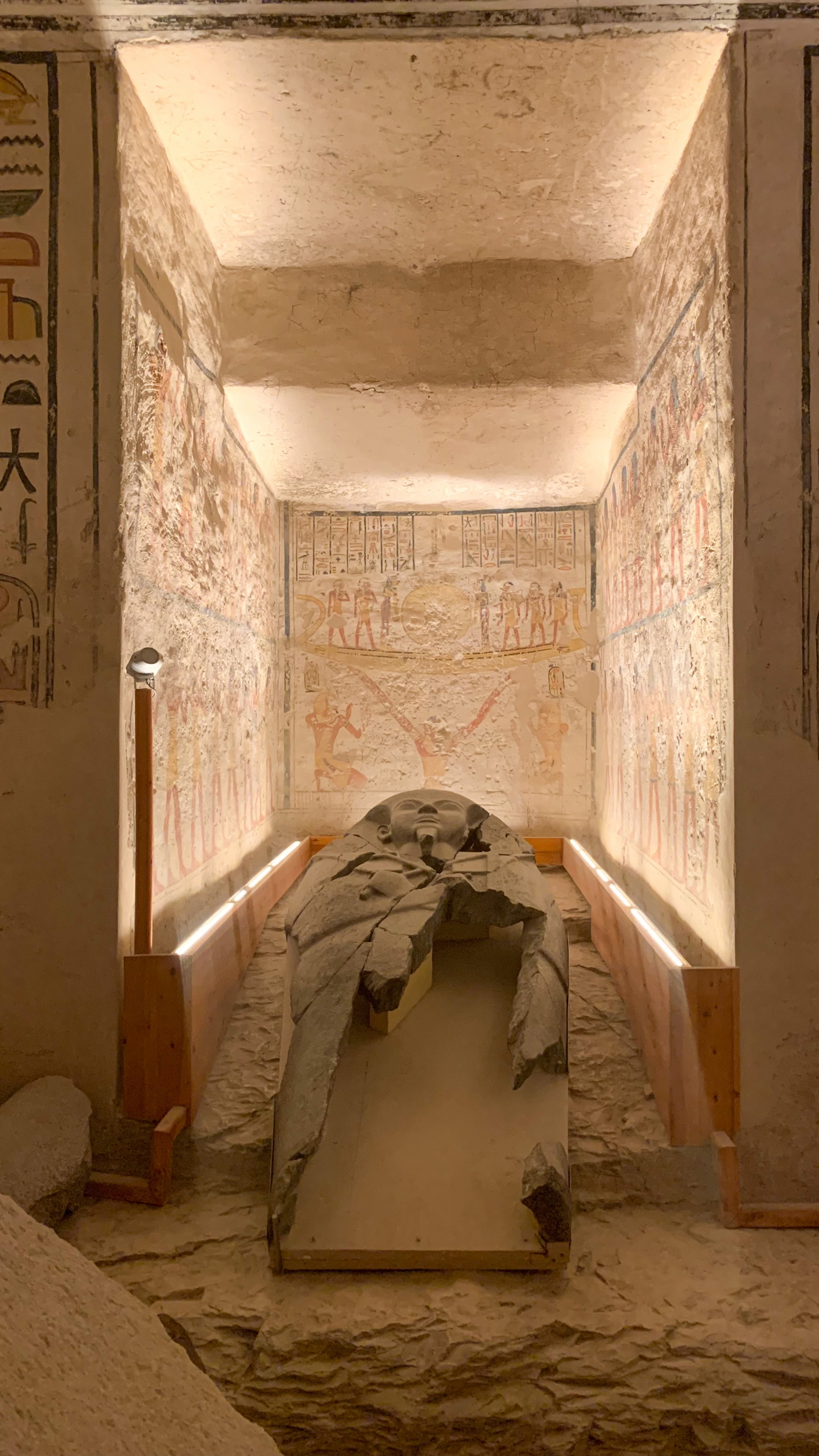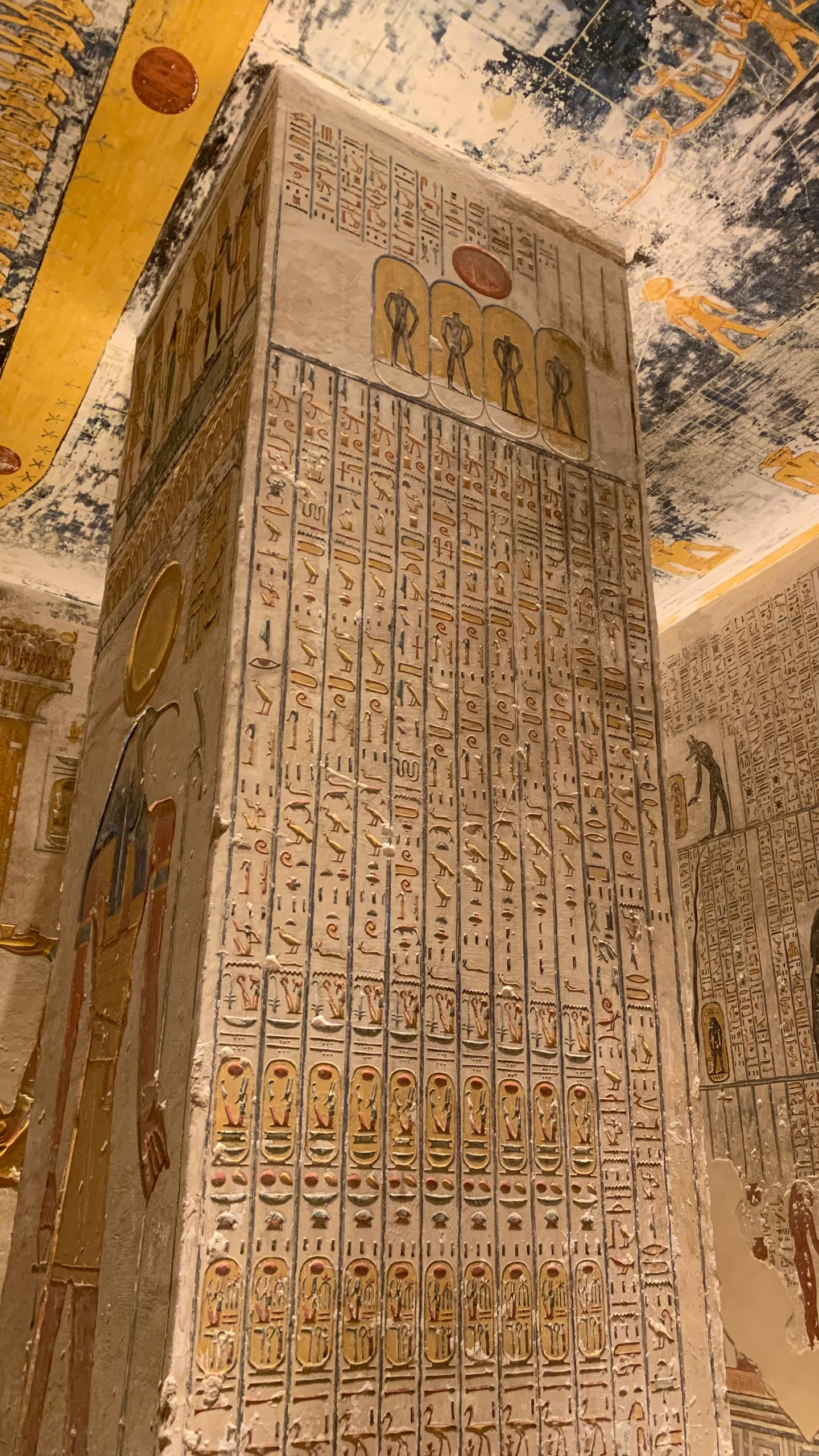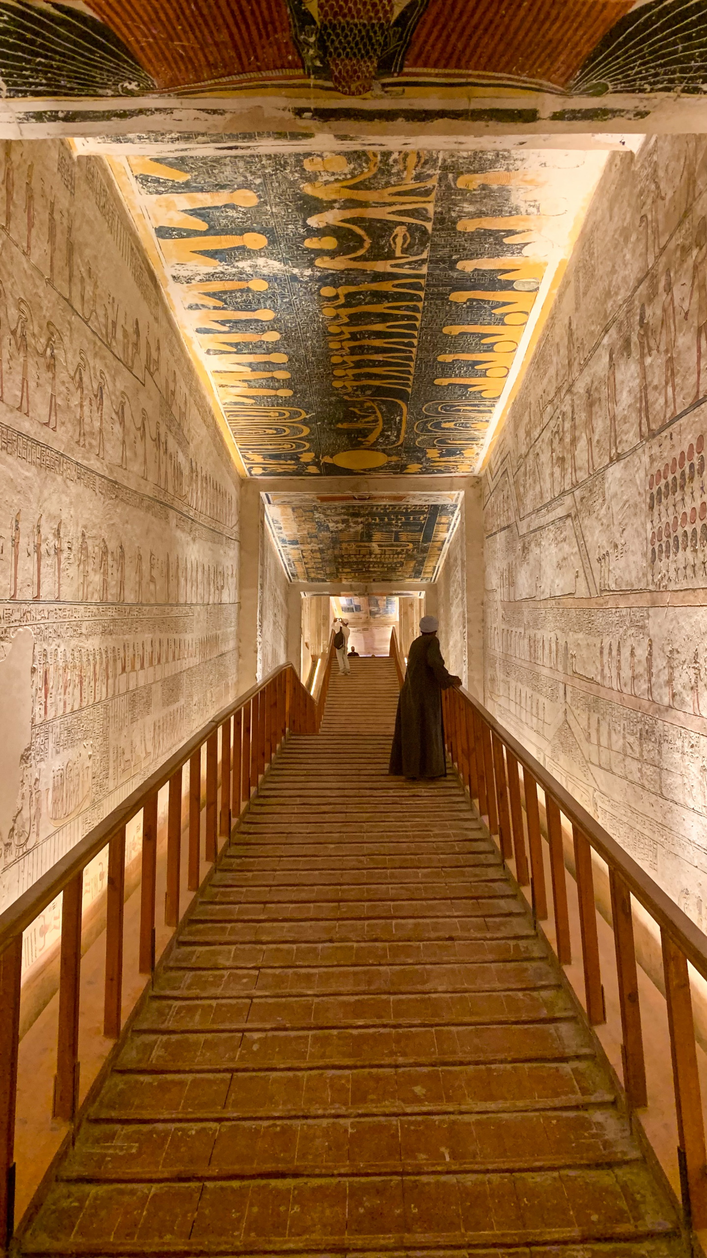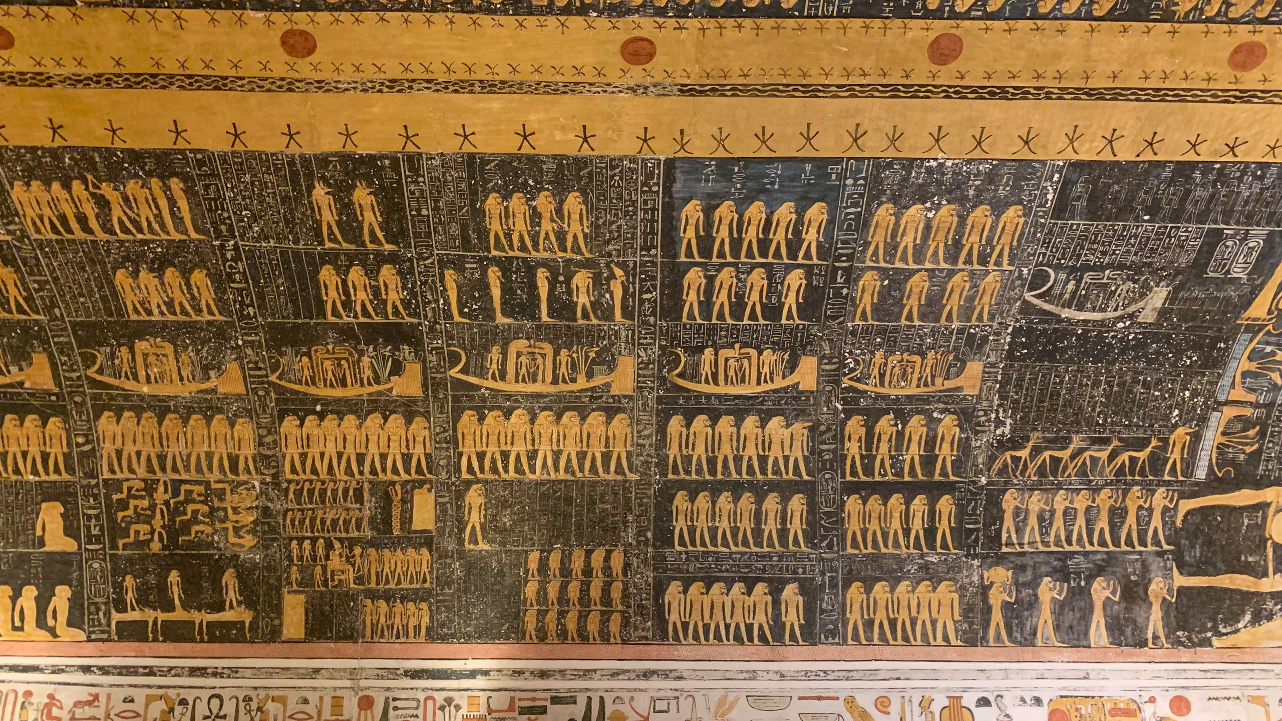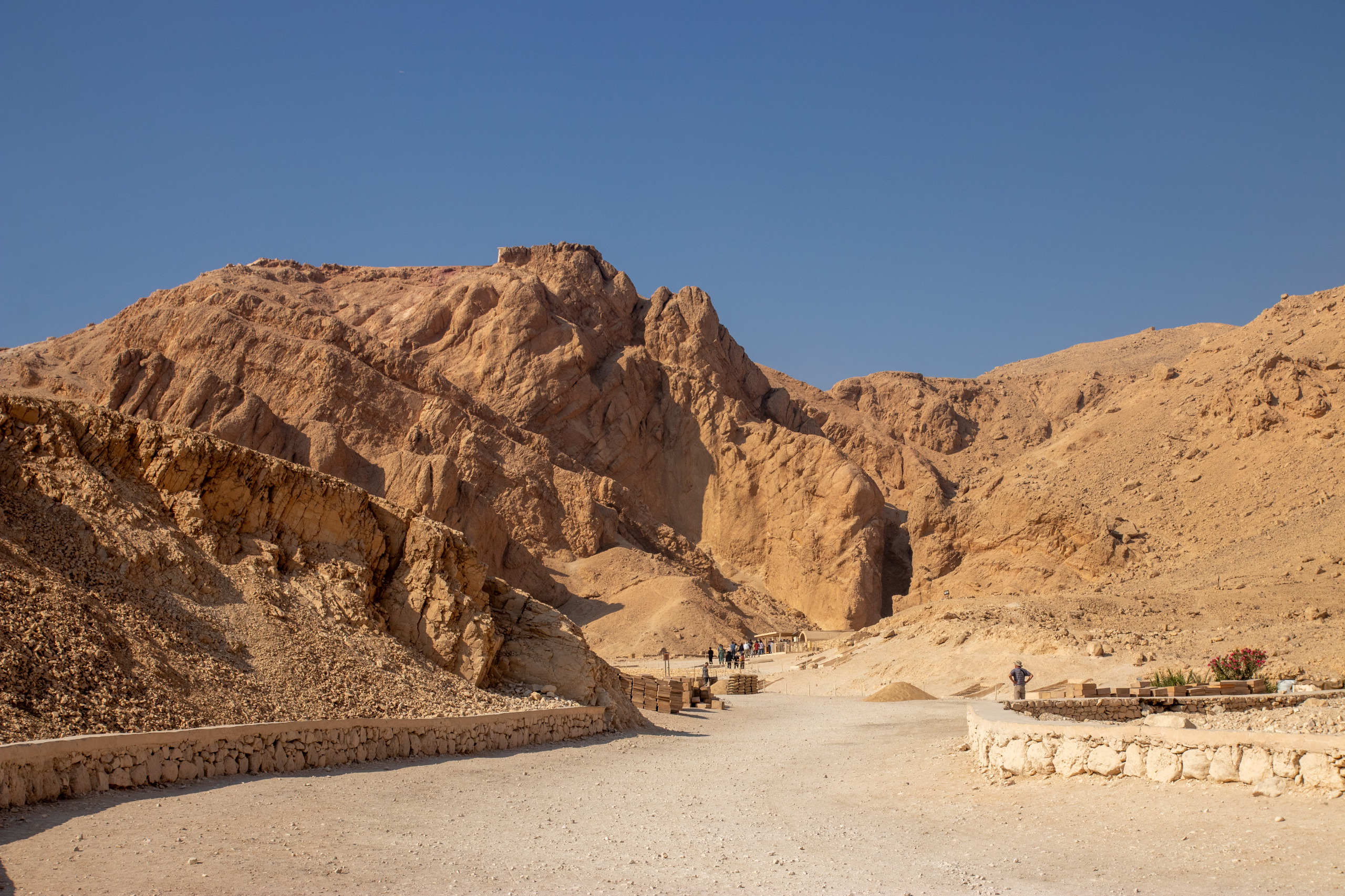 Nach eineinhalb Stunden plage ich mich mit dem “kleinsten” Gang in 20 Minuten die leicht ansteigende Straße hinauf zum Tal der Könige, wo unzählige Busse parken. Da im allgemeinen Ticket nur drei Grabkammern inkludiert sind, nehme ich noch die von Tutanchamun und König Ramses V & VI dazu. Für die Inkludierten lasse ich mir einen Tipp für die drei schönsten Grabkammern geben, bevor ich mich auf den Weg auf das Gelände mache. Hier geht es zu wie am Jahrmarkt. Klar, es ist auch das Ziel Nummer 1 in Luxor. Zuerst geht es in die wunderschöne KV2 von Ramses IV. Hmmm, anscheinend bekommt jeder den gleichen Tipp, denn der lange Gang zur Grabkammer ist voller Touristen, die unkoordiniert herumlaufen. Unglaublich.