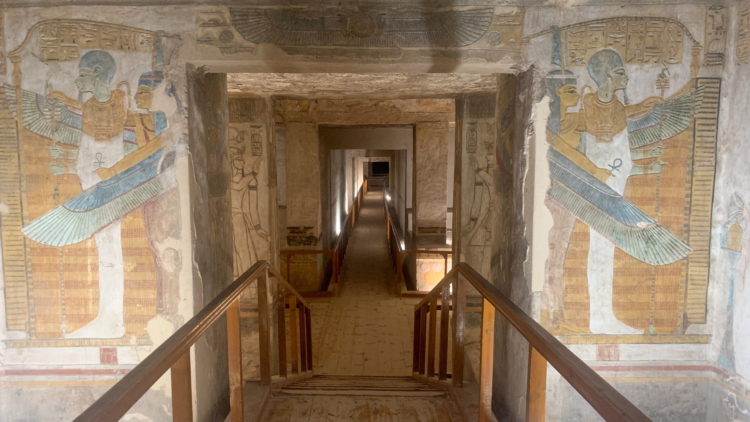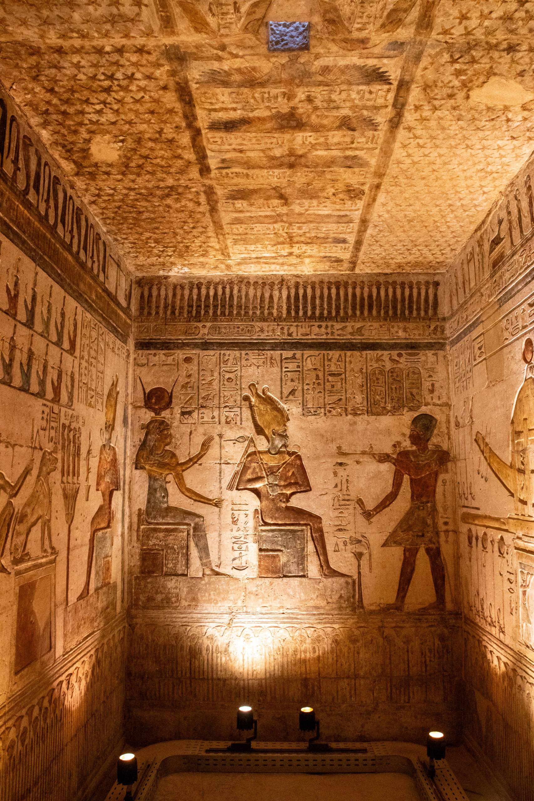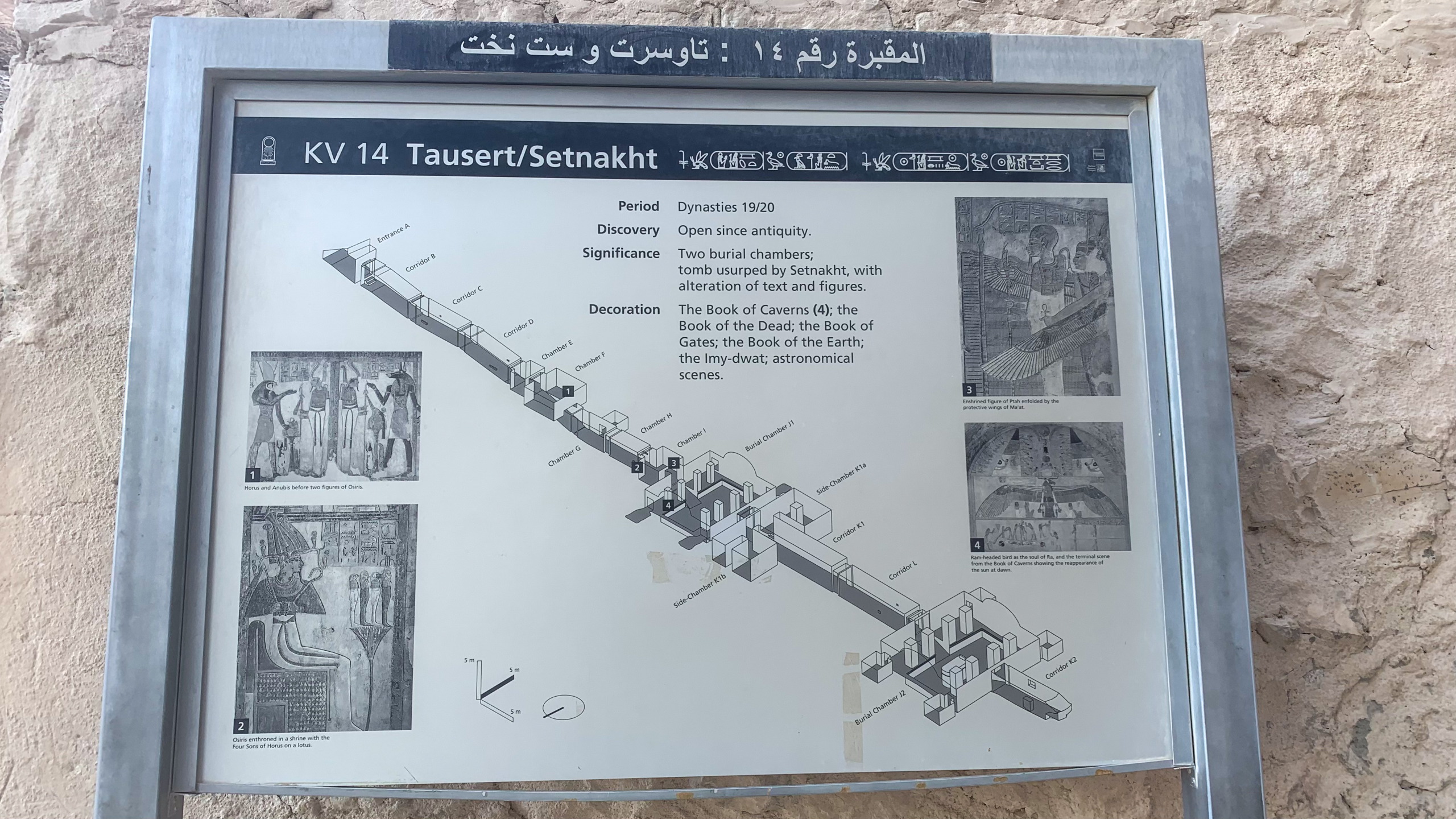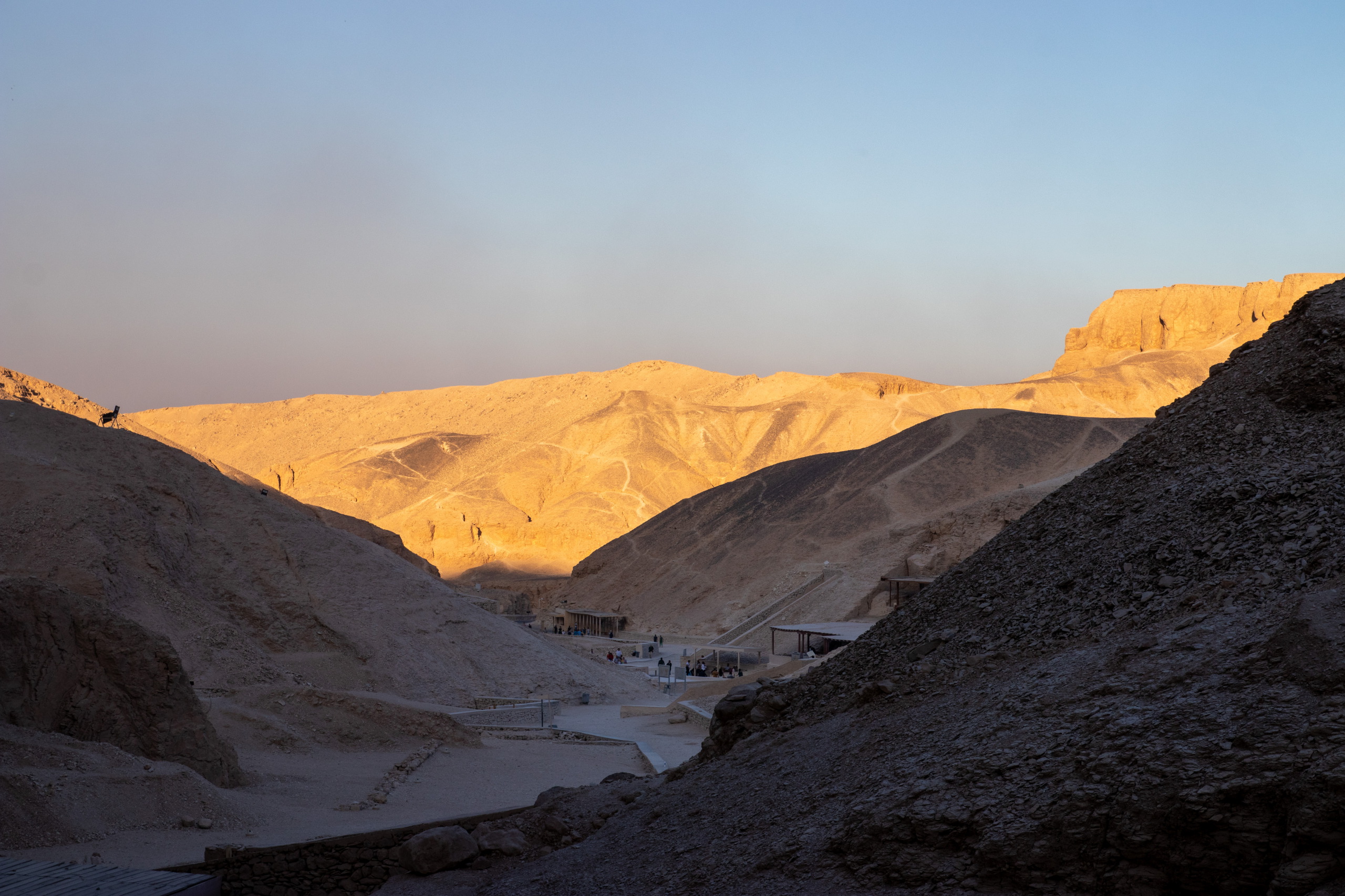 Am Ende des Tales besichtige ich auf Empfehlung einer der Männer die KV14 von Tausert und Setnakht. Von hier hat man nun einen wunderschönen Blick entlang dem Tal der Könige über dem gerade die Sonne untergeht. Zuletzt geht es noch in die KV11 von König Ramses III, deren Grabkammer am Ende leider geschlossen ist, da sie gerade von einem Team der Humboldt-Universität zu Berlin restauriert wird. Dennoch eine sehr schöne Grabkammer.
