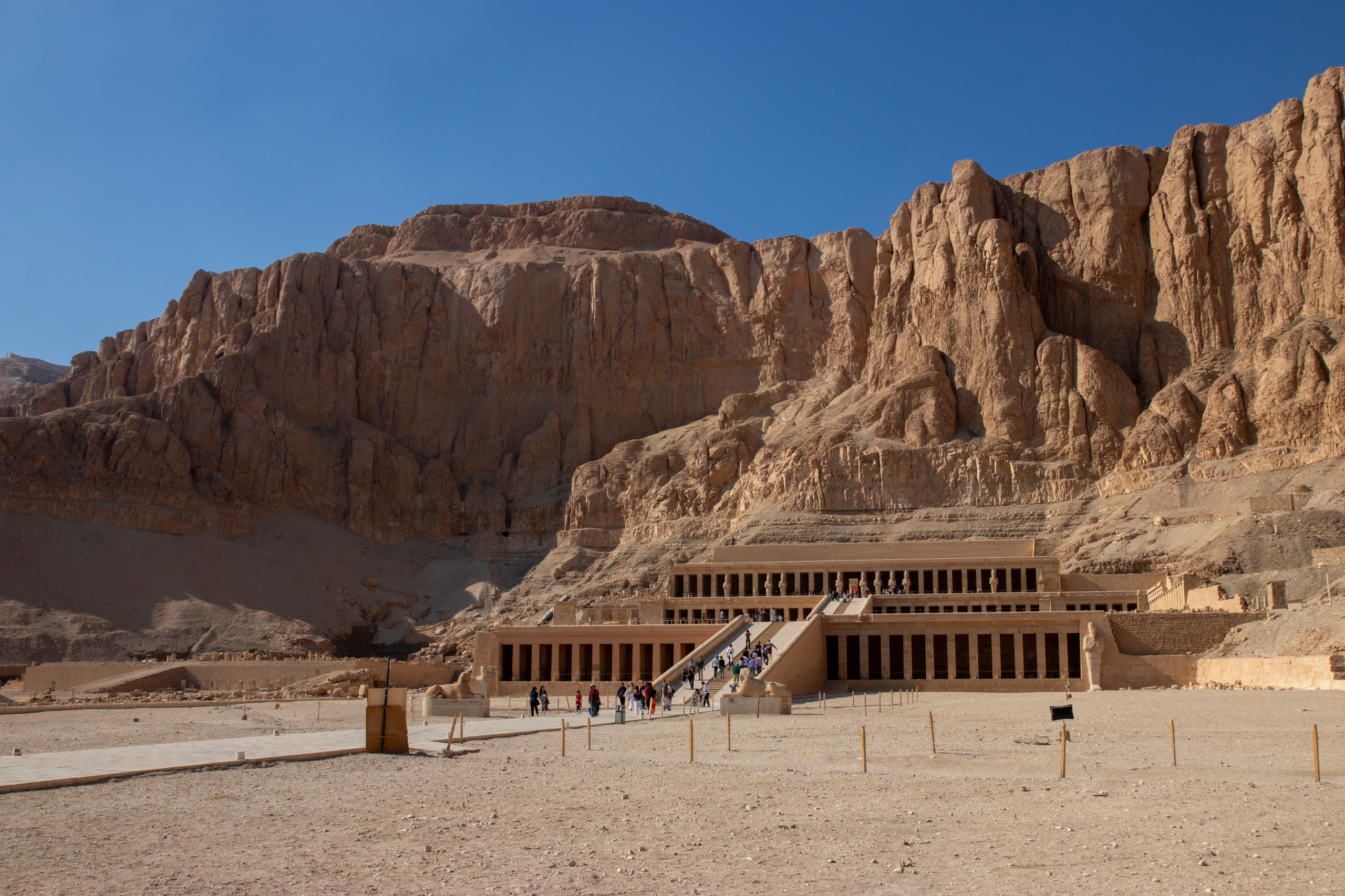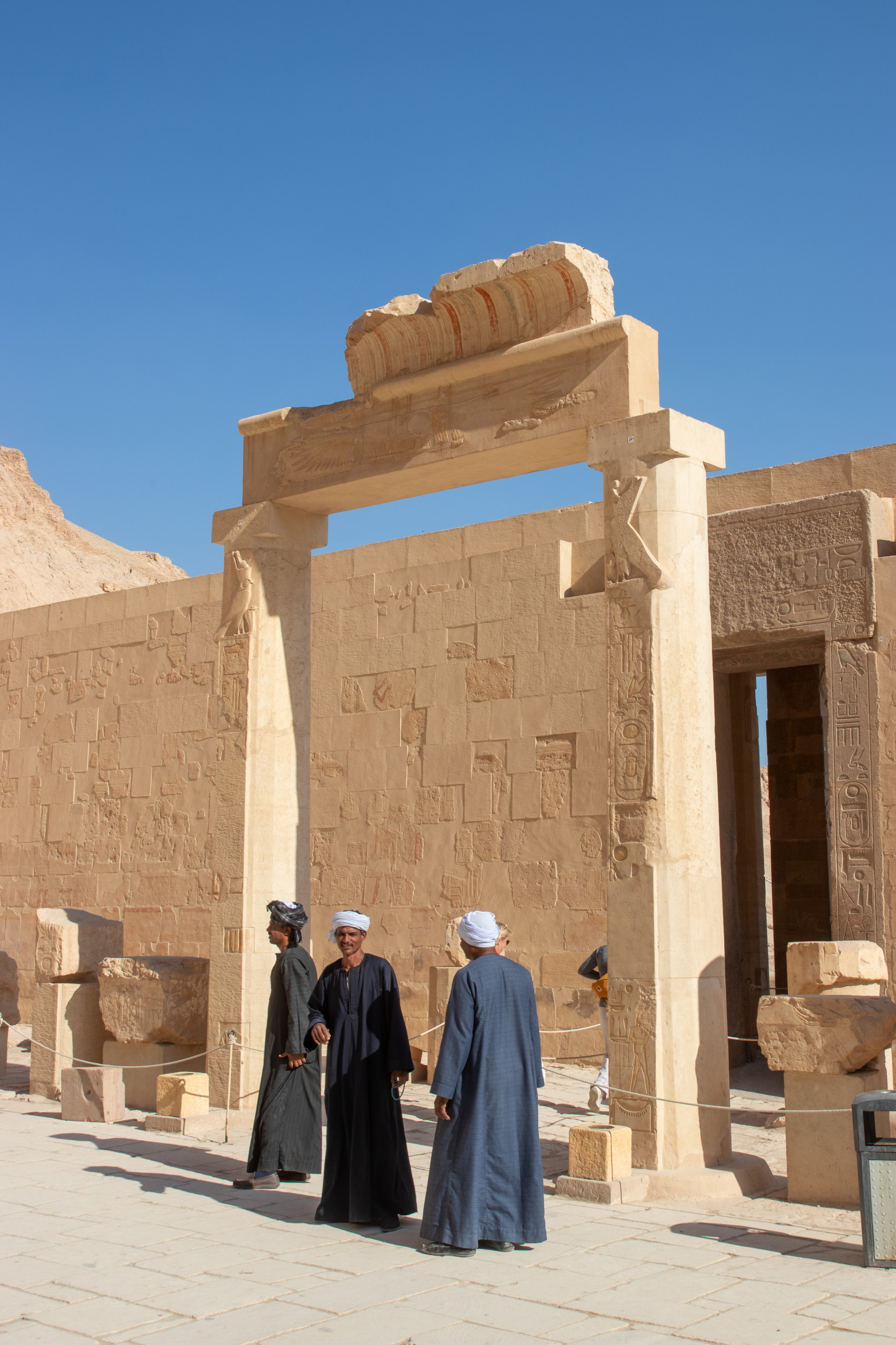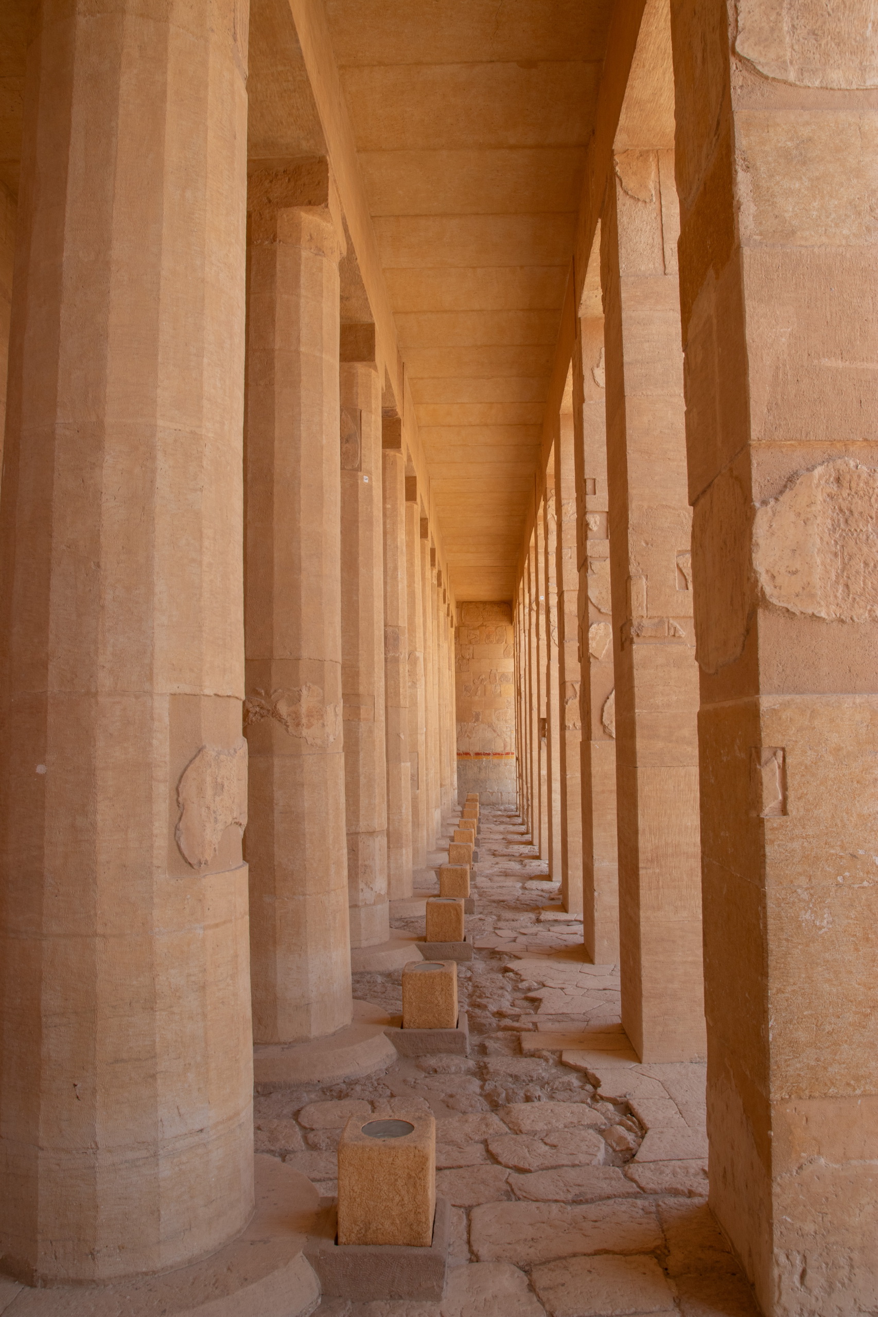 Nach einer Stärkung düse ich weiter zum Eingang des Totentempel der Hatschepsut. Unmengen an Leute lassen sich mit Golfcaddys die letzten 500 Meter zum Tempel bringen. Wie faul kann man sein? Dieser Tempel unterscheidet sich in der Formgebung sehr stark von allen anderen, die ich bis jetzt gesehen habe, denn er wirkt mit seinen quadratischen bzw. vieleckigen Säulen ziemlich kantig. Irgendwie gefällt er mir nicht so, aber trotzdem ist es interessant eine andere Architektur zu sehen.