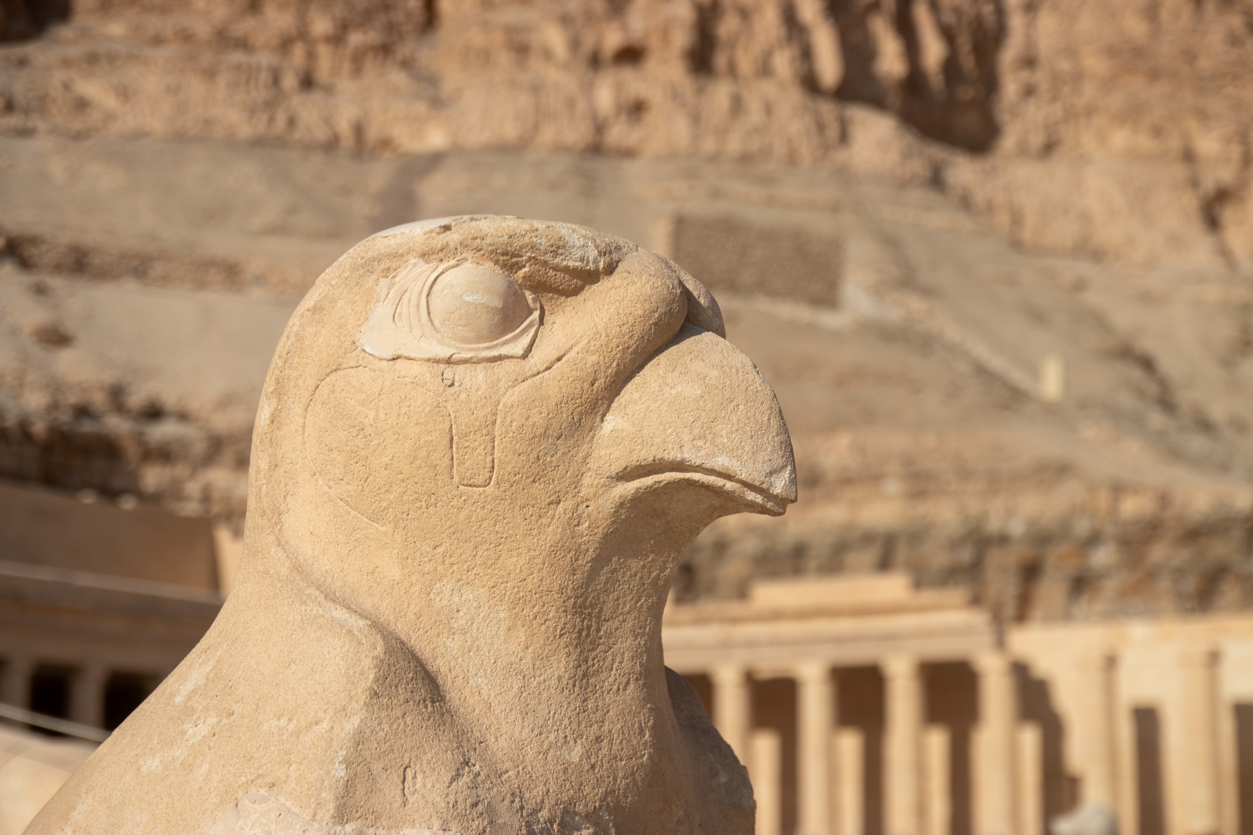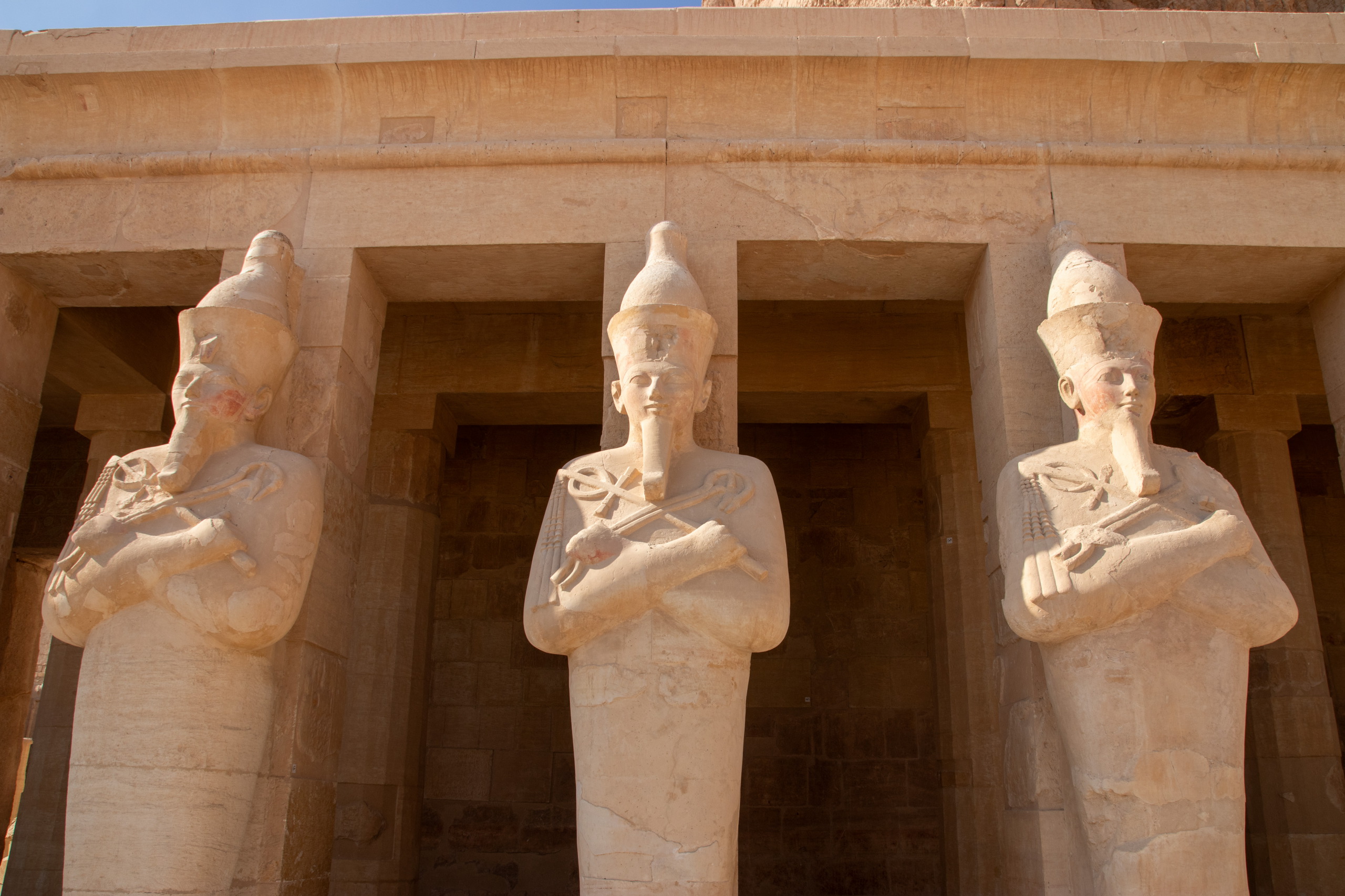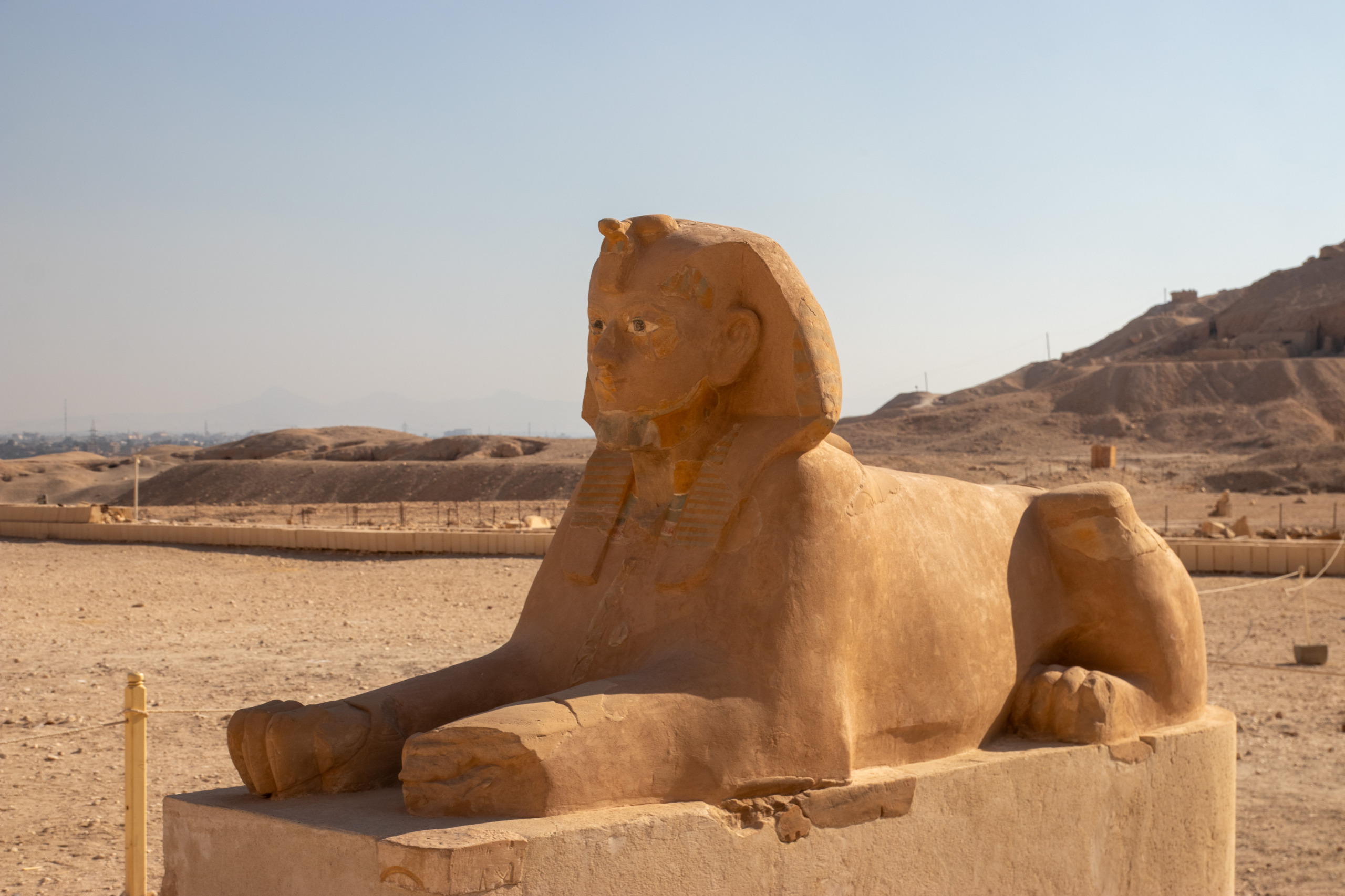 Nach einer Stärkung düse ich weiter zum Eingang des Totentempel der Hatschepsut. Unmengen an Leute lassen sich mit Golfcaddys die letzten 500 Meter zum Tempel bringen. Wie faul kann man sein? Dieser Tempel unterscheidet sich in der Formgebung sehr stark von allen anderen, die ich bis jetzt gesehen habe, denn er wirkt mit seinen quadratischen bzw. vieleckigen Säulen ziemlich kantig. Irgendwie gefällt er mir nicht so, aber trotzdem ist es interessant eine andere Architektur zu sehen.