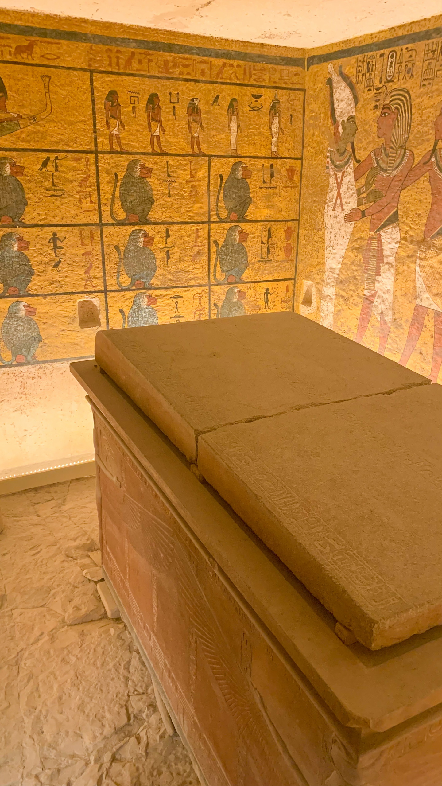 Gleich daneben liegt die Grabkammer von Tutanchamun. Hier sind nur wenige Leute. Klar, denn der Eintritt ist nicht im allgemeinen Ticket enthalten und auch nicht gerade ein Schnäppchen. Leider aber auch das Geld nicht wert, denn es gibt bis auf den Sarkophag und goldene Malereien nicht viel zu sehen. Dafür kann man aber behaupten, die Grabkammer des berühmten Königs Tutanchamun gesehen zu haben.