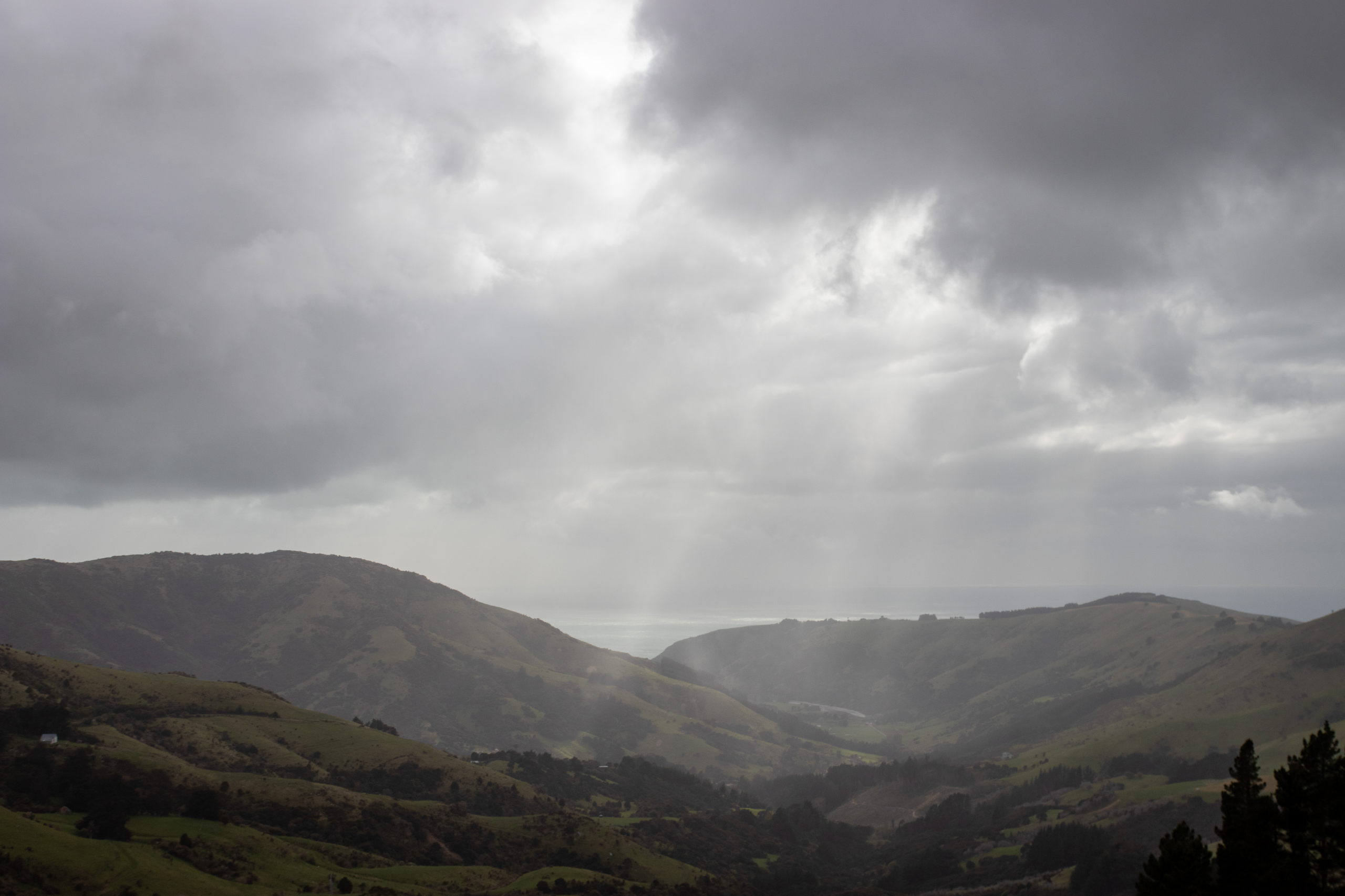 Beim Verstauen der Schlafutensilien fällt mir auf, dass in der Isomatte keine Luft mehr ist. Ventil nicht ordentlich geschlossen, oder ein Loch? Gleich um acht Uhr fahre ich zum Akaroa Leuchtturm. Baustelle. Der Hang ist abgerutscht und wird neu befestigt. Also umdrehen und hoch zur Summit Road. Das Wetter zeigt, was es so drauf hat. Heftiger Wind, Regen und sogar Hagel.