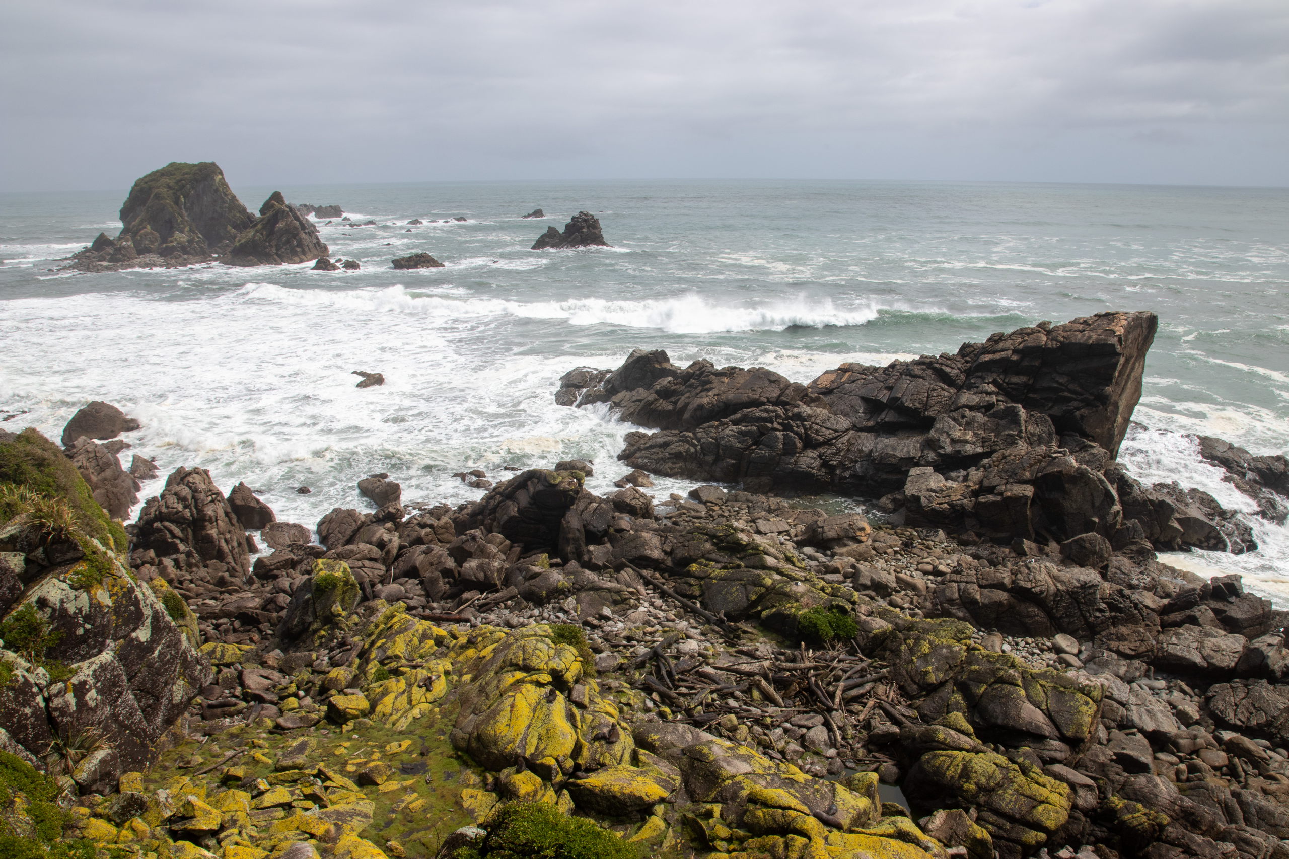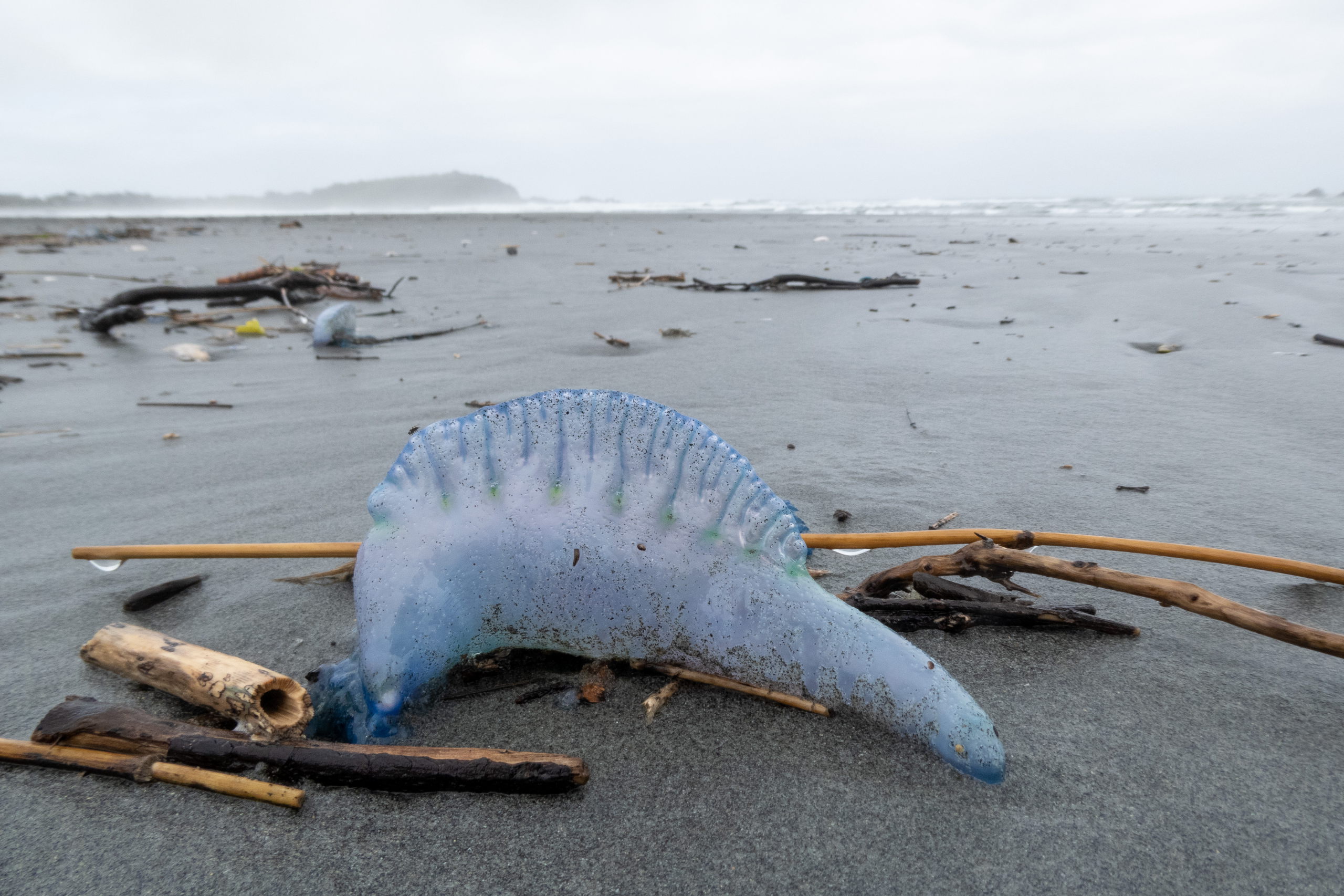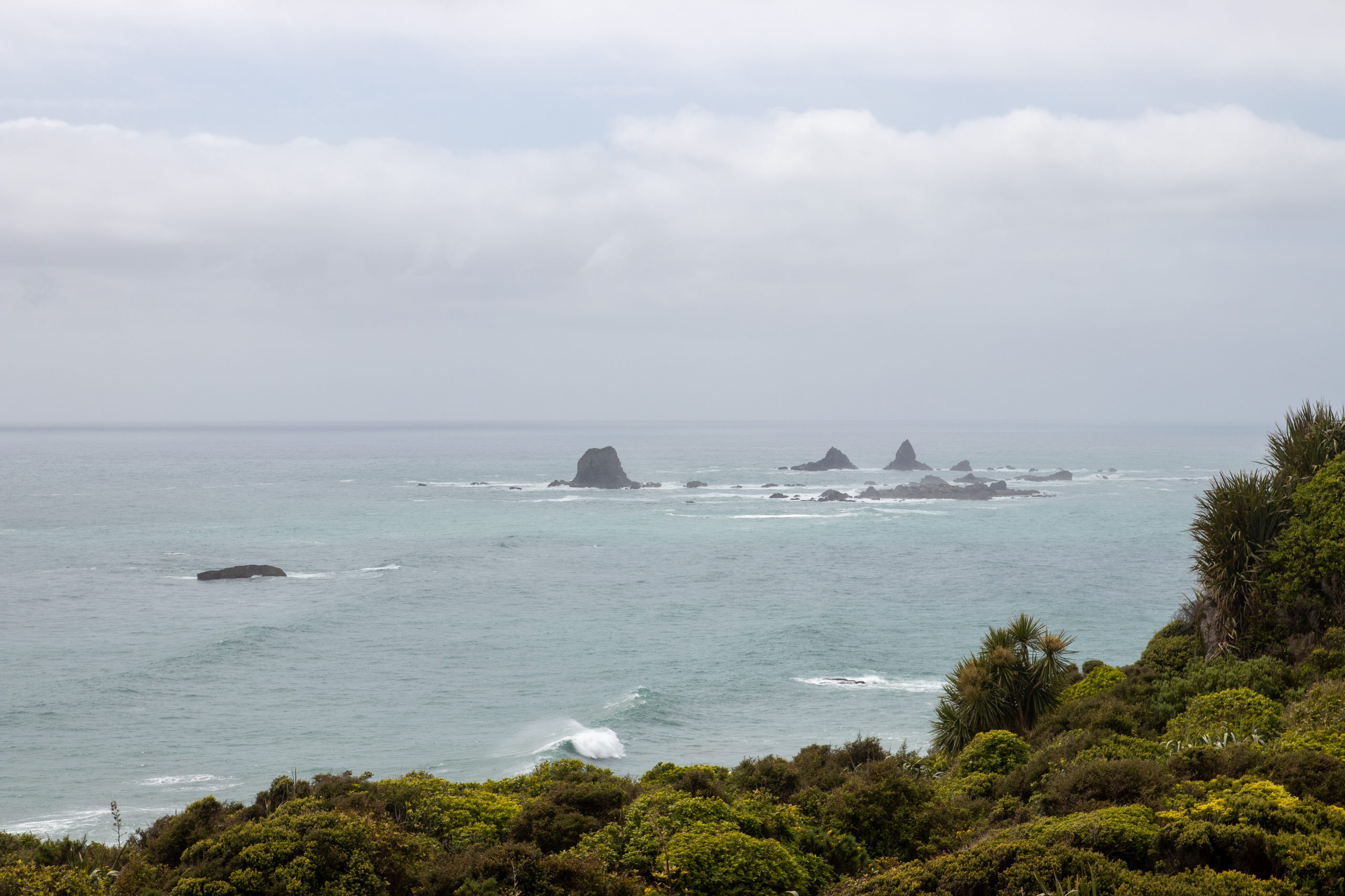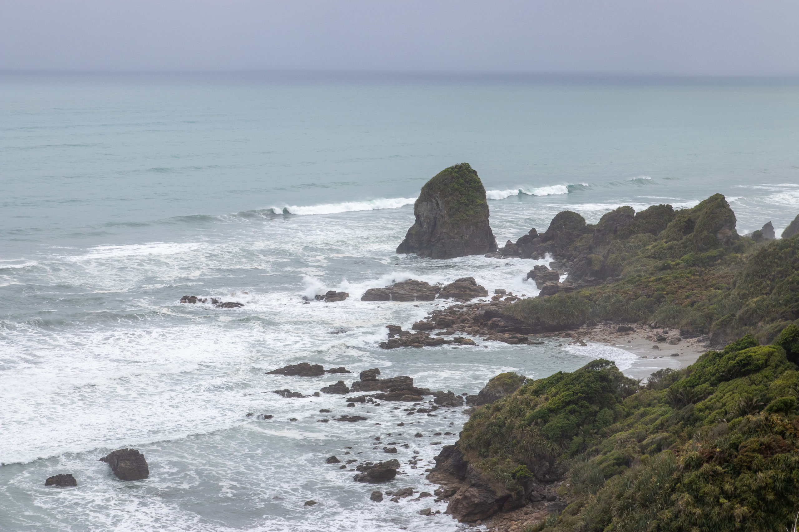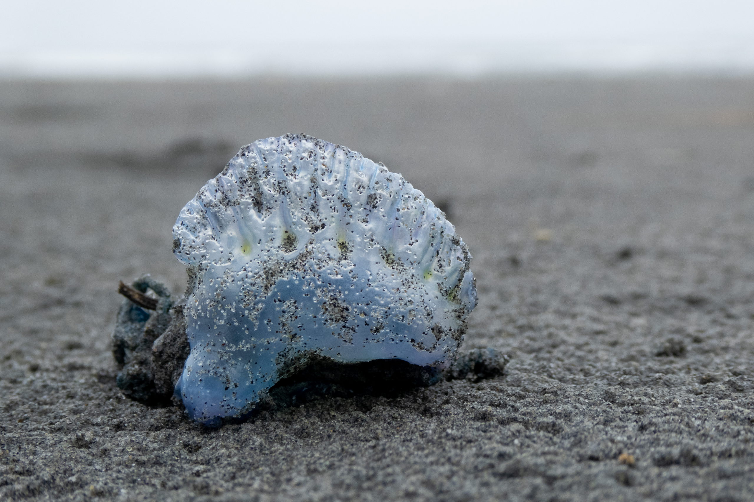 Hurra, die Luft ist in der Isomatte geblieben. Ich räume das Auto etwas auf, wobei mir auffällt, dass ich ziemlich viel Bier habe. Ich zähle nach und komme auf drei Bier pro Tag. Hmmm, das sollte sich ausgehen. Das Wetter ist mau und so ist es bei den Pancake Rocks und den Blowholes nicht so aufregend. Ich halte mich nicht besonders lange auf und fahre ein Stück nach Norden, wo ich zum Truman Track gelange. Dieser führt von der Straße hinunter zur Küste und ist auch nicht besonders spannend. Aber zumindest ein guter Platz, um eine Kleinigkeit zu essen. Auf der Fahrt zum Cape Foulwind beginnt es zu regnen. Und das nicht wenig. Am Parkplatz vertreibe ich mir die Zeit mit Schreiben, in der Hoffnung, dass sich das Wetter bessert. Und tatsächlich nieselt es nur noch etwas. Also auf zum Strand, wo ich Portugiesische Galeeren entdecke. Coole Teile, aber bloß nicht anfassen, denn sie sind giftig. Das Interessante an diesen Lebewesen ist, dass sie aus einem Zusammenschluss mehrerer eigenständiger Polypen bestehen, die bestimmte Aufgaben übernehmen und alleine nicht überlebensfähig sind.