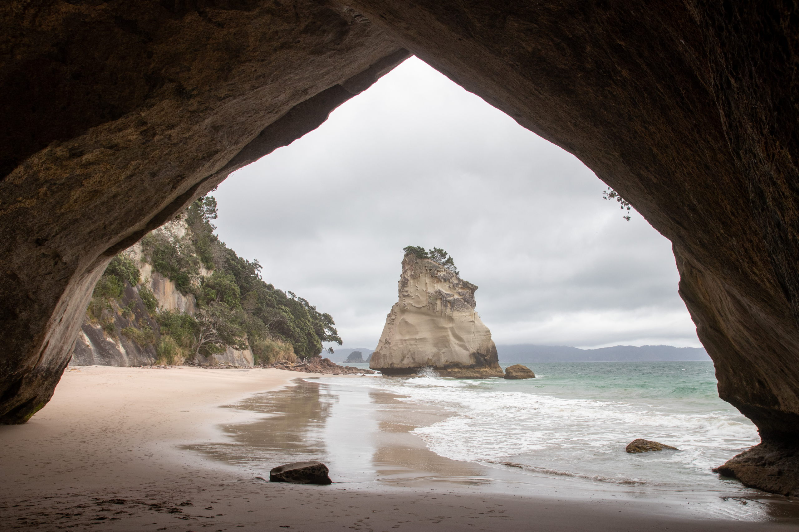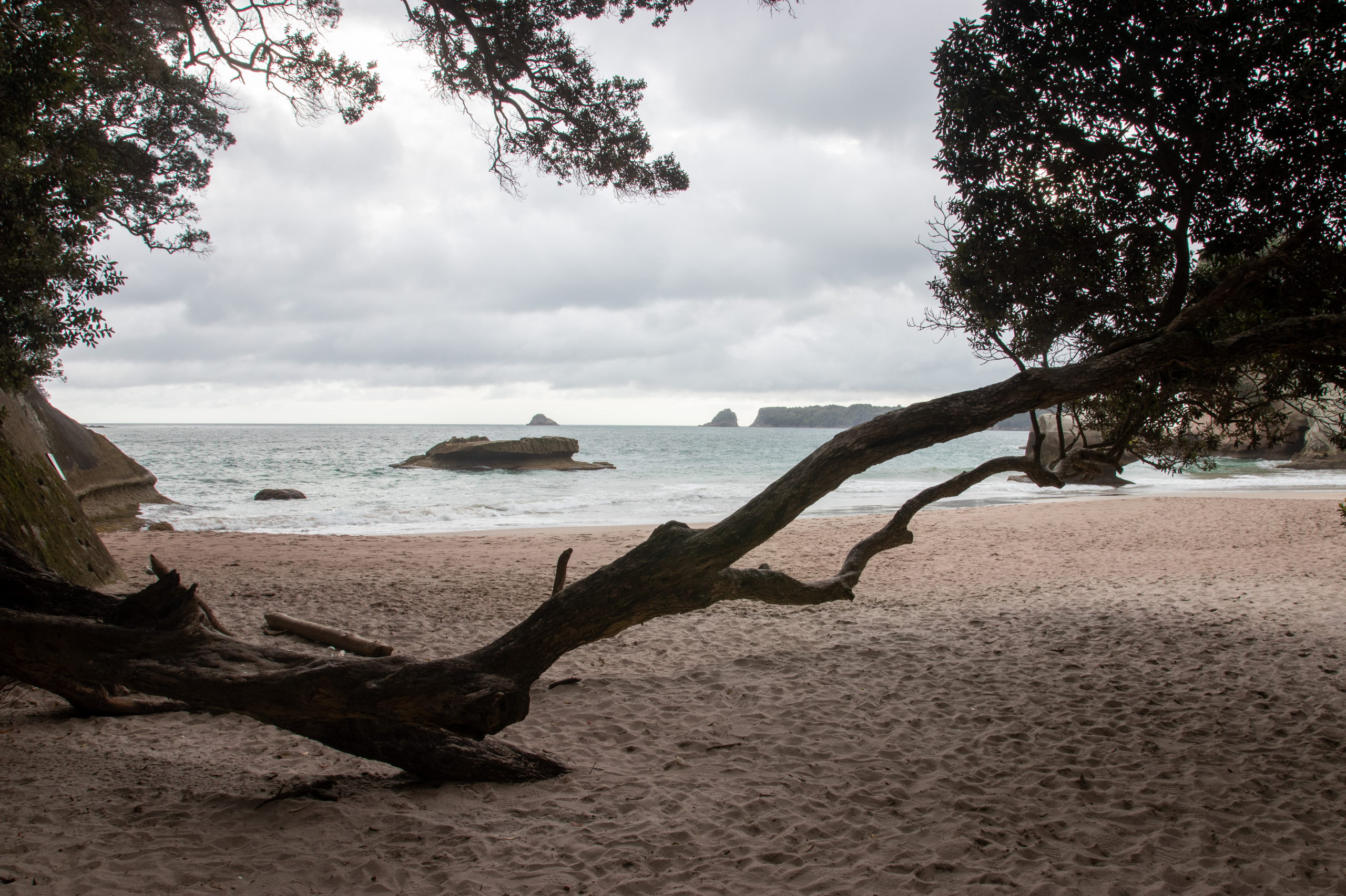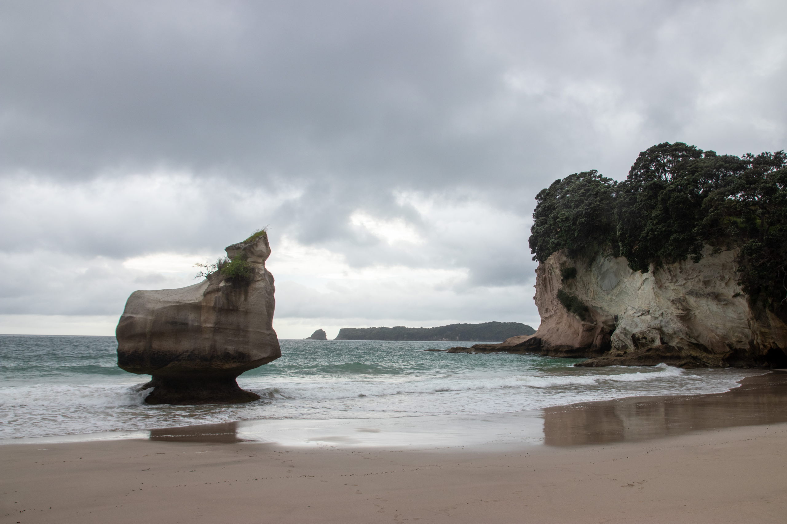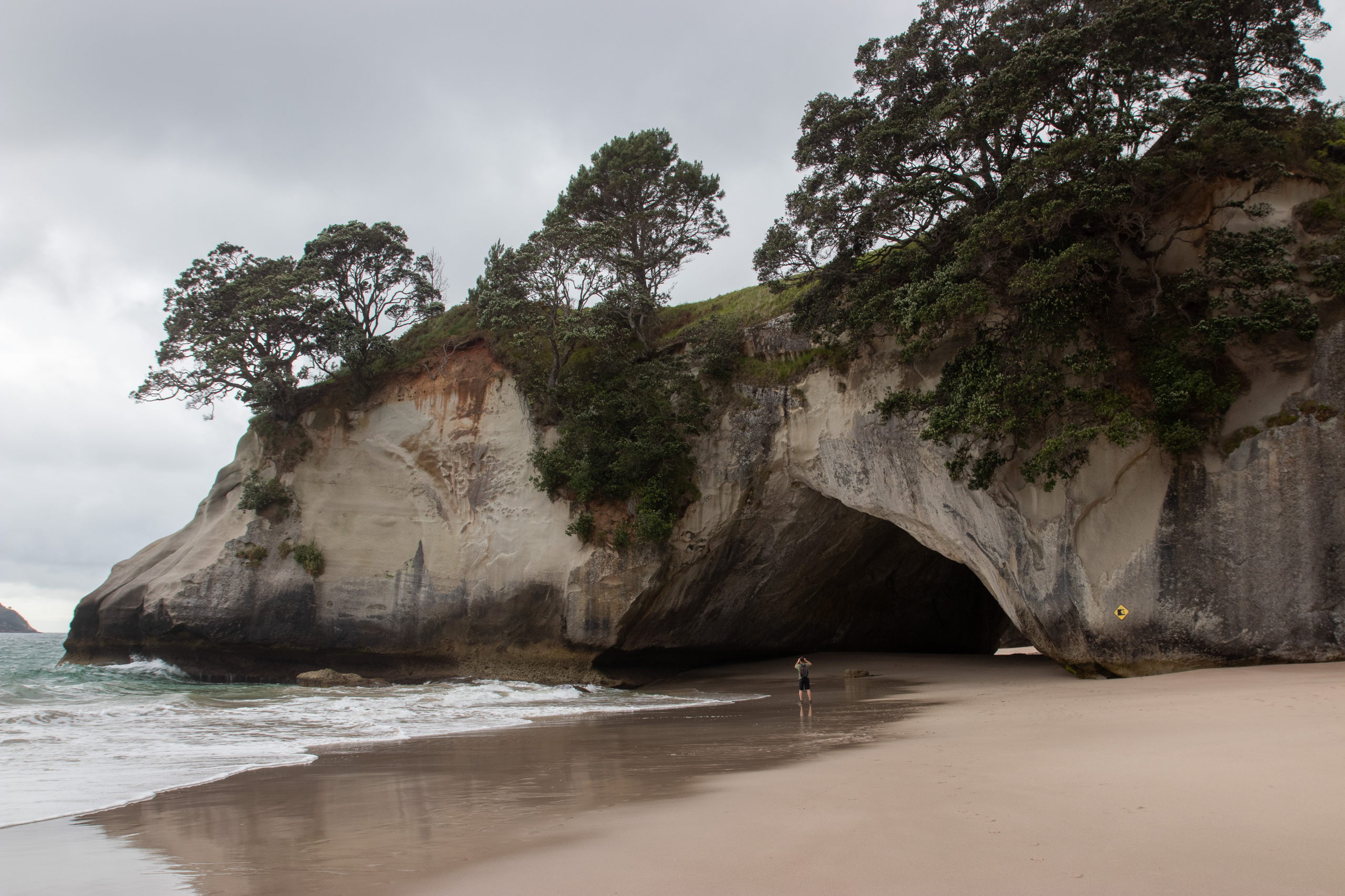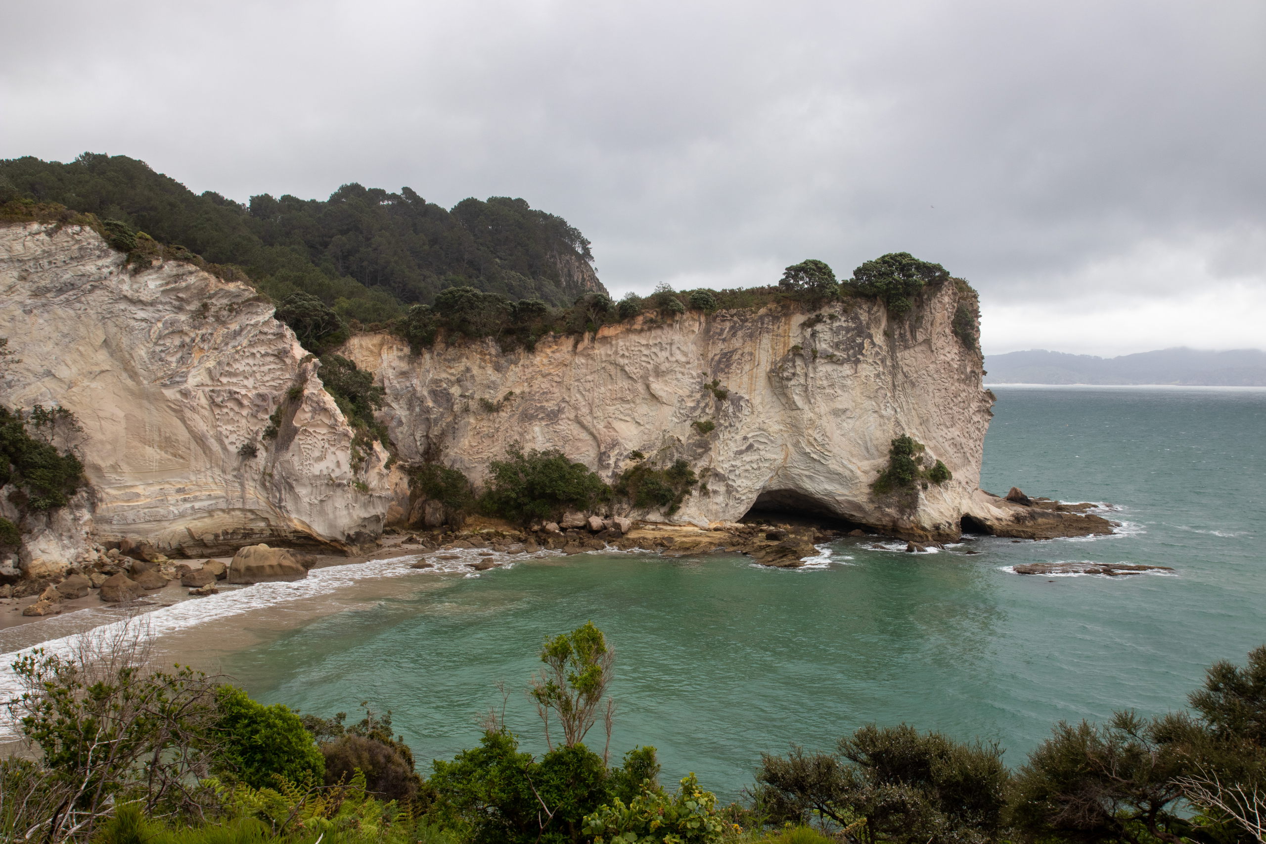 Gleich am Morgen fahre ich nach Hahei und parke direkt im Ort, da im Sommer der Parkplatz vom Cathedral Cove gesperrt ist. Von hier kann man mit einem Shuttle zum eigentlichen Parkplatz hochfahren, ich entscheide mich aber für den Fußmarsch. Ab dem Parkplatz führt ein schöner Weg im leichten Auf und Ab zum Cathedral Cove, einem großen Felsbogen direkt am Strand. Dort angekommen wird man aber zuerst vom Sphinx Rock begrüßt, linkerhand der riesige Felsbogen. Es ist Ebbe und der Durchgang frei. Jupidu. Na gut, war ja auch so geplant. 😁 Nur schade, dass sich die Sonne nicht durchgesetzt hat. Am Rückweg schaue ich noch kurz zur Stingray Bay und zur Gemstone Bay. Zurück beim Auto gönne ich mir eine Kleinigkeit zum Essen, woraufhin es im Bauch zu zwicken beginnt. Hmmm, kenne ich doch schon. Mal sehen, wie es sich entwickelt.