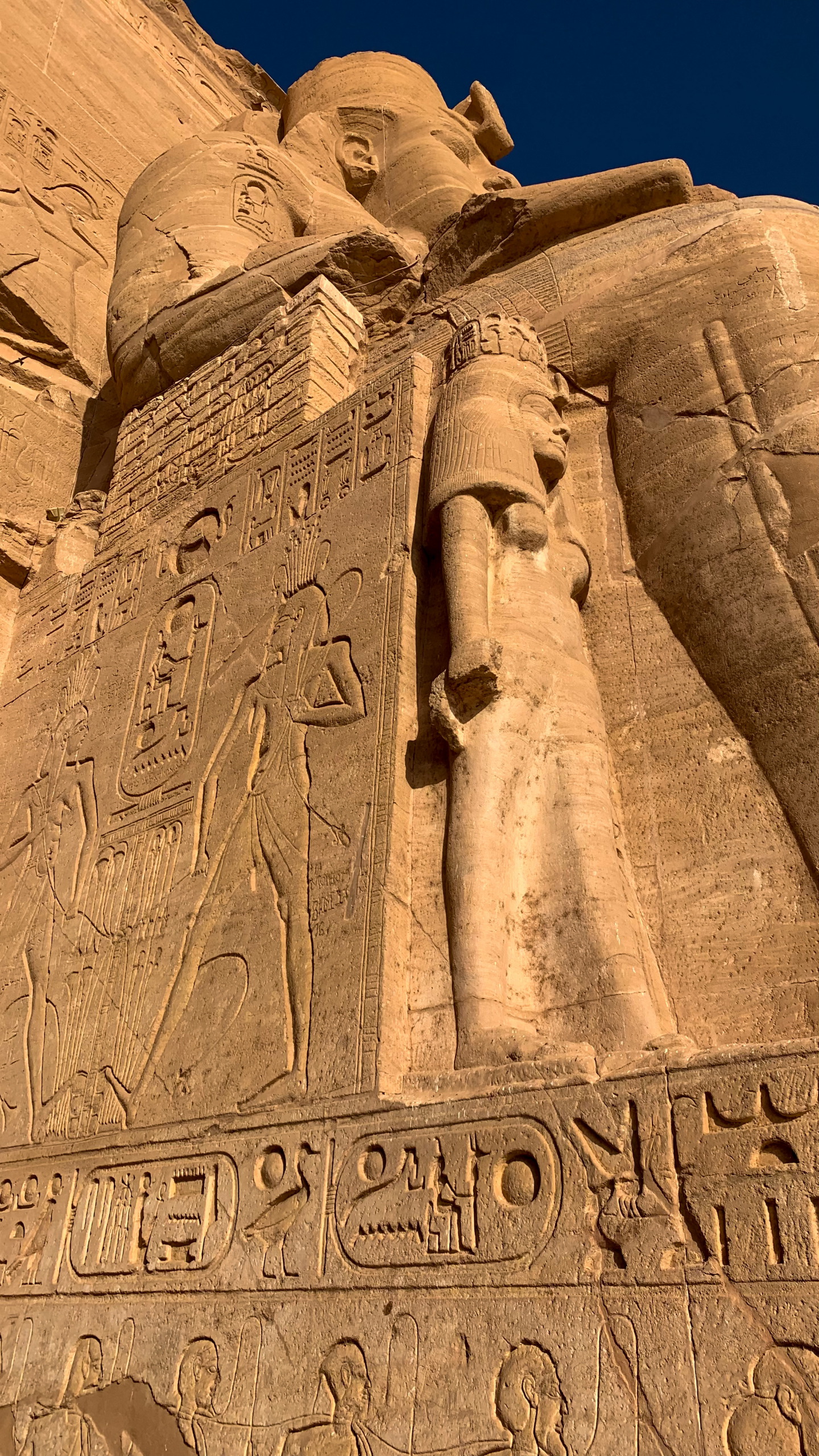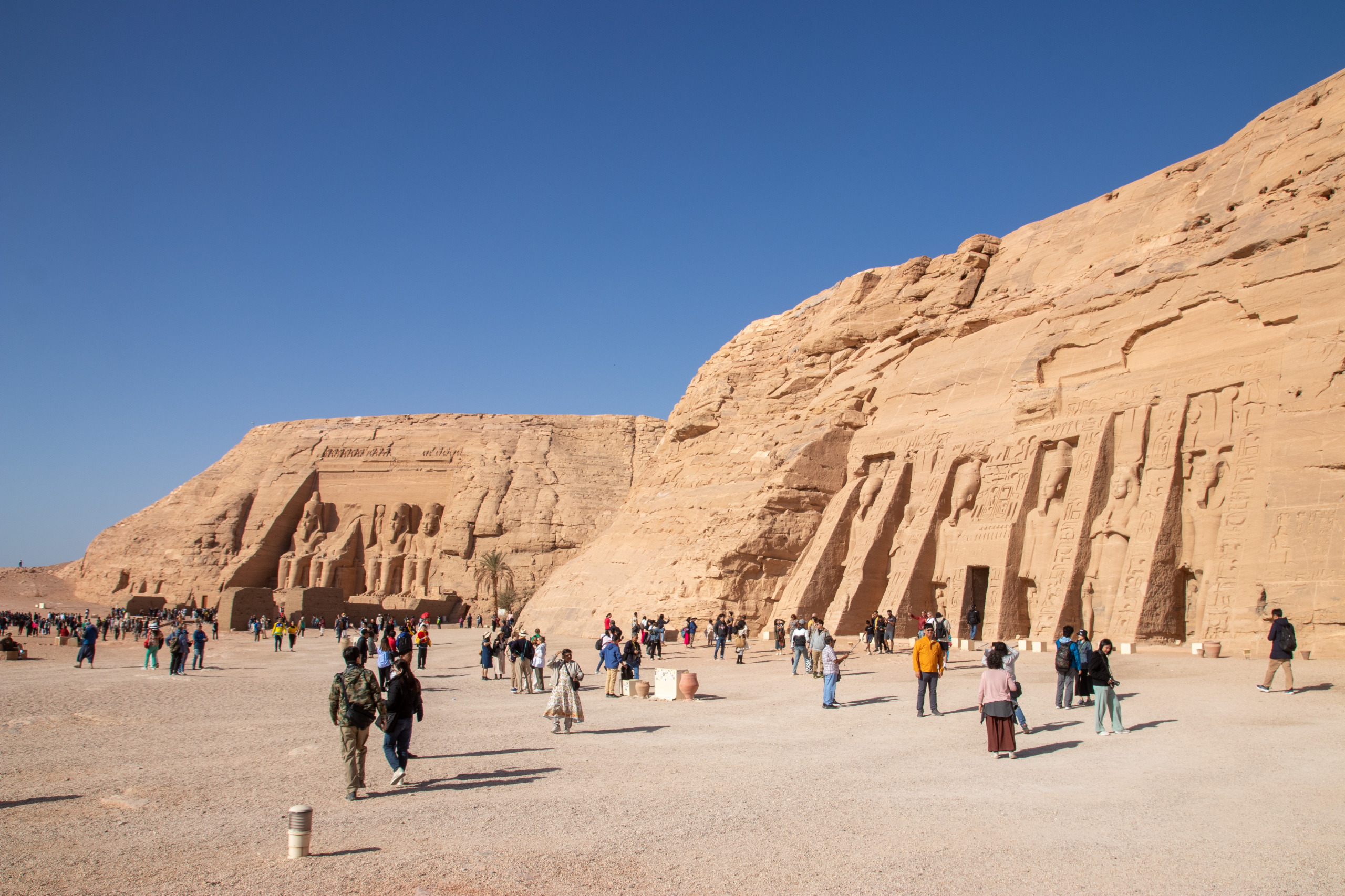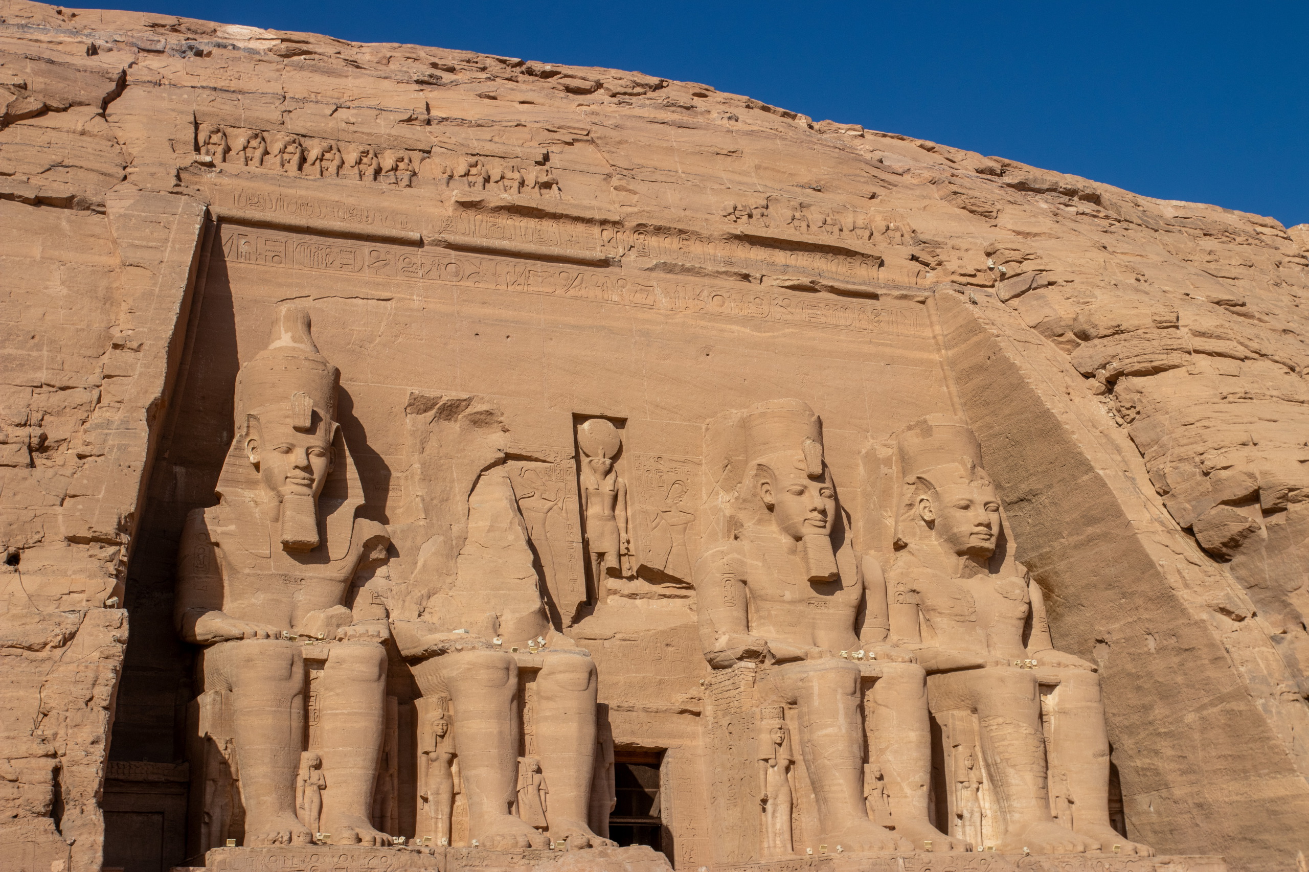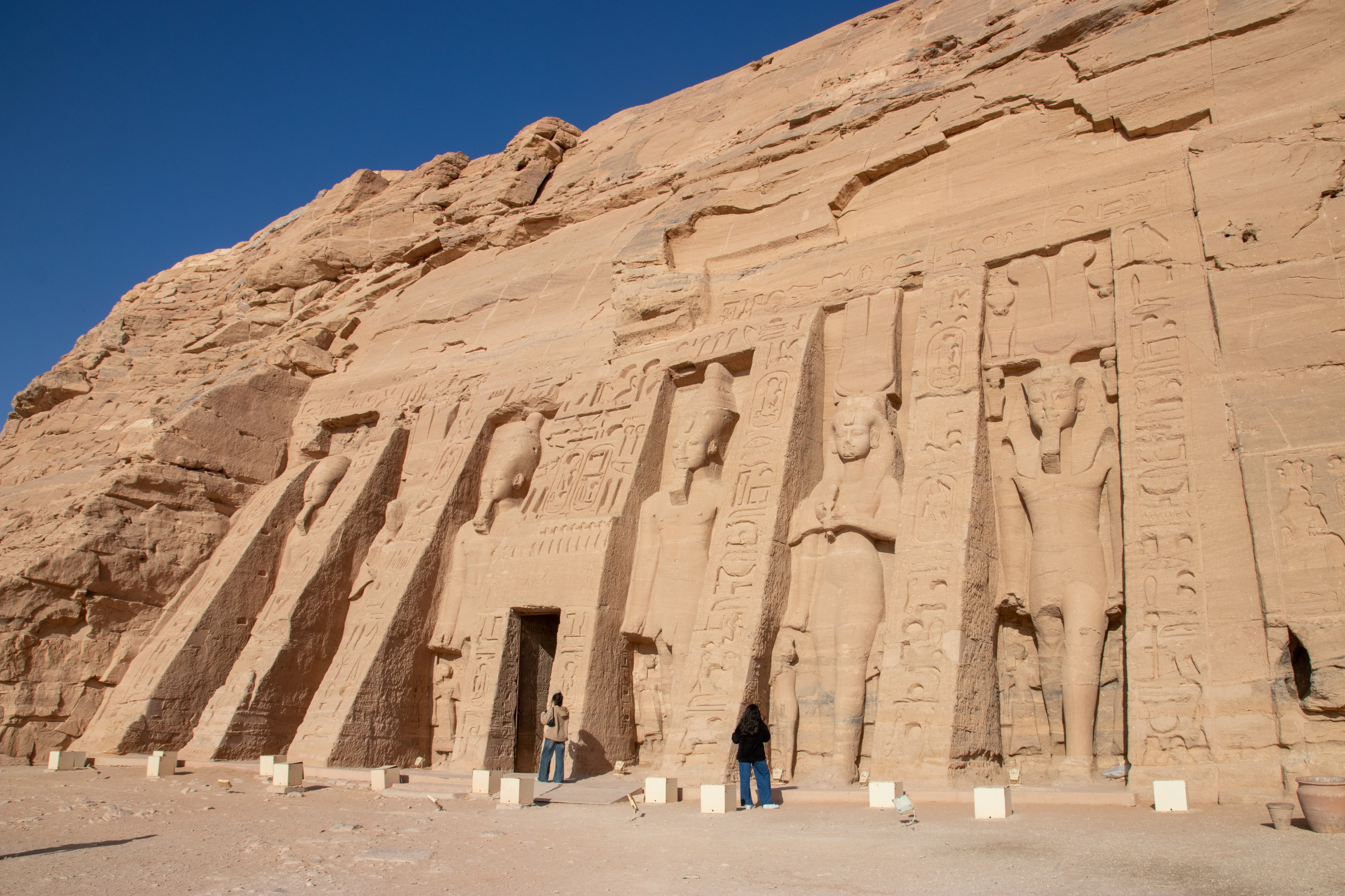 Entlang einer Bazar-Meile geht es zum Ticket Office und von dort um einen Hügel herum, bis zur Front vom ersten Tempel, der dem Ruhm von Ramses II gewidmet ist. Ich staune nicht schlecht, als ich die riesigen Steinfiguren am Eingang sehe. Daneben befindet sich der Hathor-Tempel, der Nefertari, der Frau von Ramses II, gewidmet ist. Auf den ersten Blick ist nicht zu erkennen, dass das hier nicht der originale Standort ist und die Hügel künstlich errichtet wurden. In den Jahren 1963 bis 1968 wurden die Tempel abgetragen und 64 Meter höher auf der Hochebene von Abu Simbel wieder aufgebaut. Grund dafür war das steigende Wasser des Nassersee, der durch den Bau des Assuan-Damms entstanden ist. Was für ein Aufwand, wenn man bedenkt, dass alles zersägt und wieder aufgebaut werden musste. Empfindliche Teile wurden sogar mit der Hand gesägt. Unglaublich. Auch von innen beeindruckt der Tempel mit seinen vielen verzierten Kammern. Hier muss man schon ganz genau hinsehen, um Fugen vom Zusammenbauen zu sehen. Nicht schlecht gemacht. Der Hathor-Tempel ist nicht ganz so aufwändig geschmückt, aber trotzdem sehr beeindruckend. Auch der Ausblick auf den weiten Nassersee ist sehr schön.