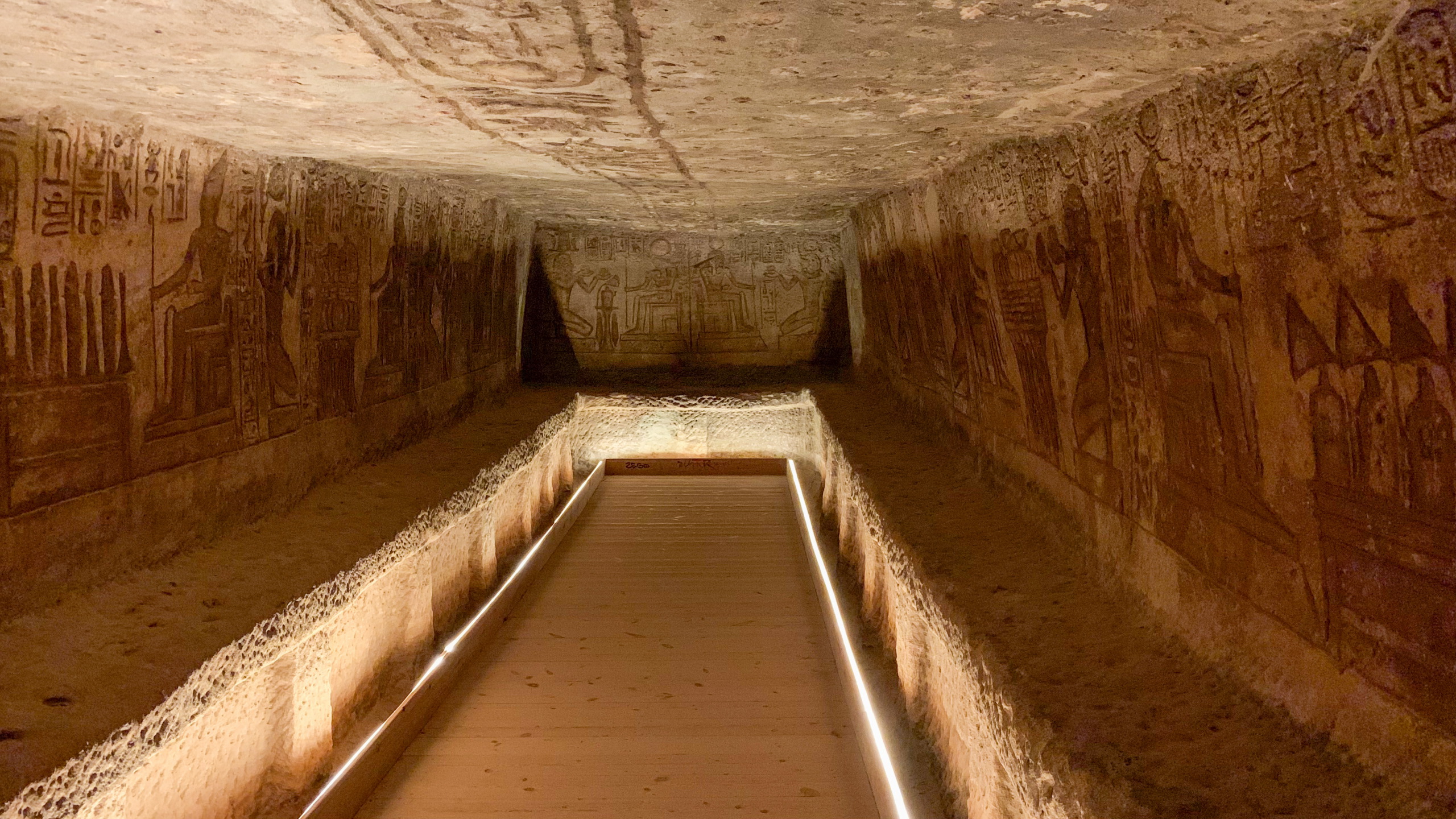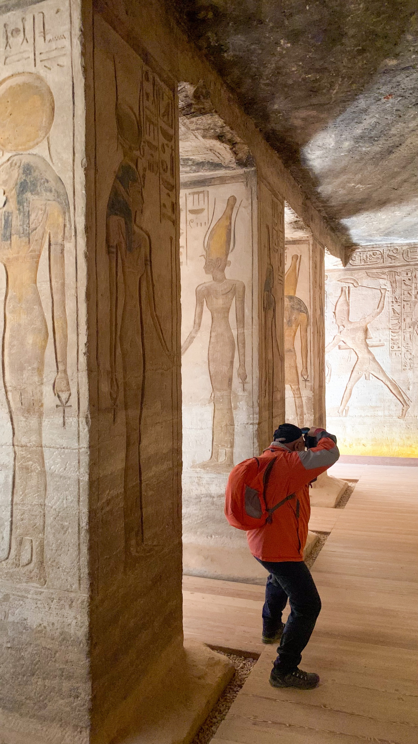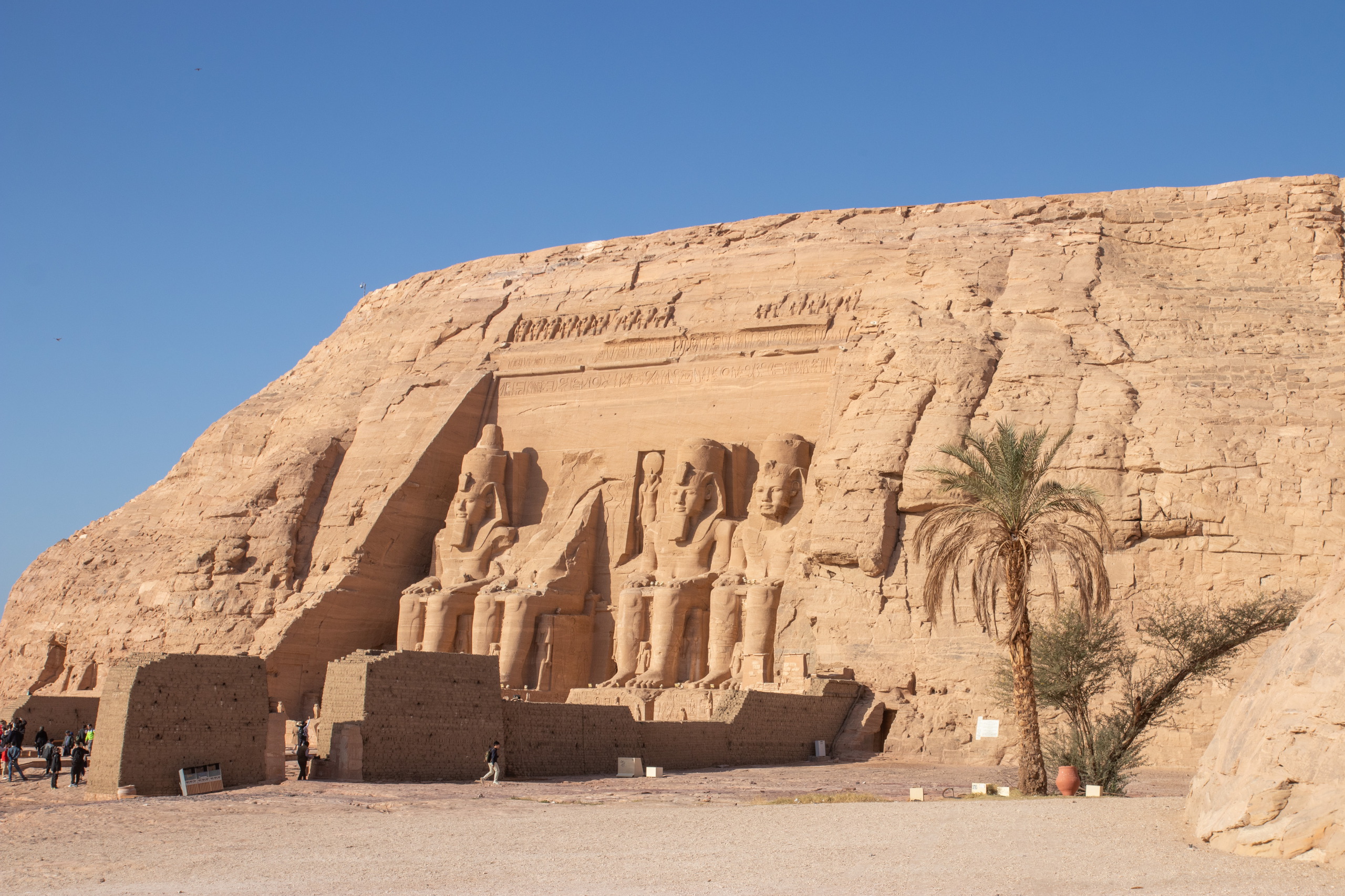 Entlang einer Bazar-Meile geht es zum Ticket Office und von dort um einen Hügel herum, bis zur Front vom ersten Tempel, der dem Ruhm von Ramses II gewidmet ist. Ich staune nicht schlecht, als ich die riesigen Steinfiguren am Eingang sehe. Daneben befindet sich der Hathor-Tempel, der Nefertari, der Frau von Ramses II, gewidmet ist. Auf den ersten Blick ist nicht zu erkennen, dass das hier nicht der originale Standort ist und die Hügel künstlich errichtet wurden. In den Jahren 1963 bis 1968 wurden die Tempel abgetragen und 64 Meter höher auf der Hochebene von Abu Simbel wieder aufgebaut. Grund dafür war das steigende Wasser des Nassersee, der durch den Bau des Assuan-Damms entstanden ist. Was für ein Aufwand, wenn man bedenkt, dass alles zersägt und wieder aufgebaut werden musste. Empfindliche Teile wurden sogar mit der Hand gesägt. Unglaublich. Auch von innen beeindruckt der Tempel mit seinen vielen verzierten Kammern. Hier muss man schon ganz genau hinsehen, um Fugen vom Zusammenbauen zu sehen. Nicht schlecht gemacht. Der Hathor-Tempel ist nicht ganz so aufwändig geschmückt, aber trotzdem sehr beeindruckend. Auch der Ausblick auf den weiten Nassersee ist sehr schön.
