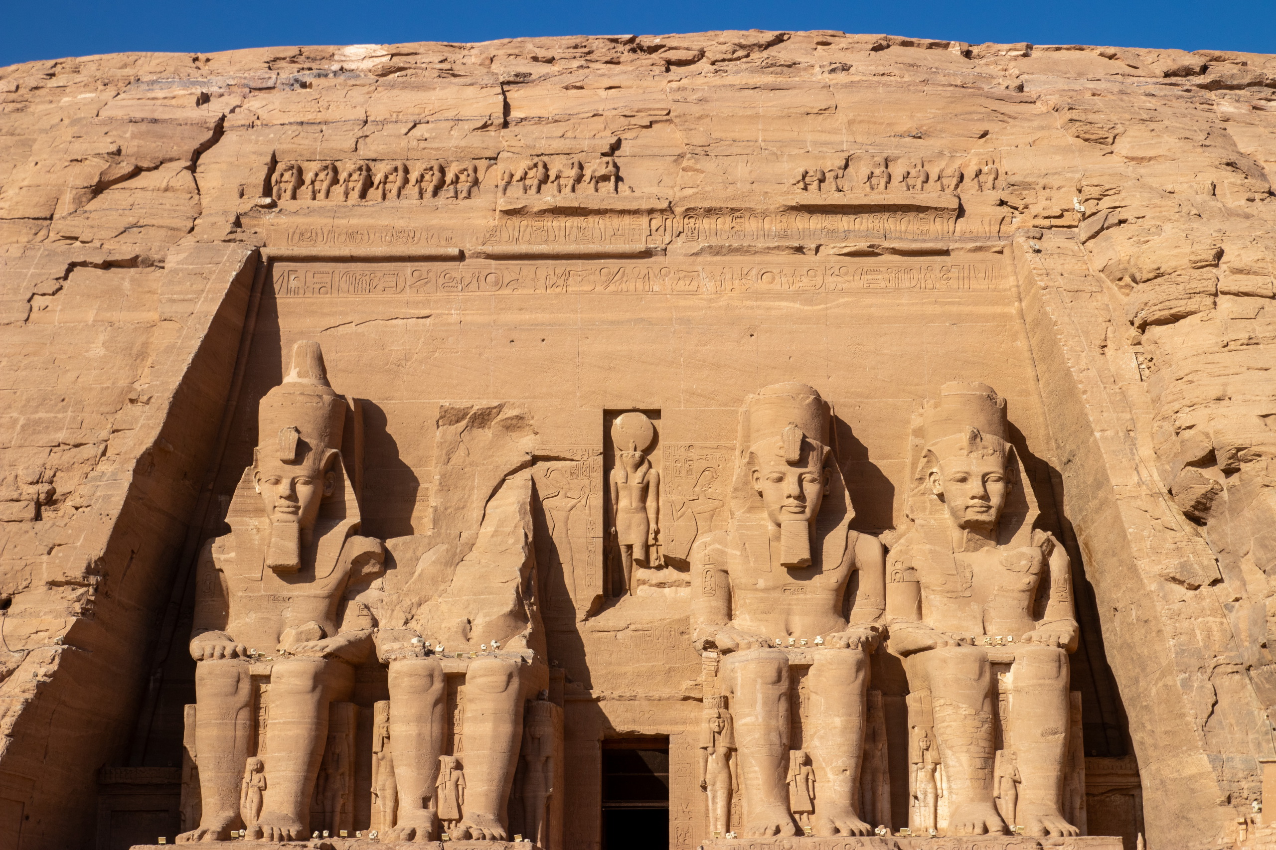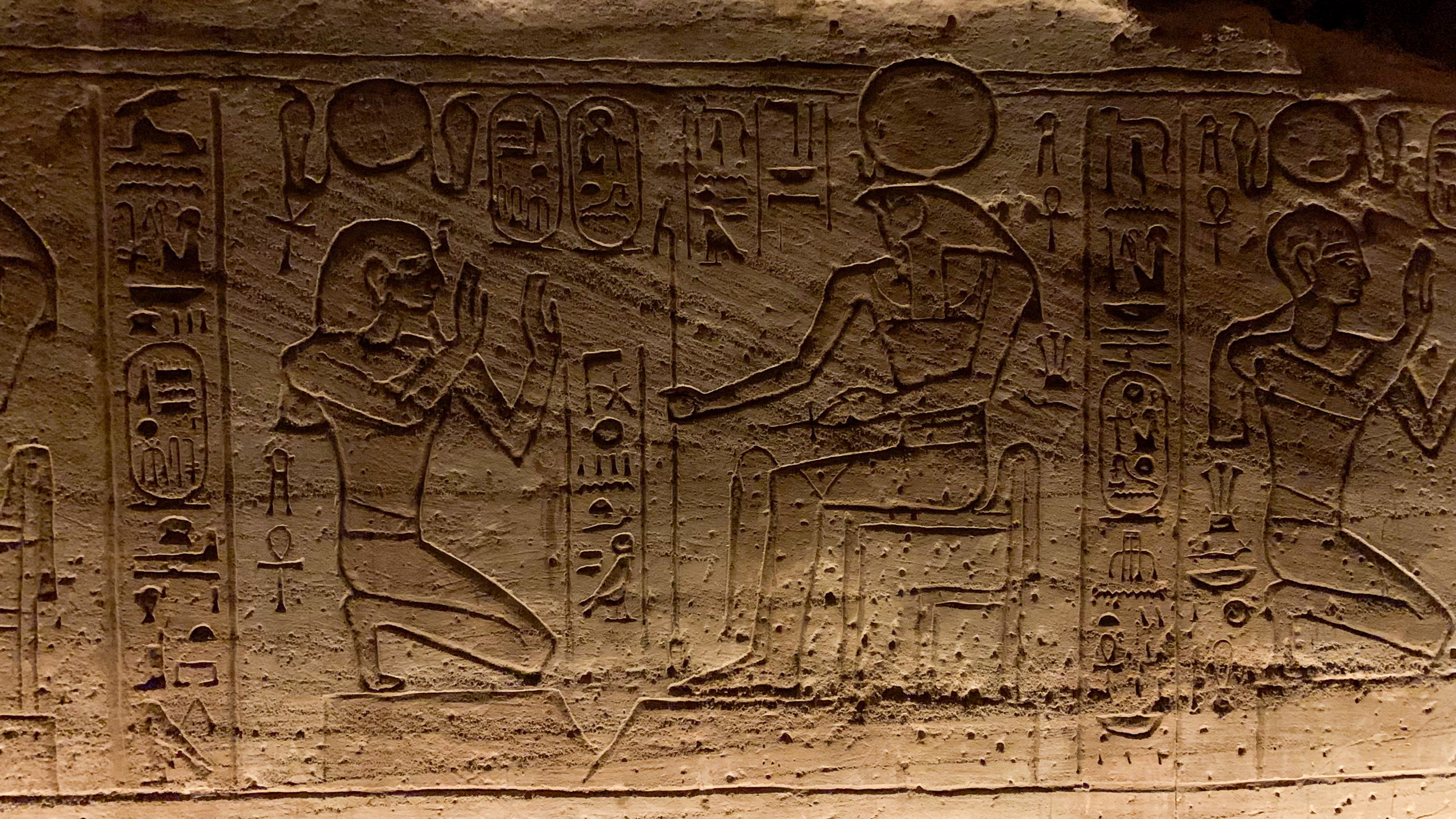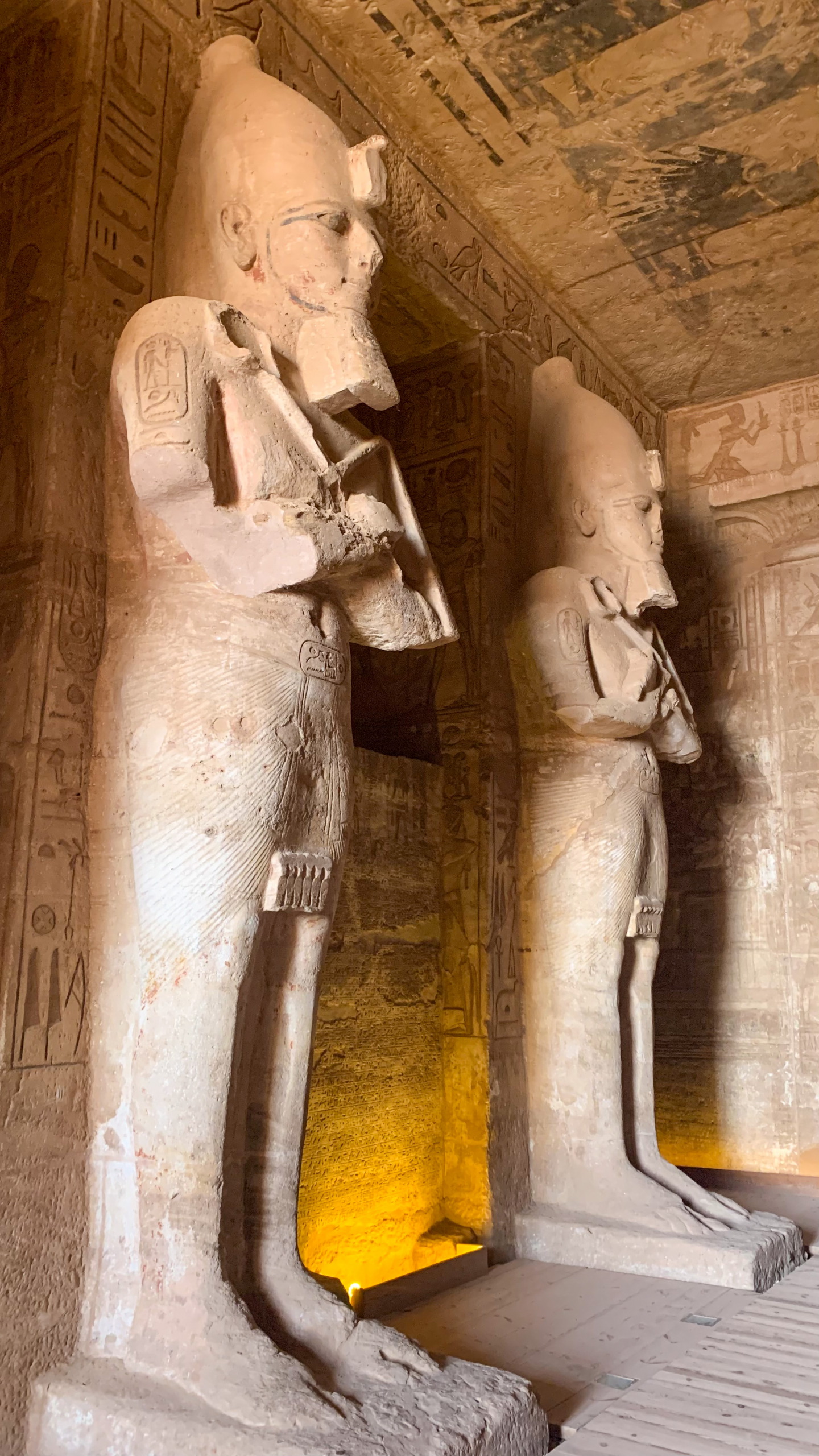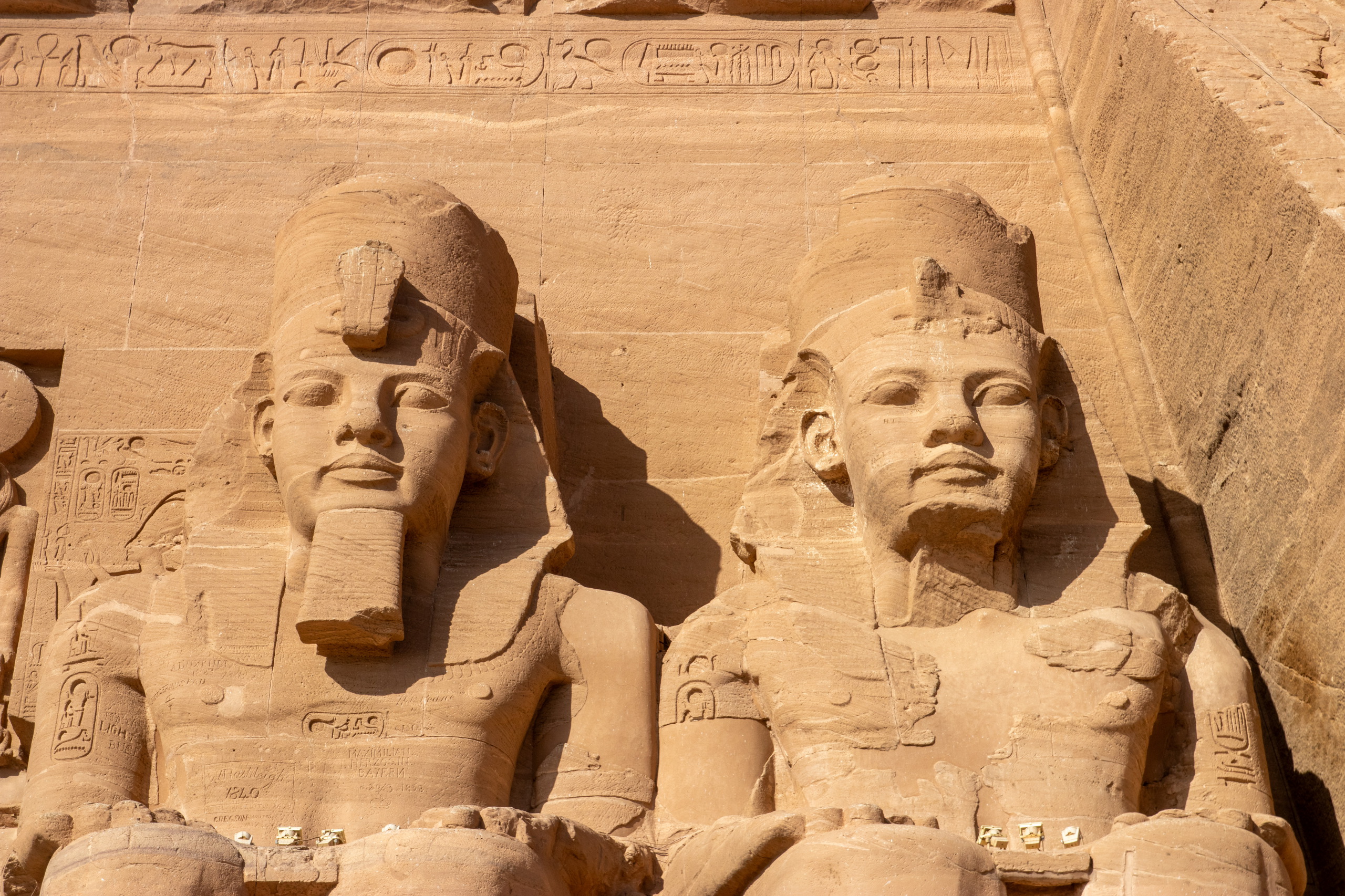 Entlang einer Bazar-Meile geht es zum Ticket Office und von dort um einen Hügel herum, bis zur Front vom ersten Tempel, der dem Ruhm von Ramses II gewidmet ist. Ich staune nicht schlecht, als ich die riesigen Steinfiguren am Eingang sehe. Daneben befindet sich der Hathor-Tempel, der Nefertari, der Frau von Ramses II, gewidmet ist. Auf den ersten Blick ist nicht zu erkennen, dass das hier nicht der originale Standort ist und die Hügel künstlich errichtet wurden. In den Jahren 1963 bis 1968 wurden die Tempel abgetragen und 64 Meter höher auf der Hochebene von Abu Simbel wieder aufgebaut. Grund dafür war das steigende Wasser des Nassersee, der durch den Bau des Assuan-Damms entstanden ist. Was für ein Aufwand, wenn man bedenkt, dass alles zersägt und wieder aufgebaut werden musste. Empfindliche Teile wurden sogar mit der Hand gesägt. Unglaublich. Auch von innen beeindruckt der Tempel mit seinen vielen verzierten Kammern. Hier muss man schon ganz genau hinsehen, um Fugen vom Zusammenbauen zu sehen. Nicht schlecht gemacht. Der Hathor-Tempel ist nicht ganz so aufwändig geschmückt, aber trotzdem sehr beeindruckend. Auch der Ausblick auf den weiten Nassersee ist sehr schön.
