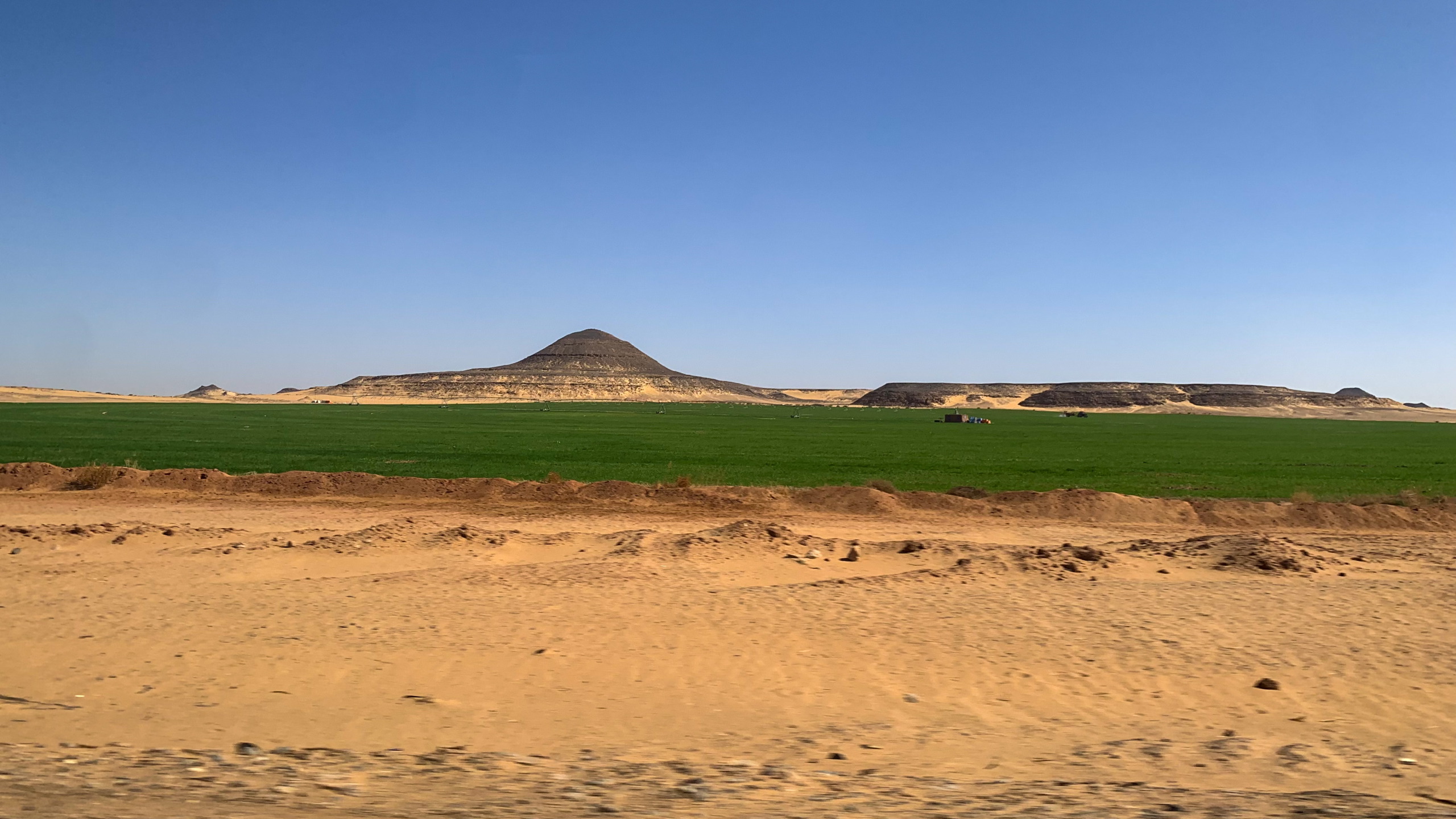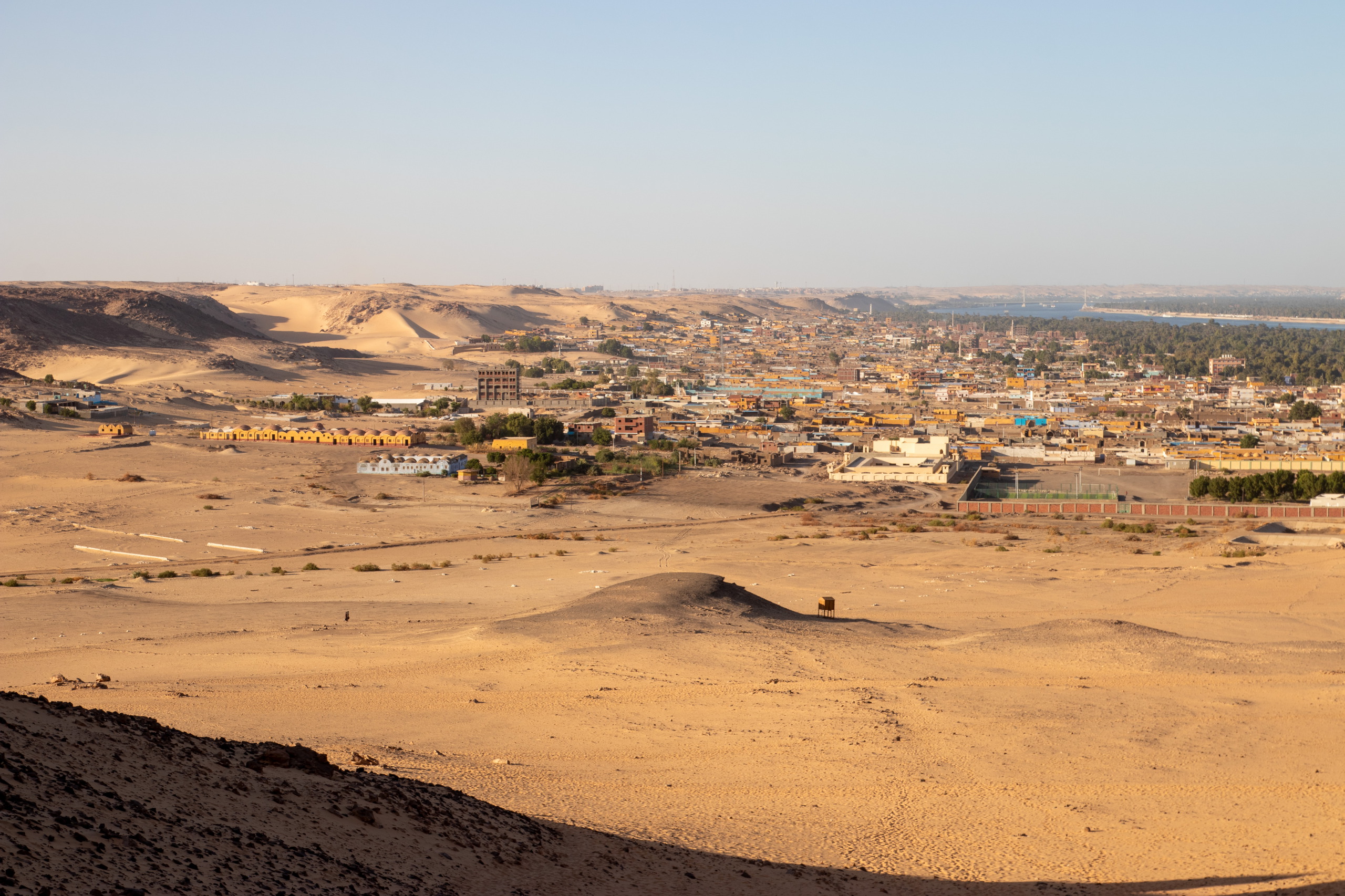 Obwohl das Frühstück ausreichend war, habe ich Hunger und kaufe mir sauteure Kekse, bevor ich zurück zum Bus gehe. Bereits um zehn Uhr fahren wir wieder durch die Wüste zurück. Erstaunlicher Weise sind immer wieder grüne runde Felder entlang der Straße zu sehen. Tja, Vorrichtungen zur Bewässerung, die hier ständig im Kreis fahren, machen es möglich, Getreide anzubauen. In Assuan angekommen, steige ich an der nördlichsten Stelle der Route aus und spare mir den Weg vom Hostel.