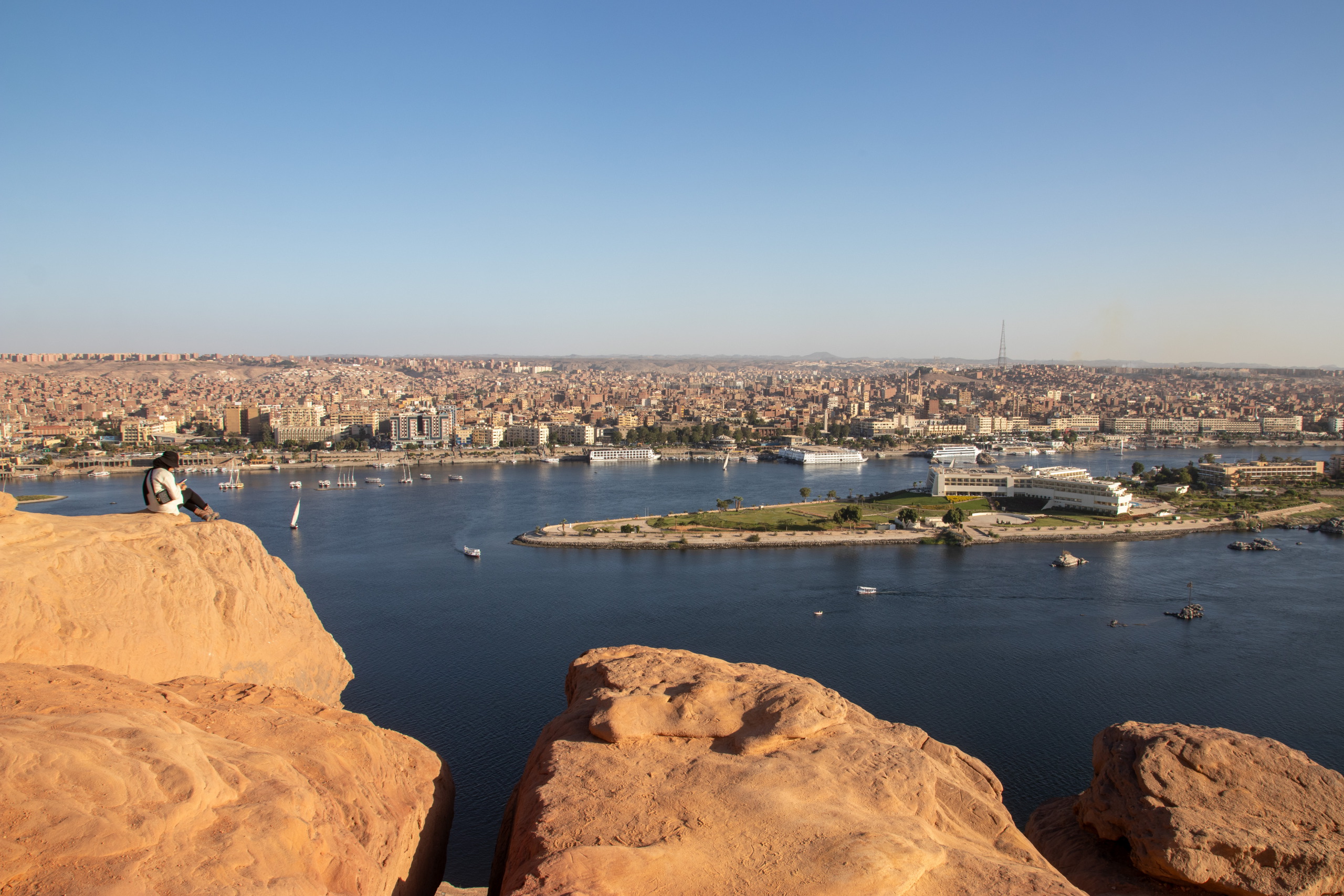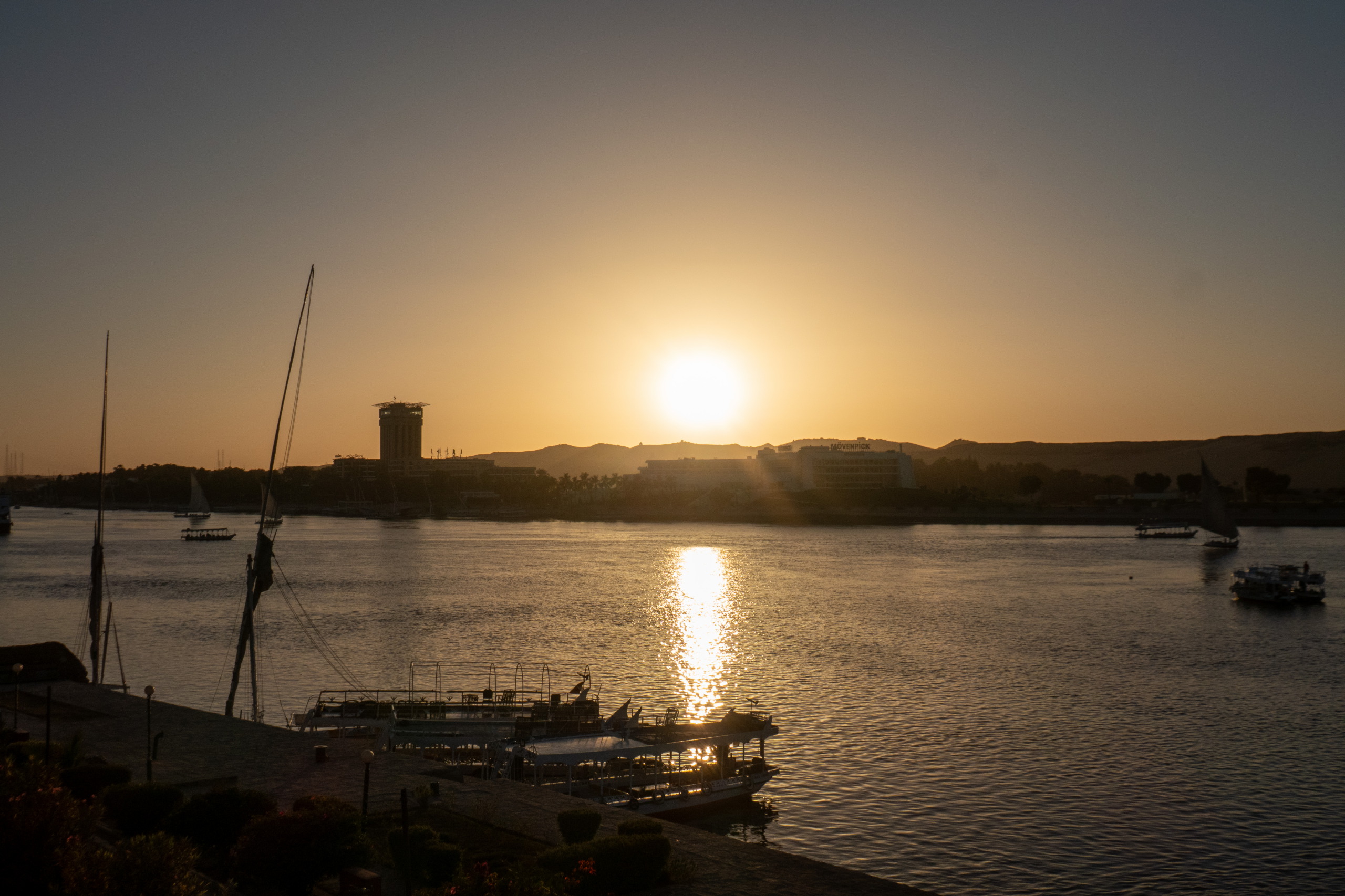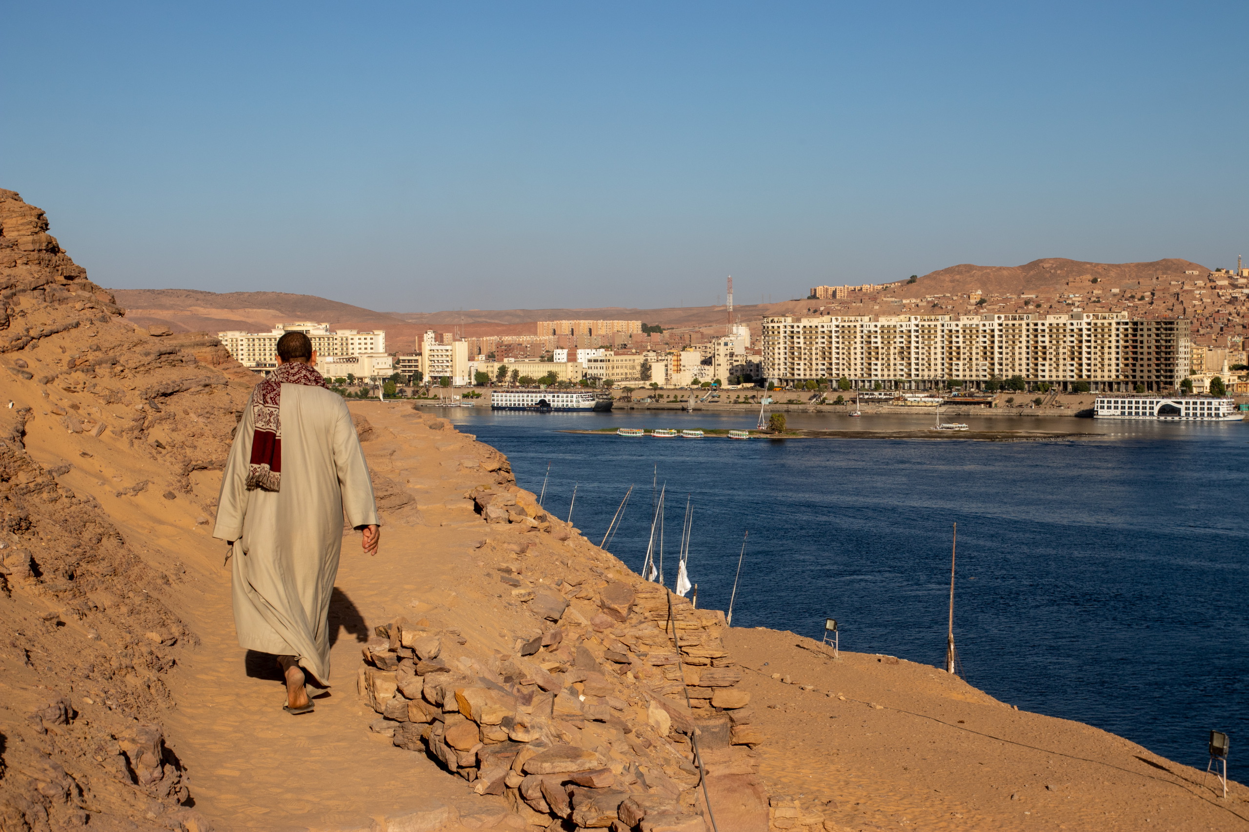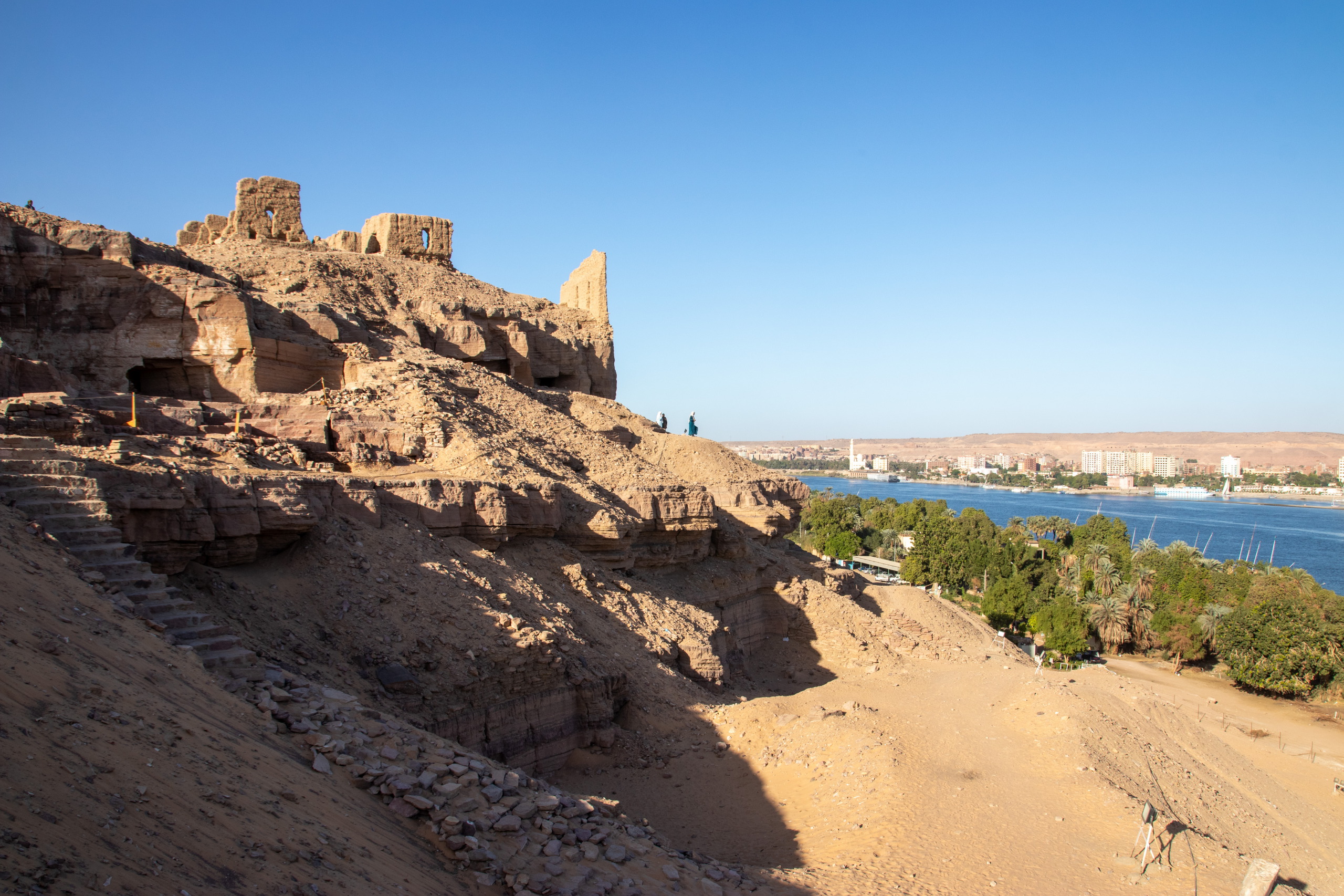 Vom Aussichtspunkt hat man einen tollen Überblick über den Nil, auf dem einiges los ist. Viele kleine Fährschiffe, von denen ja bekanntlich am Nachmittag keine mehr fahren. Jajaja, bla bla. Außerdem sind sehr viele Kreuzfahrtschiffe unterwegs. Das muss ja voll das mega Geschäft sein. Vorbei an einigen Grabkammern und den Resten einer Kirche geht es wieder die Stufen runter, wo ich wieder einmal Fotograf spielen darf. Klar, dass ich dann auch noch aufs Foto soll. 😃