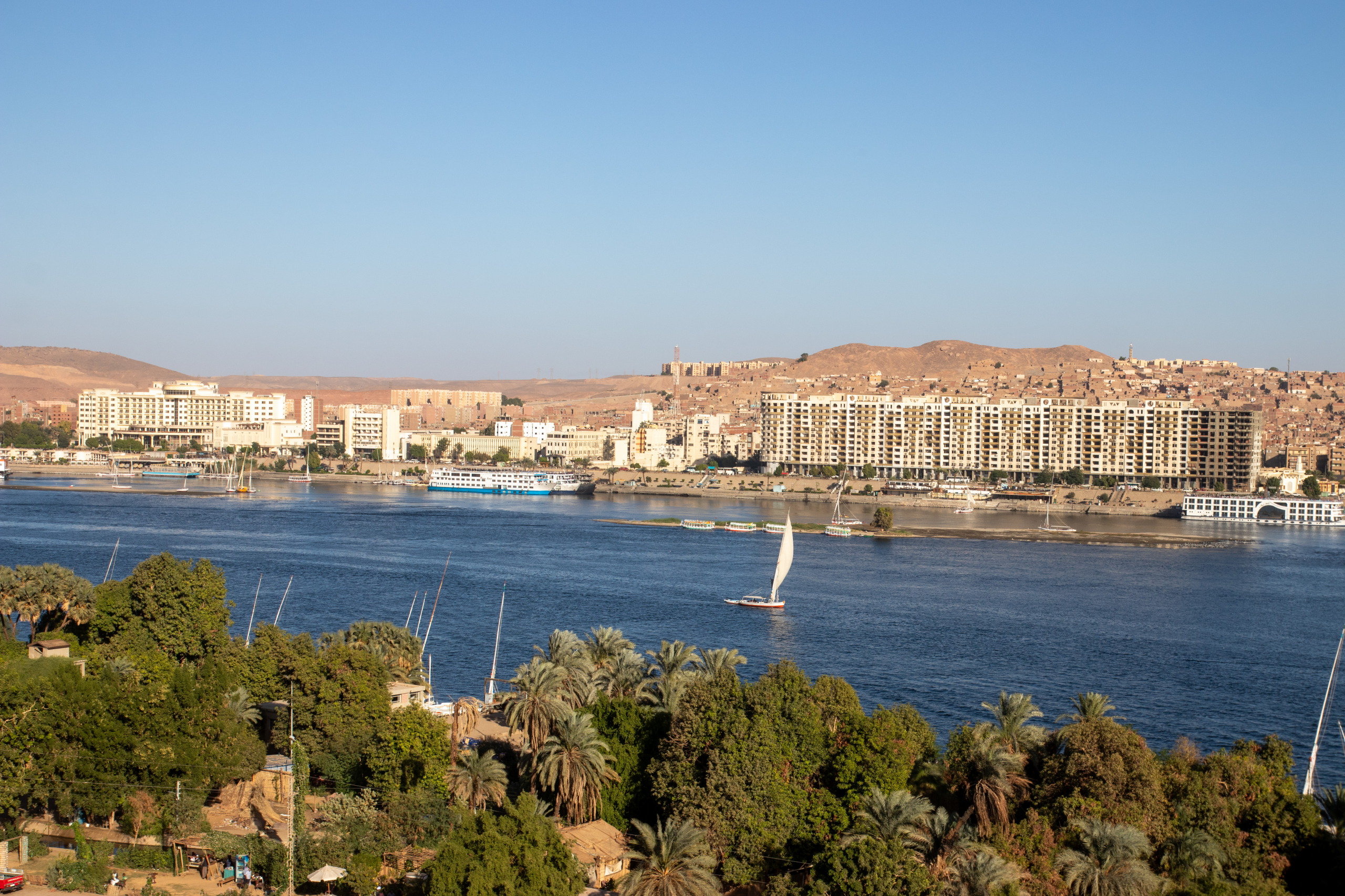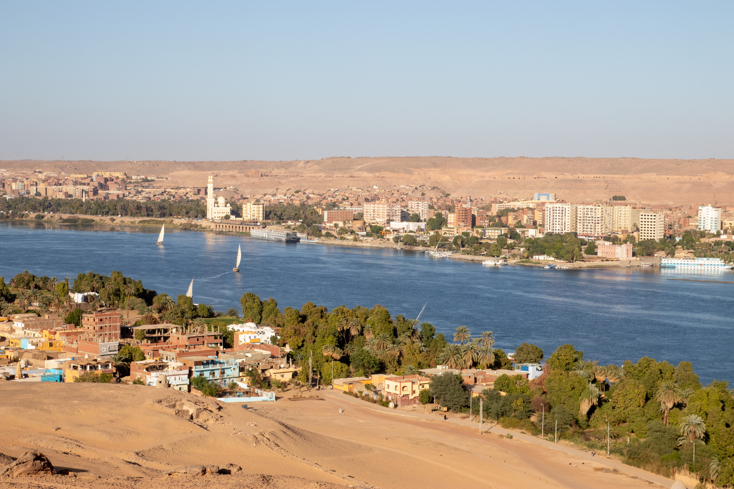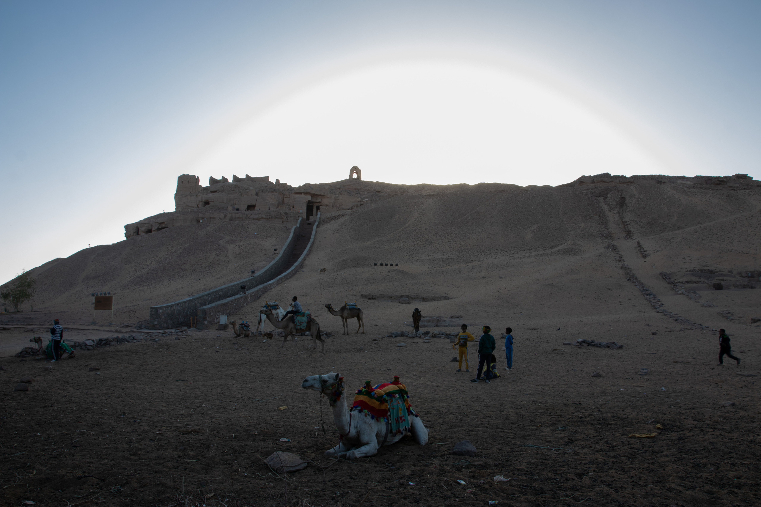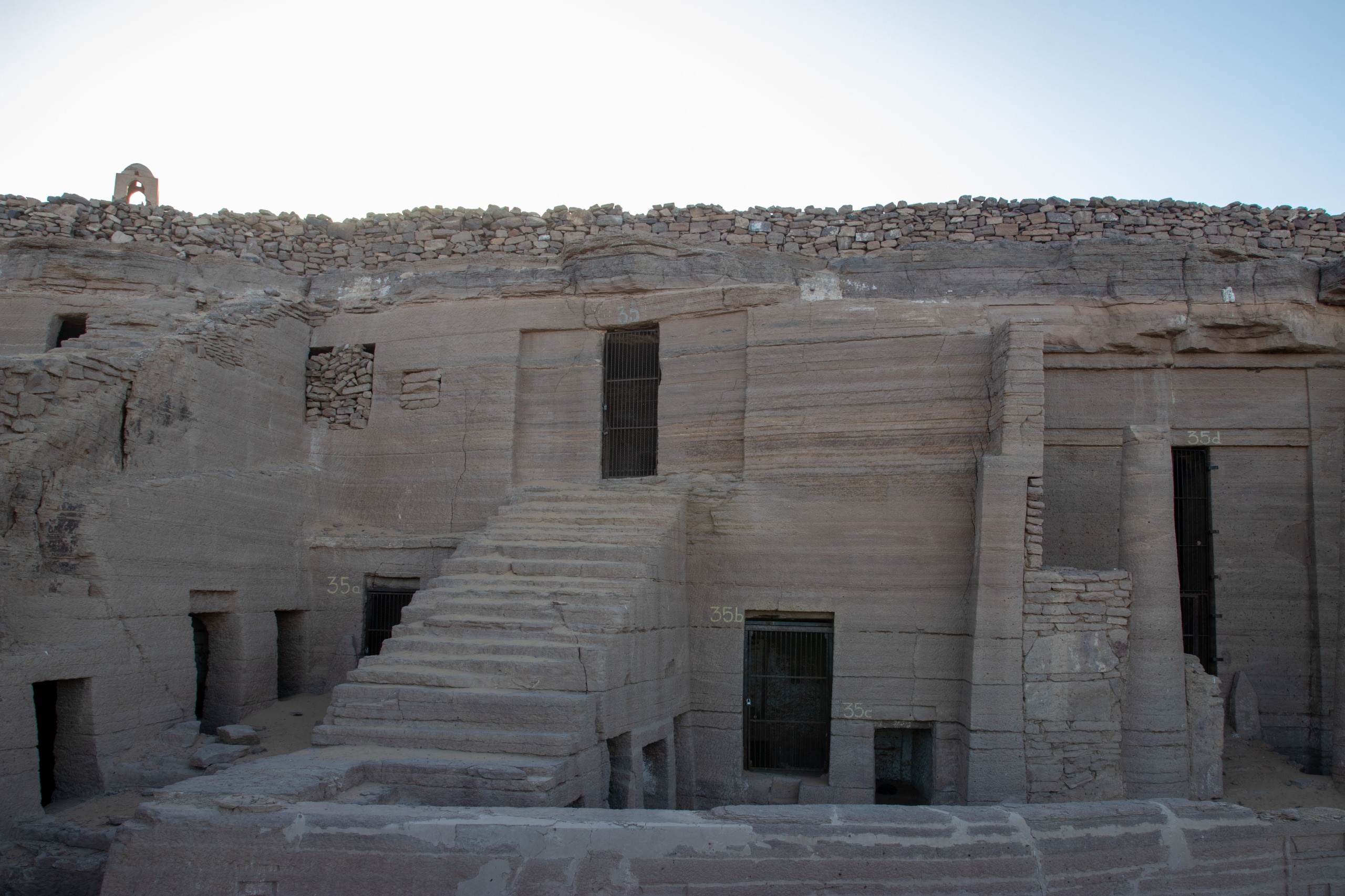 Vom Aussichtspunkt hat man einen tollen Überblick über den Nil, auf dem einiges los ist. Viele kleine Fährschiffe, von denen ja bekanntlich am Nachmittag keine mehr fahren. Jajaja, bla bla. Außerdem sind sehr viele Kreuzfahrtschiffe unterwegs. Das muss ja voll das mega Geschäft sein. Vorbei an einigen Grabkammern und den Resten einer Kirche geht es wieder die Stufen runter, wo ich wieder einmal Fotograf spielen darf. Klar, dass ich dann auch noch aufs Foto soll. 😃
