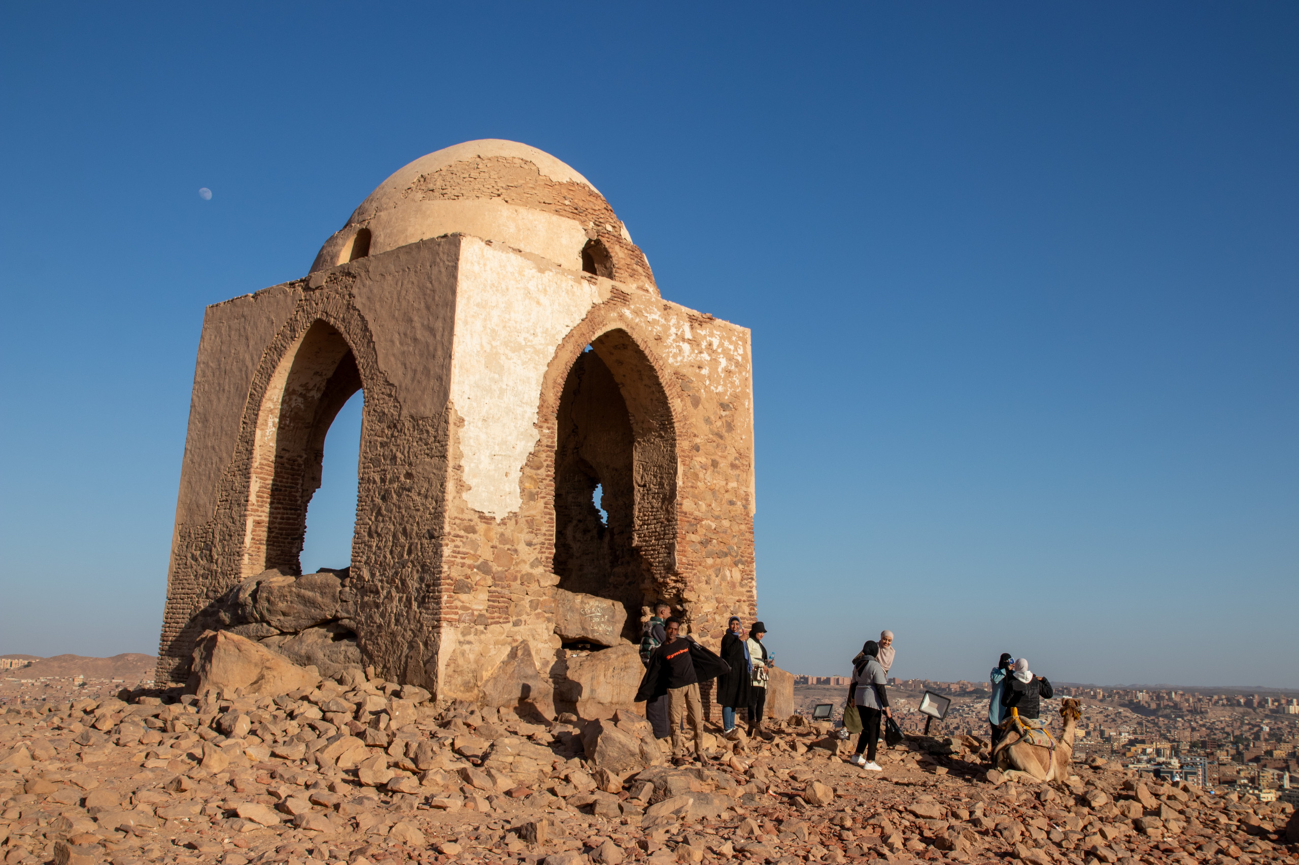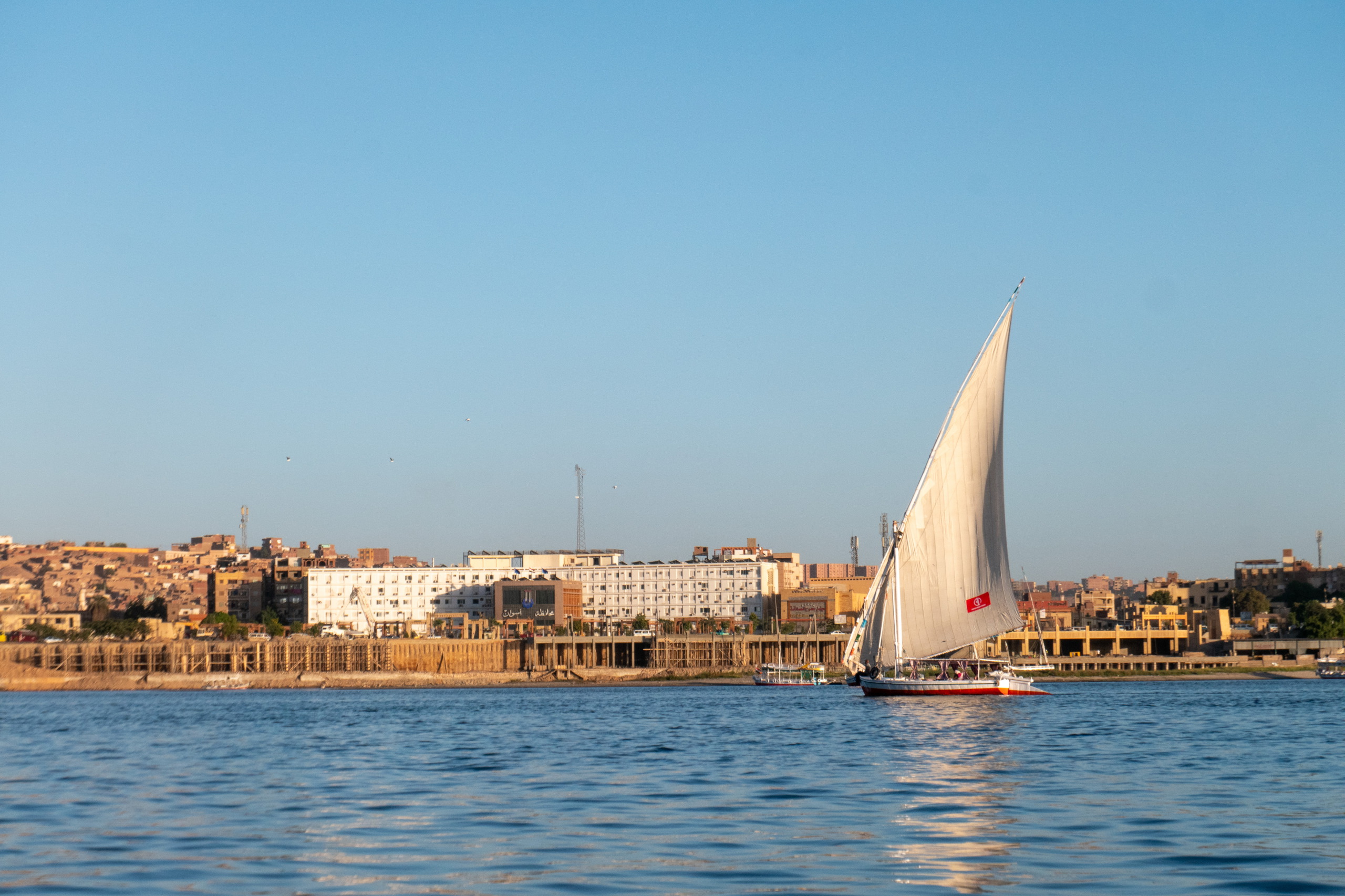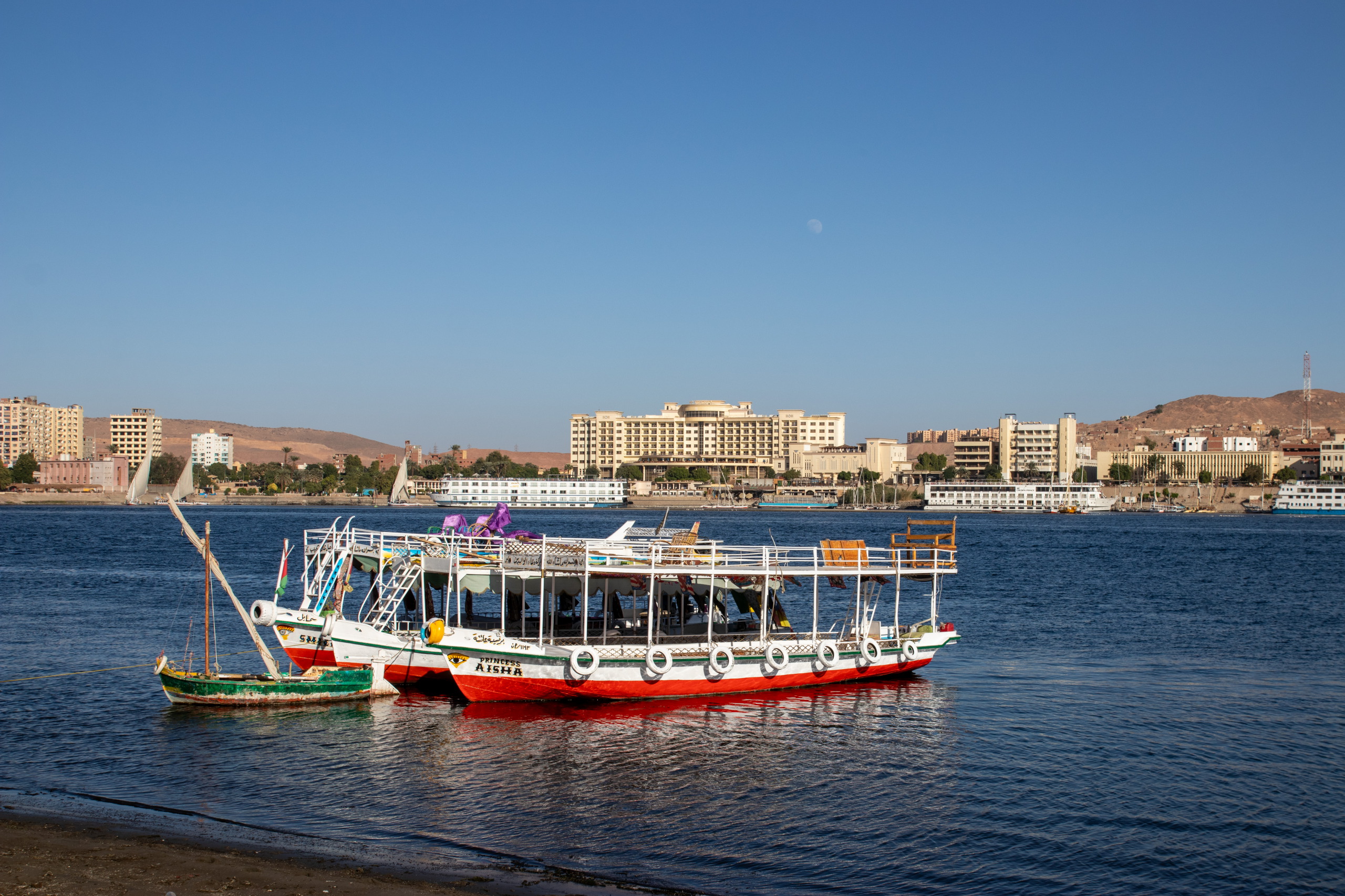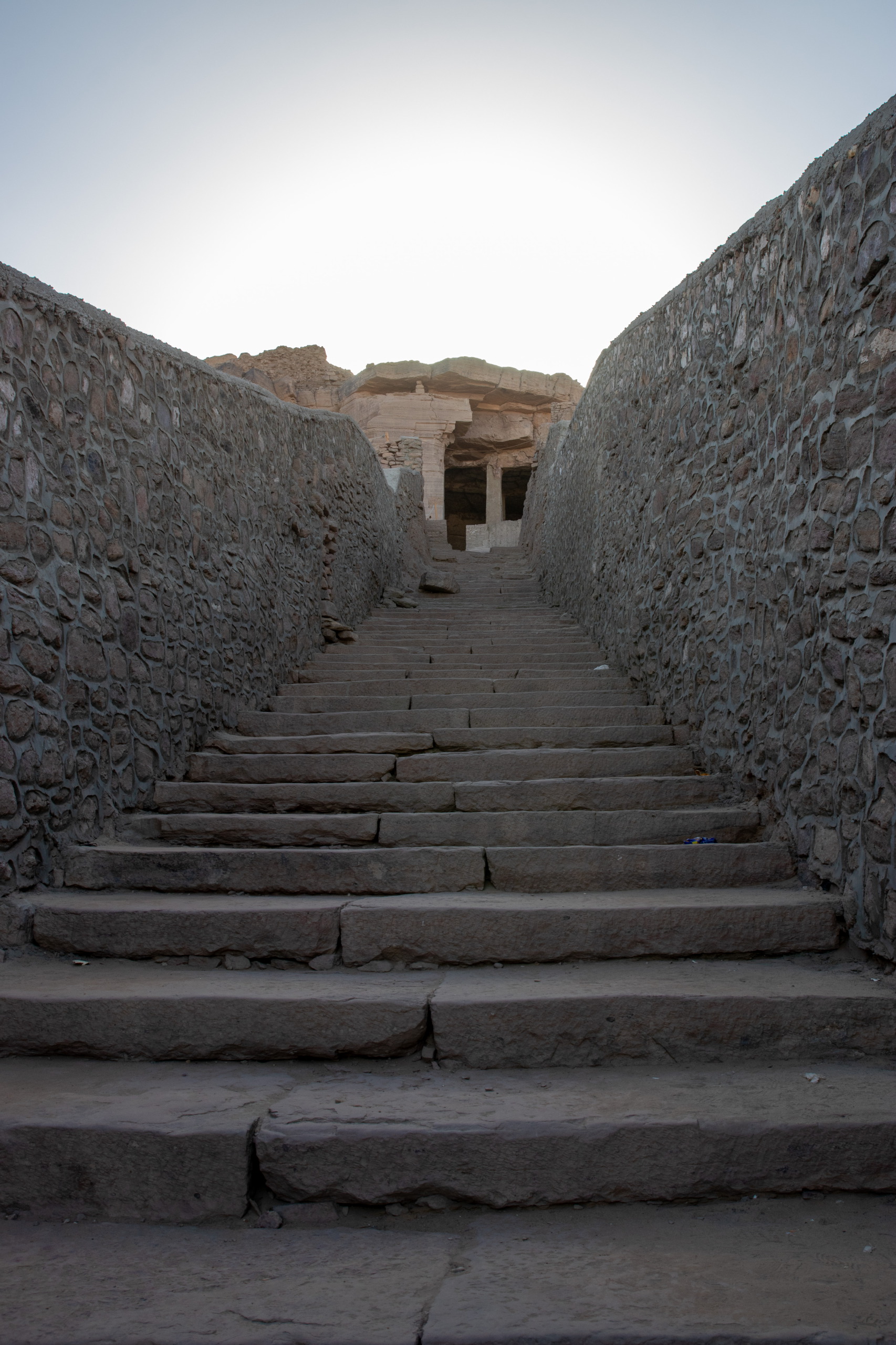 Vom Aussichtspunkt hat man einen tollen Überblick über den Nil, auf dem einiges los ist. Viele kleine Fährschiffe, von denen ja bekanntlich am Nachmittag keine mehr fahren. Jajaja, bla bla. Außerdem sind sehr viele Kreuzfahrtschiffe unterwegs. Das muss ja voll das mega Geschäft sein. Vorbei an einigen Grabkammern und den Resten einer Kirche geht es wieder die Stufen runter, wo ich wieder einmal Fotograf spielen darf. Klar, dass ich dann auch noch aufs Foto soll. 😃