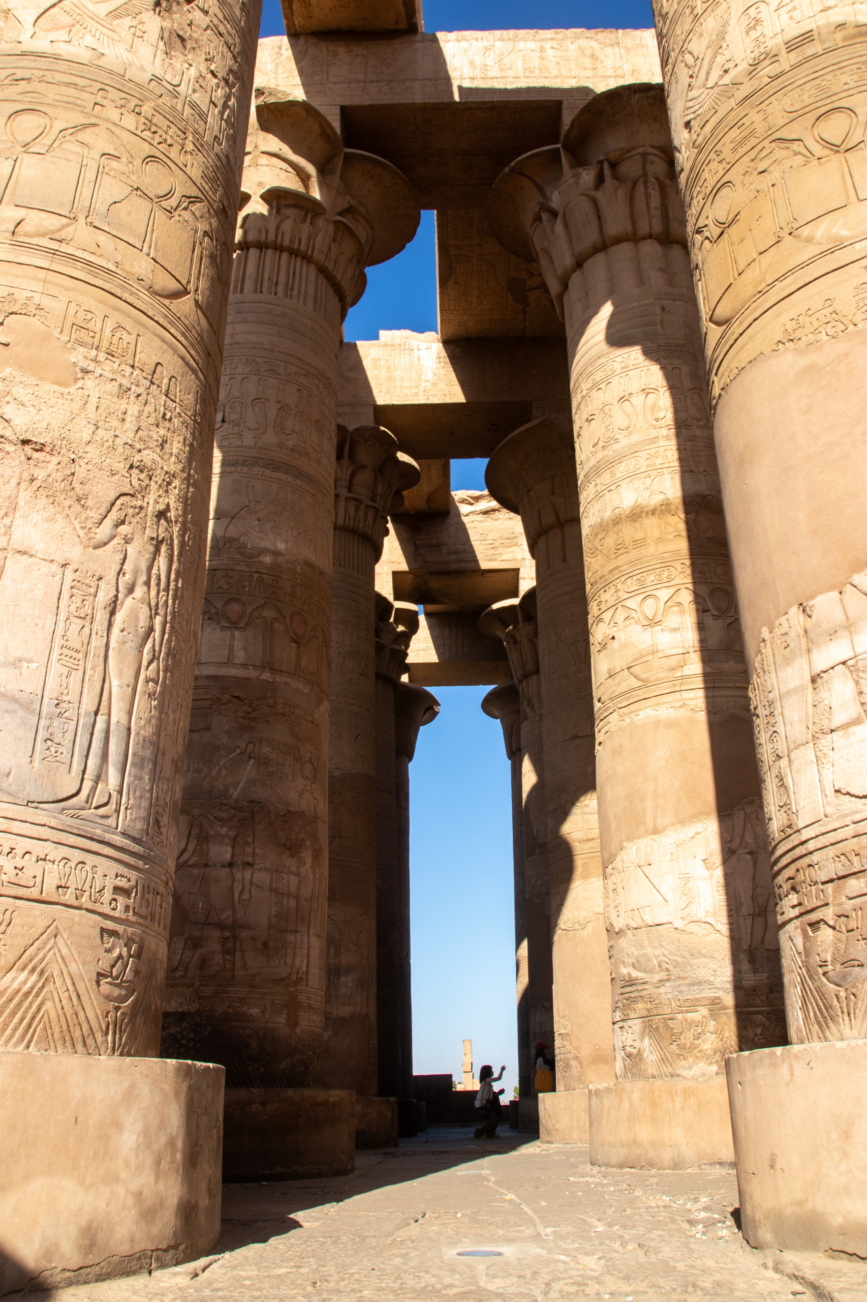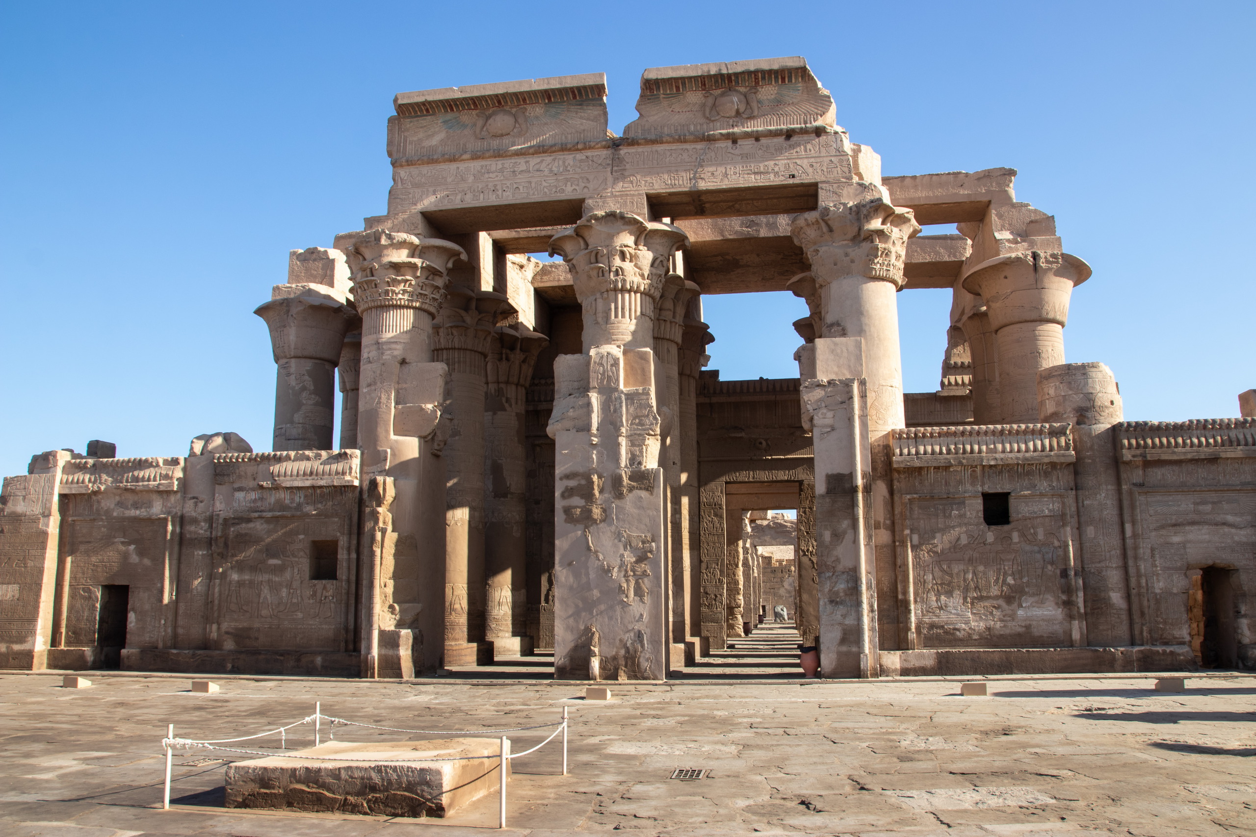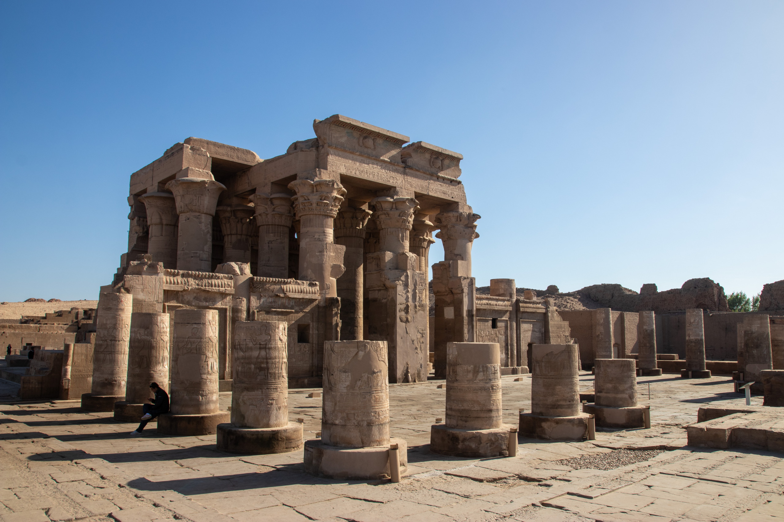 Nach dem üblichen Frühstück starte ich mit dem gestern bestellten Taxi in Richtung Norden los, immer östlich dem Nil entlang. Fares und ich unterhalten uns prächtig während der Fahrt und kurz vor Kom Ombo sehen wir sogar einen ägyptischen Schakal auf der Straße hüpfen. Er schaut etwas verwirrt und macht sich wieder vom Acker. Cool. Unser erster Halt ist der Doppeltempel von Kom Ombo, der mit seinen riesigen Säulen sehr beeindruckend ist und ganz anders aussieht als die bereits besuchten. Das Krokodilmuseum, das sich ebenfalls am Gelände befindet ist auch ganz interessant.
