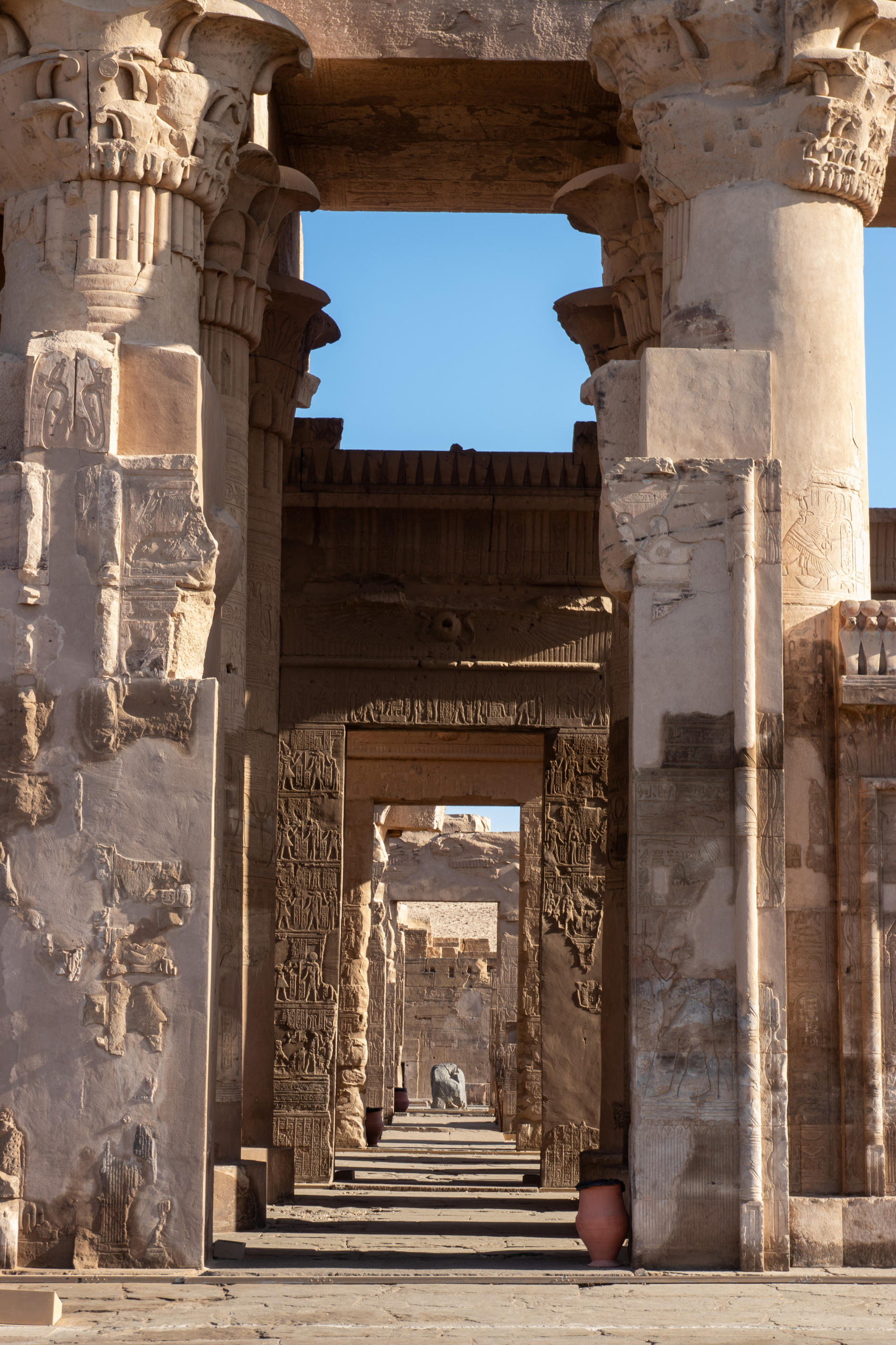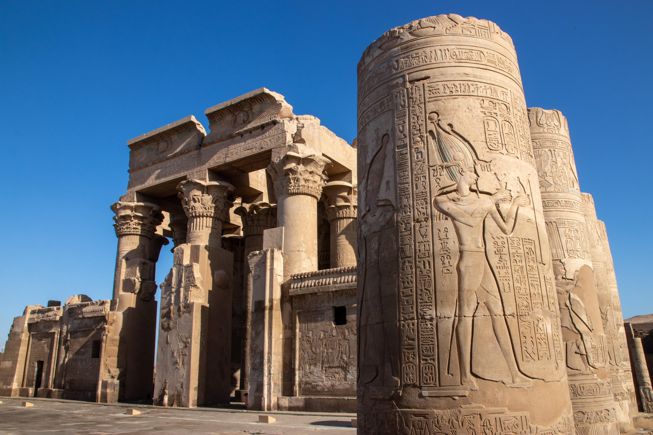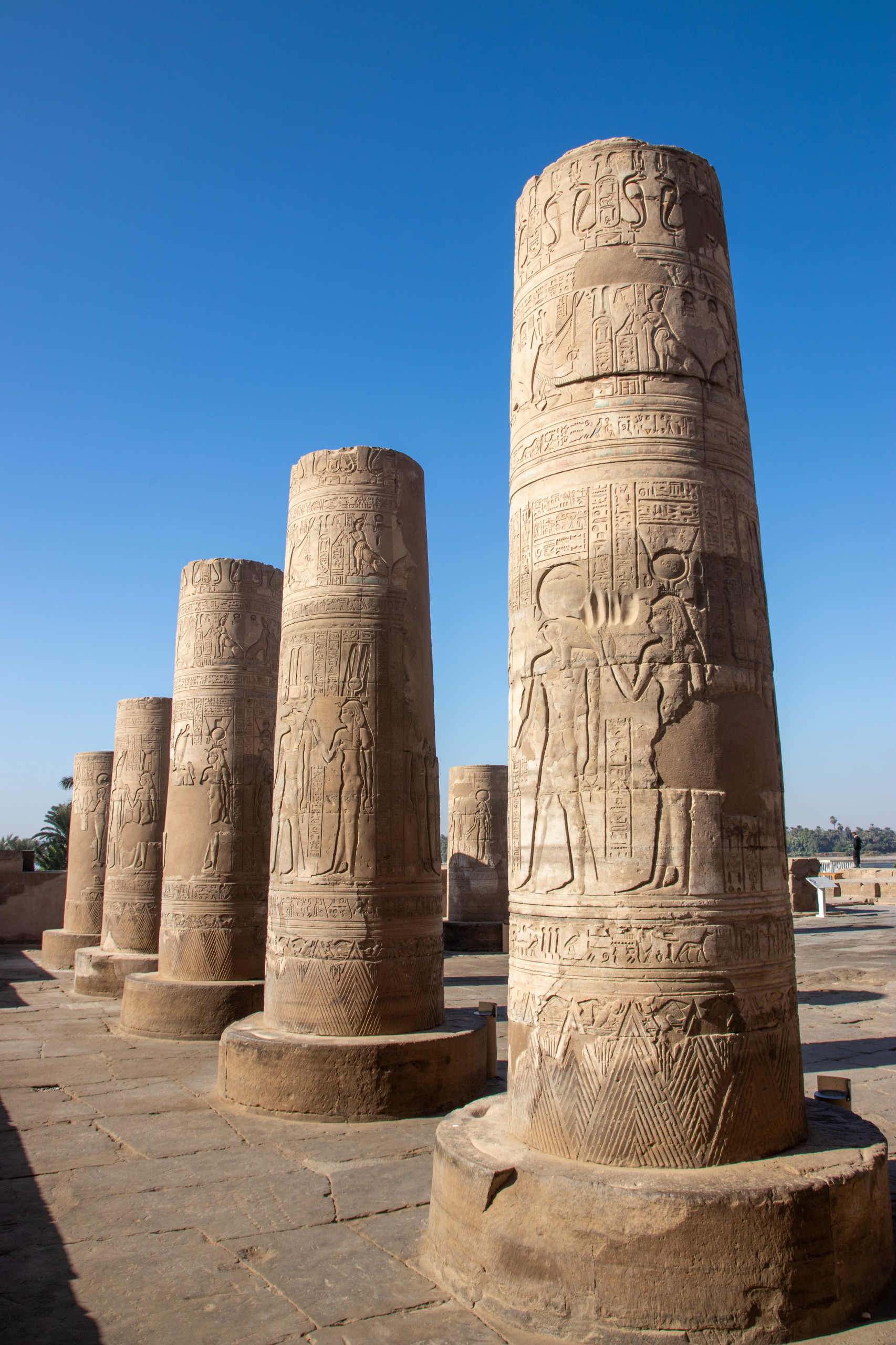 Nach dem üblichen Frühstück starte ich mit dem gestern bestellten Taxi in Richtung Norden los, immer östlich dem Nil entlang. Fares und ich unterhalten uns prächtig während der Fahrt und kurz vor Kom Ombo sehen wir sogar einen ägyptischen Schakal auf der Straße hüpfen. Er schaut etwas verwirrt und macht sich wieder vom Acker. Cool. Unser erster Halt ist der Doppeltempel von Kom Ombo, der mit seinen riesigen Säulen sehr beeindruckend ist und ganz anders aussieht als die bereits besuchten. Das Krokodilmuseum, das sich ebenfalls am Gelände befindet ist auch ganz interessant.