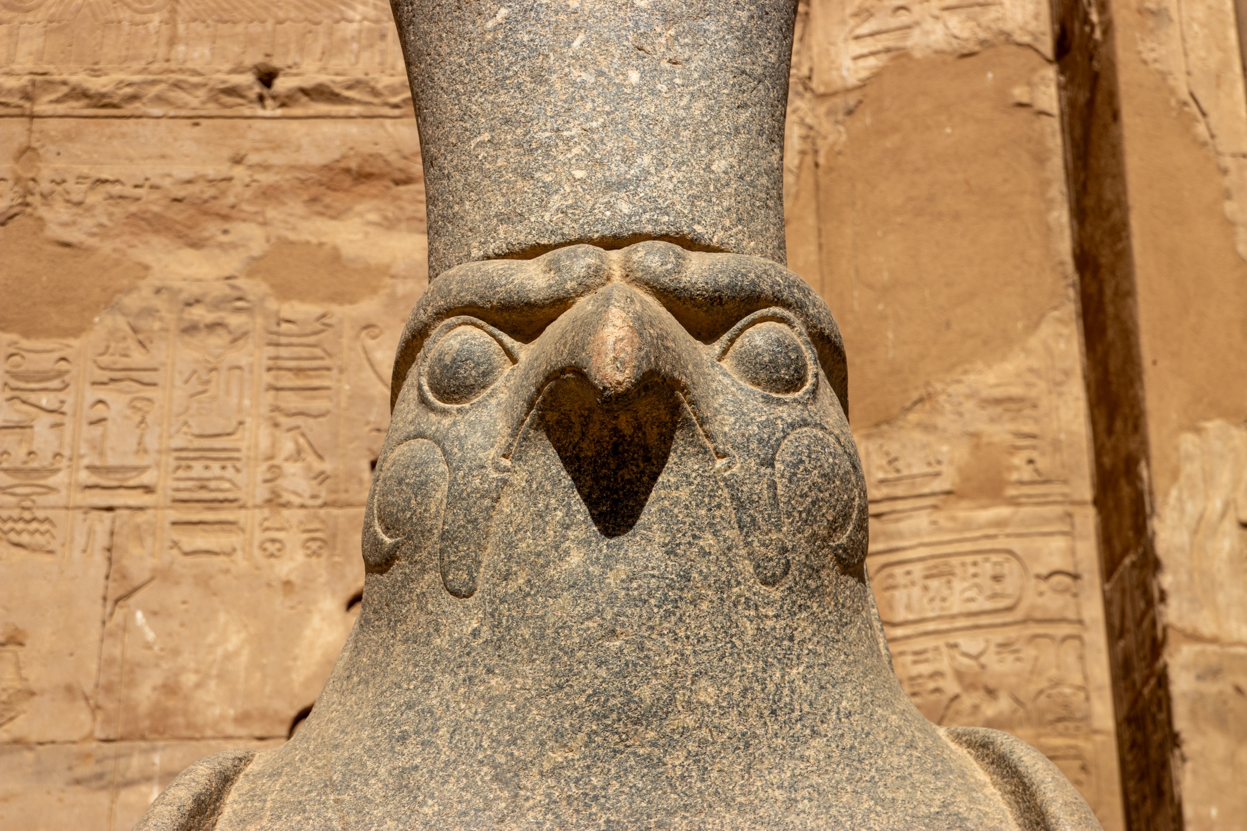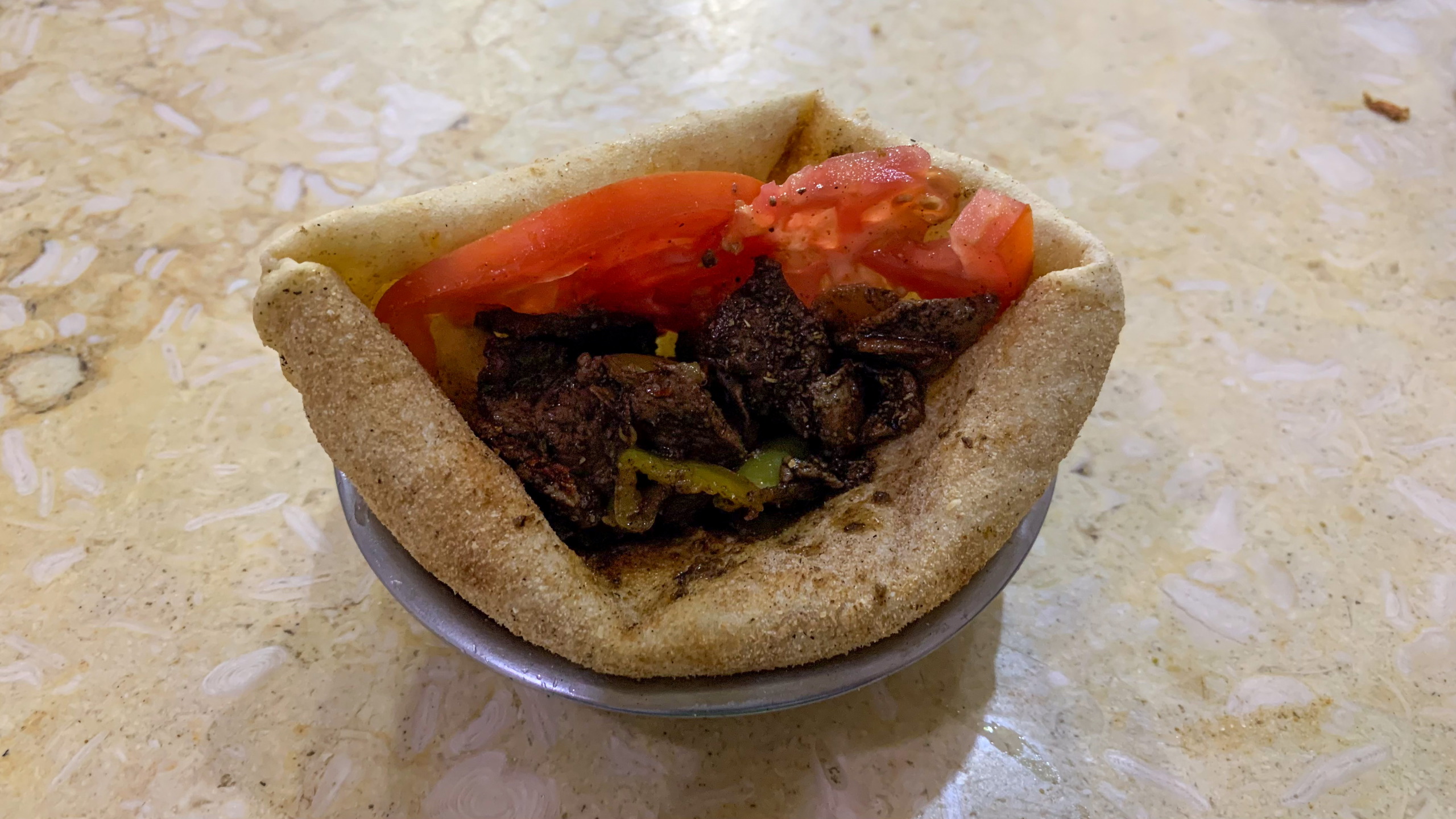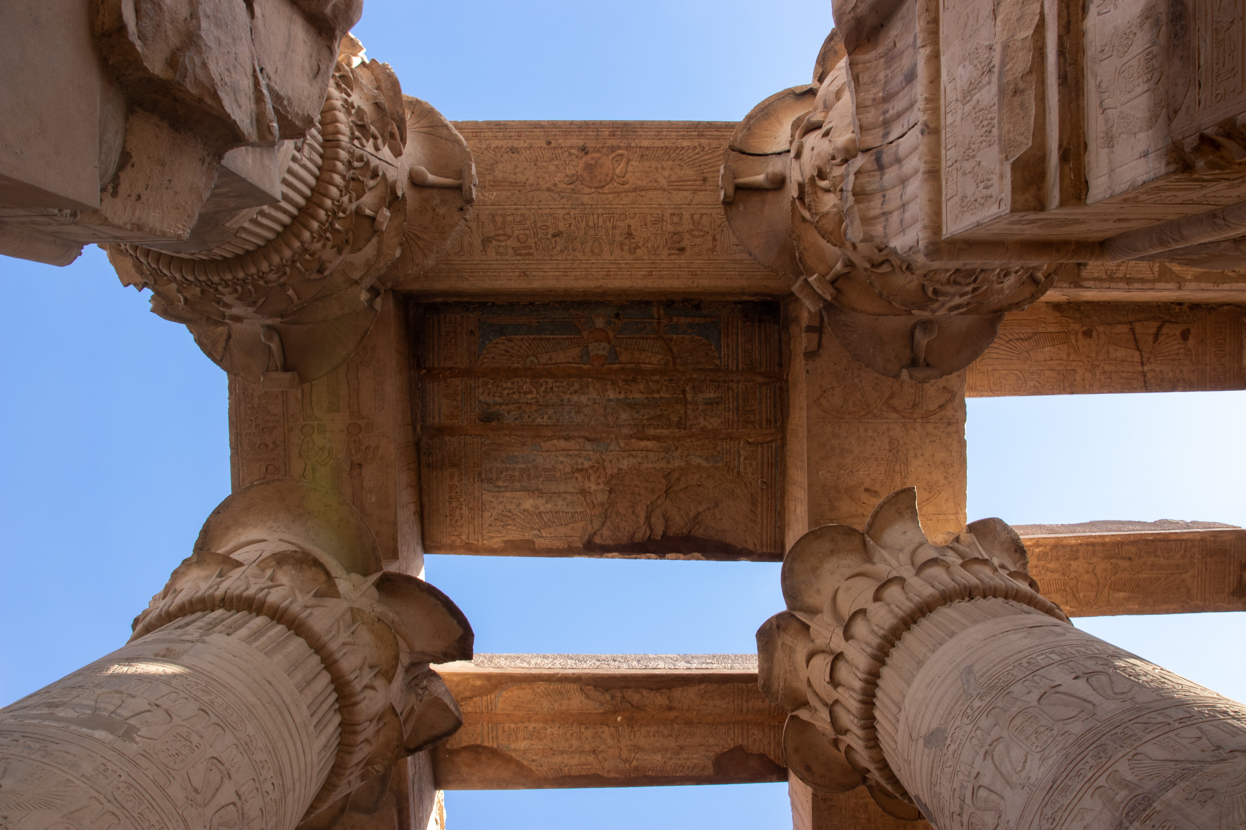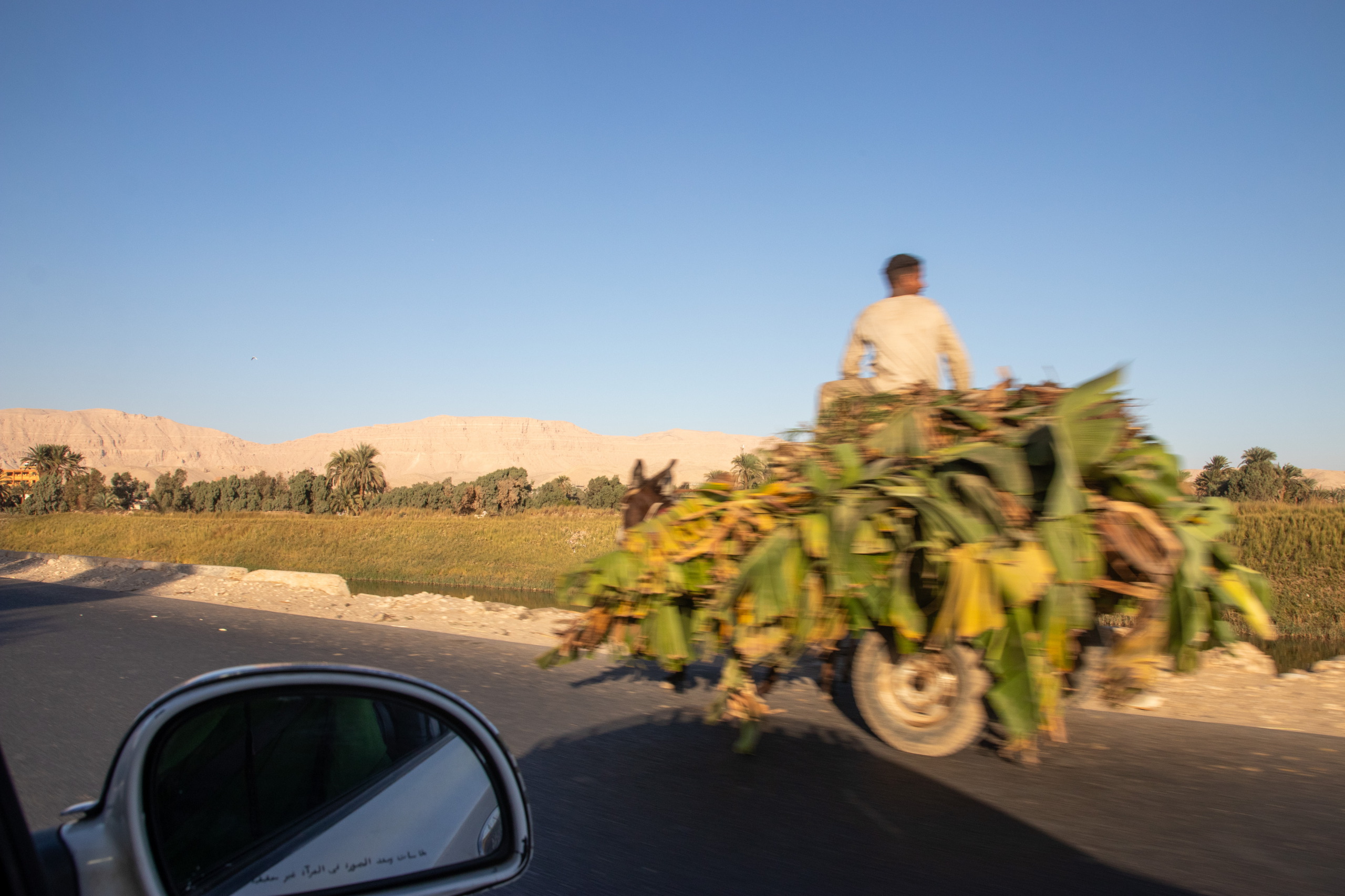 Nach gut eineinhalb Stunden Fahrt erreichen wir den Tempel von Edfu, in no na Edfu. 😁 Dieser ist fast noch beeindruckender und auch hier sind noch Teile der Decke mit erhaltener Farbe zu bewundern. Nach einer ausgiebigen Inspektionsrunde, mime ich wieder einmal den Fotografen und gehe zum Café, in dem Fares auf mich wartet. Zumindest war das so abgemacht. Er ist nicht da. Mist. Ich sehe mich ein wenig um und entdecke ihn ein Café weiter. Perfekt. Und schon düsen wir weiter. Hunger. Wir stoppen kurz und Fares organisiert Brot mit Rinderherz und Hawawshi mit Fleisch. Beides schmeckt mega gut und soll natürlich extrem gut für den Körper sein und viel Kraft geben.