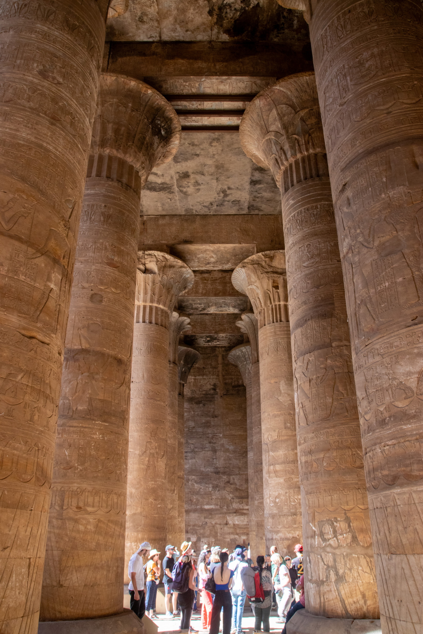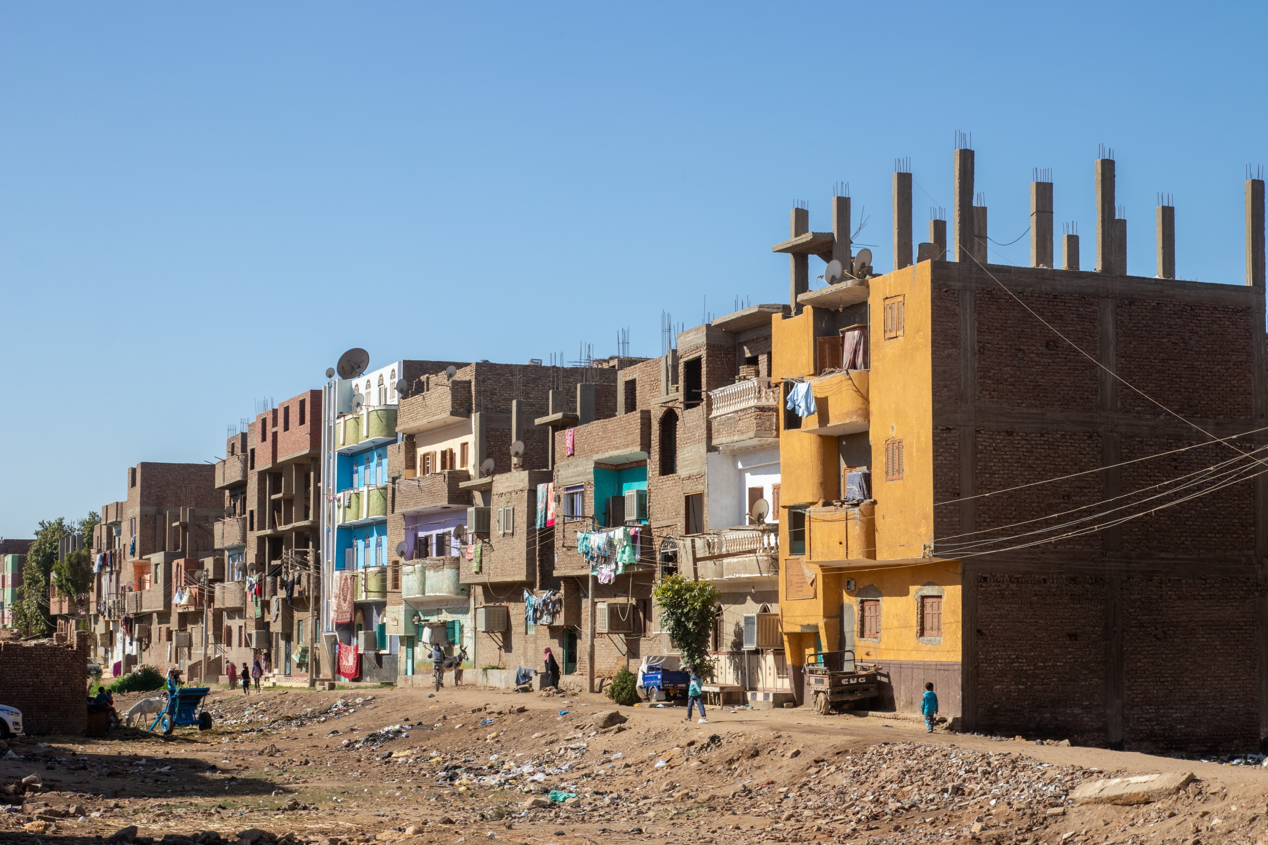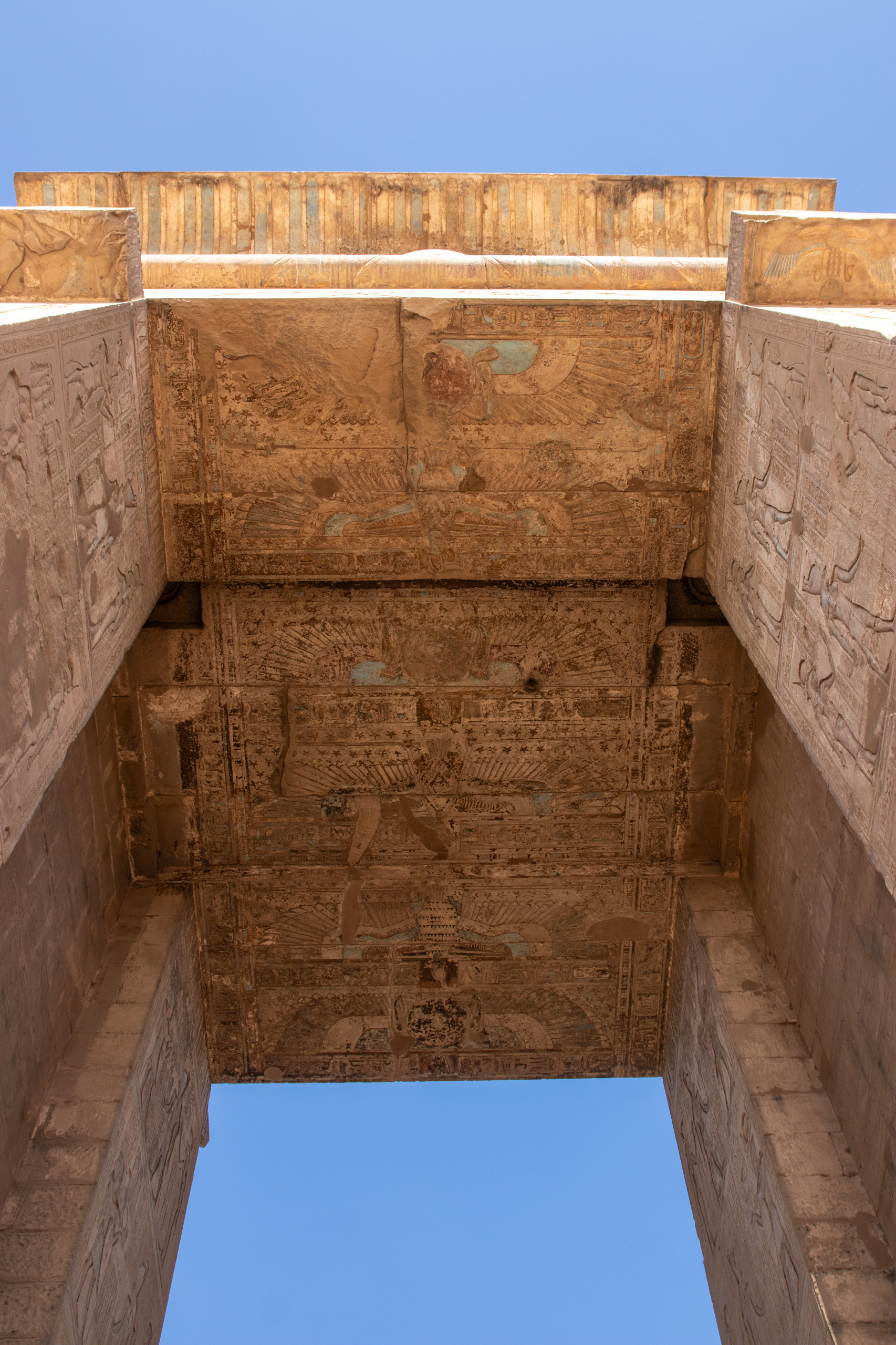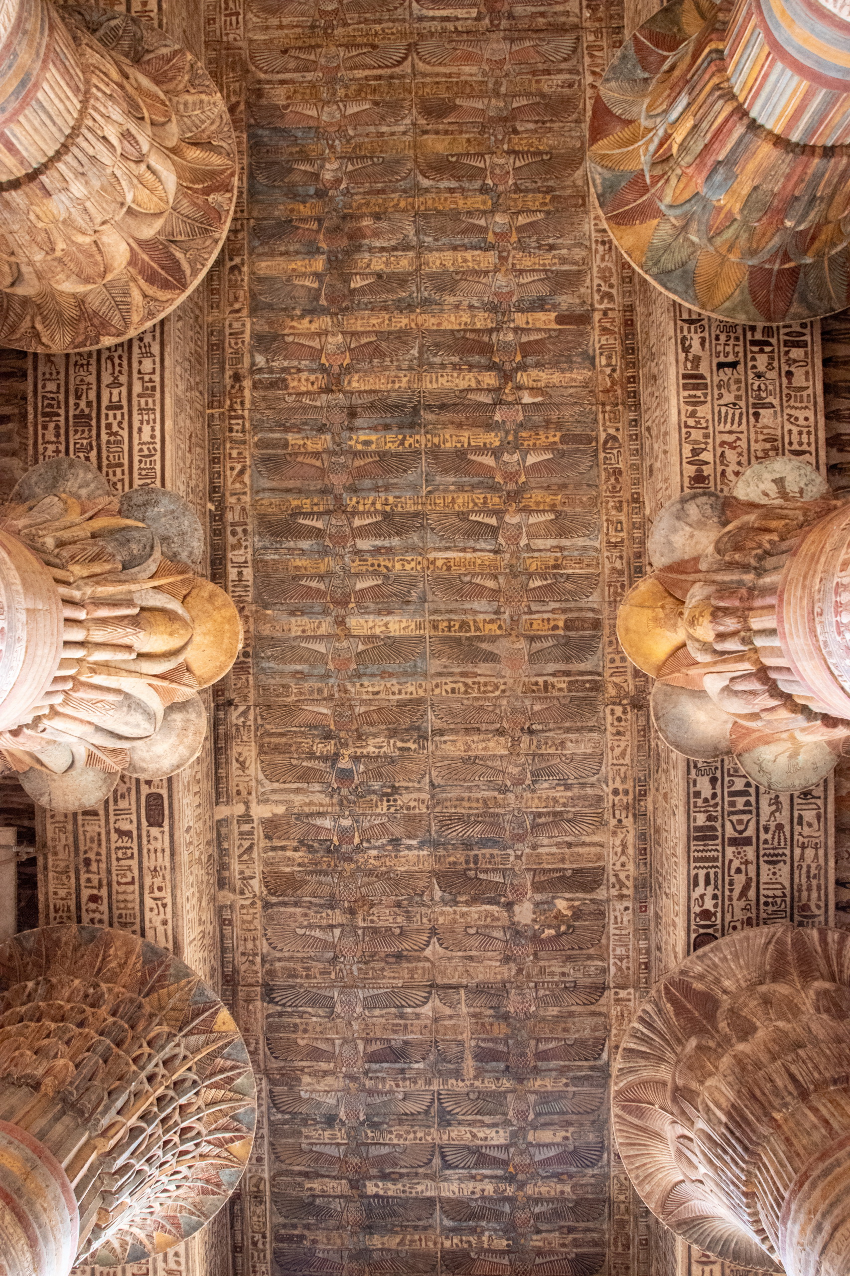 Nach gut eineinhalb Stunden Fahrt erreichen wir den Tempel von Edfu, in no na Edfu. 😁 Dieser ist fast noch beeindruckender und auch hier sind noch Teile der Decke mit erhaltener Farbe zu bewundern. Nach einer ausgiebigen Inspektionsrunde, mime ich wieder einmal den Fotografen und gehe zum Café, in dem Fares auf mich wartet. Zumindest war das so abgemacht. Er ist nicht da. Mist. Ich sehe mich ein wenig um und entdecke ihn ein Café weiter. Perfekt. Und schon düsen wir weiter. Hunger. Wir stoppen kurz und Fares organisiert Brot mit Rinderherz und Hawawshi mit Fleisch. Beides schmeckt mega gut und soll natürlich extrem gut für den Körper sein und viel Kraft geben.