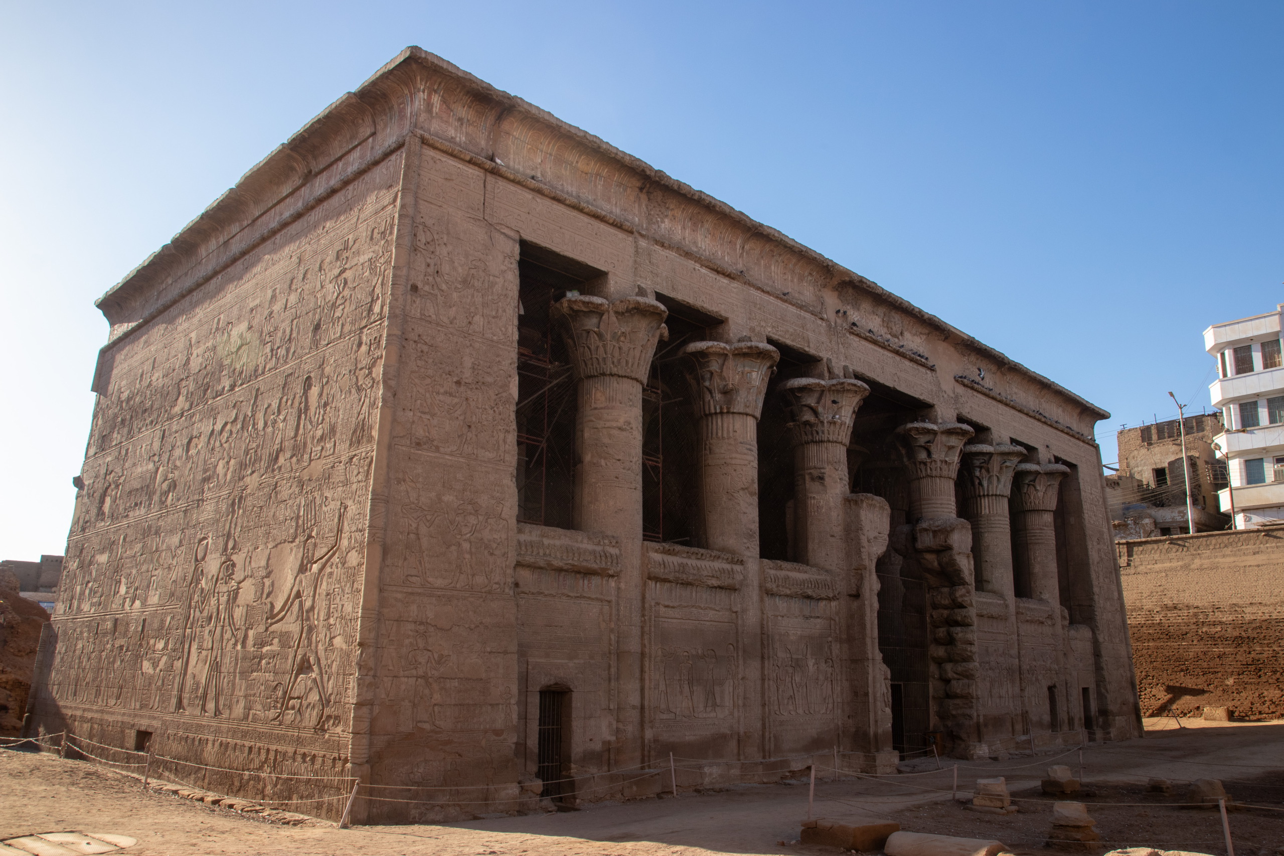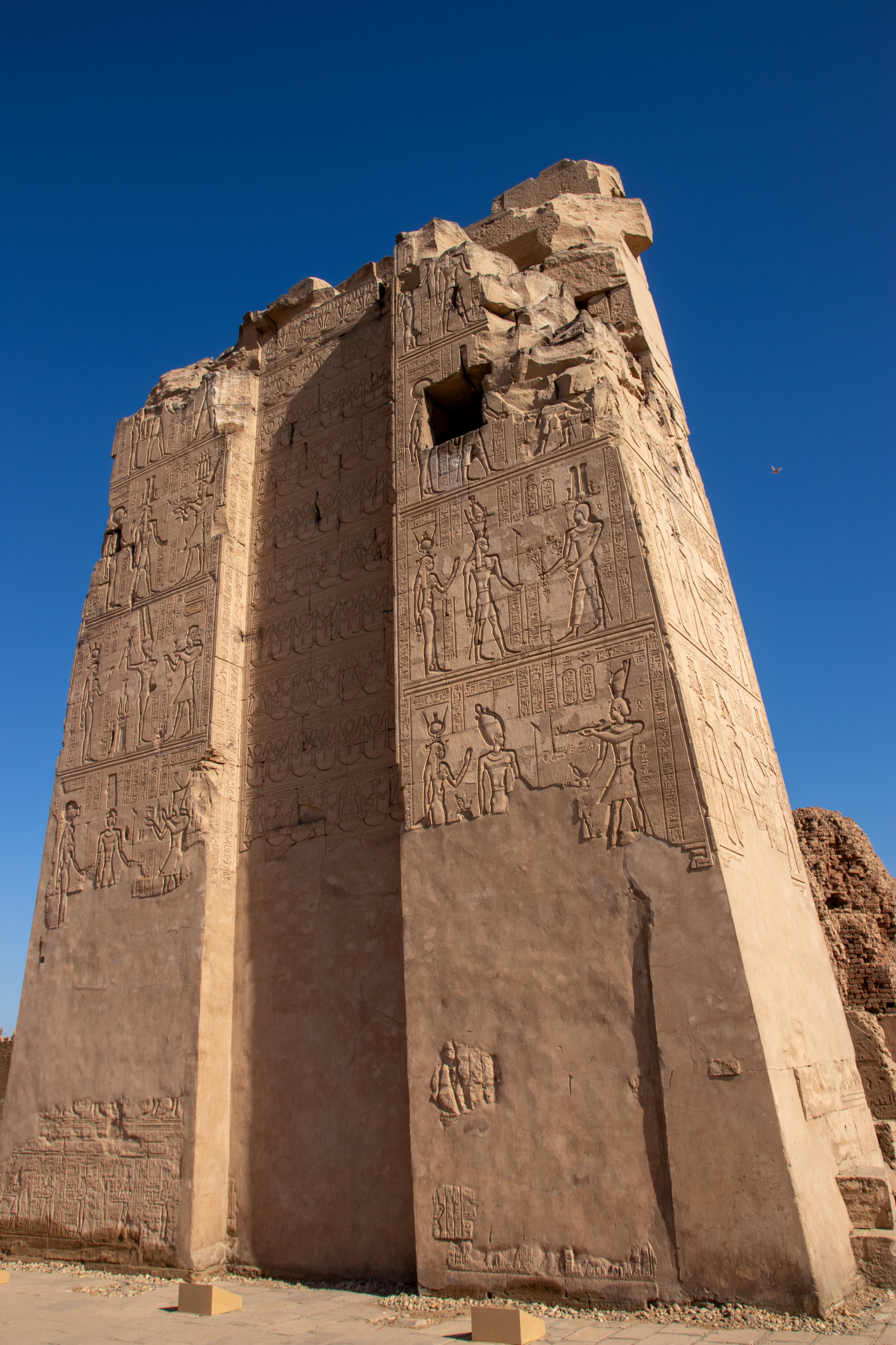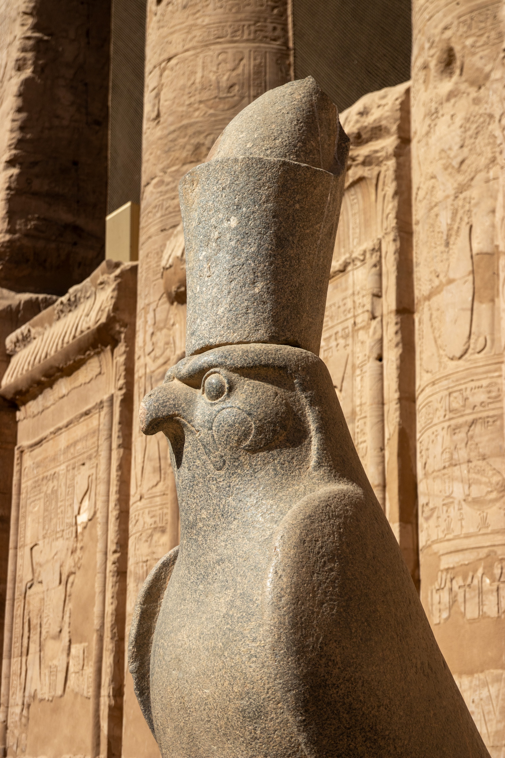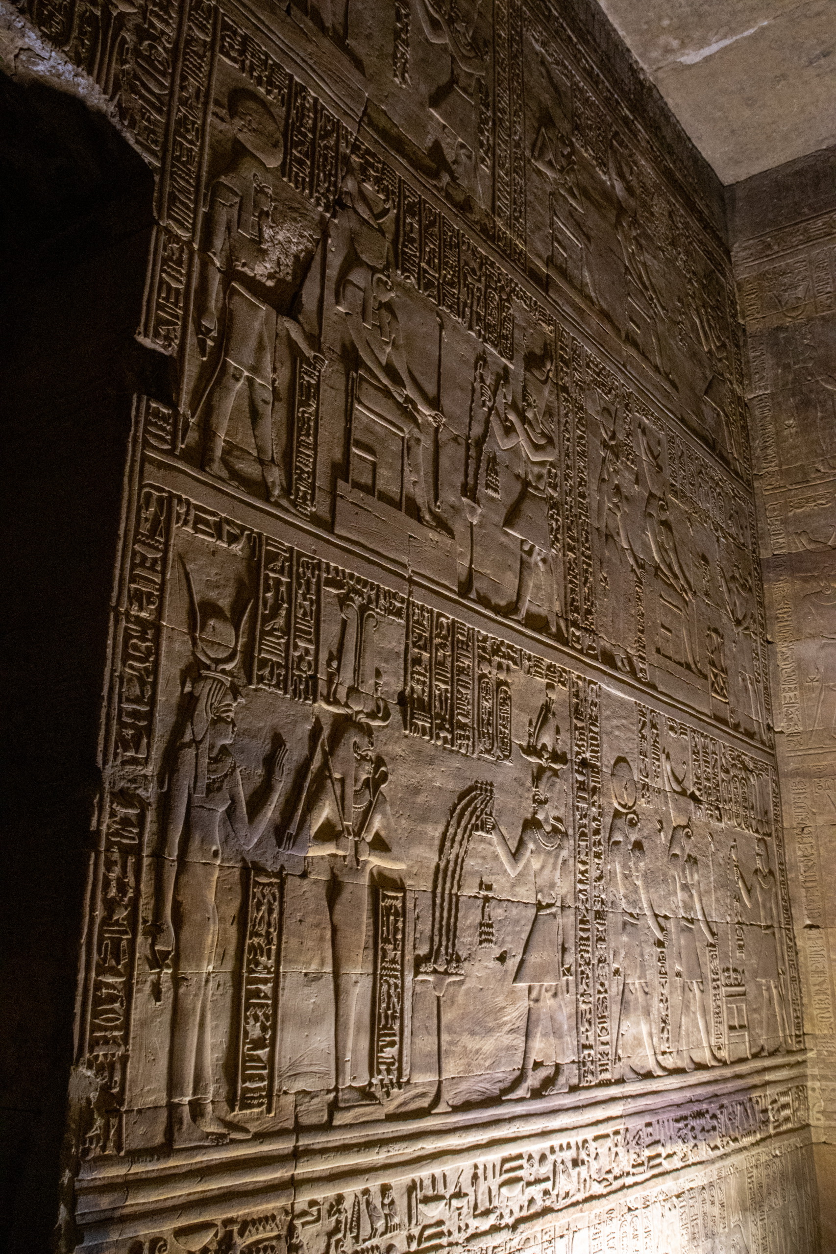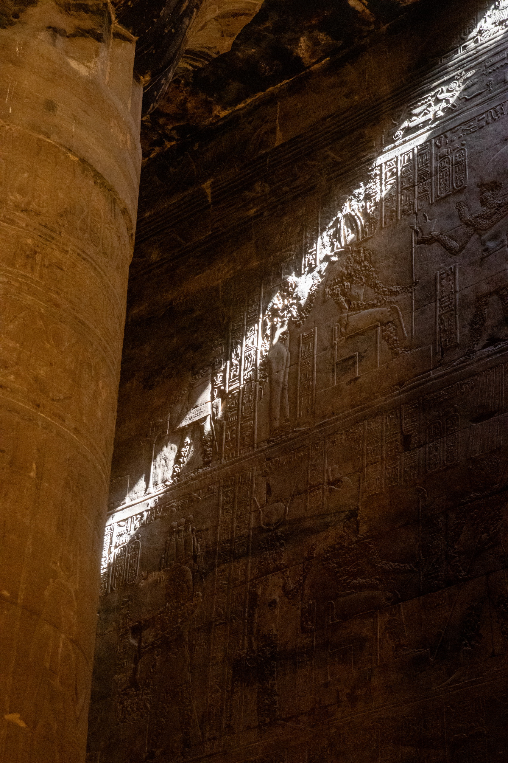 Nach gut eineinhalb Stunden Fahrt erreichen wir den Tempel von Edfu, in no na Edfu. 😁 Dieser ist fast noch beeindruckender und auch hier sind noch Teile der Decke mit erhaltener Farbe zu bewundern. Nach einer ausgiebigen Inspektionsrunde, mime ich wieder einmal den Fotografen und gehe zum Café, in dem Fares auf mich wartet. Zumindest war das so abgemacht. Er ist nicht da. Mist. Ich sehe mich ein wenig um und entdecke ihn ein Café weiter. Perfekt. Und schon düsen wir weiter. Hunger. Wir stoppen kurz und Fares organisiert Brot mit Rinderherz und Hawawshi mit Fleisch. Beides schmeckt mega gut und soll natürlich extrem gut für den Körper sein und viel Kraft geben.