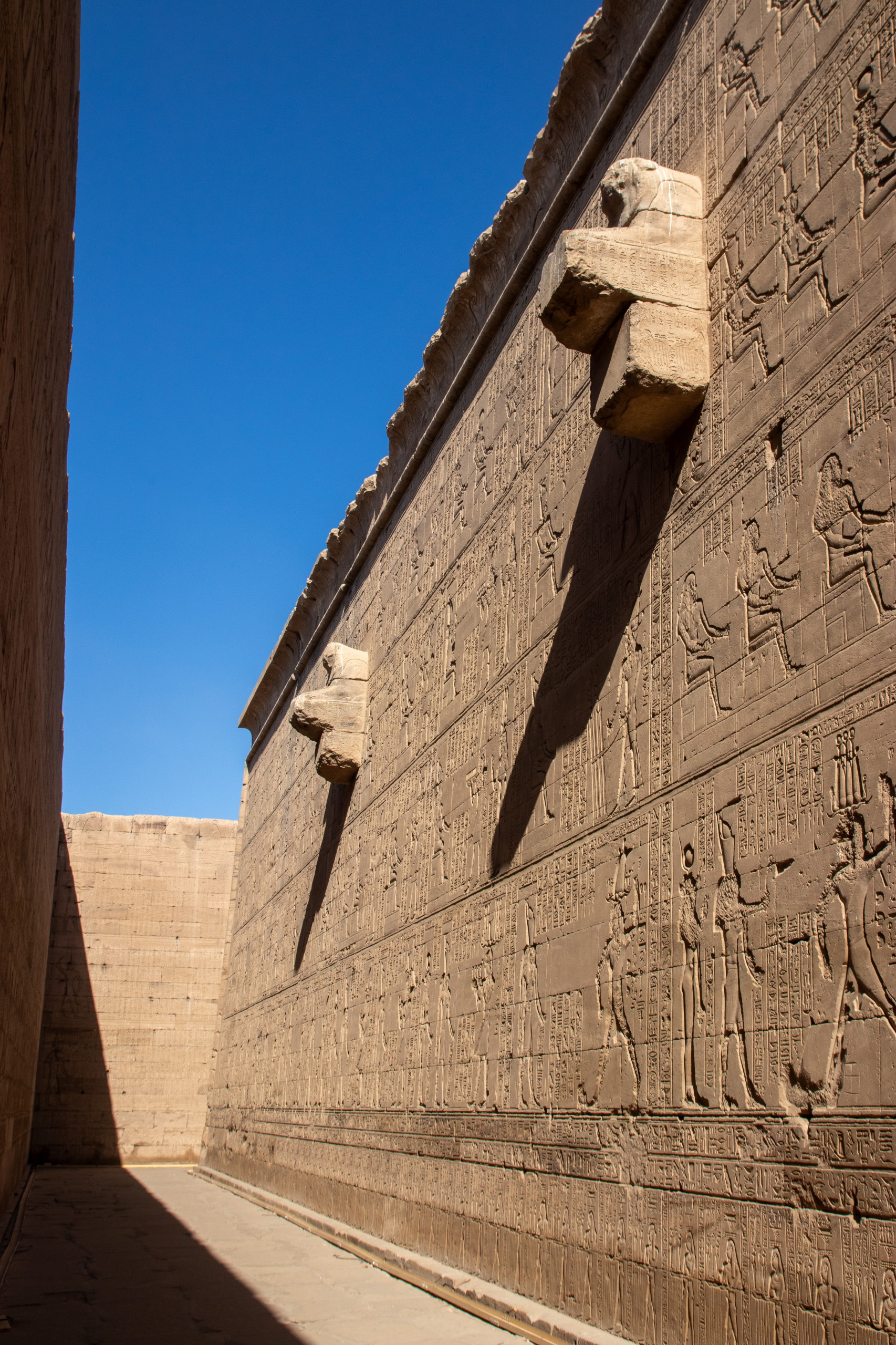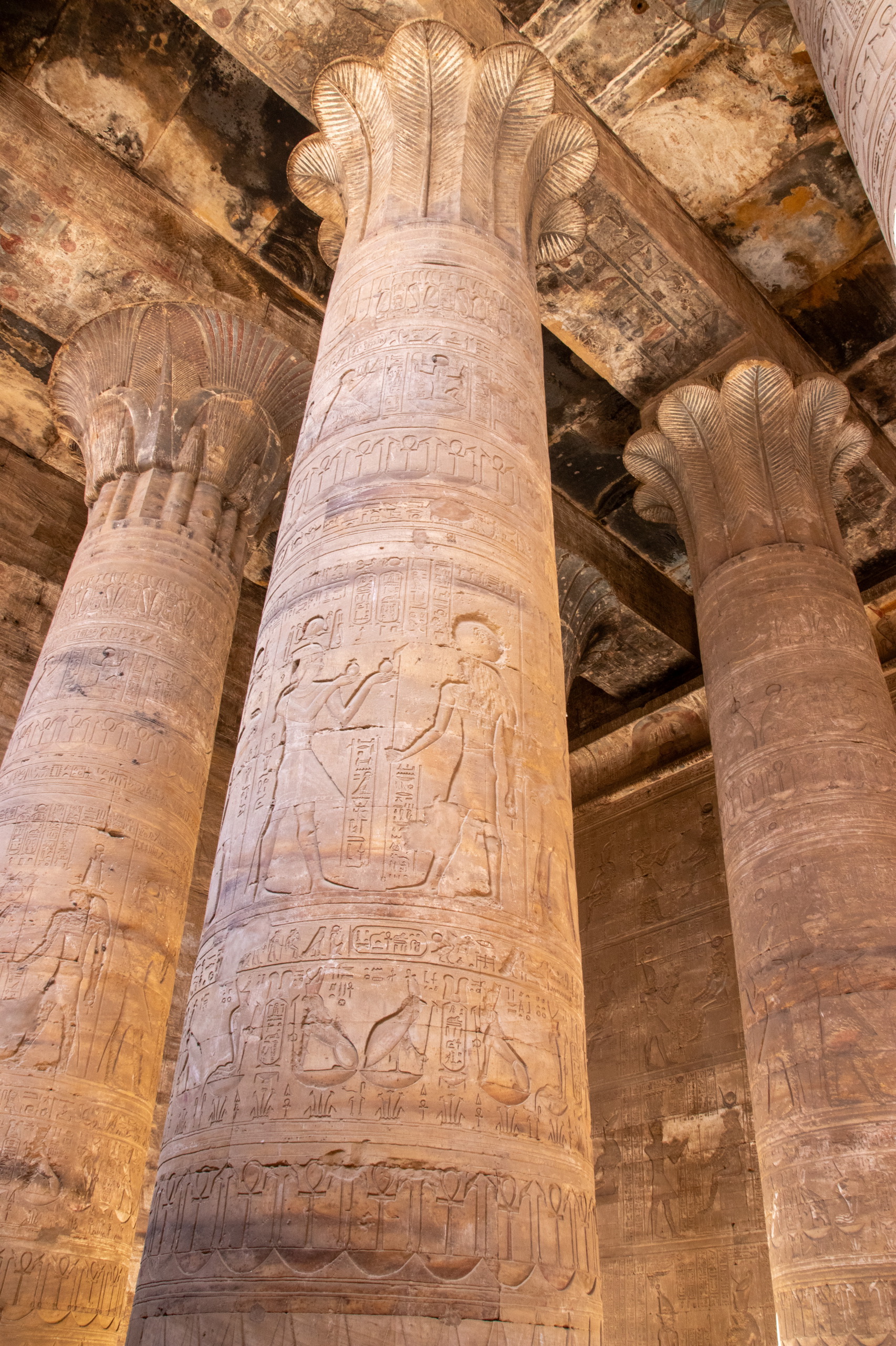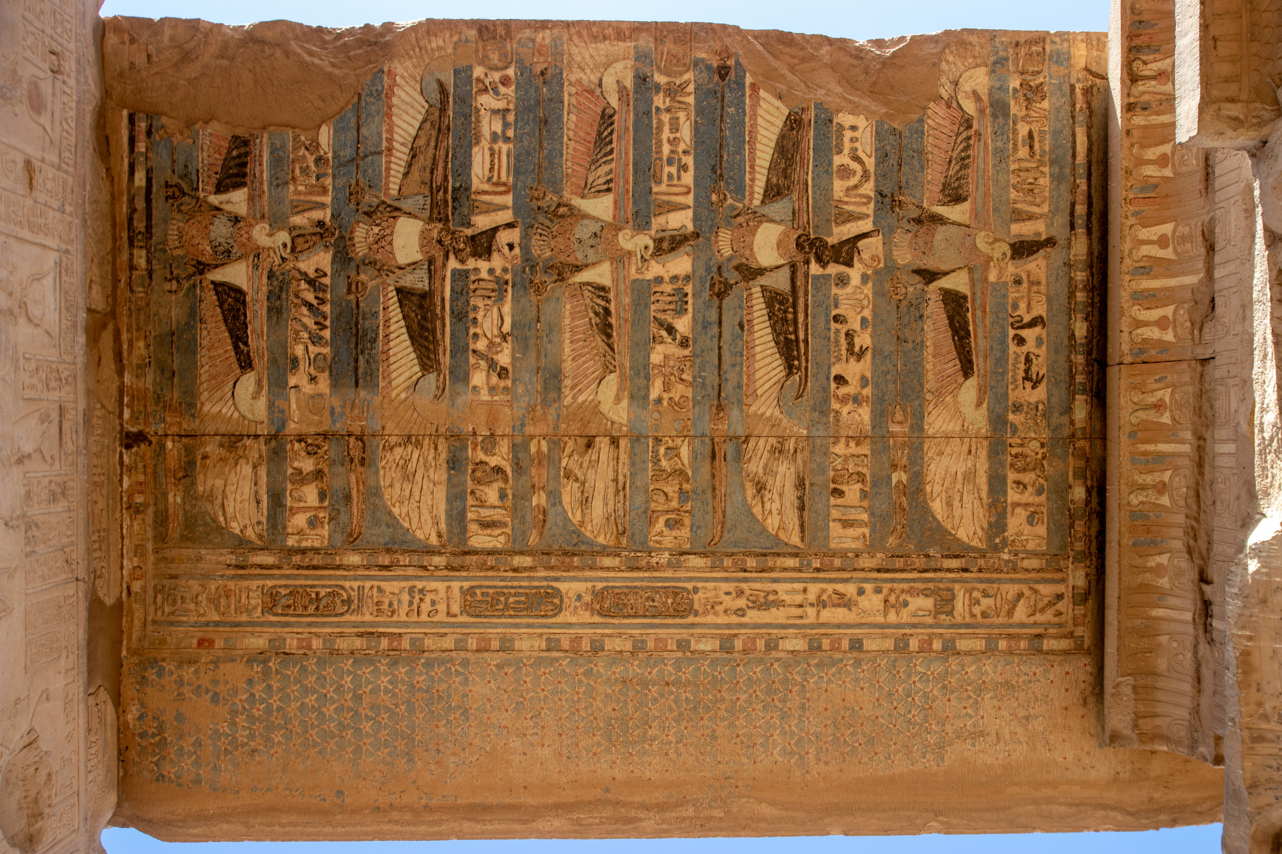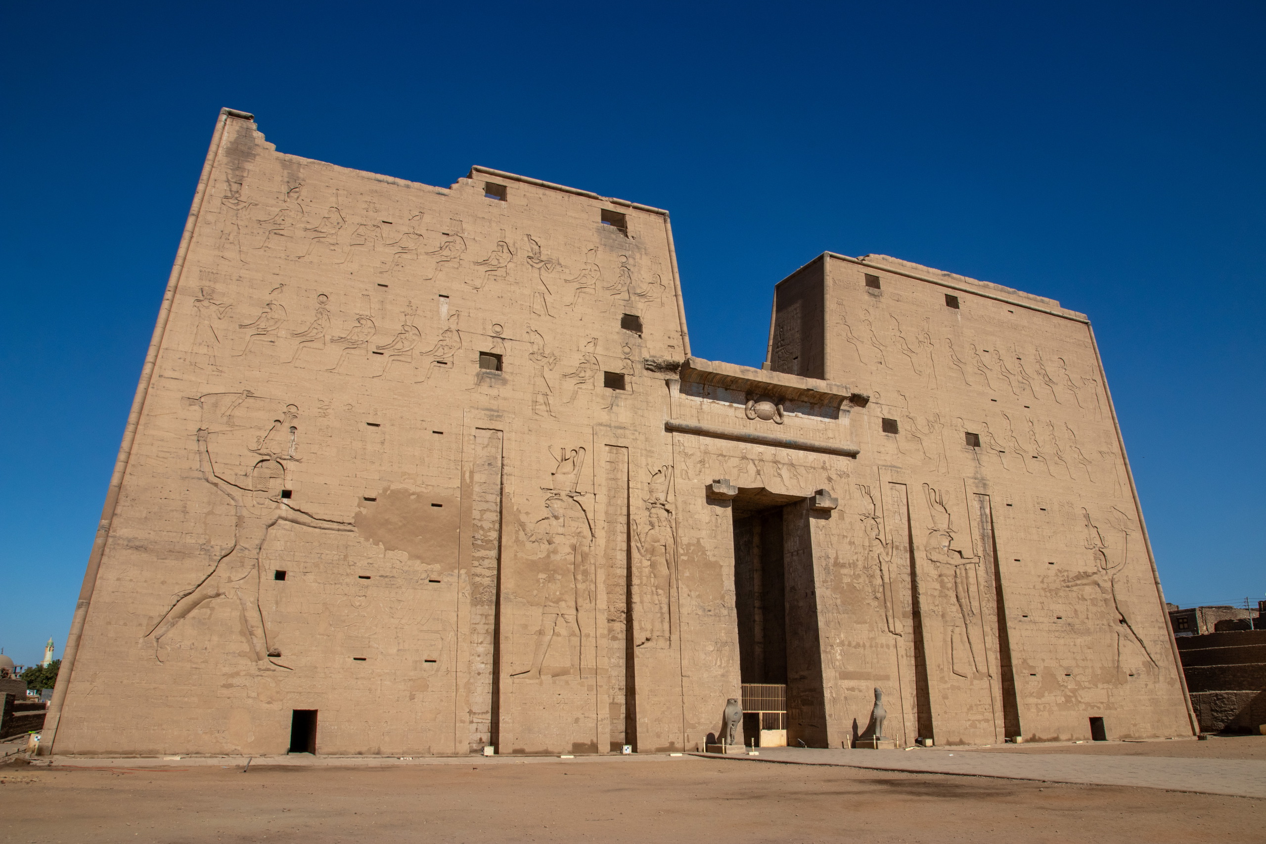 Nach gut eineinhalb Stunden Fahrt erreichen wir den Tempel von Edfu, in no na Edfu. 😁 Dieser ist fast noch beeindruckender und auch hier sind noch Teile der Decke mit erhaltener Farbe zu bewundern. Nach einer ausgiebigen Inspektionsrunde, mime ich wieder einmal den Fotografen und gehe zum Café, in dem Fares auf mich wartet. Zumindest war das so abgemacht. Er ist nicht da. Mist. Ich sehe mich ein wenig um und entdecke ihn ein Café weiter. Perfekt. Und schon düsen wir weiter. Hunger. Wir stoppen kurz und Fares organisiert Brot mit Rinderherz und Hawawshi mit Fleisch. Beides schmeckt mega gut und soll natürlich extrem gut für den Körper sein und viel Kraft geben.