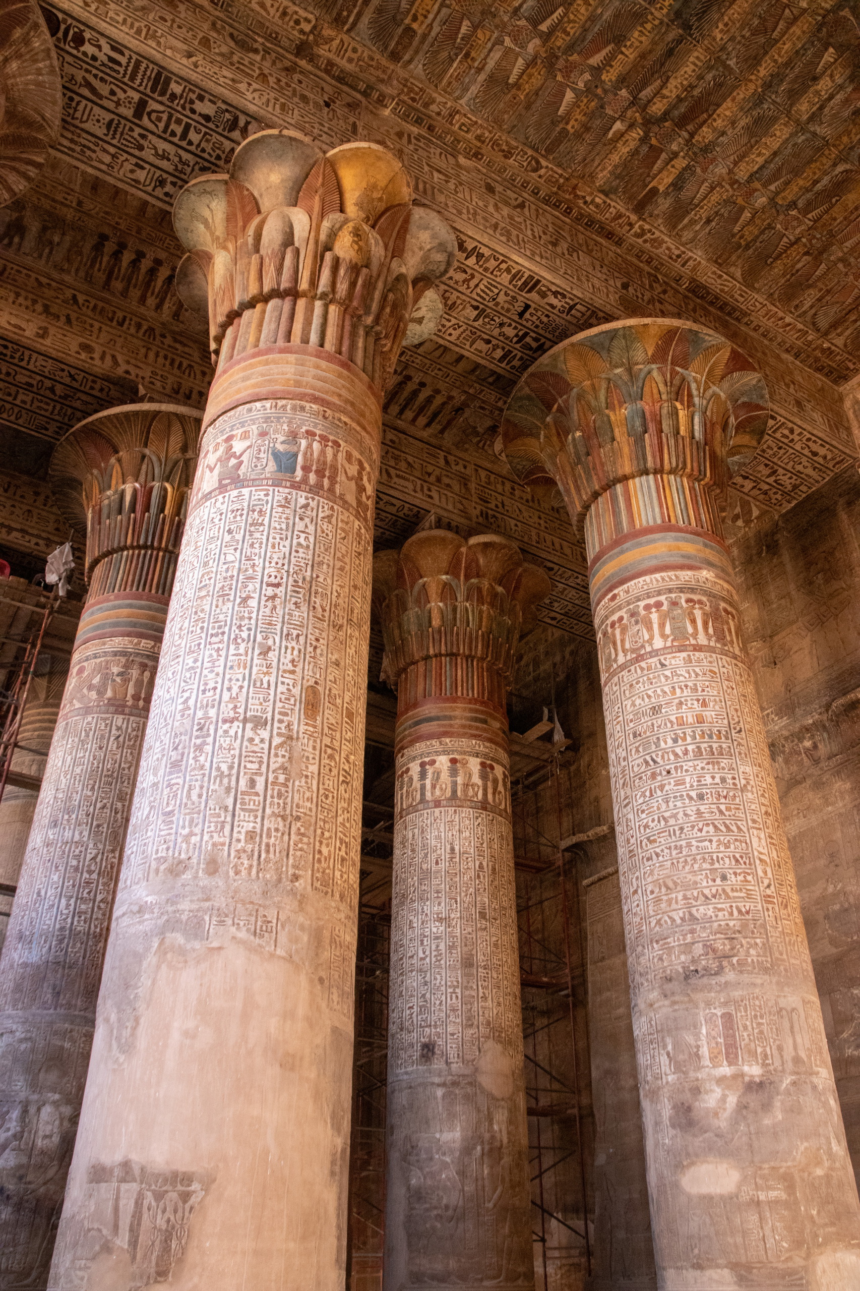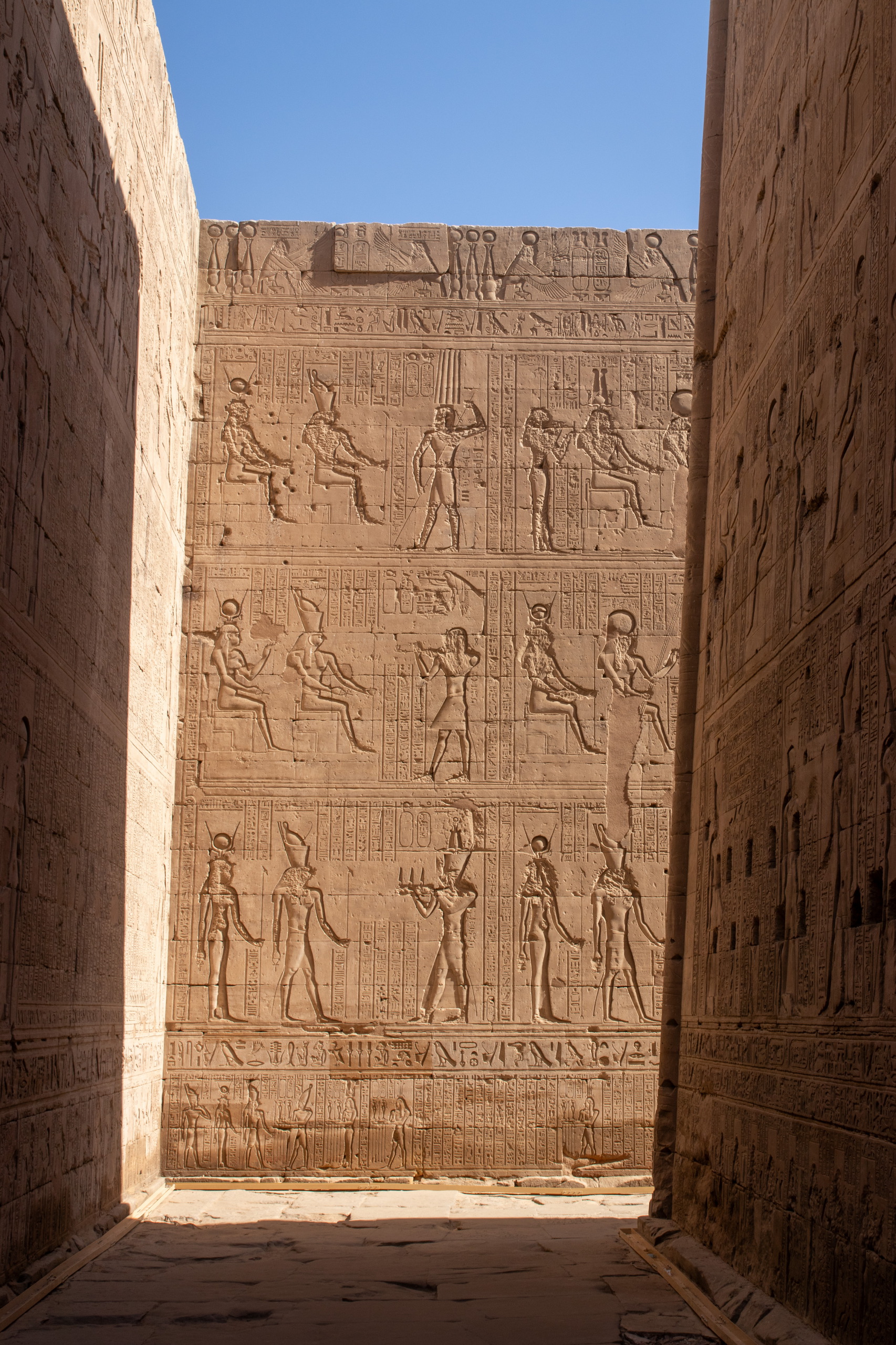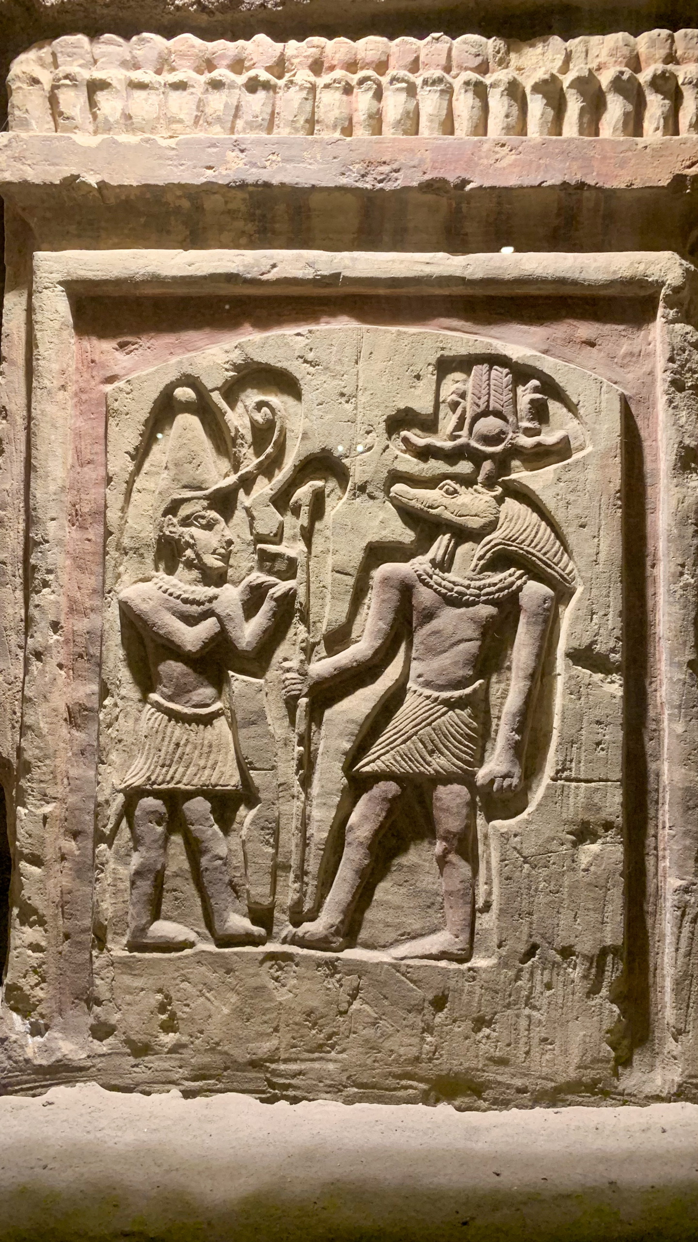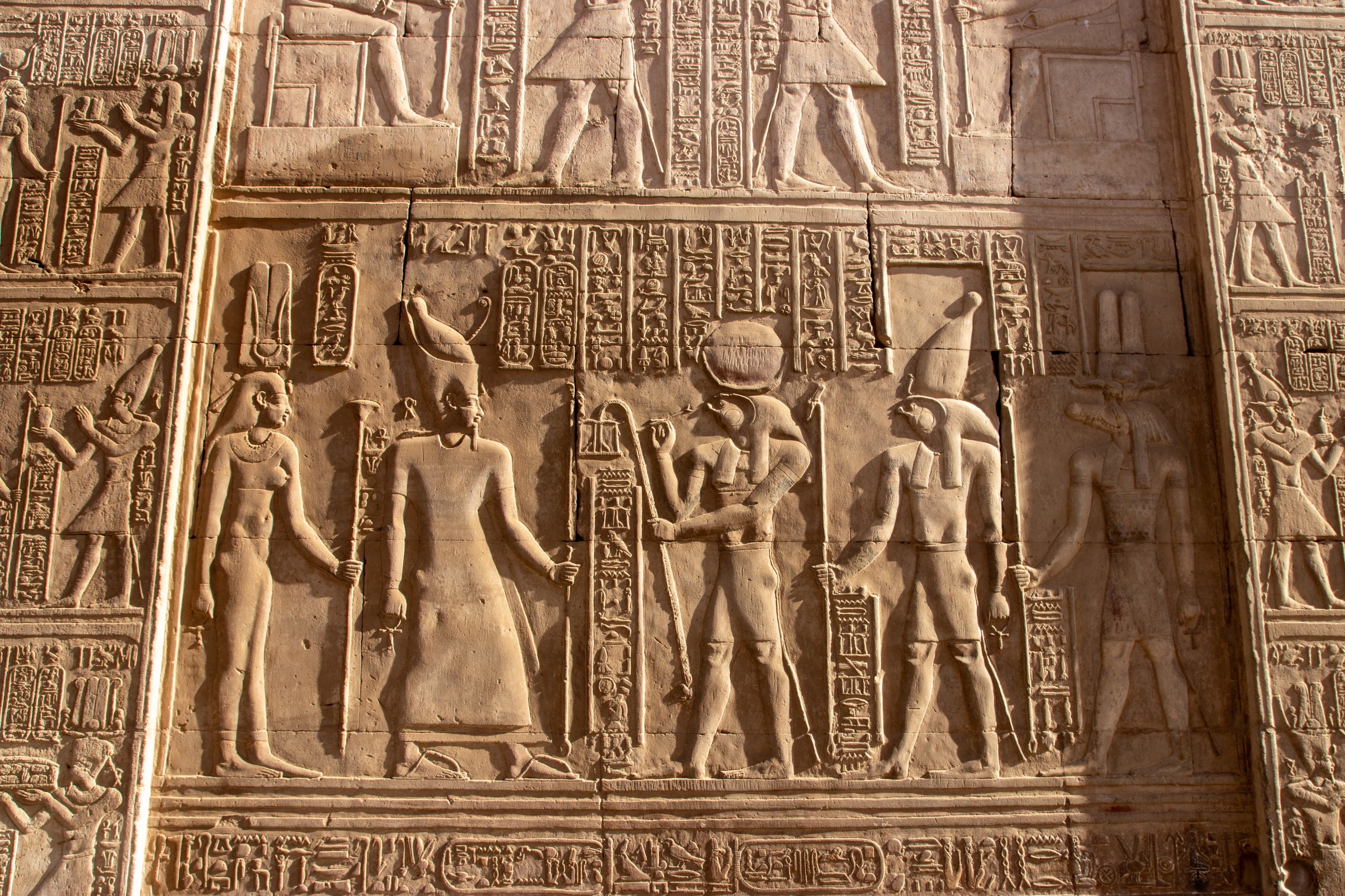 Nach gut eineinhalb Stunden Fahrt erreichen wir den Tempel von Edfu, in no na Edfu. 😁 Dieser ist fast noch beeindruckender und auch hier sind noch Teile der Decke mit erhaltener Farbe zu bewundern. Nach einer ausgiebigen Inspektionsrunde, mime ich wieder einmal den Fotografen und gehe zum Café, in dem Fares auf mich wartet. Zumindest war das so abgemacht. Er ist nicht da. Mist. Ich sehe mich ein wenig um und entdecke ihn ein Café weiter. Perfekt. Und schon düsen wir weiter. Hunger. Wir stoppen kurz und Fares organisiert Brot mit Rinderherz und Hawawshi mit Fleisch. Beides schmeckt mega gut und soll natürlich extrem gut für den Körper sein und viel Kraft geben.