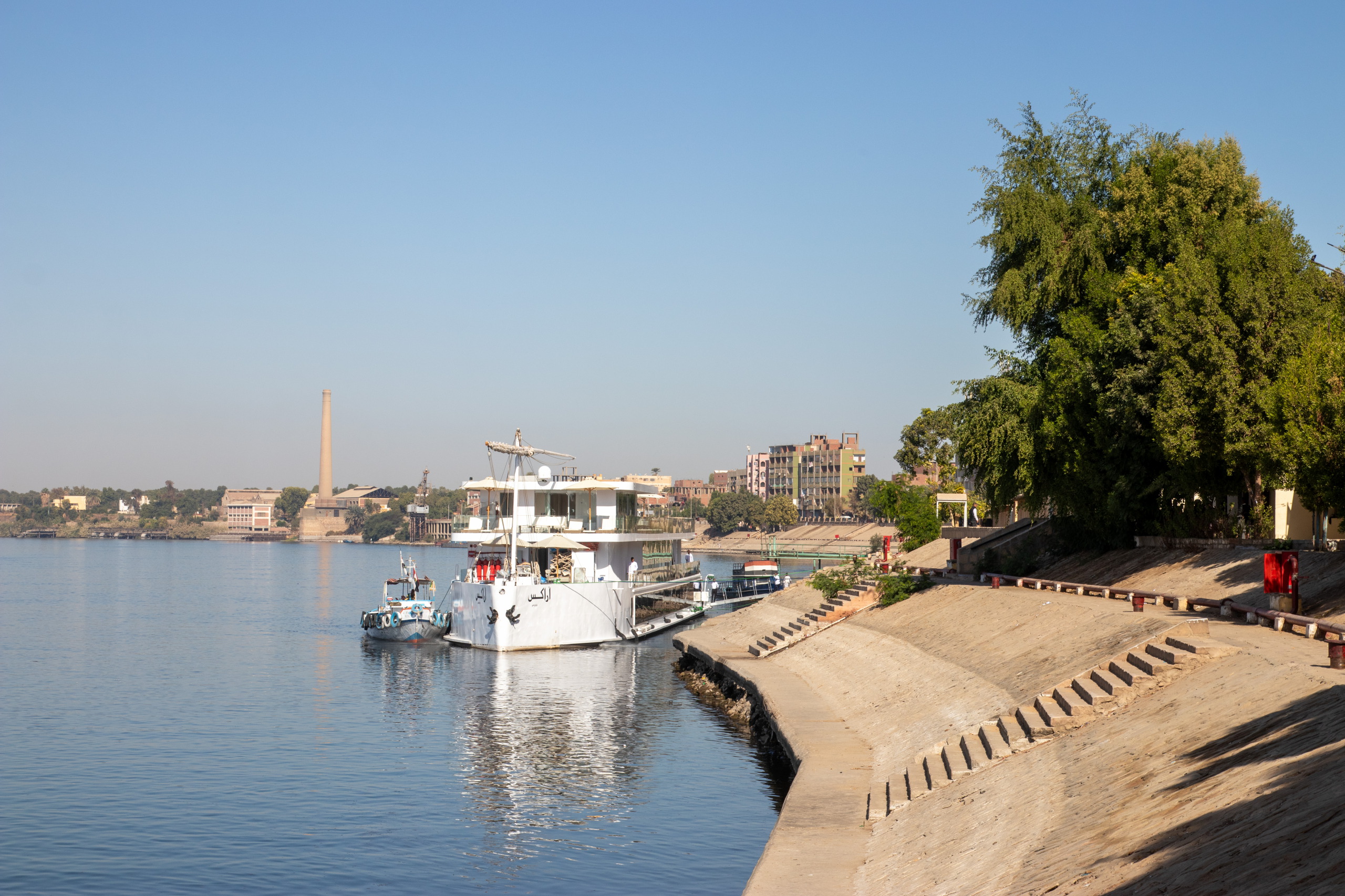 Kurz vor Sonnenuntergang erreichen wir das Tagesziel Luxor. Im Windsor Hotel Luxor werde ich sehr nett begrüßt und mit einem kühlem Hibiskustee empfangen. Dann geht es ins riesige Zimmer mit einem Doppel- und einem Einzelbett. OK, das sollte für mich genügen. Luxus in Luxor. 😁 Ich recherchiere ein wenig und verplempere Zeit, bis mich schließlich der Hunger aus dem Hotel treibt.