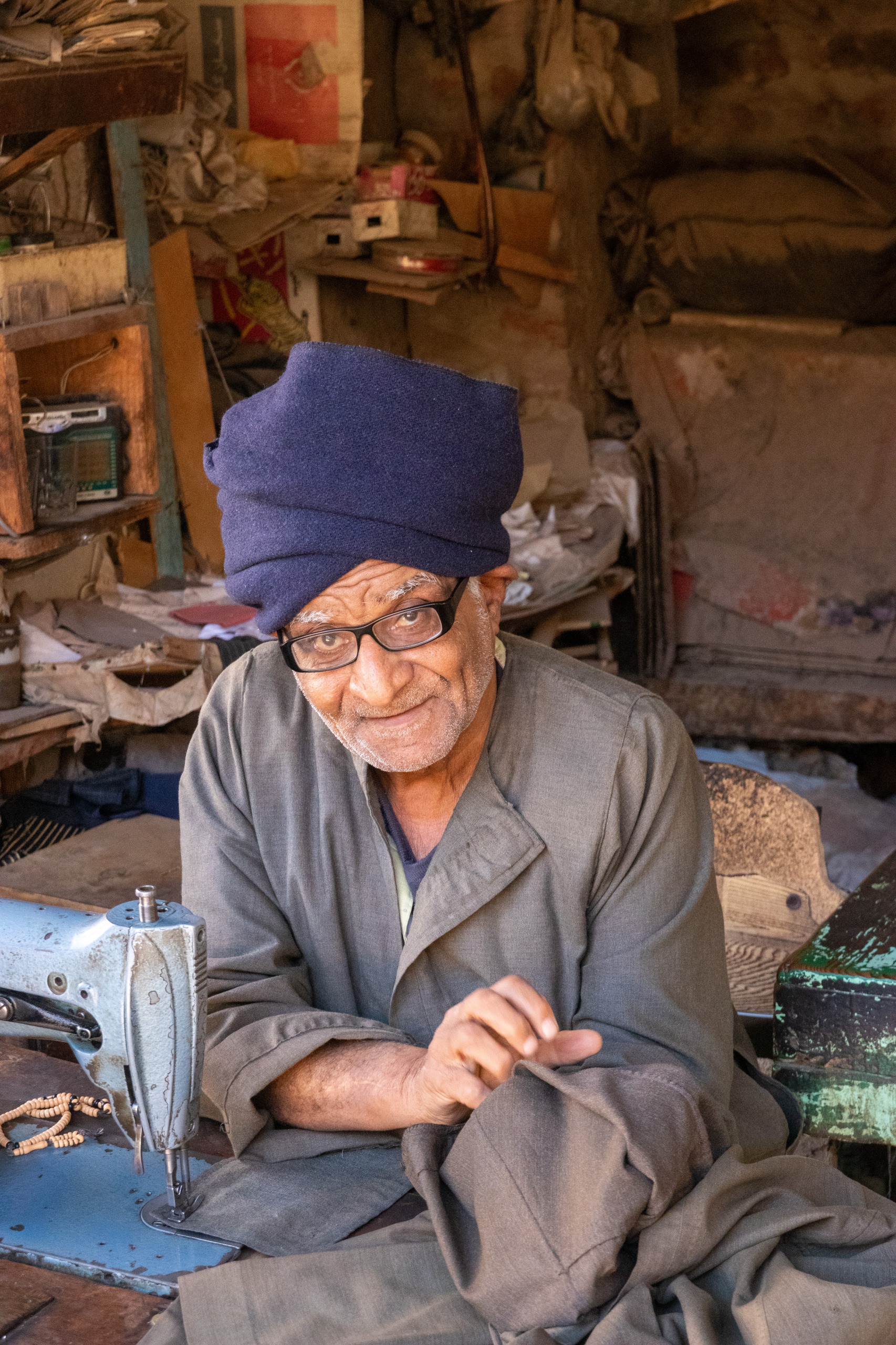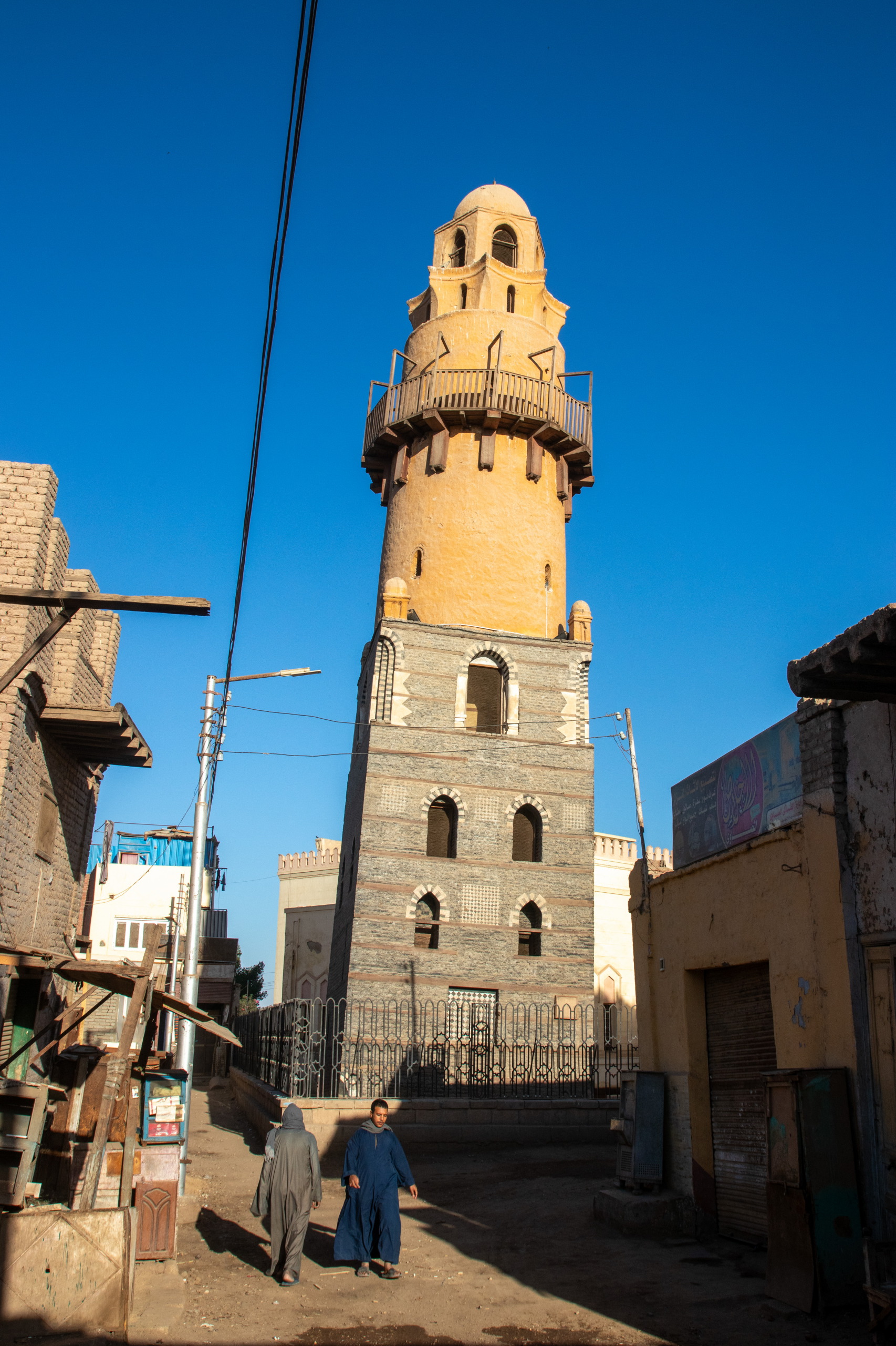 Ohne weitere Komplikationen erreichen wir den Tempel des Khnums in Esna. Dieser ist zwar nicht sehr groß und von außen auch nicht gut erhalten, dafür sind aber die gut erhaltenen Farben an den Säulen und an der Decke umso schöner. Hier bekommt man einen guten Eindruck, wie farbenfroh die Tempelanlagen vor tausenden Jahren ausgesehen haben. Am Rückweg zum Auto entdecke ich einen schönen Turm und höre ein leises Murmeln hinter mir. Ein alter Mann möchte, dass ich ihn fotografiere. Klar, diesmal handelt es sich aber um eine Geschäftsbeziehung. Nur wird nicht der Fotograf bezahlt, sondern das “Model”. OK, ist ja eigentlich auch nicht unüblich. 😀