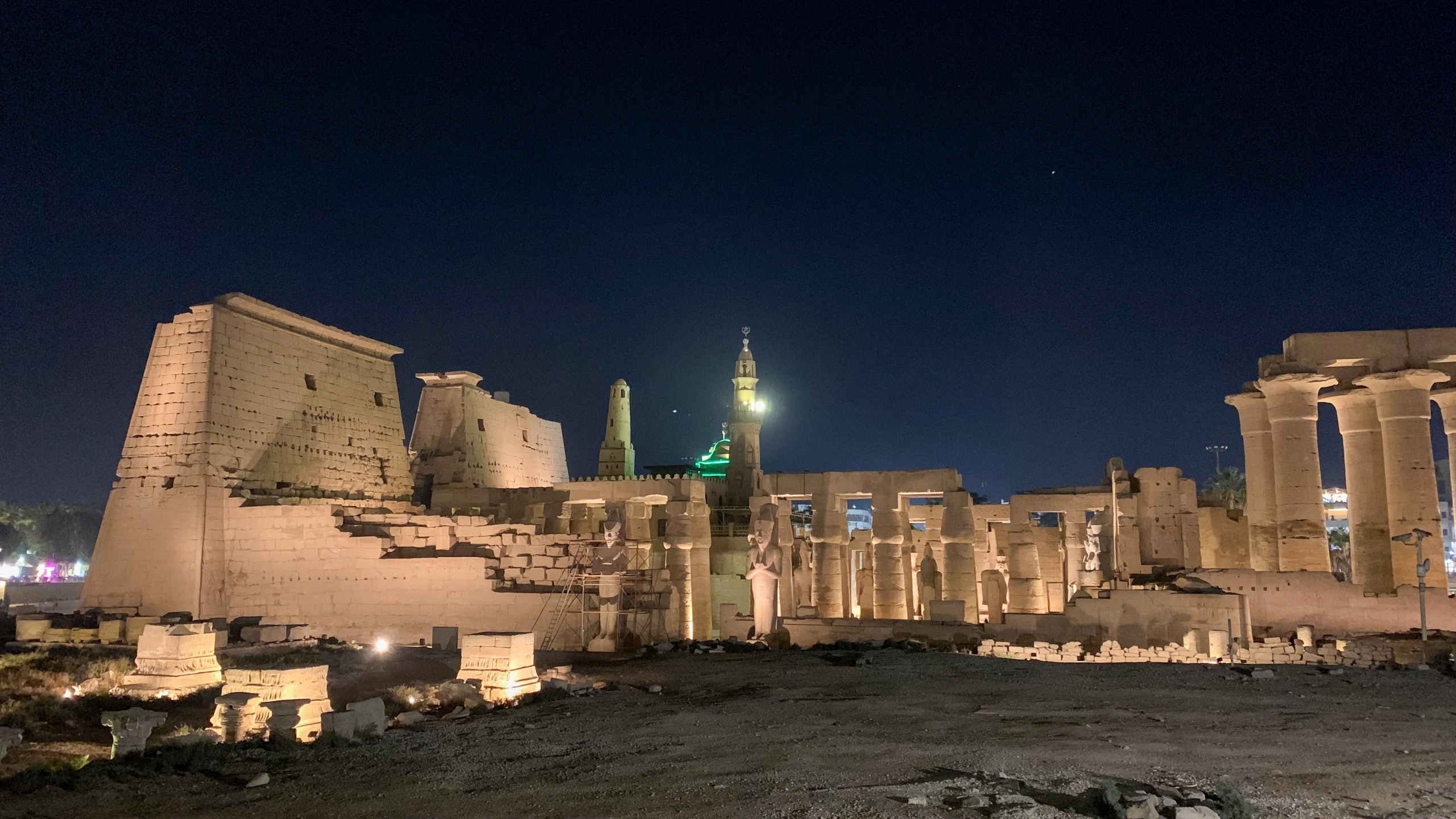 Vorbei am schön beleuchteten Luxor-Tempel gelange ich ein Stück weiter in ein wenig touristisches Viertel und sitze um acht Uhr bei köstlichem Fladenbrot gefüllt mit Leber und Tomaten. Da der Typ zu wenig Wechselgeld hat, bestelle ich noch ein zweites. Mjami. Nur wenige Meter der Straße entlang gibt es noch Süßkram und zwei Ful Falafel, die ordentlich reinhauen. Eins hätte locker ausgereicht. Egal. Am Rückweg entlang der Uferpromenade werde ich gefühlt 30 Mal angequatscht und lasse mich auf ein paar kurze Gespräche ein. Immer wieder erfährt man interessante Dinge. Z.B. erzählt mir Luxor Ali, dass er kein Schlawiner ist und es in Luxor ca. 340 Pferdekutschen gibt. Was? 340? Wow. In Wien sind es nur um die 200. Den restlichen Abend verbringe ich mit der Planung der Tage in Luxor und dem Aussortieren der inzwischen unzähligen Fotos.