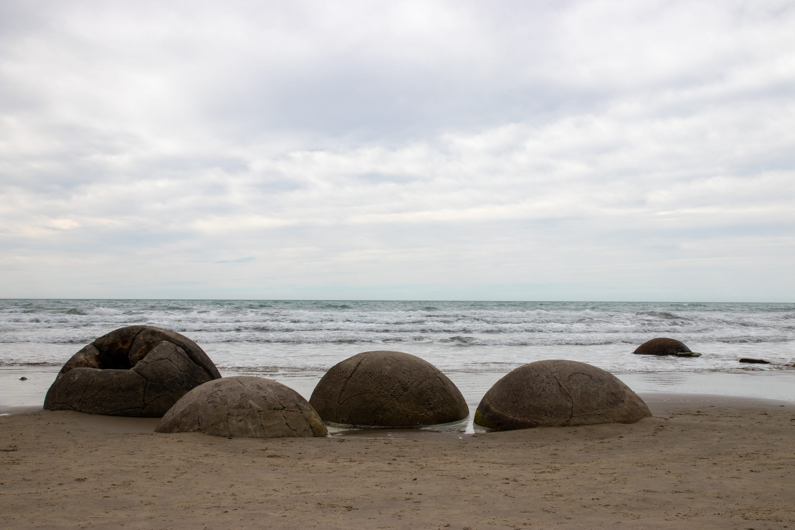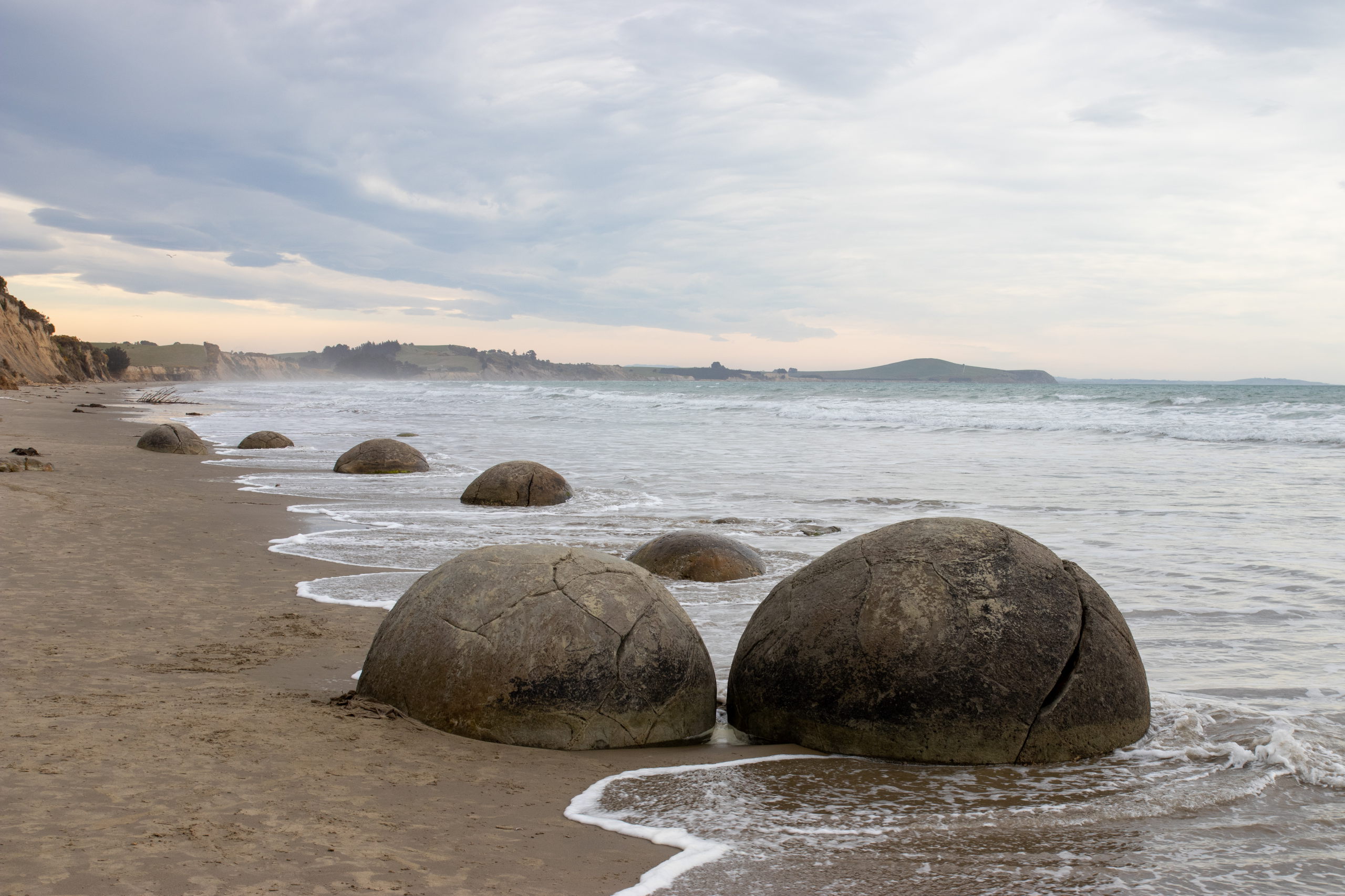 Ich fahre weiter und erreiche am Nachmittag den Moeraki Boulders Beach, mit seinen bis zu zwei Meter Durchmesser umfassenden Steinkugeln, die vor Millionen von Jahren entstanden sind. Nach etwas mehr als einer Stunde Fahrt erreiche ich mein Hostel in Dunedin. Im Aufenthaltsraum arbeite ich am Blog, als zwei schräge Typen kommen. Ein Lehrer für Schlagzeugtheorie und ein, hmmm Lebenskünstler. Ich quatsche kurz mit ihnen, sie sind mir aber zu anstrengend und ich verziehe mich aufs Zimmer. Es sind noch Unmengen an Galerien neu anzulegen. Auch heute wird es wieder spät.