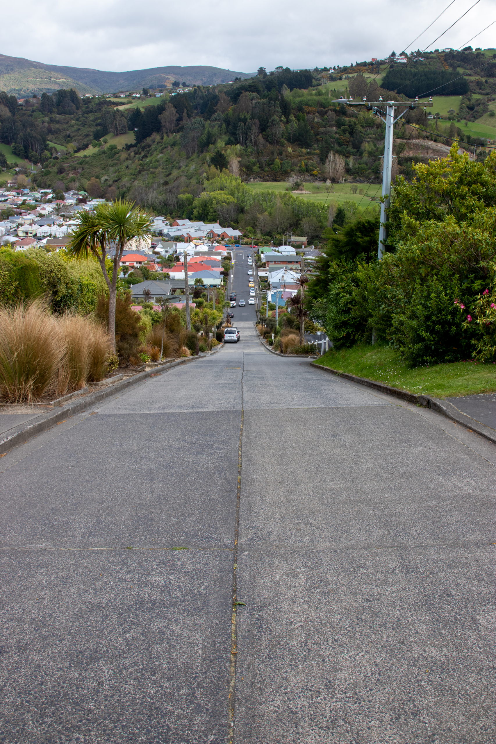Das Navi lotst mich zur Baldwin Street, der laut Guinness-Buch der Rekorde mit 35% Steigung steilsten Straße der Welt. Sie ist durchaus ein Wadenbeisser und auch bergab geht es in die Knie. Mit dem Auto ist es einfacher, auch wenn ich beim Hochfahren schon nahe an der Windschutzscheibe klebe. Weiter geht es zum Signal Hill mit Sicht über Dunedin. Naja, bei Regen nicht ganz so beeindruckend. An der Otago Peninsula gleich in der Nähe soll das Wetter am Nachmittag besser werden. Passt, da fahre ich hin, stocke aber vorher noch meine Vorräte auf.