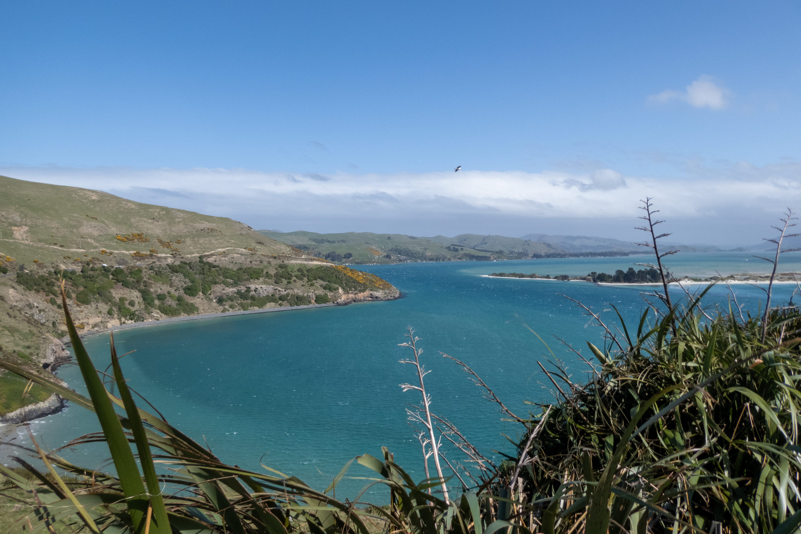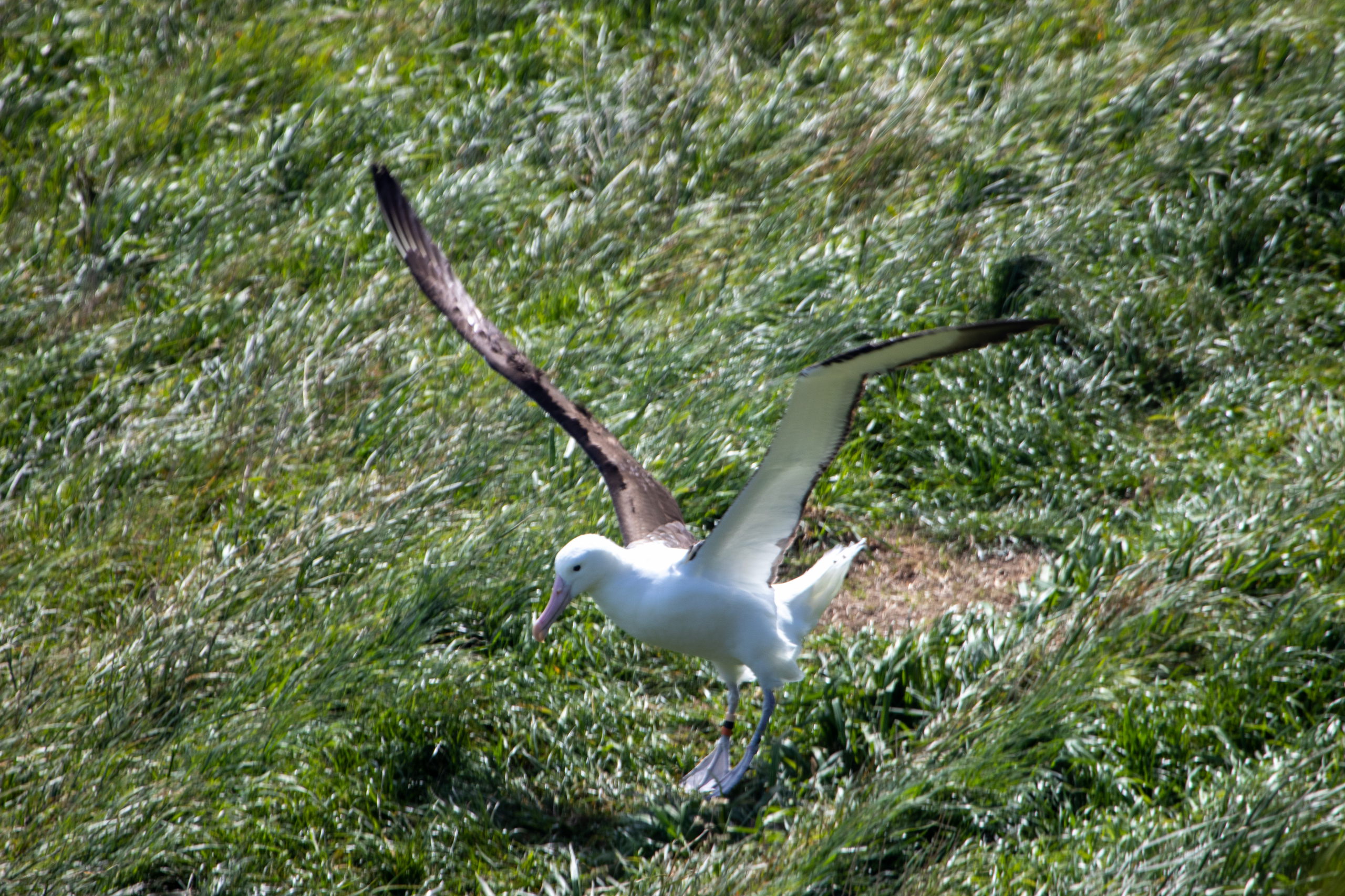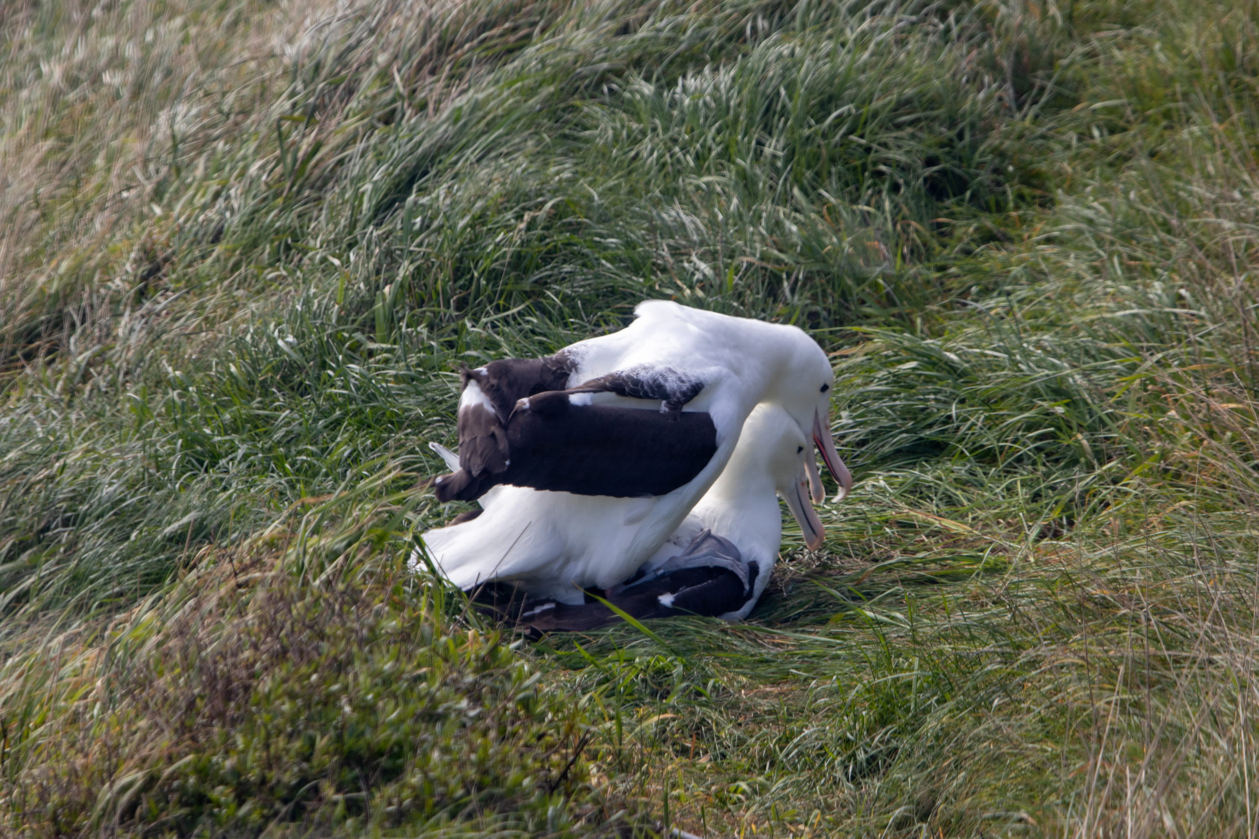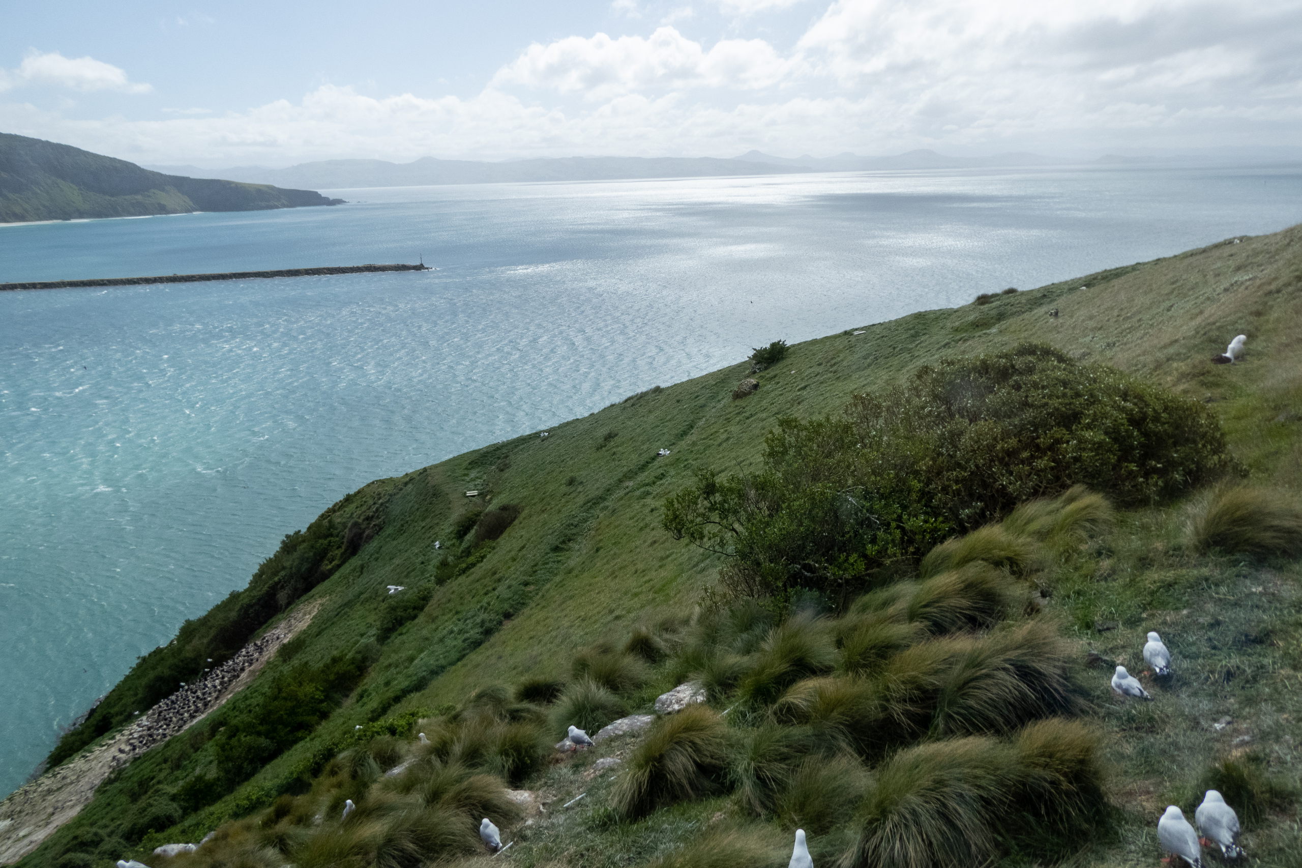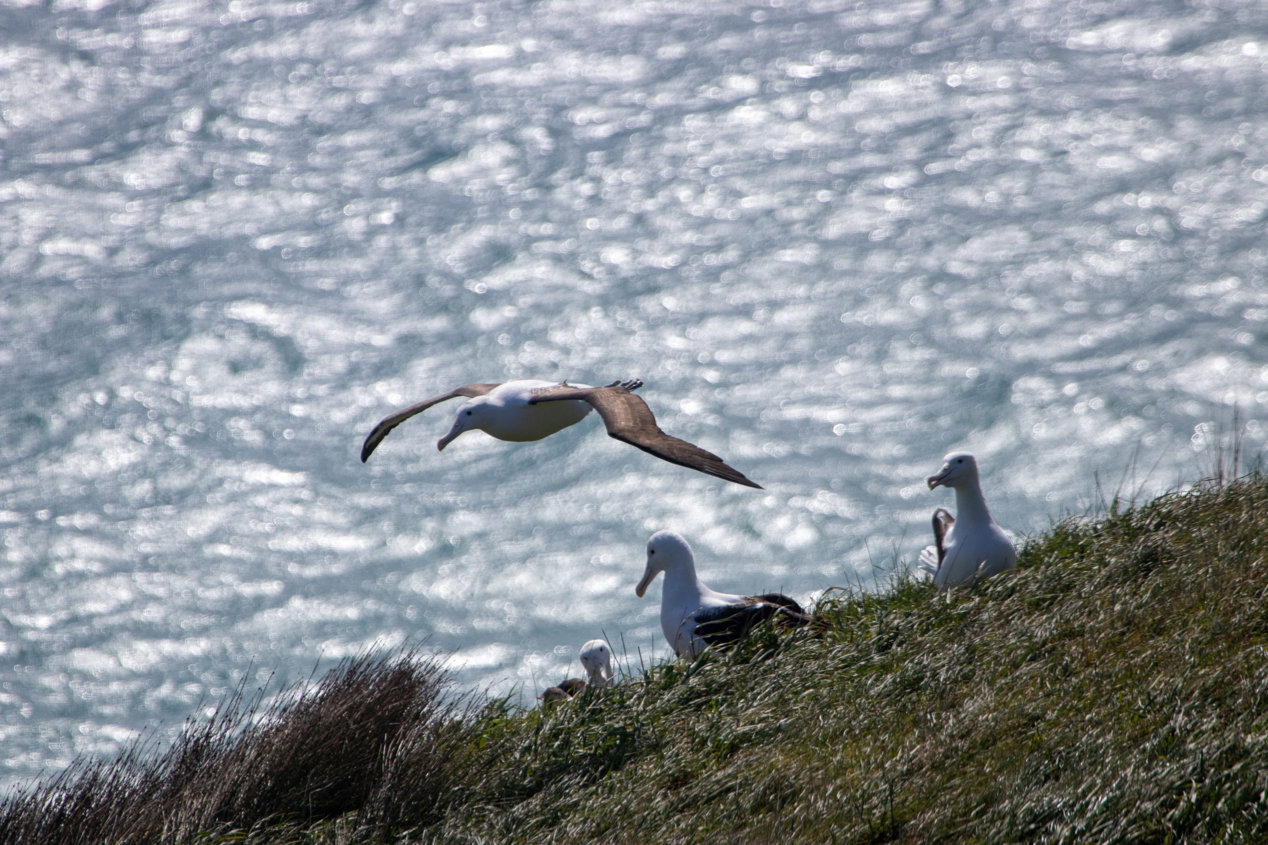 Als ich am Royal Albatross Centre am Ende der Otago Peninsula ankomme, regnet es immer noch, am offenen Meer ist es aber schon etwas heller. Also erst einmal etwas essen und abwarten. Und tatsächlich kommt die Sonne raus. Die Dame am Schalter sagt mir, dass der starke Wind ideal ist, da dann viele Albatrosse in der Luft sind. Sie lieben starken Wind, da brauchen sie nur die Flügel ausstrecken und schon schweben sie durch die Lüfte. Ich bin der einzige Besucher und bekomme eine private Führung. Cool. Zuerst erklärt mir die nette Frau allerhand über die Albatrosse, wie sie trinken, dass sie die Flügel einhaken können und noch vieles mehr. Mit einer Größe von 140 Zentimeter und einer Flügelspannweite von bis zu 330 Zentimeter, sind das echt riesige Tiere. Nach einem kurzen Video geht es den Hügel hoch in den Beobachtungsturm. Etwas mehr als zehn Albatrosse sind bereits eingetroffen und bereiten sich auf die Paarung vor oder sind schon mitten dabei. Die Sonne scheint. Perfekt.