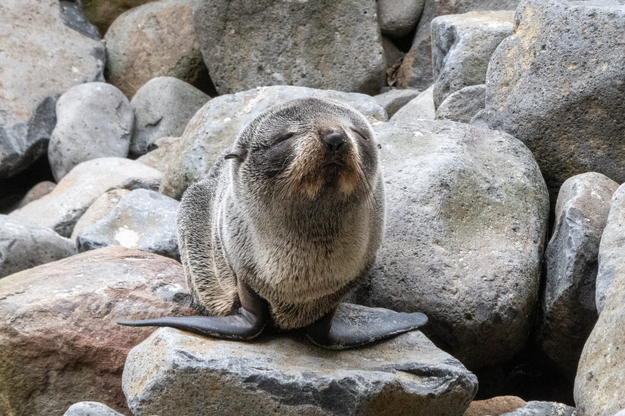 Etwas südlich von Dunedin liegt der Tunnel Beach. Der Namensgeber ist ein Felsen, durch den ein natürlicher Tunnel führt. Der Weg hinunter ist mit gelbem Ginster gesäumt und führt zu einem künstlichen Tunnel, durch den es über Stufen hinunter zu einem kleinen Strand geht. Hier chillt gerade ein kleines Seebärweibchen. Sie streckt den Kopf in die Höhe und schwenkt ihn nach beiden Seiten, so als ob sie die Sonne anbeten würde. Und tatsächlich kommt für die Zeit, die ich am Strand bin, die Sonne raus. Als ich zurück gehe, verschwindet sie wieder hinter den Wolken. Vorher latsche ich aber noch fast knöcheltief in den Matsch. Egal, es sind eh die alten Schuhe. 😁
