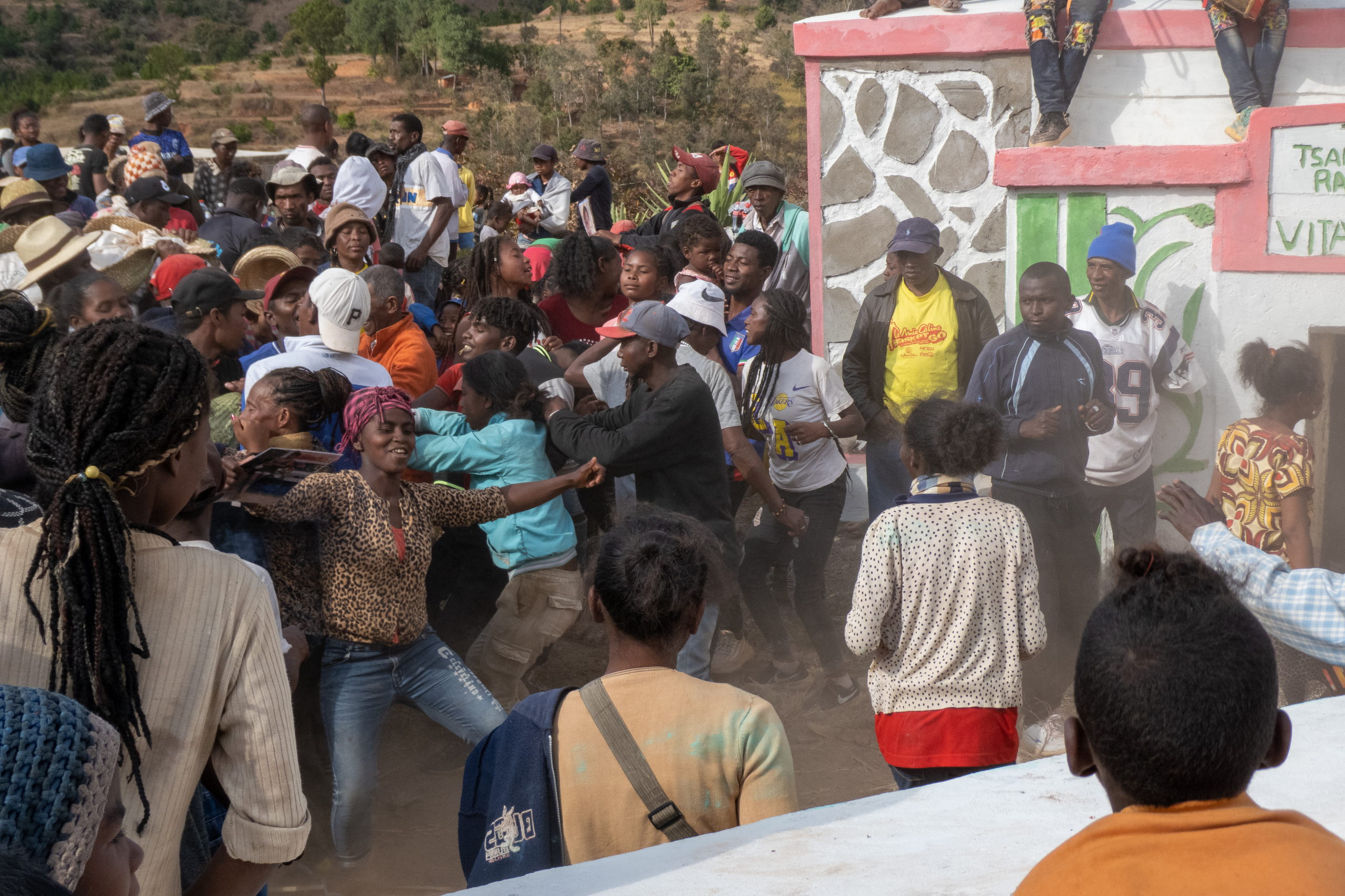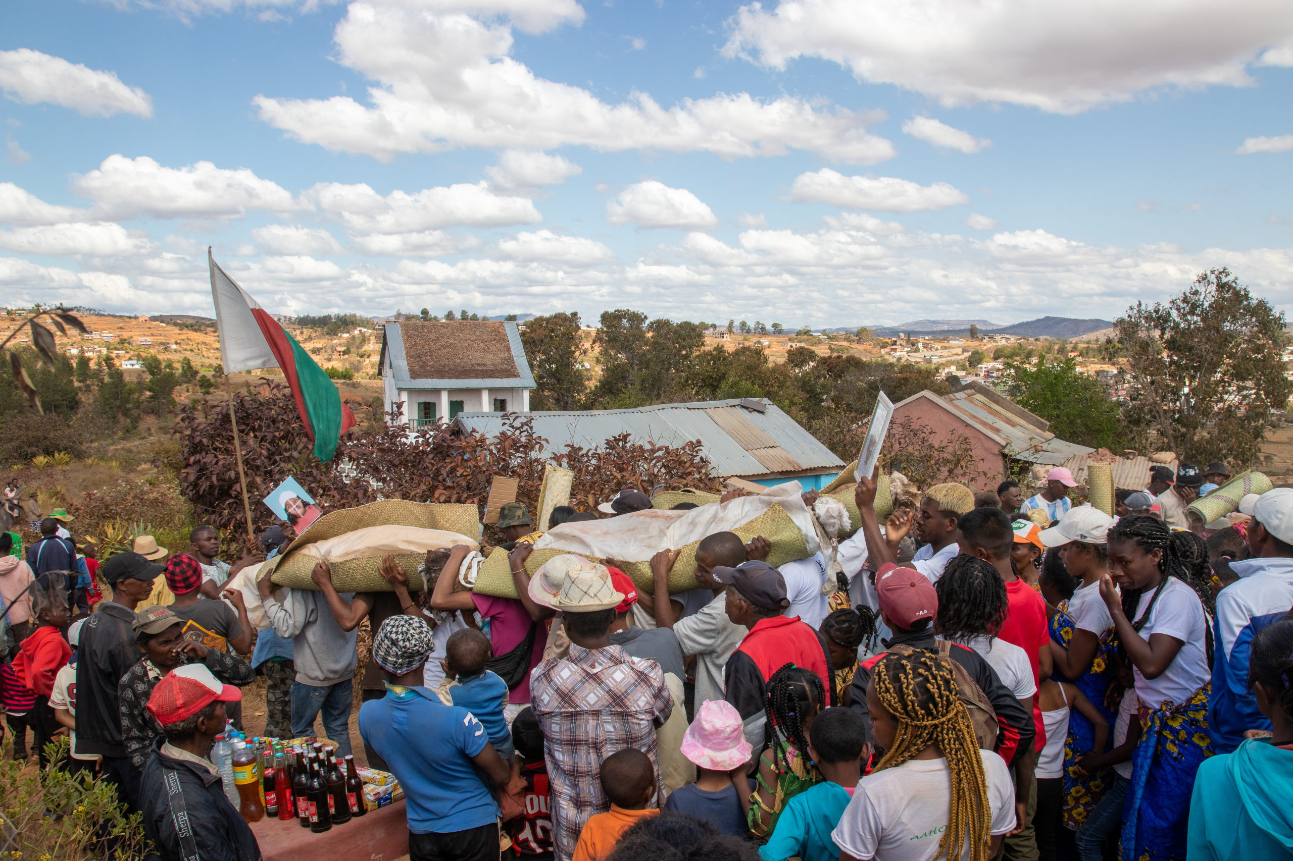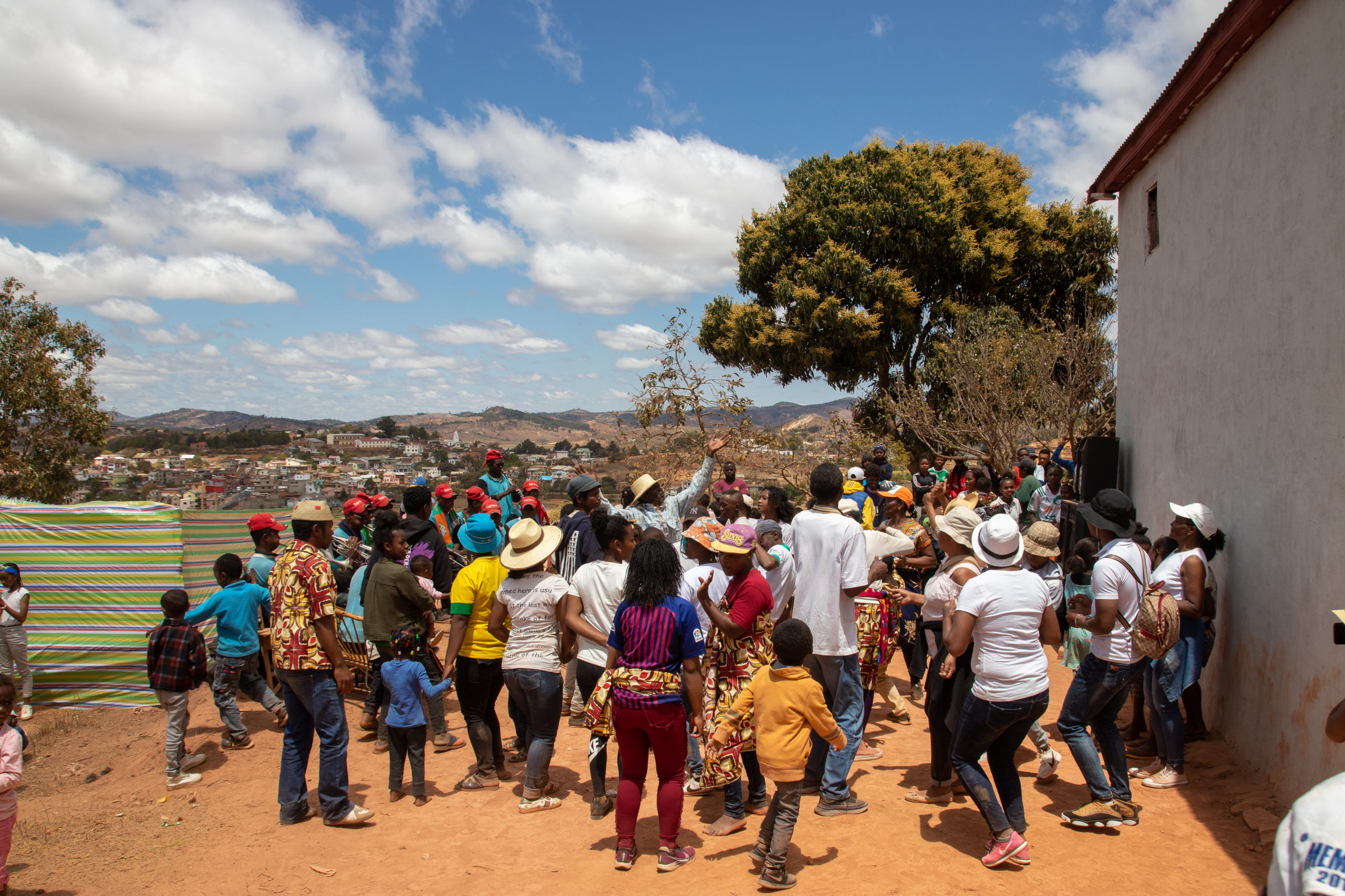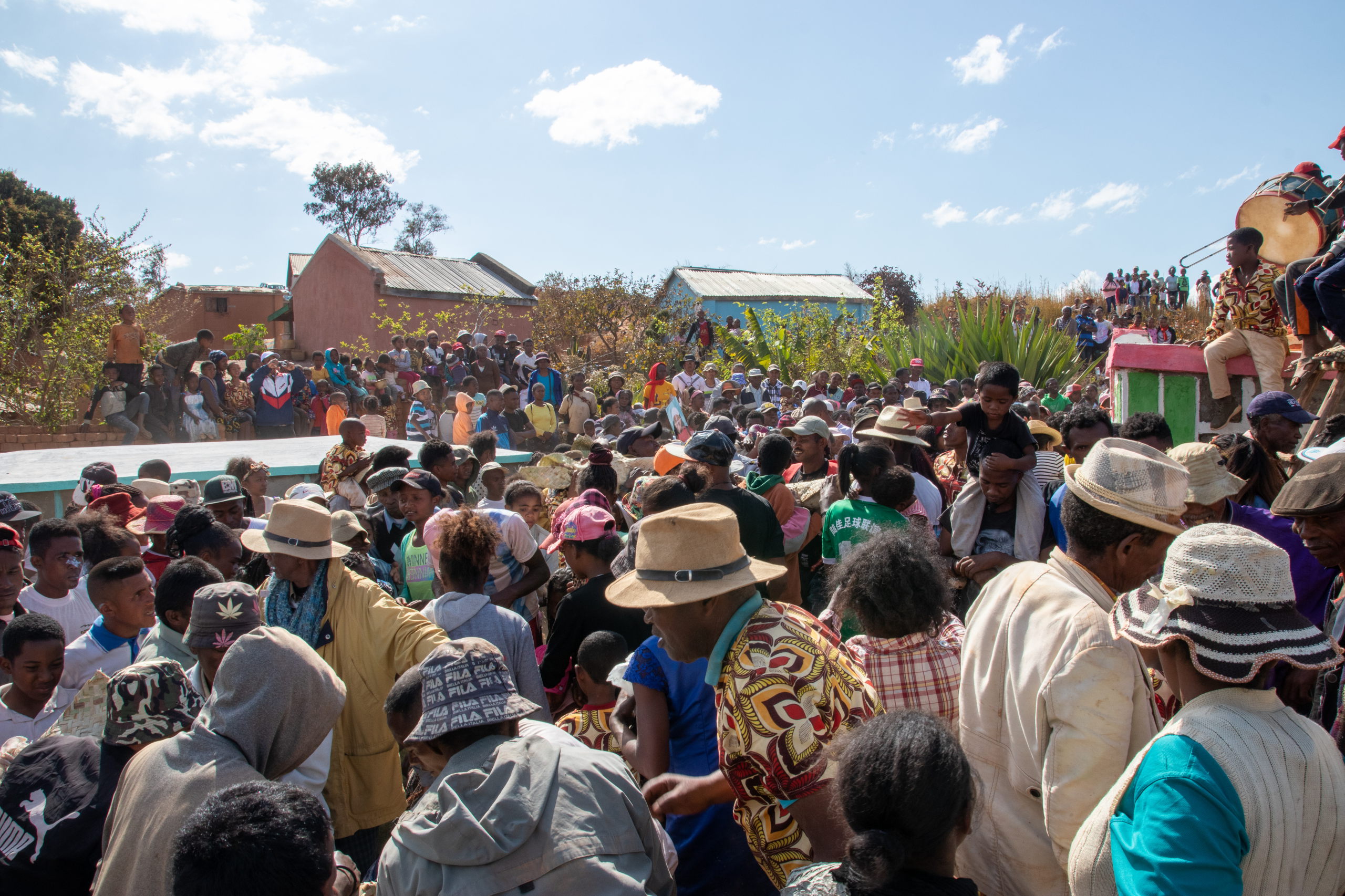 Ich bin aufgeregt, da heute die Chance besteht, eine Famadihana in der Umgebung zu sehen. Ich bespreche die Option mit Bari und er meint, dass auf den Weg nach Antananarivo viele sind und es zeitlich wesentlich günstiger ist. Perfekt. Dann kann’s losgehen. Bei einem Zwischenstopp versorge ich mich mit Reiscookies. Allerdings einer anderen Variante. Diese sind halbiert und noch einmal in reichlich Fett angebraten. Mjam. Bari fragt in mehreren Orten, nach Famadihanas, aber die waren alle schon gestern. Mist. Das Datum wird von einem Schamanen bereits ein Jahr in voraus festgelegt. Esgeht weiter ind wir nähern uns Tana. Ich dränge Bari erneut zu fragen, denn je näher an der großen Stadt, desto weniger wird dieser Brauch ausgeübt. Ich hatte die Hoffnung schon aufgegeben, aber ein Mann meint, oben bei der Kirche ist etwas am Laufen. Wir fahren hin und tatsächlich wird eine Famadihana gefeiert. Bari fragt das Familienoberhaupt um Erlaubnis, ob ich teilnehmen darf. Ja, wenn ich ein wenig in die Gemeinschaftskasse einzahle. Ausgezeichnet.